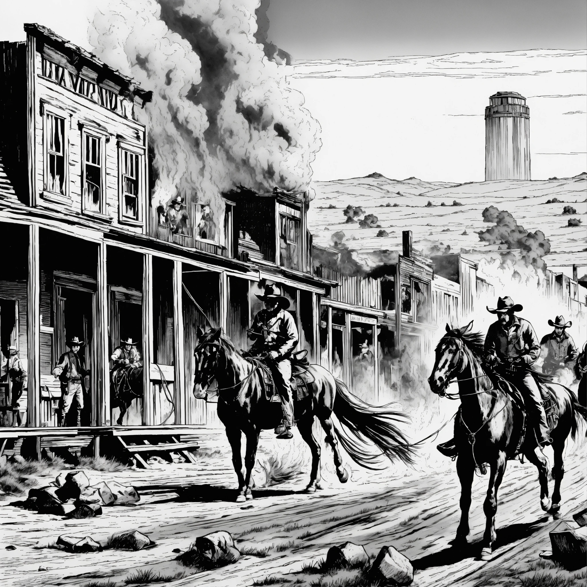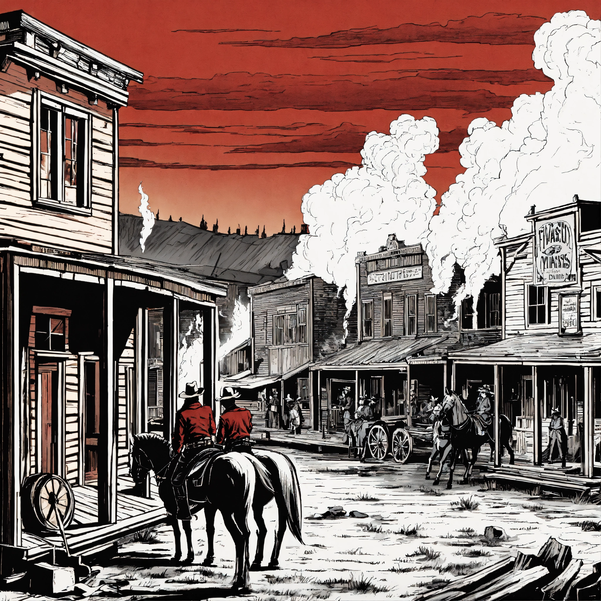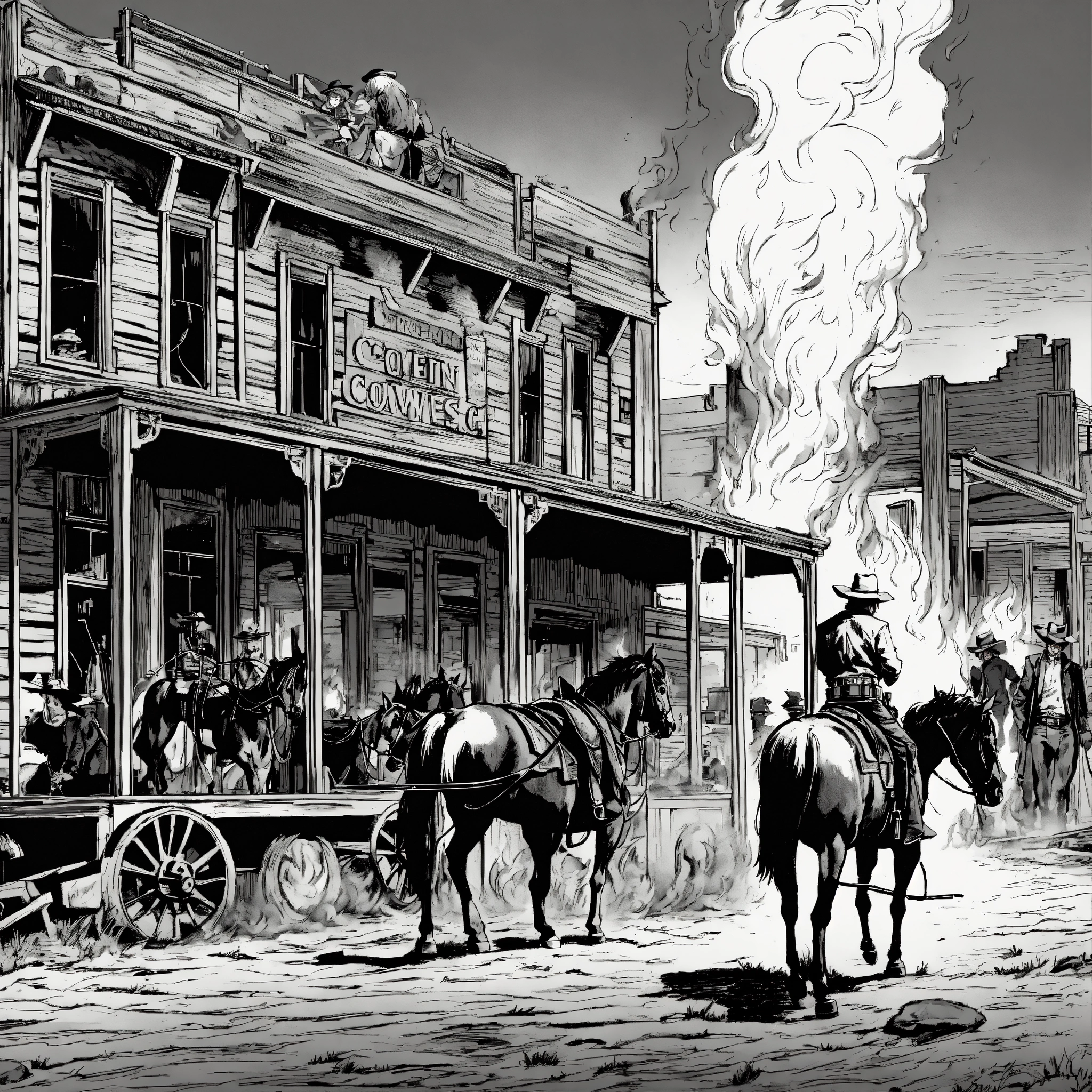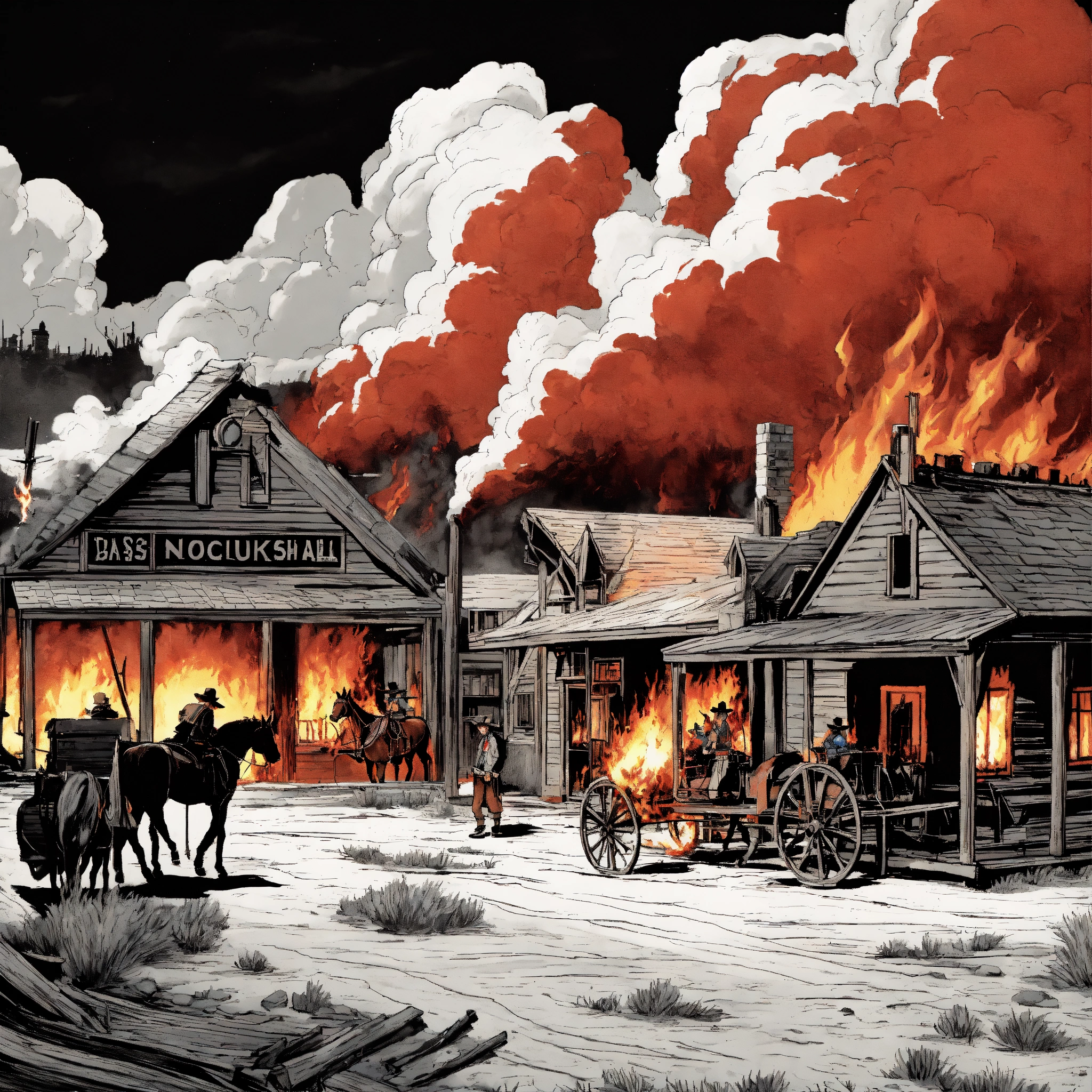 A old farwest landscape burning in fire, a sloon building in the middle, black and white, red flames, cowboys in the streets, horses, classic comic style