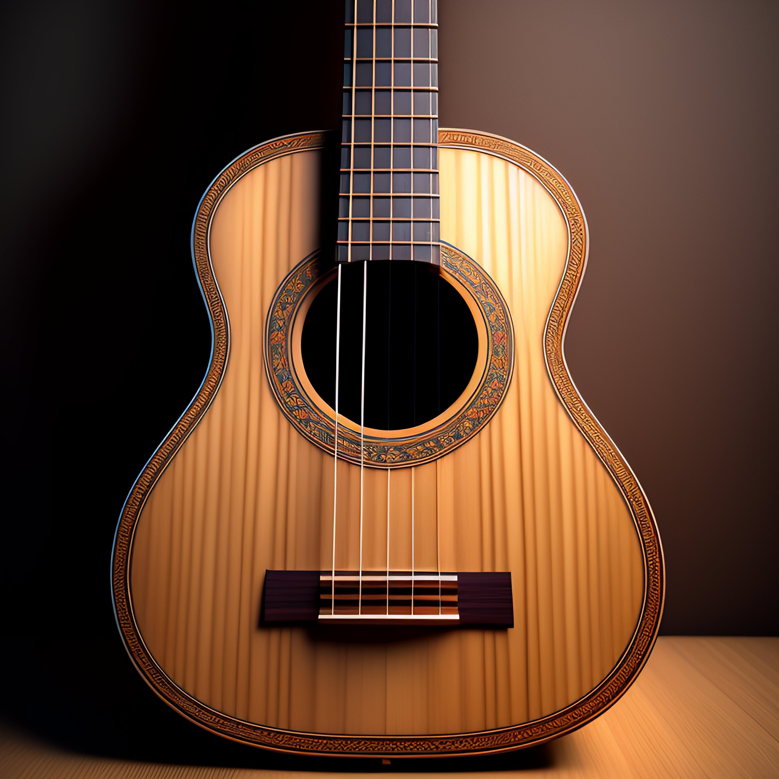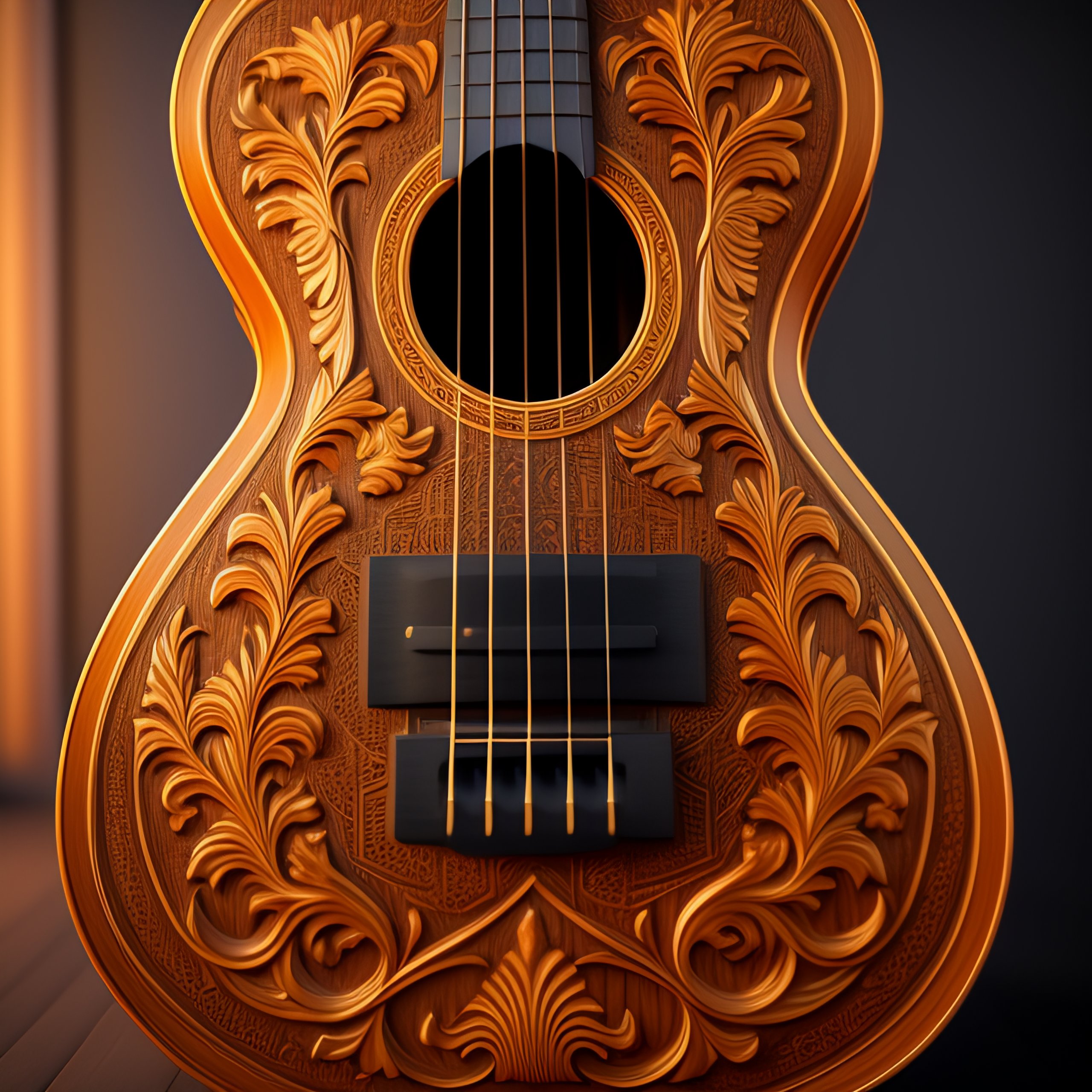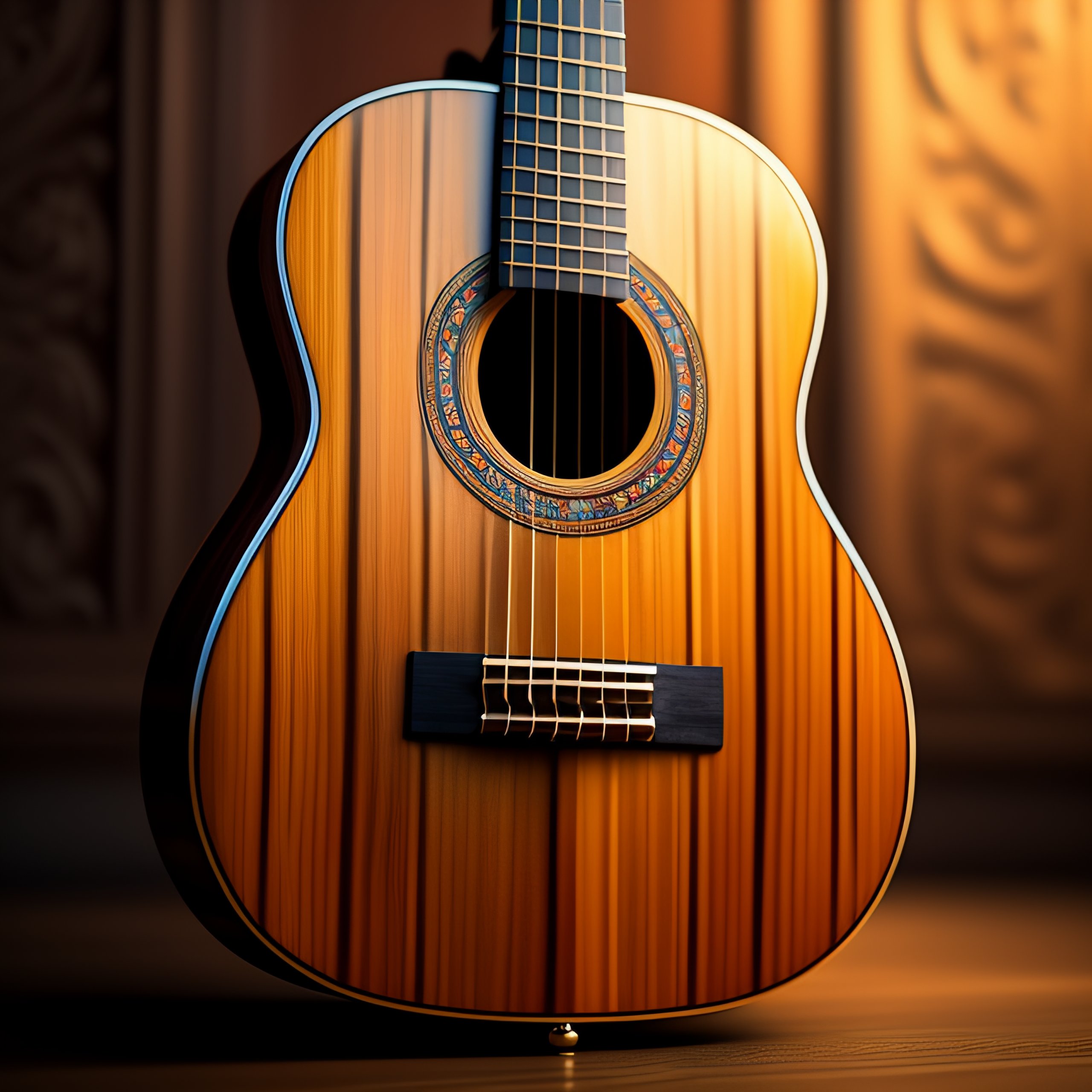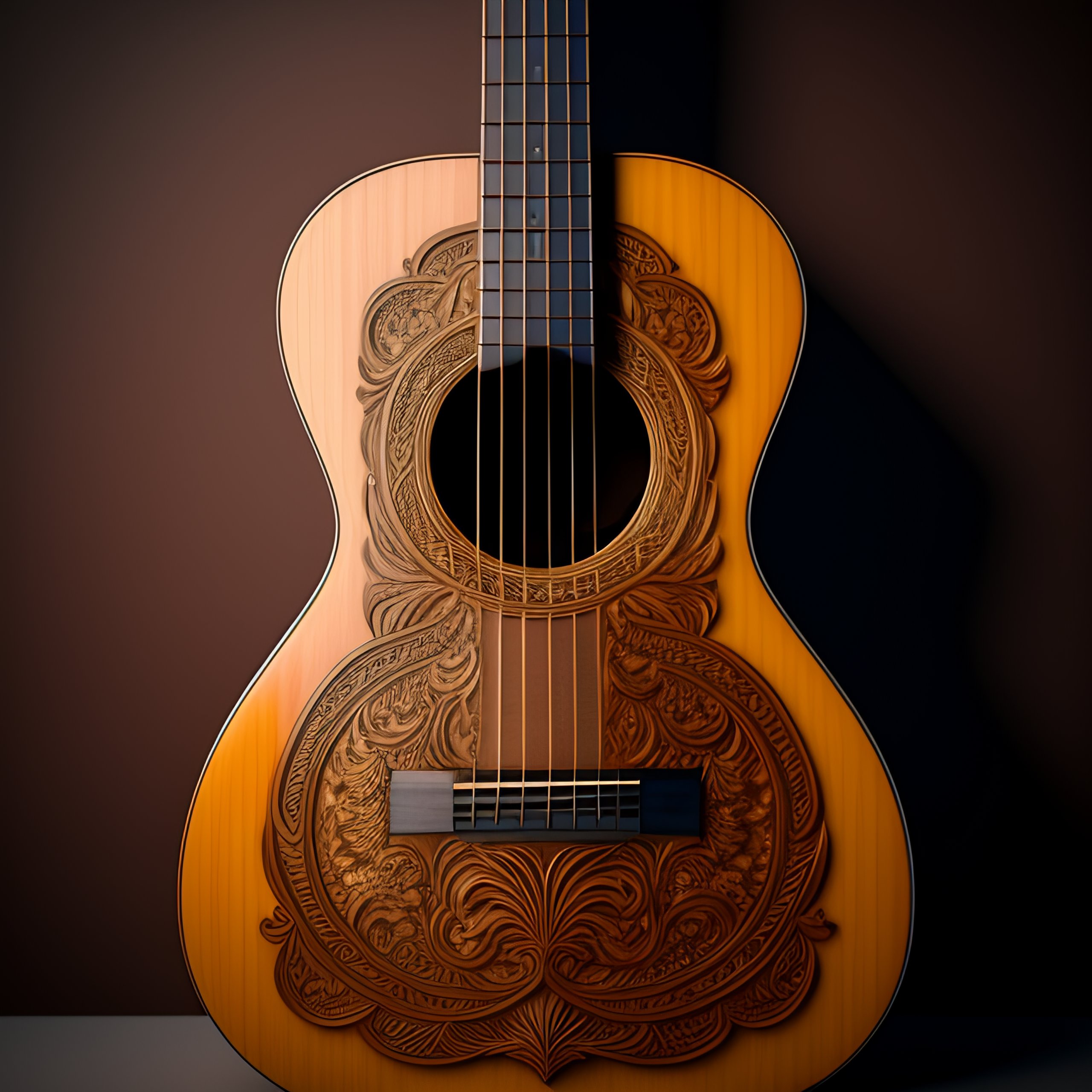 A detailed painting of spanish classical guitar wood carving, hyper-realistic, 8k image, 3d, wood colors, perfect symmetry, high definition, octane at maya and houdini, shadows, photorealistic, masterpiece, smooth gradients, no blur, sharp focus, shallow depth of field, bokeh, photorealistic, incredibly detailed and intricate, cinematic lighting, octane, epic scene, 8k