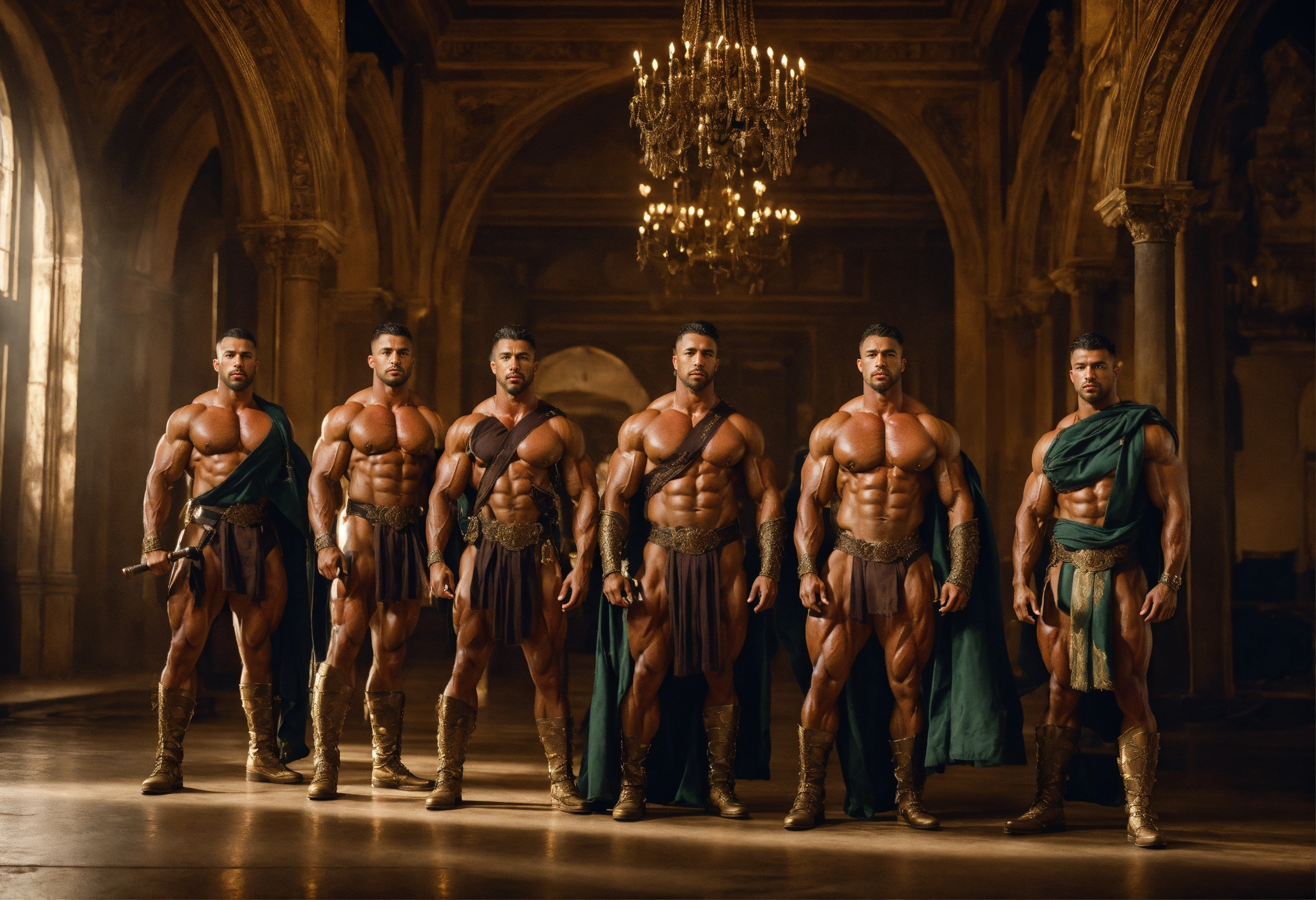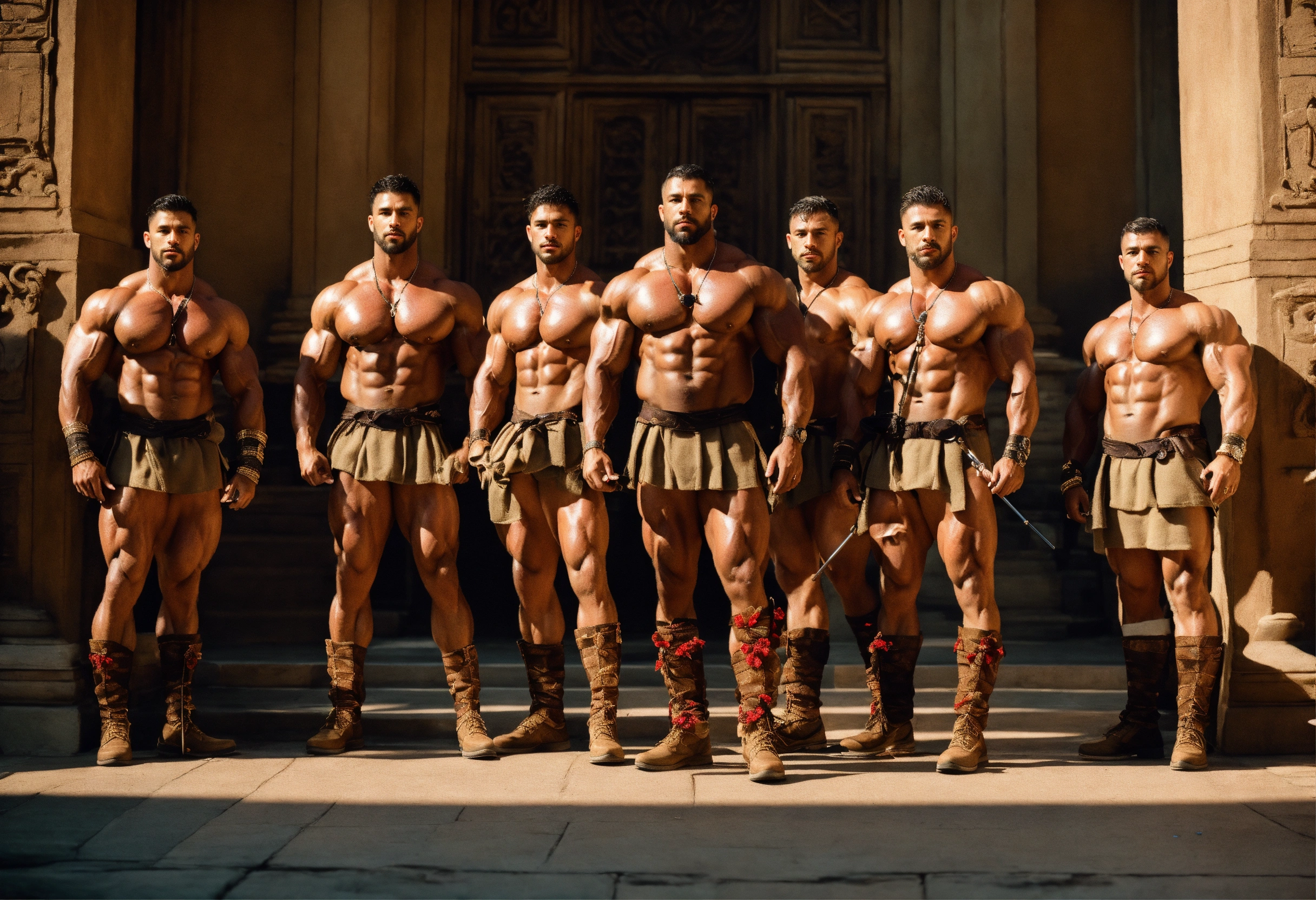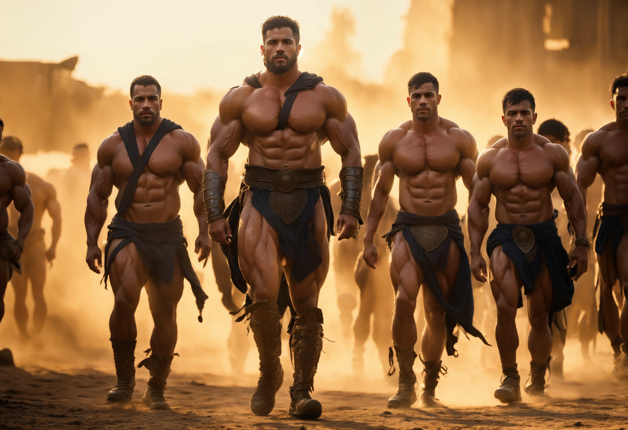 Full body shot of a group of stunningly handsome spartan soldiers in soft light, mister olympia anatomy, broad muscle legs, big delts, ripped, intricate, elegant, depth of field, zeiss lens, detailed, symmetrical, centered, fashion photoshoot, by annie leibovitz and steve mccurry, david lazar, jimmy nelsson, breathtaking, 8 k resolution, extremely detailed, beautiful, establishing shot, artistic, hyperrealistic, beautiful face, octane render.