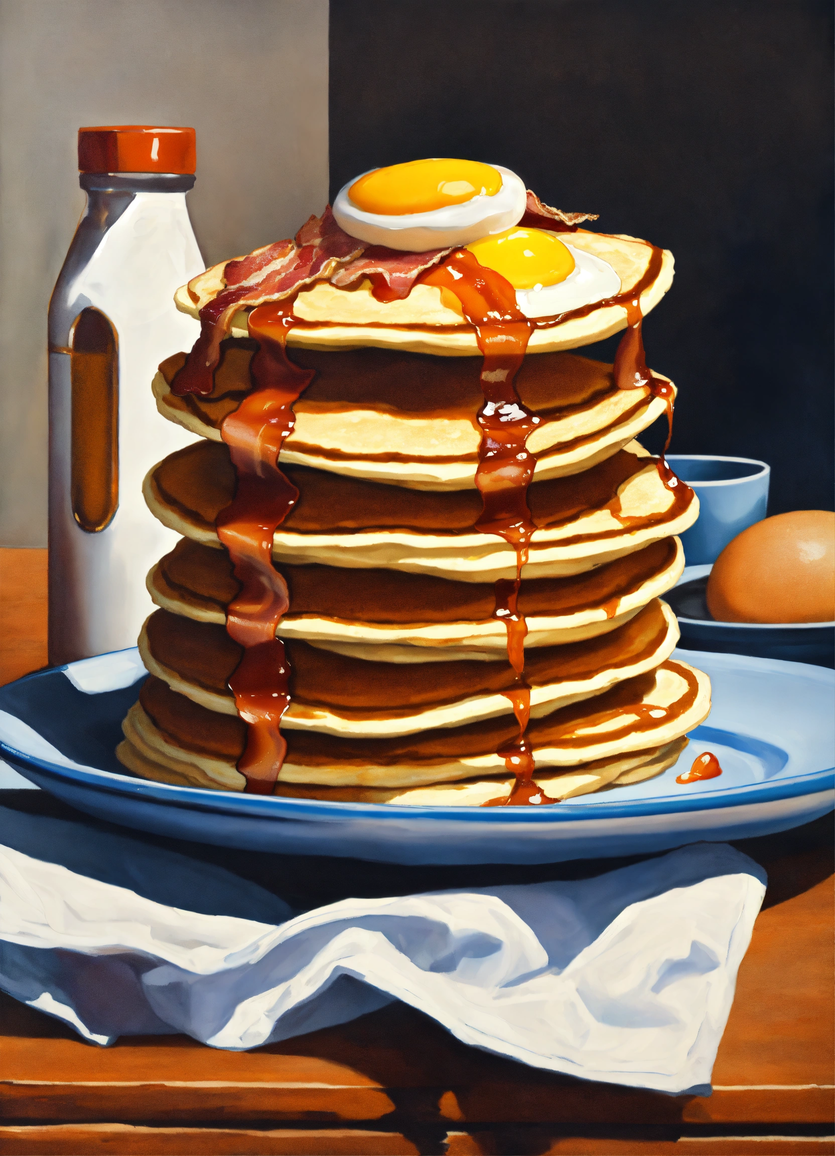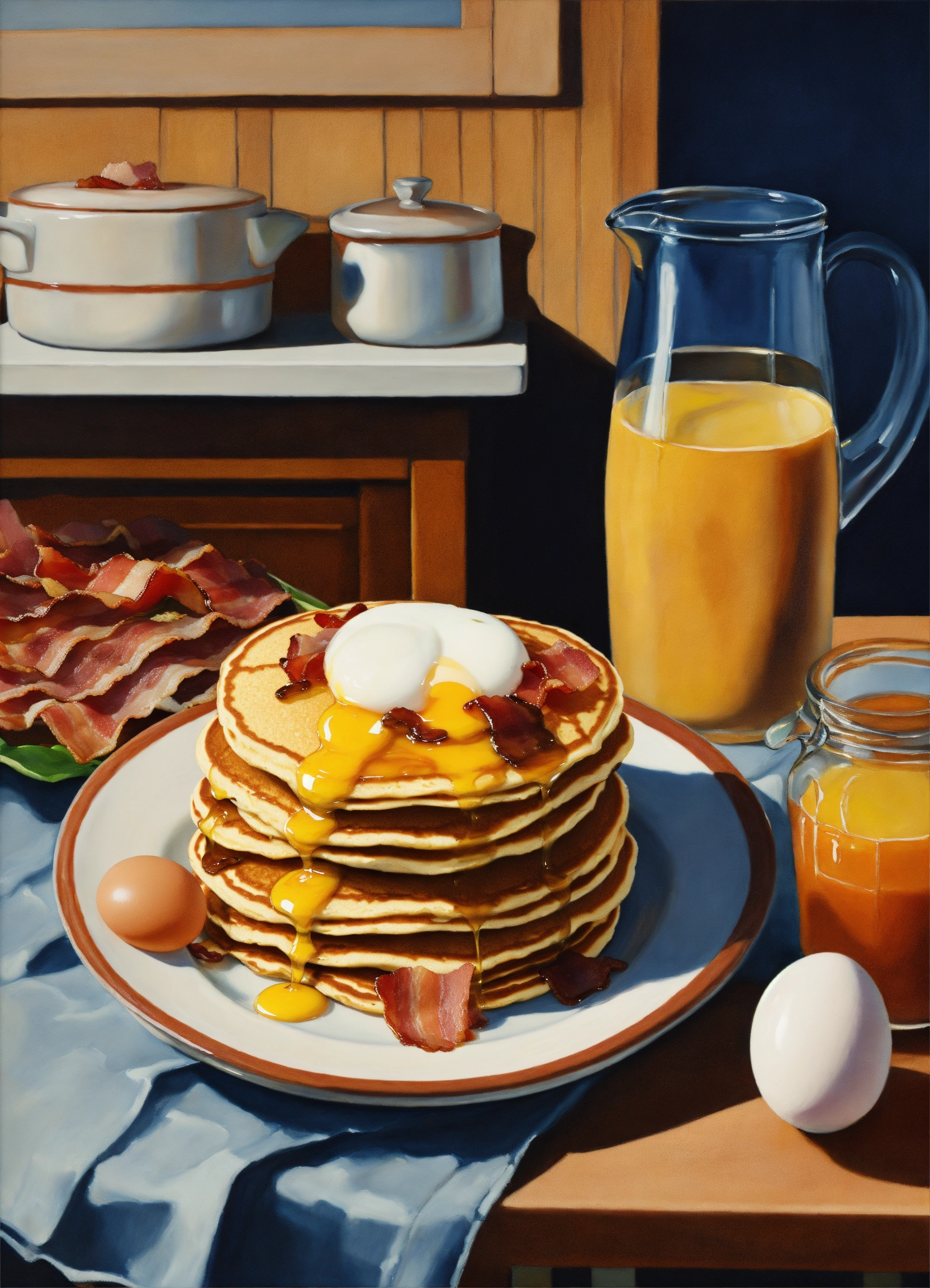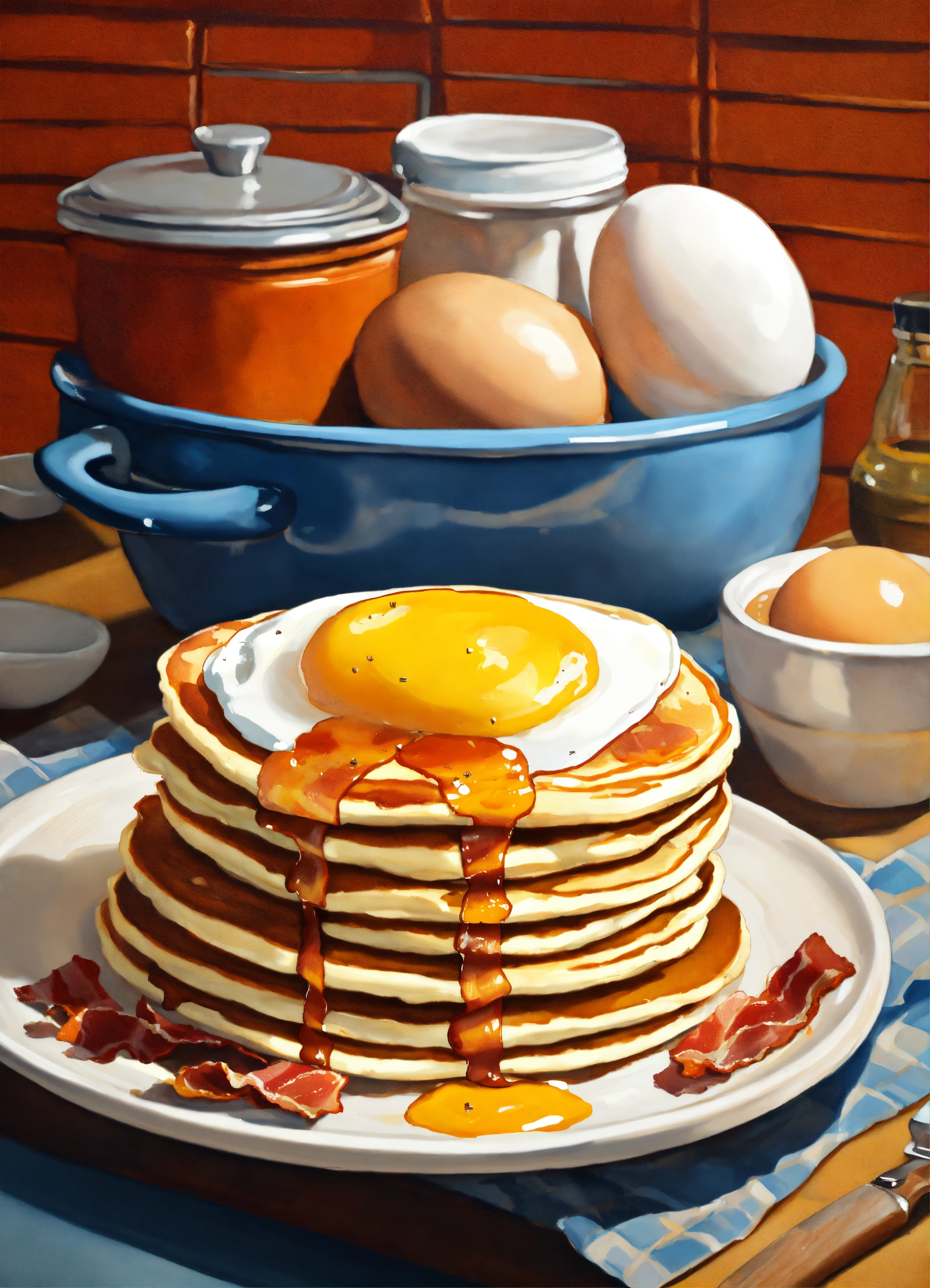 A realistic painting of a stack of pancakes, bacon, eggs, and a kitchen countertop with complementary colors --ar 169 --v5.1