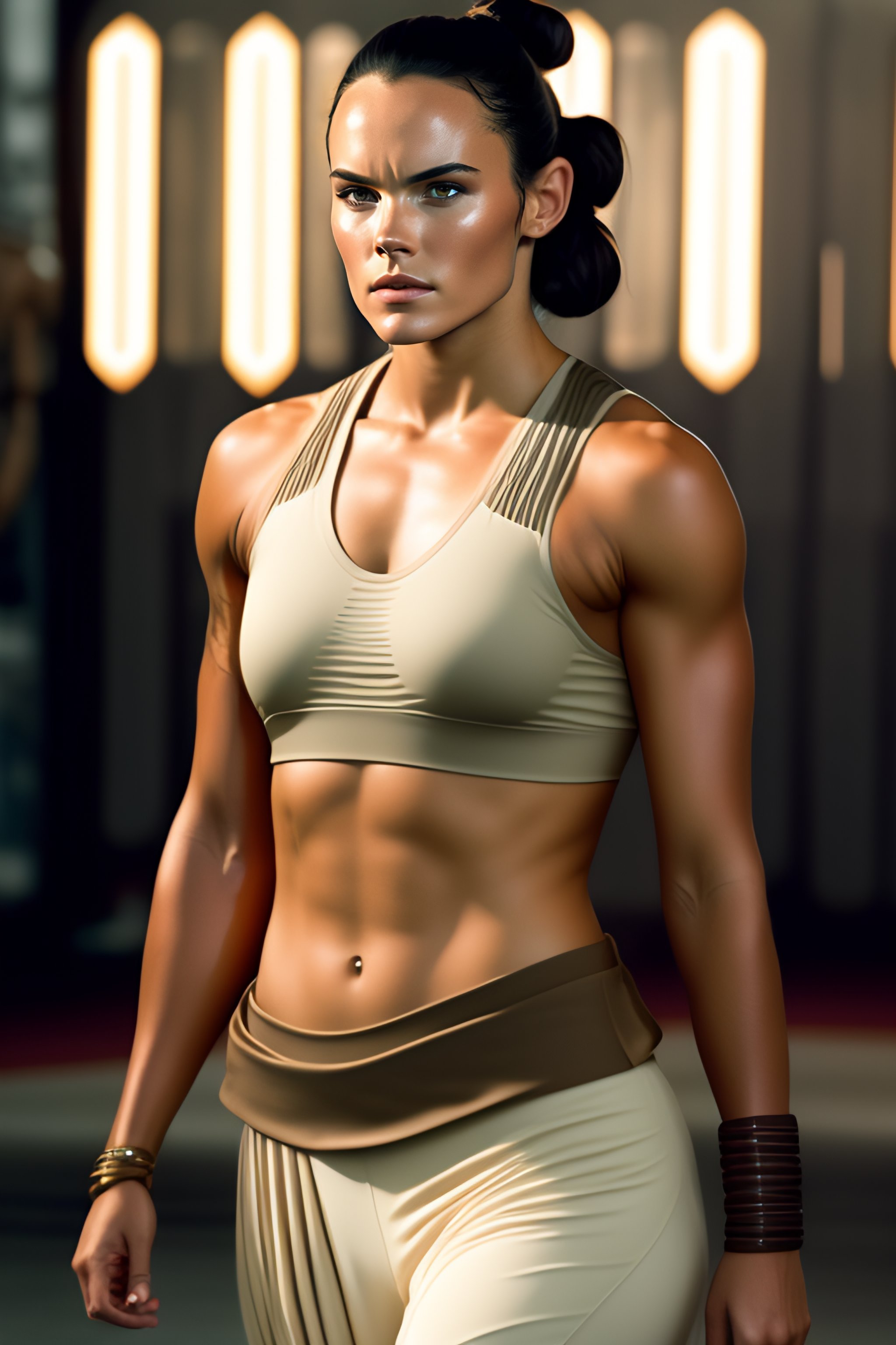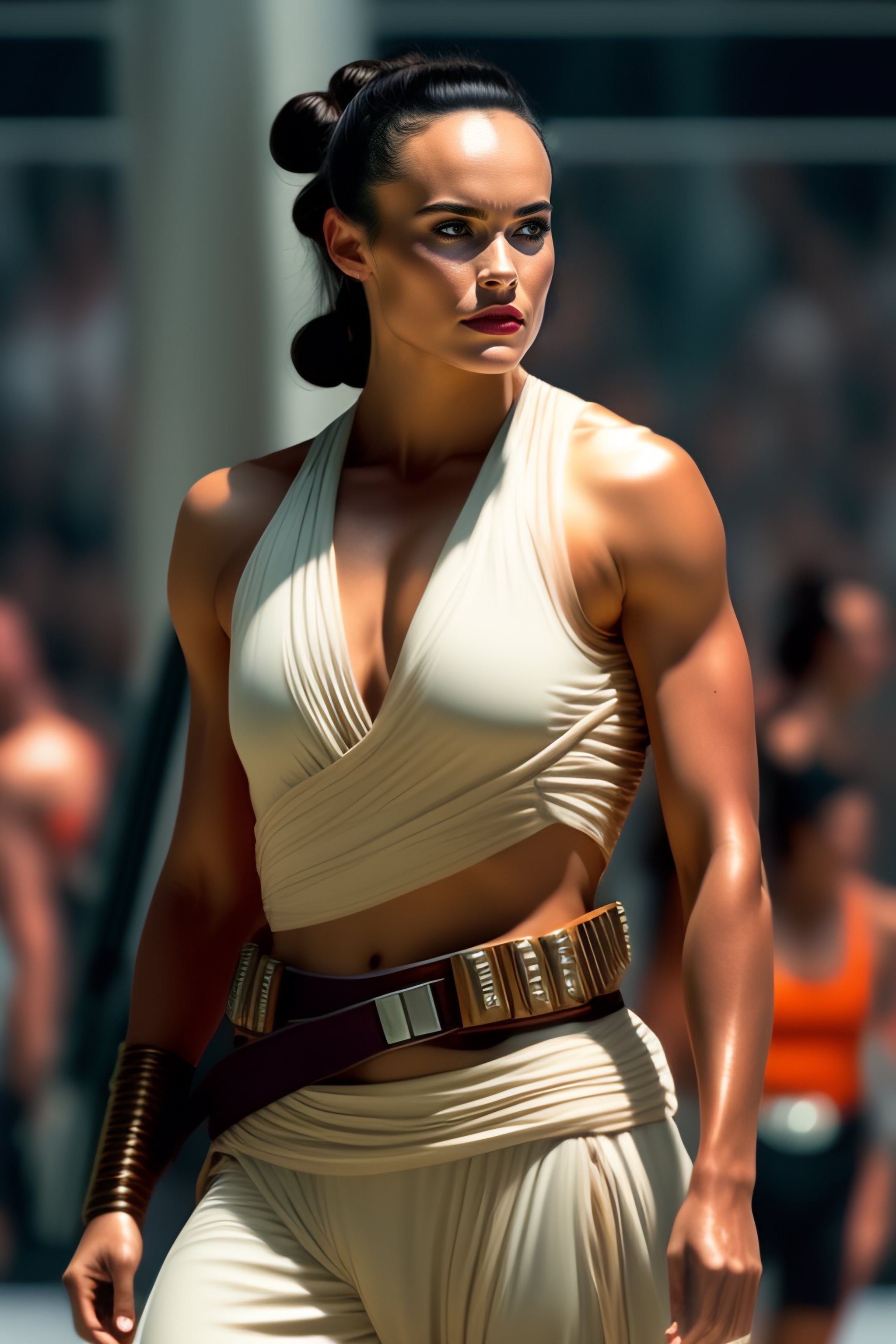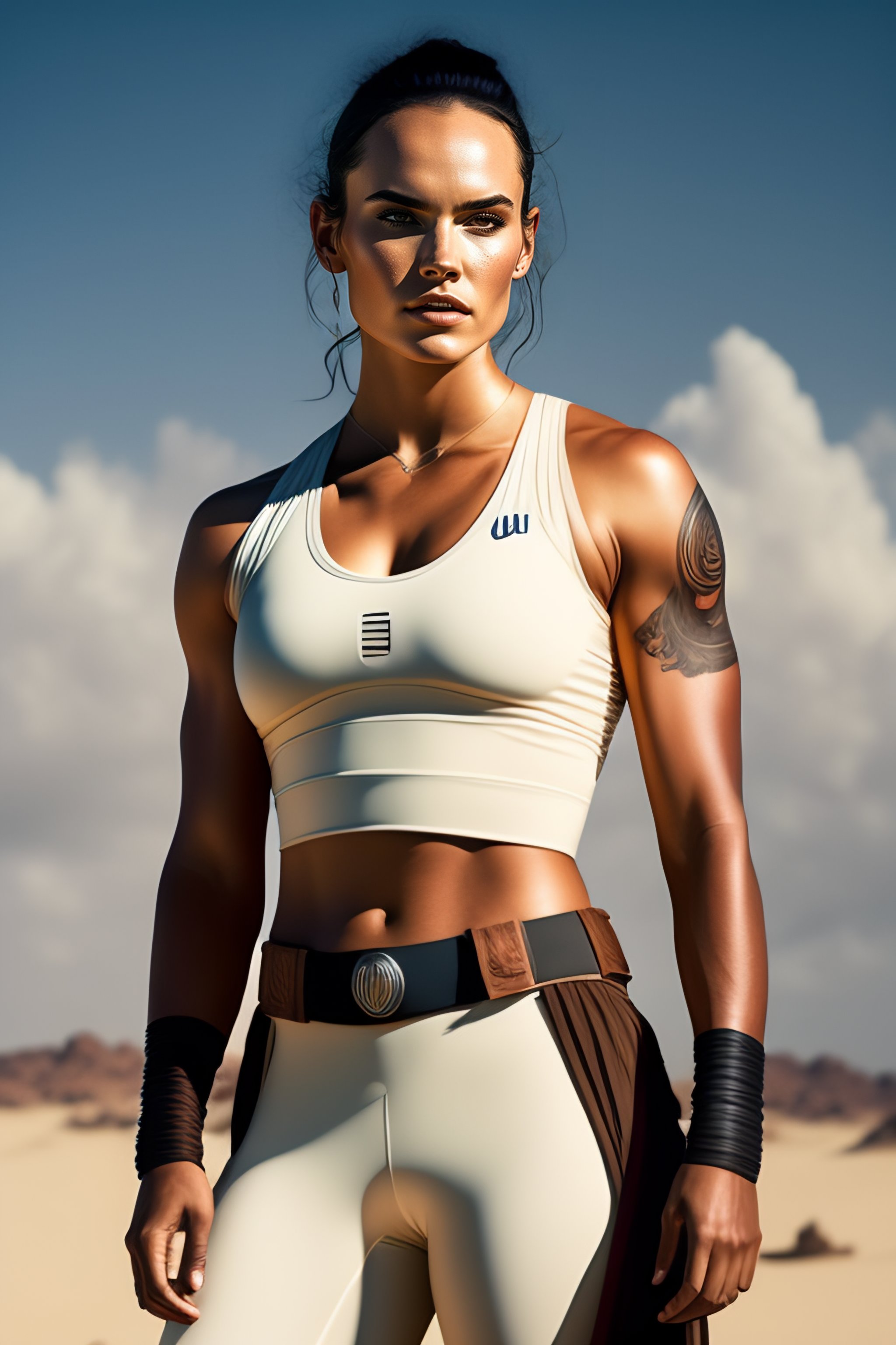 Portrait of star wars rey skywalker in a form-fitting plunge-cut tanktop, large-firm-chest, sweaty-glistening-skin, feminine-athletic-form