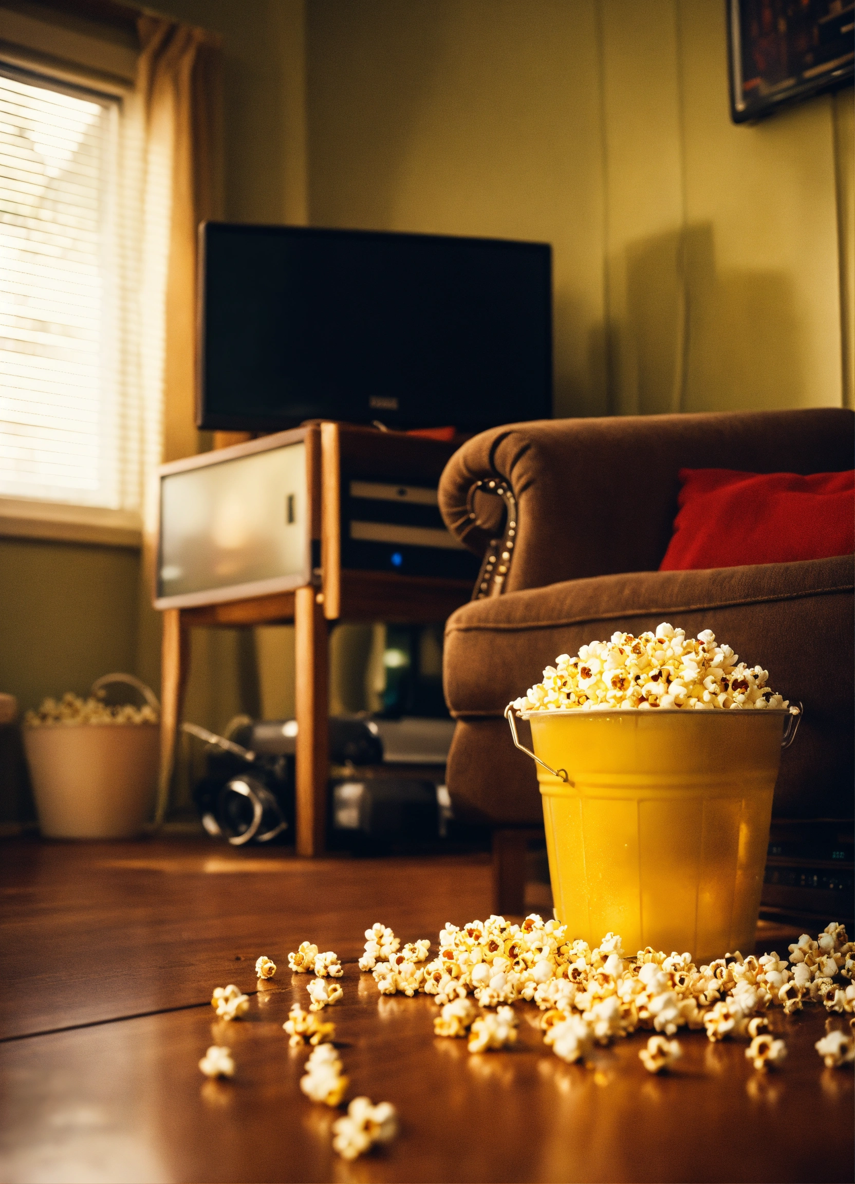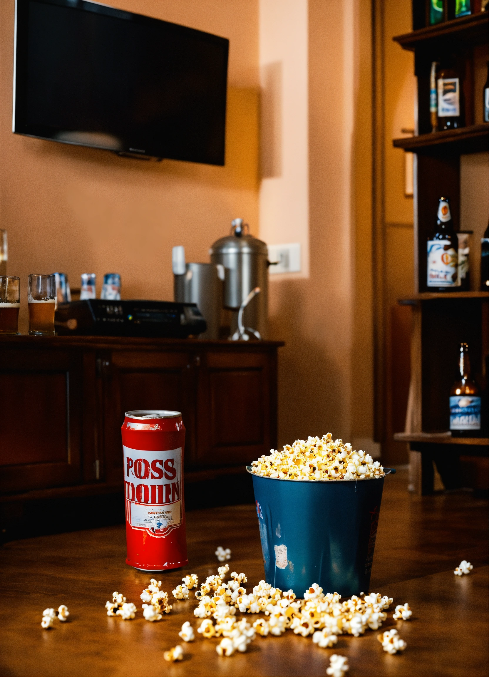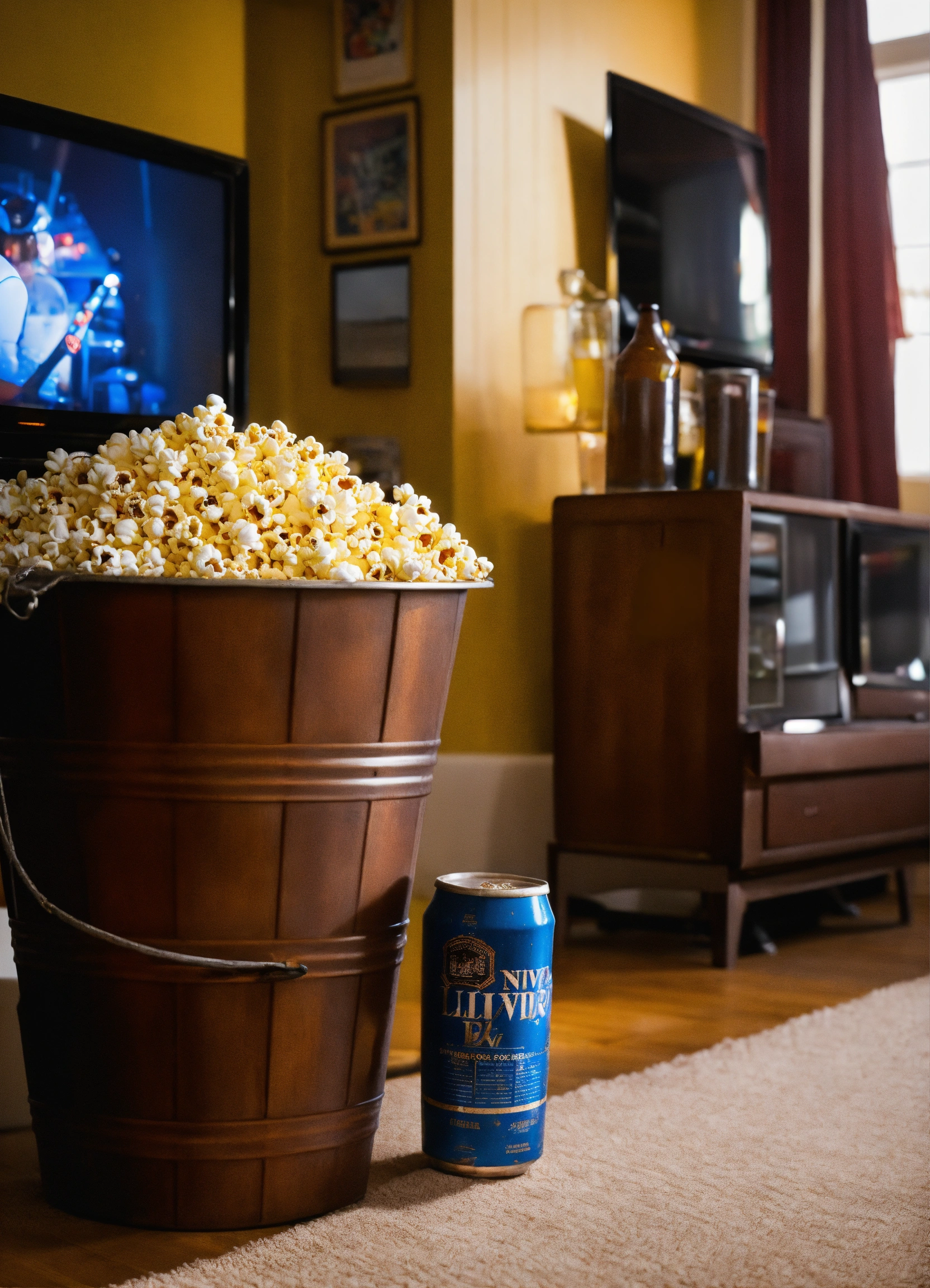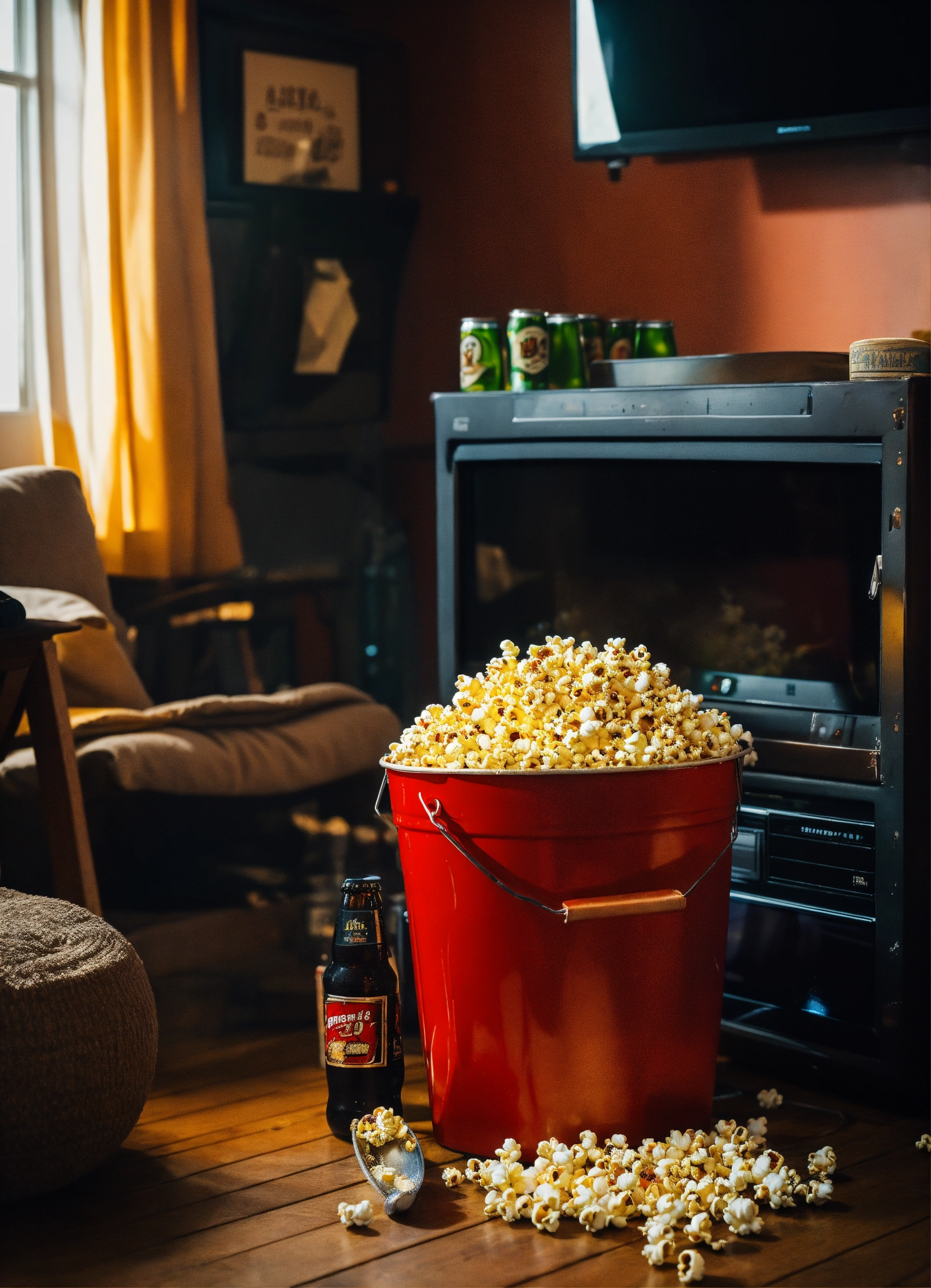 A bucket of popcorn and beers in a living room in front of a turned off television