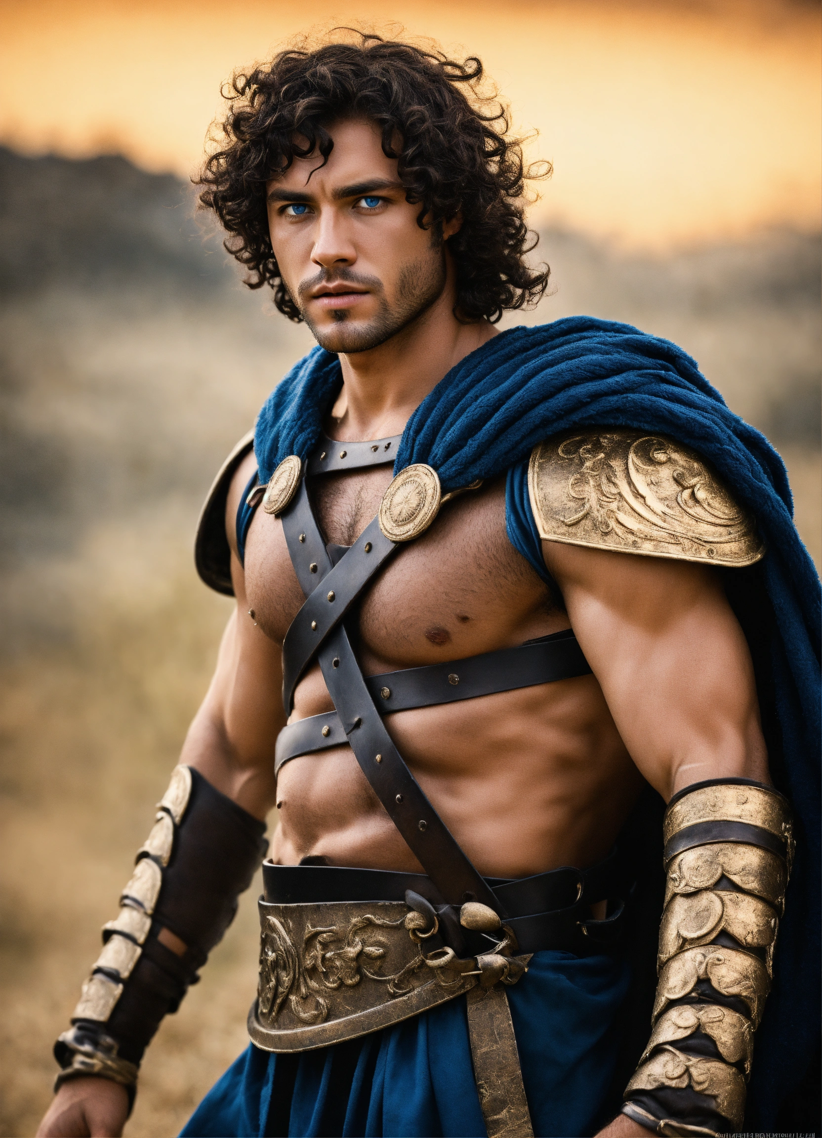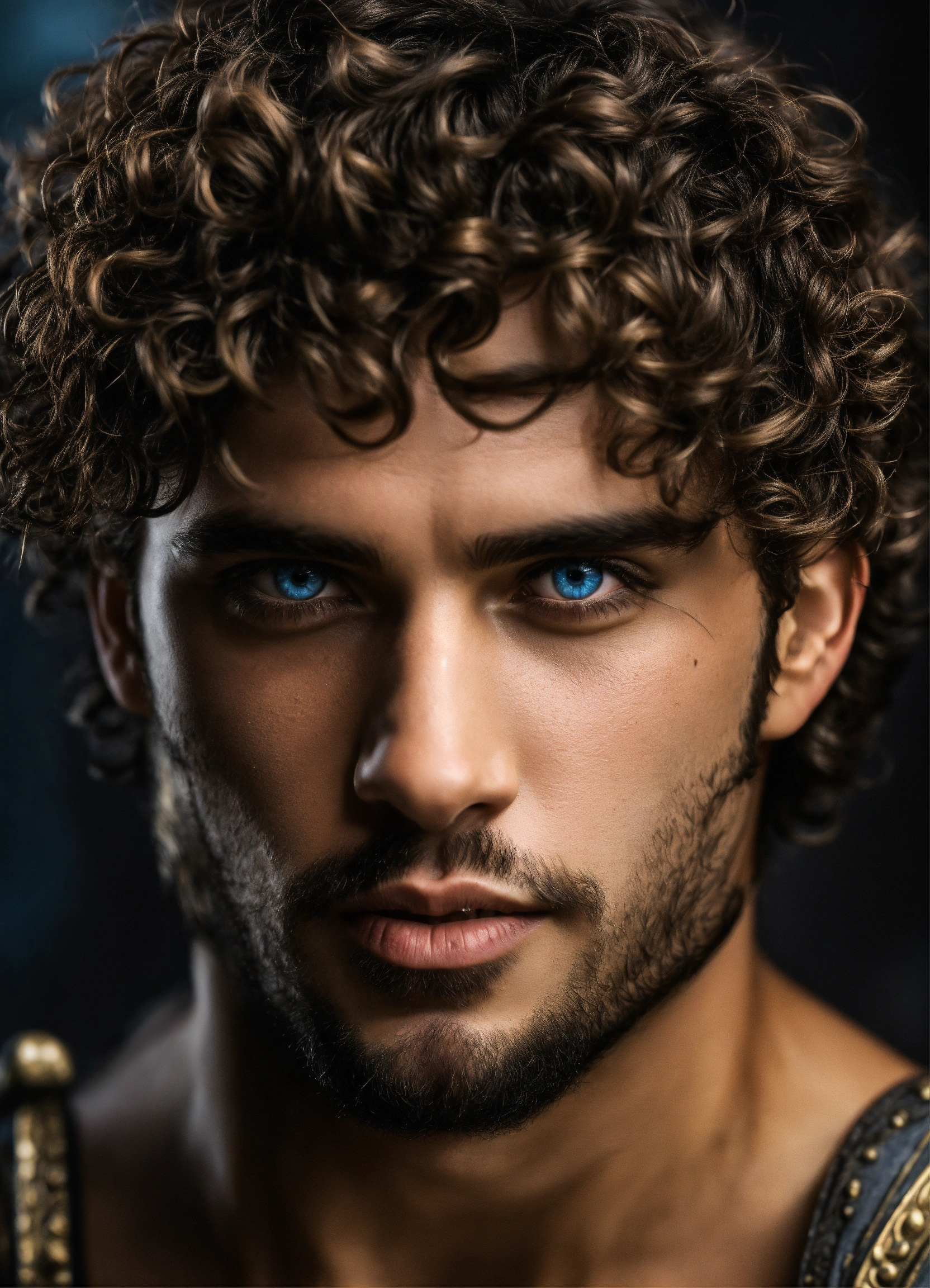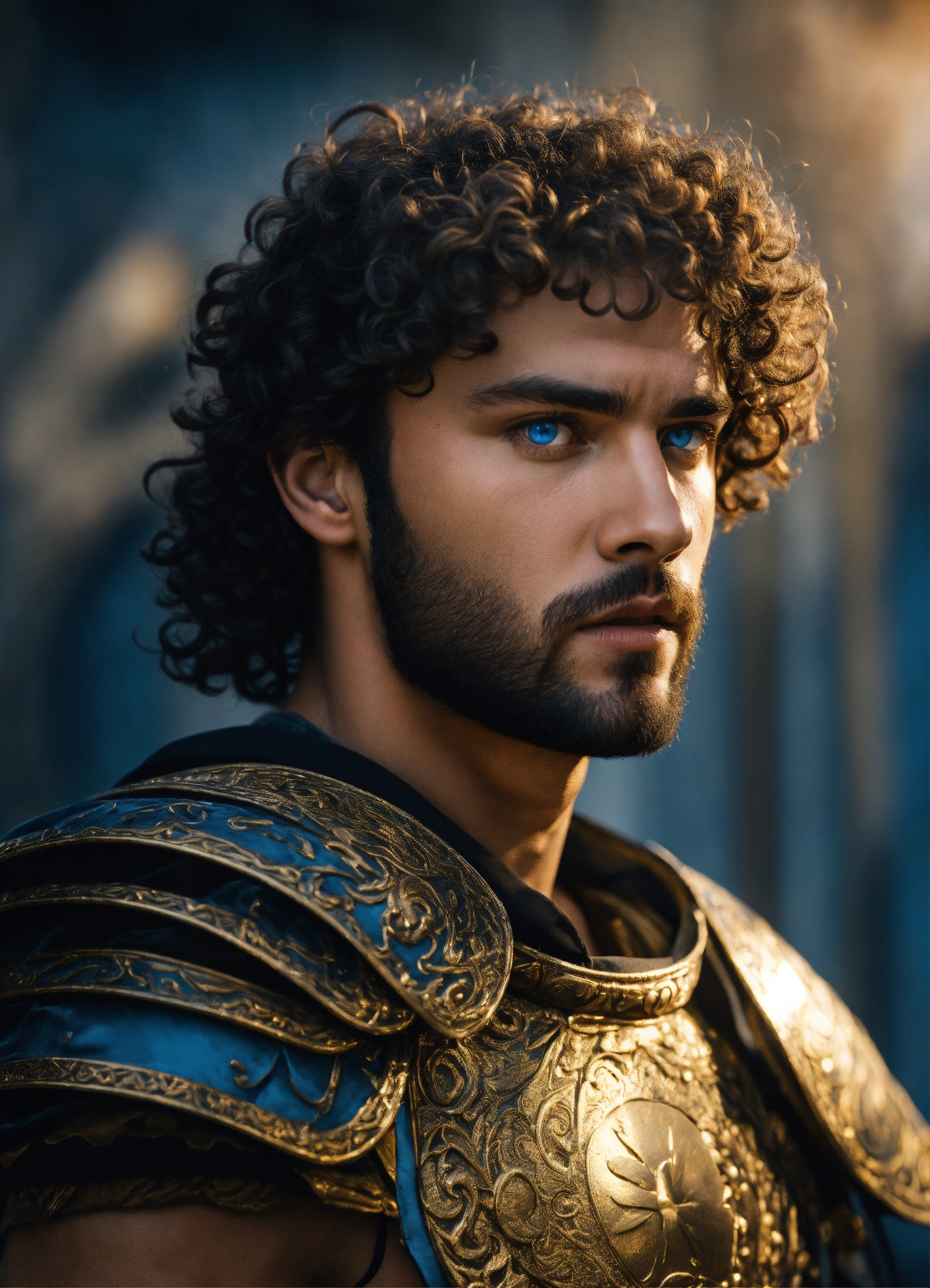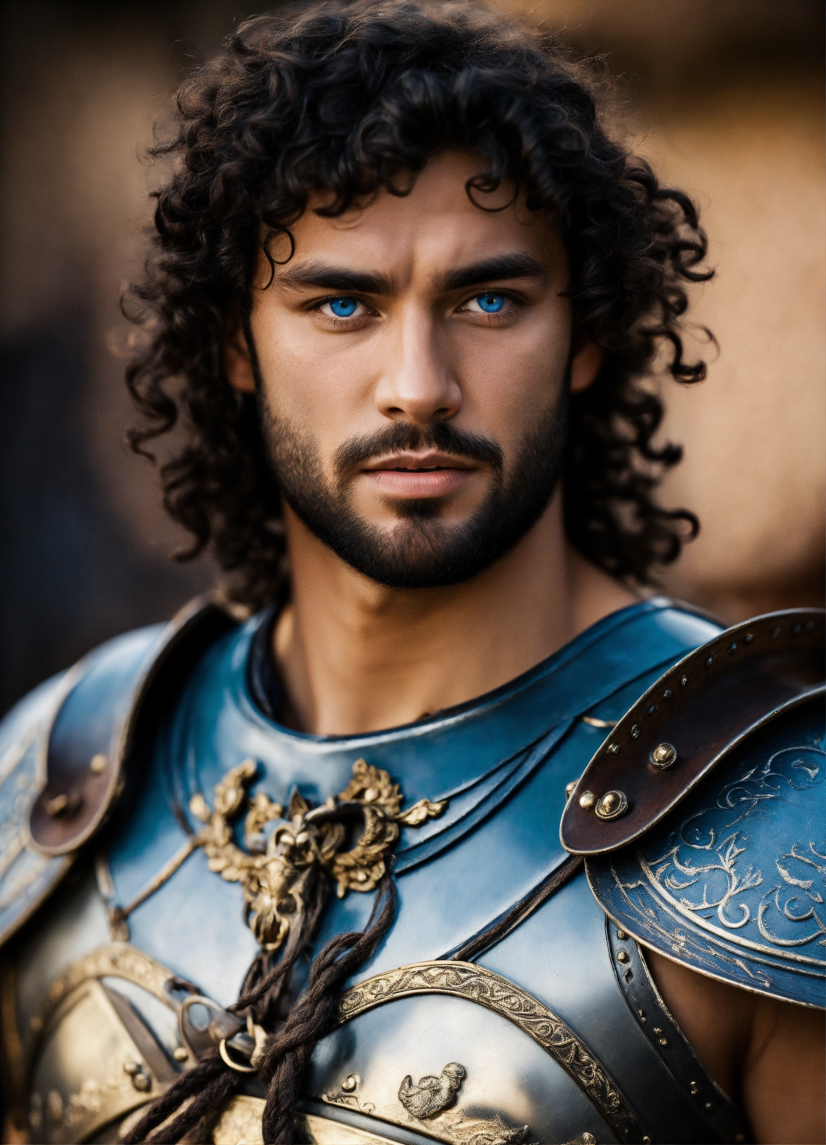 Man gladiator with blue eyes and curly hair black