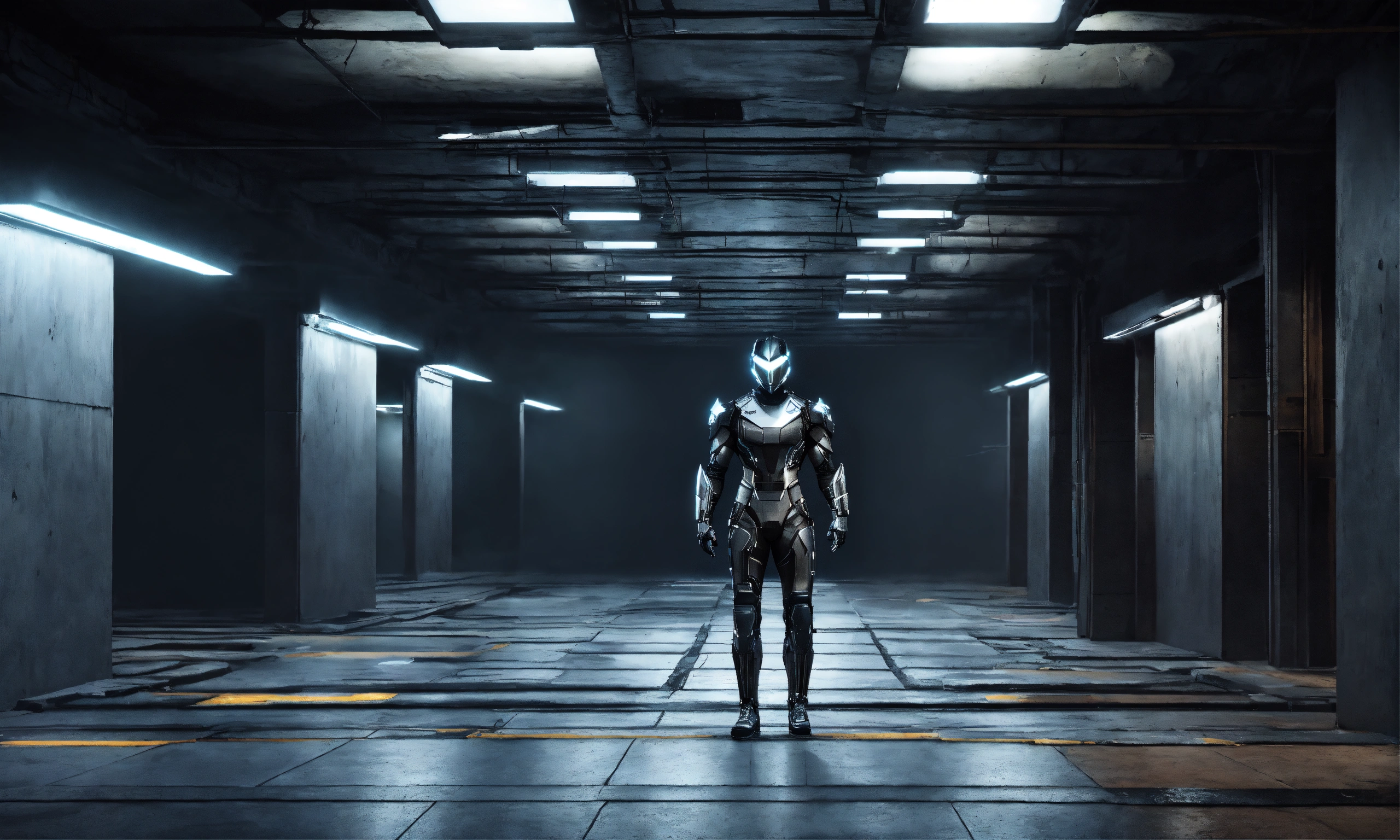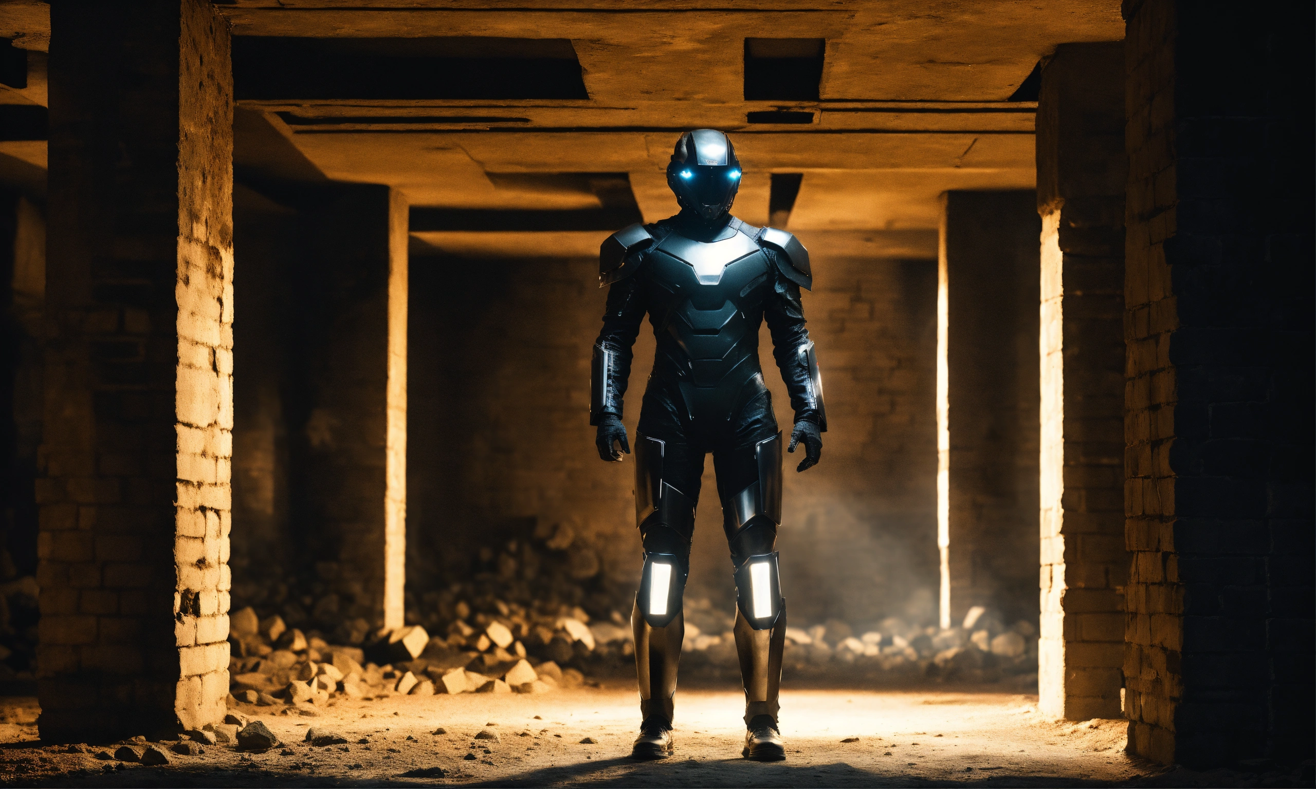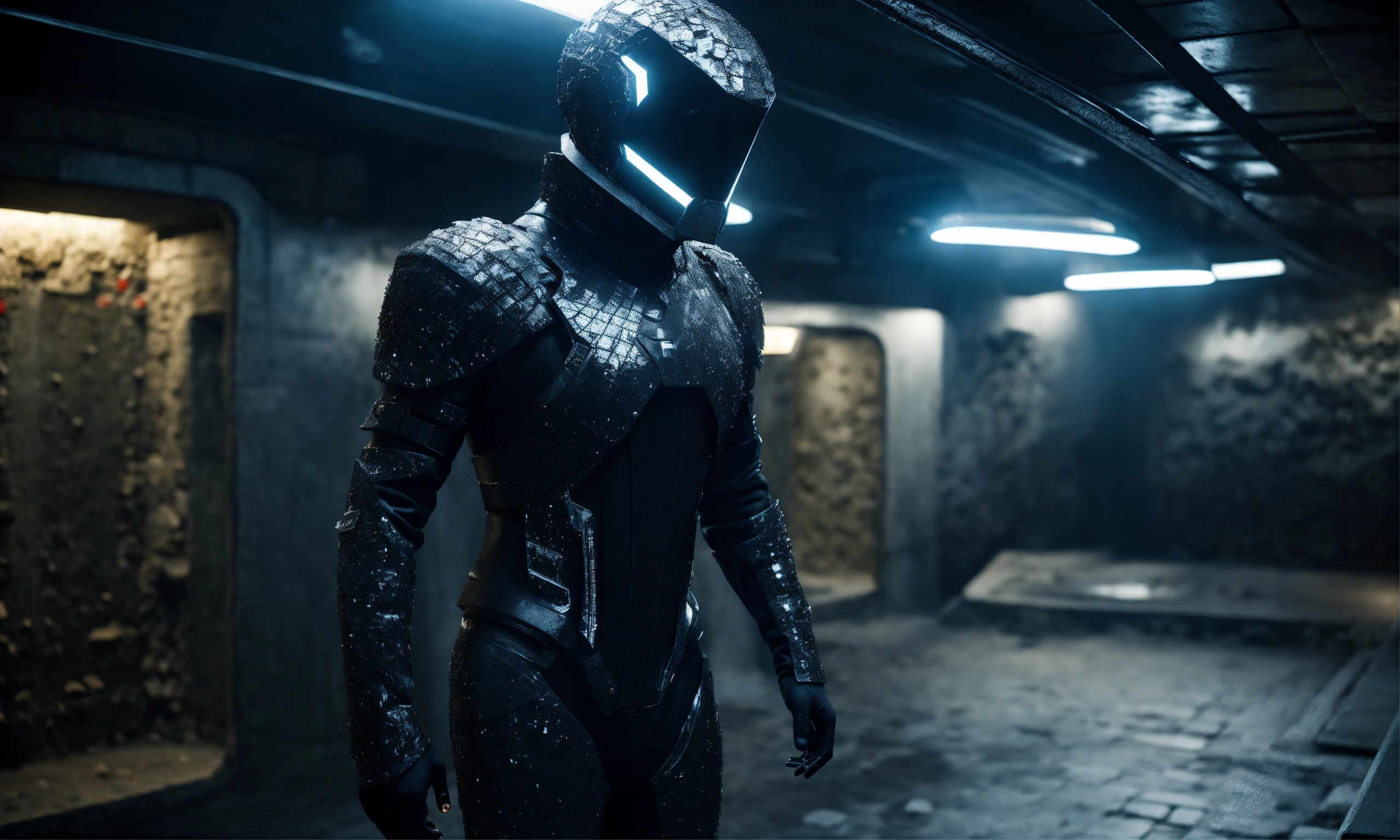 An ultrarealistic photograph of a minimalist futuristic full body power suit, without lights, made of black mate metal and polymer, full crystal hull, for a man, imposing, modern minimalism, elegant, dystopia, mysterious, godlike, scary, in ancient subway ruins with withe stone bricks wall and dirt ceiling, dramatic illumination, 8k