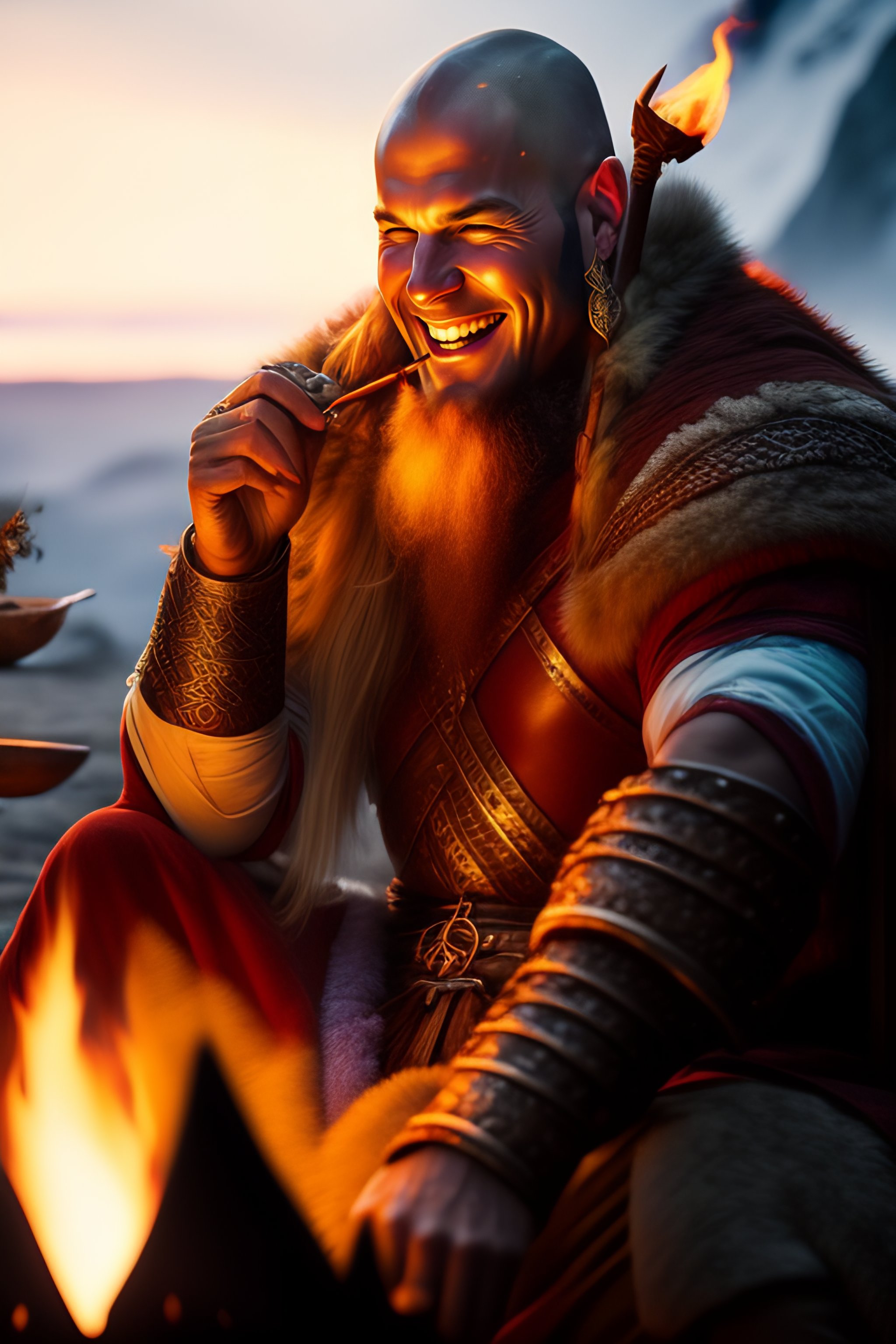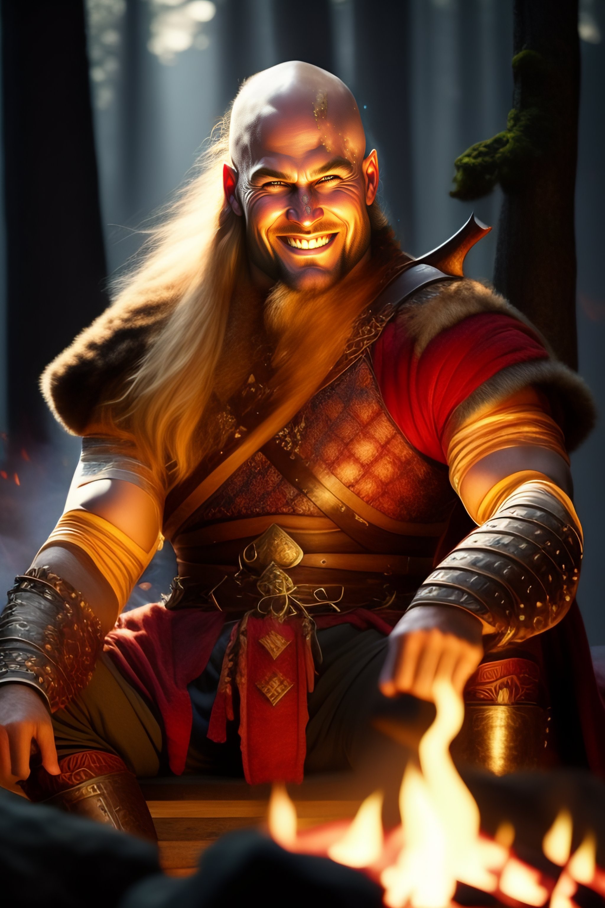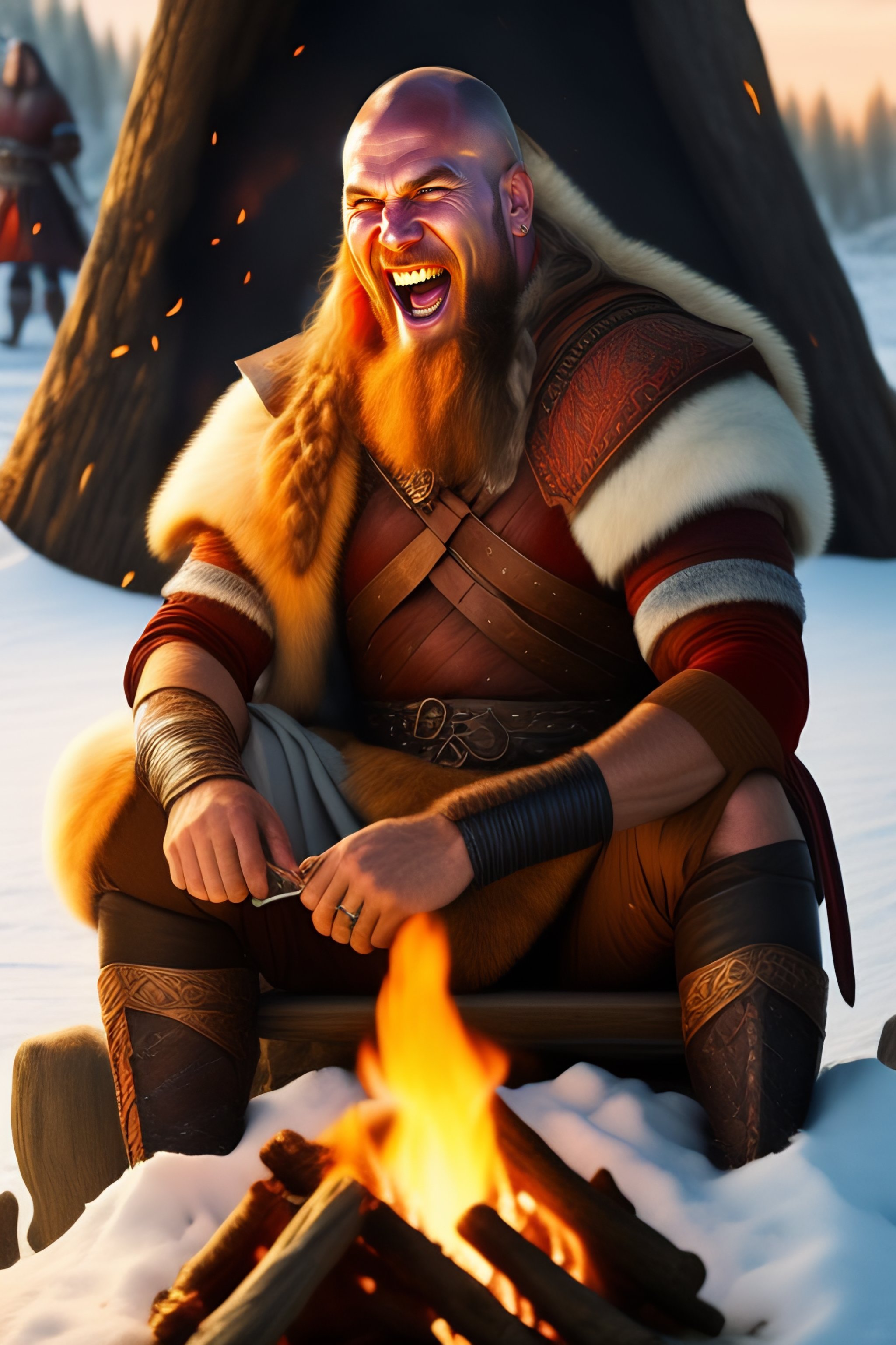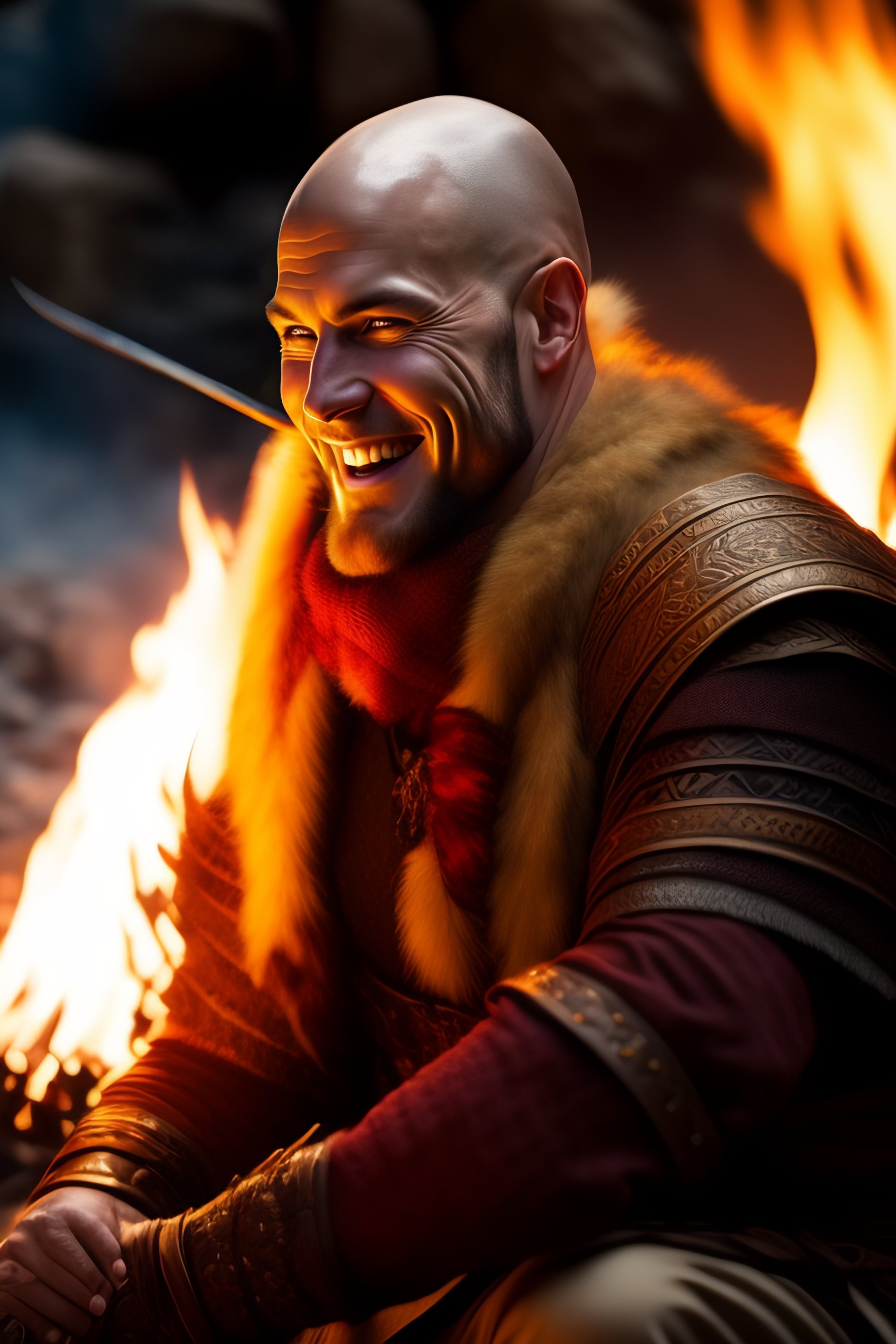 D&d bald clean-shaven viking berserker sitting by a campfire laughing heartily