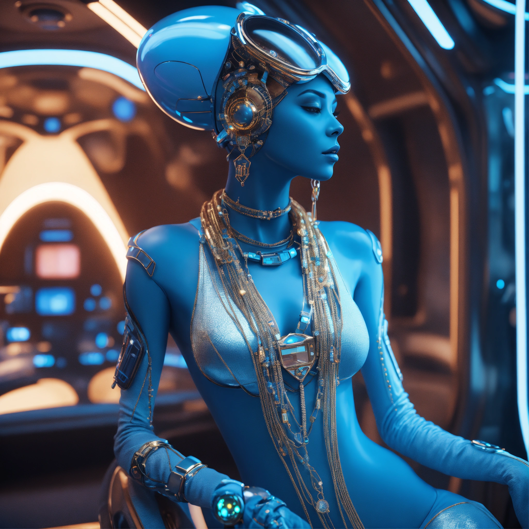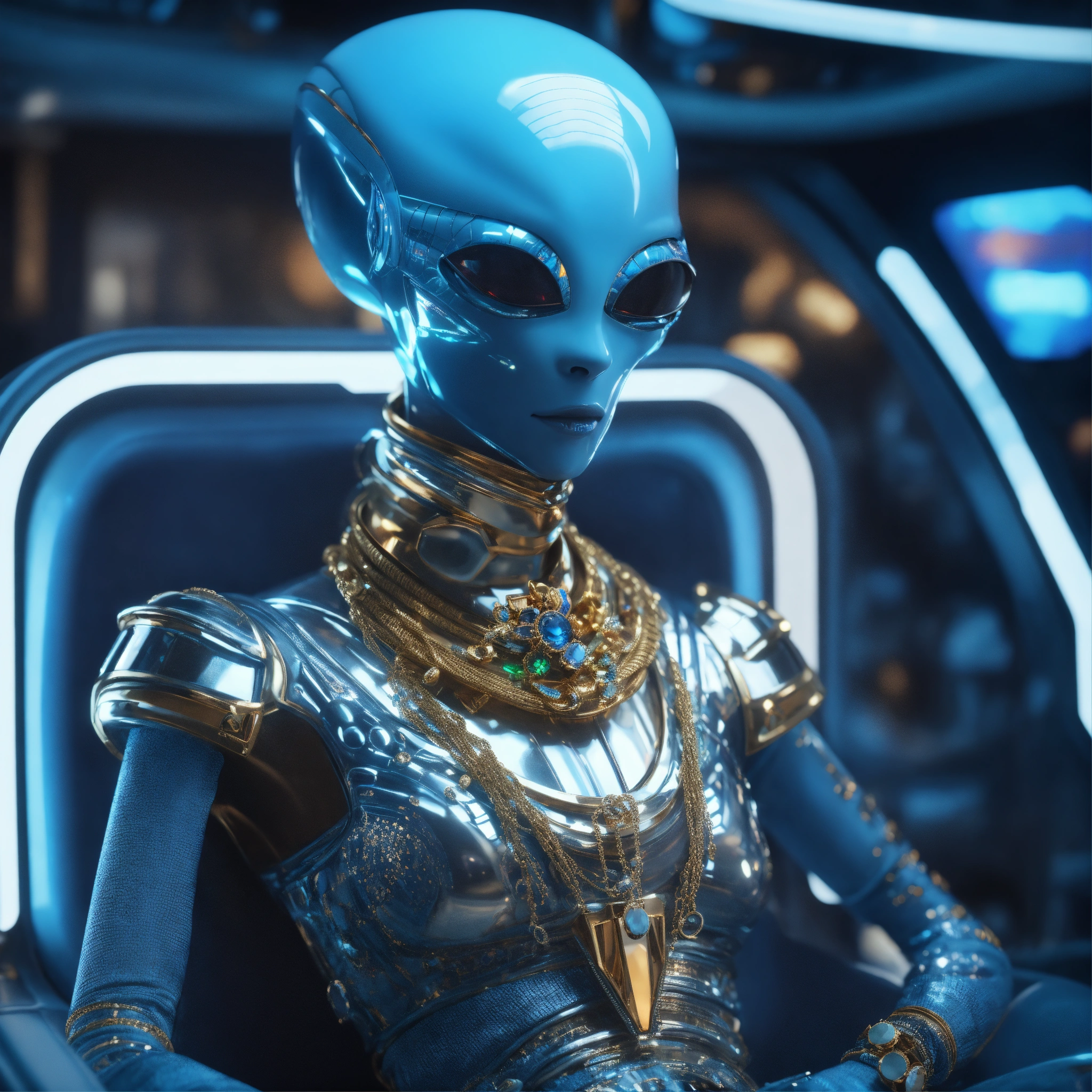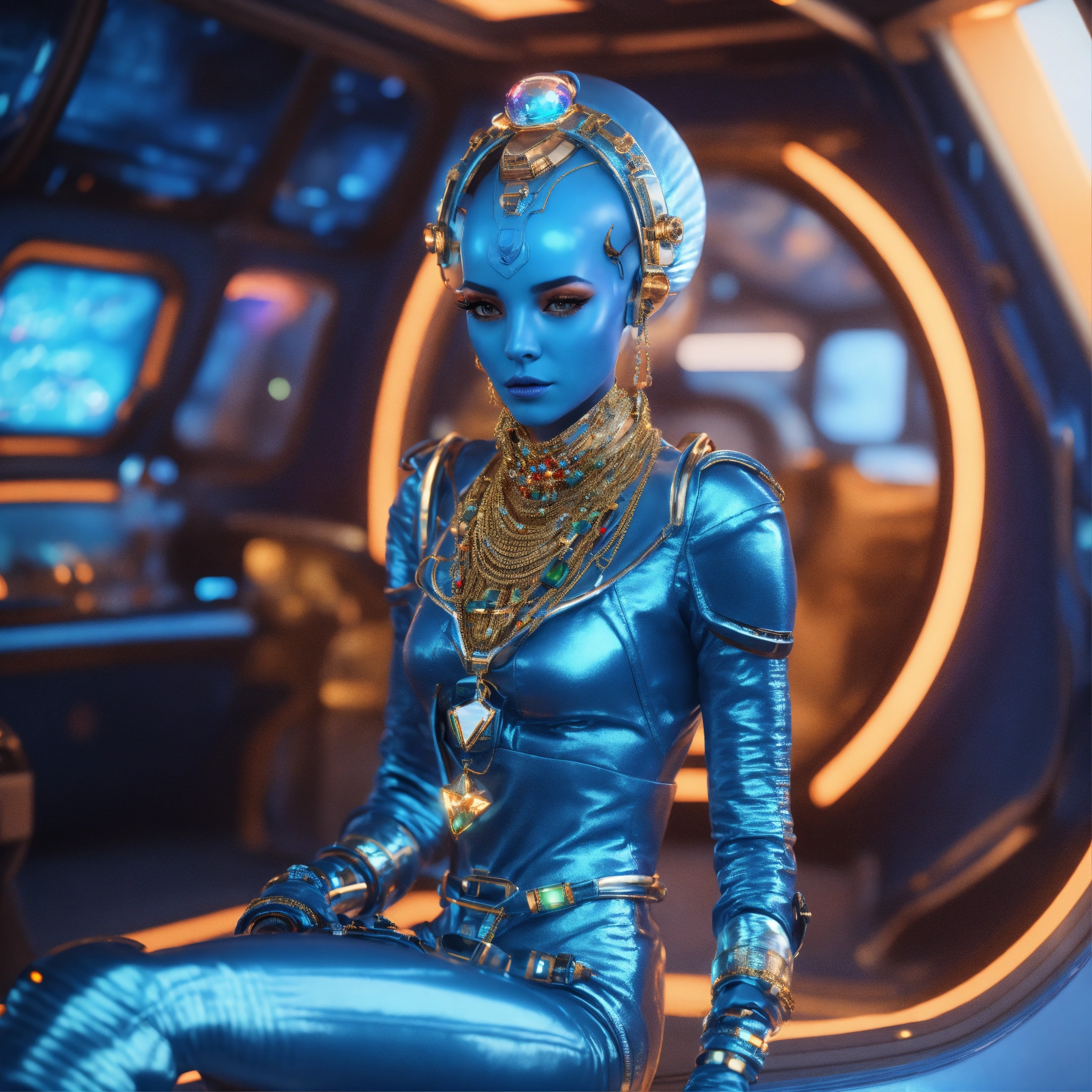 Zoom out from a cool blue alien wearing space fashion with alot of jewelry lounging in a futuristic space yacht, realistic, futuristic, sci-fi, 8k, unreal engine