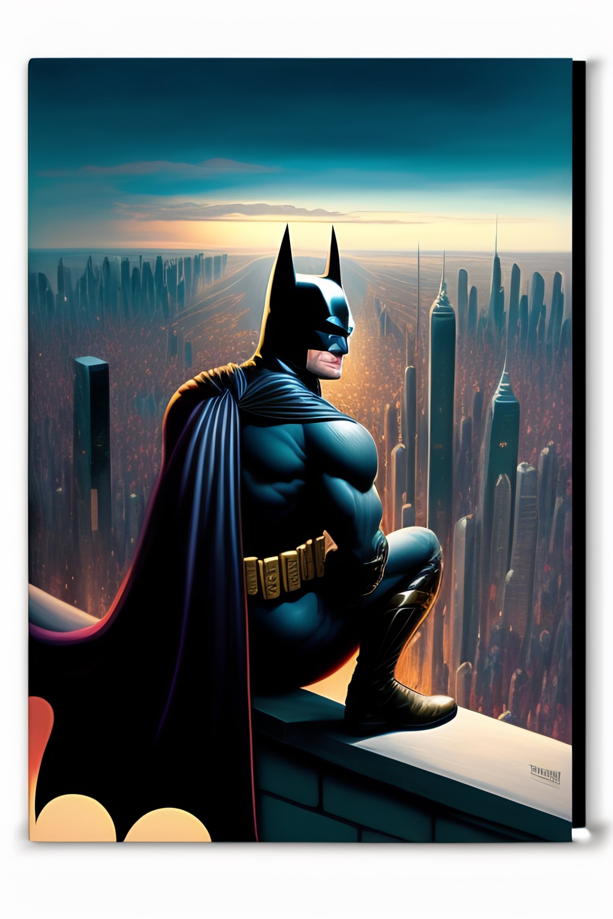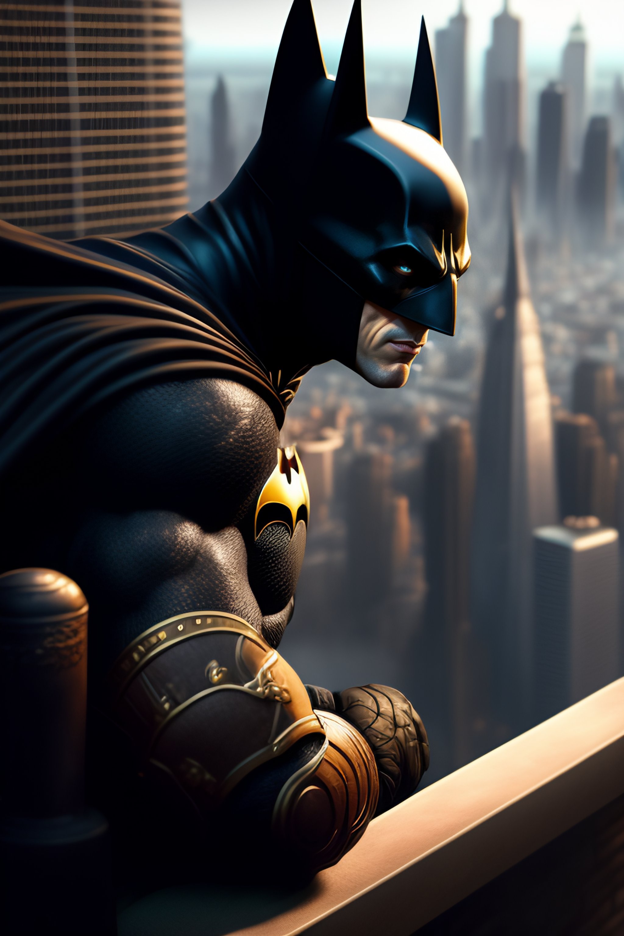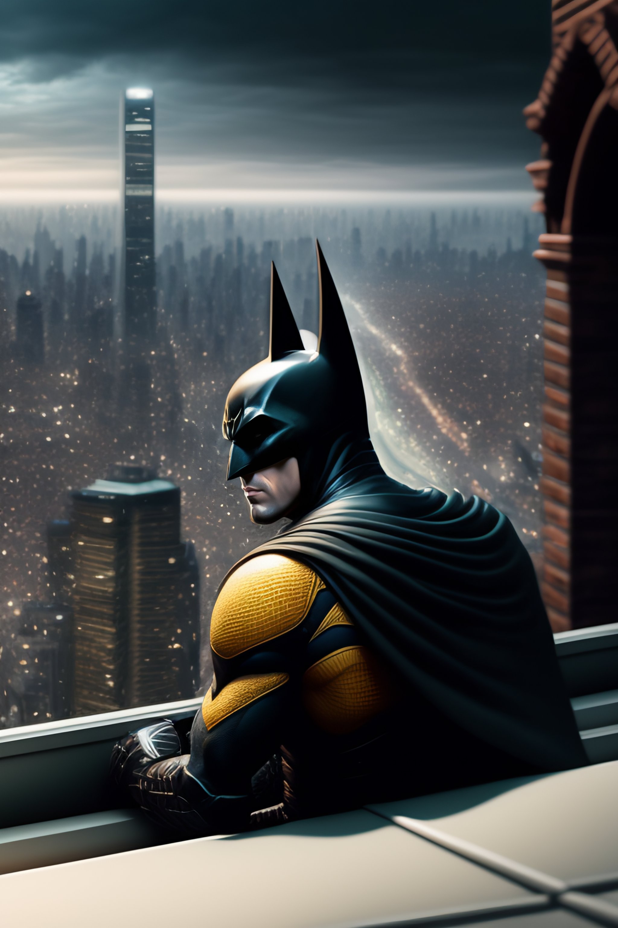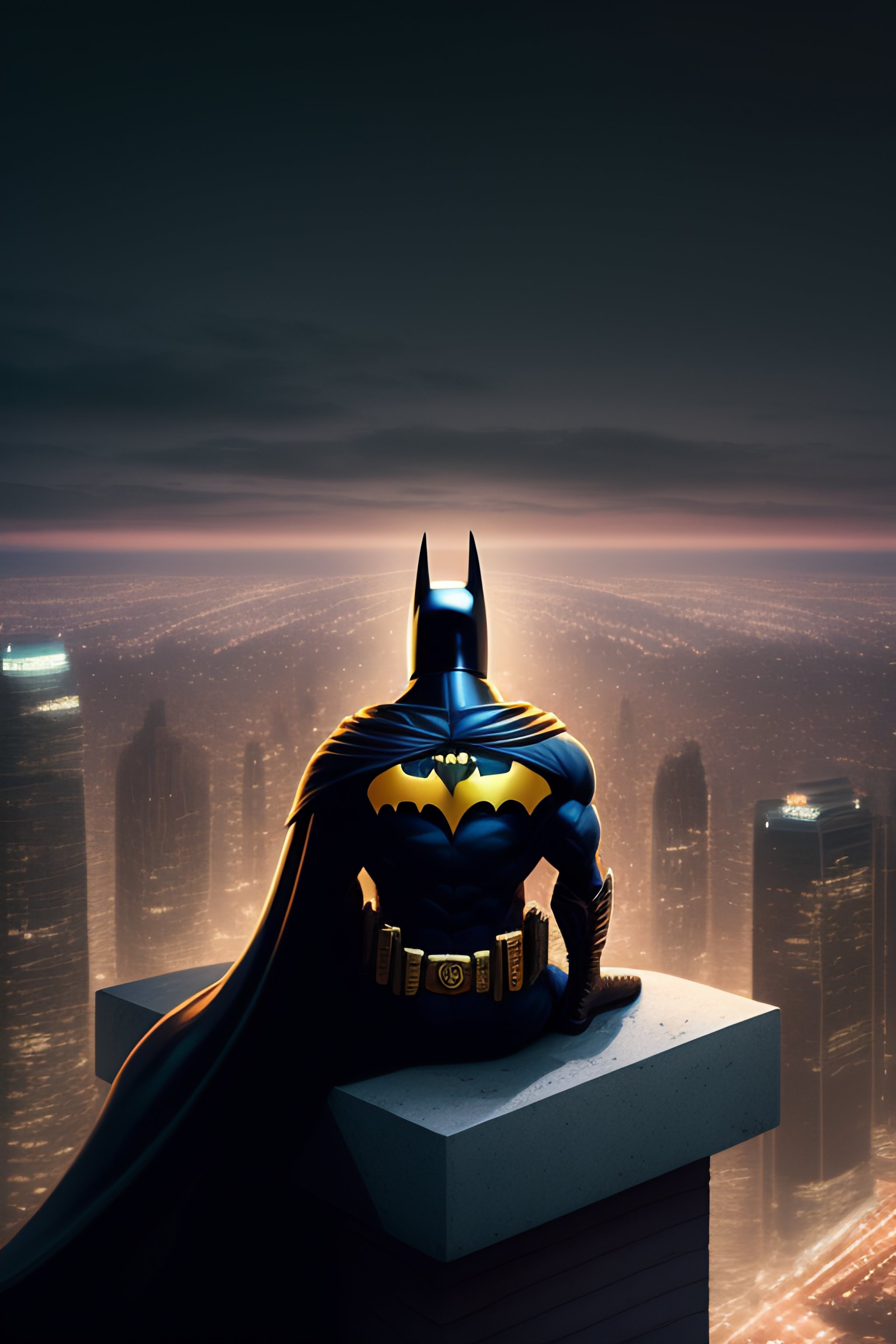 Batman sitting on a roof looking down at a city below