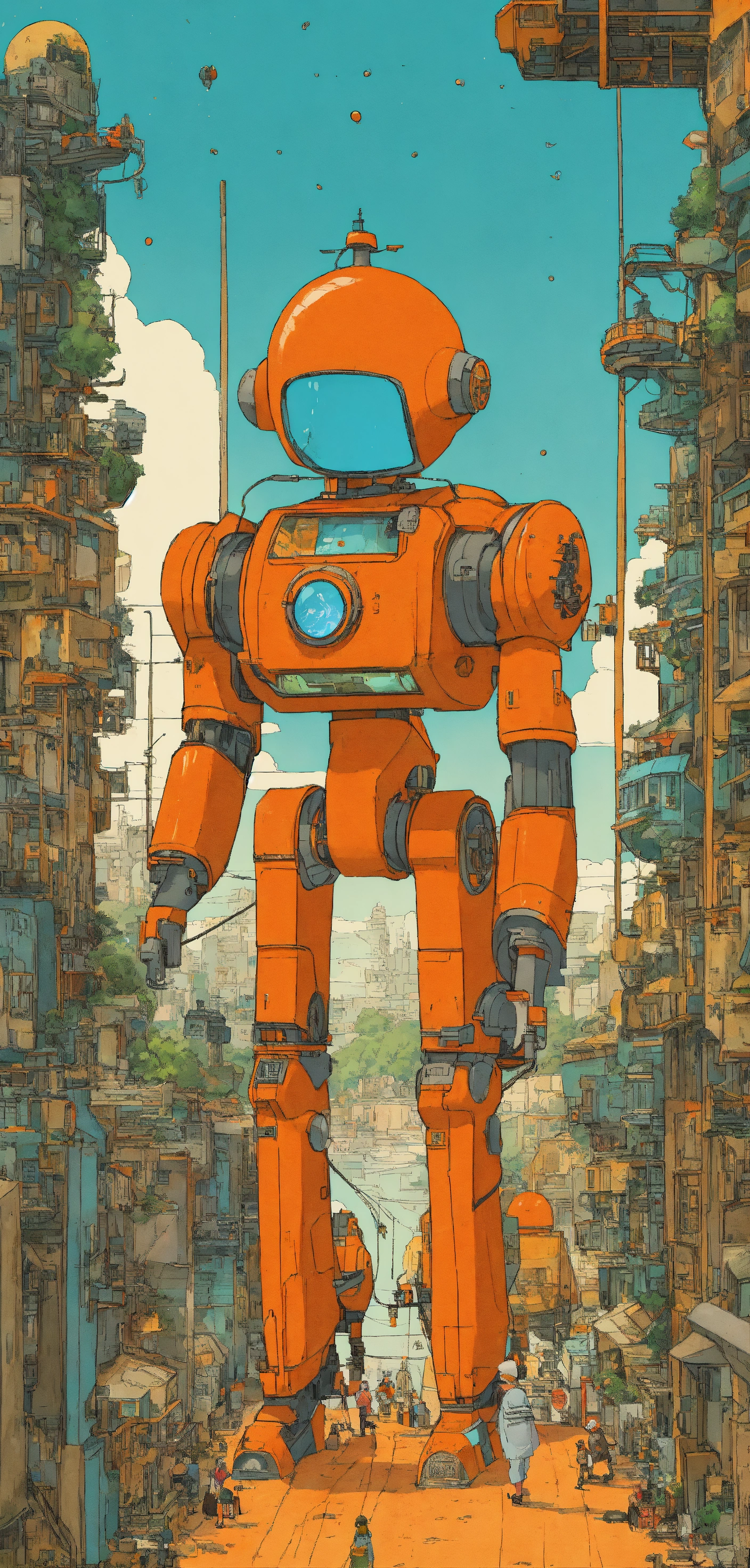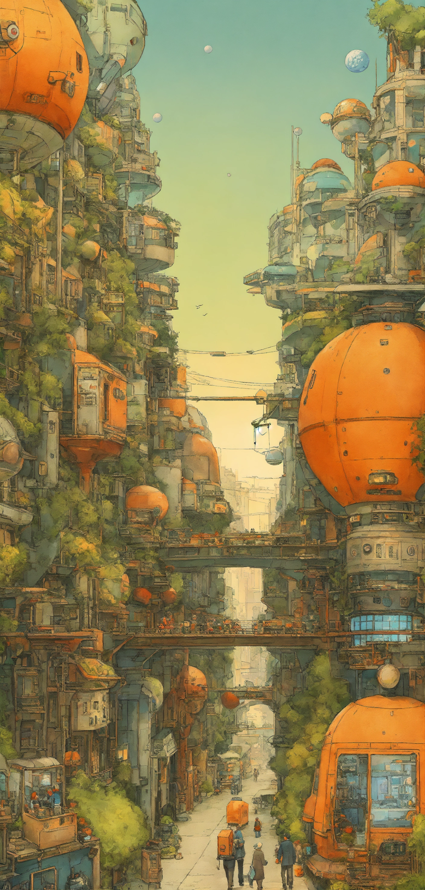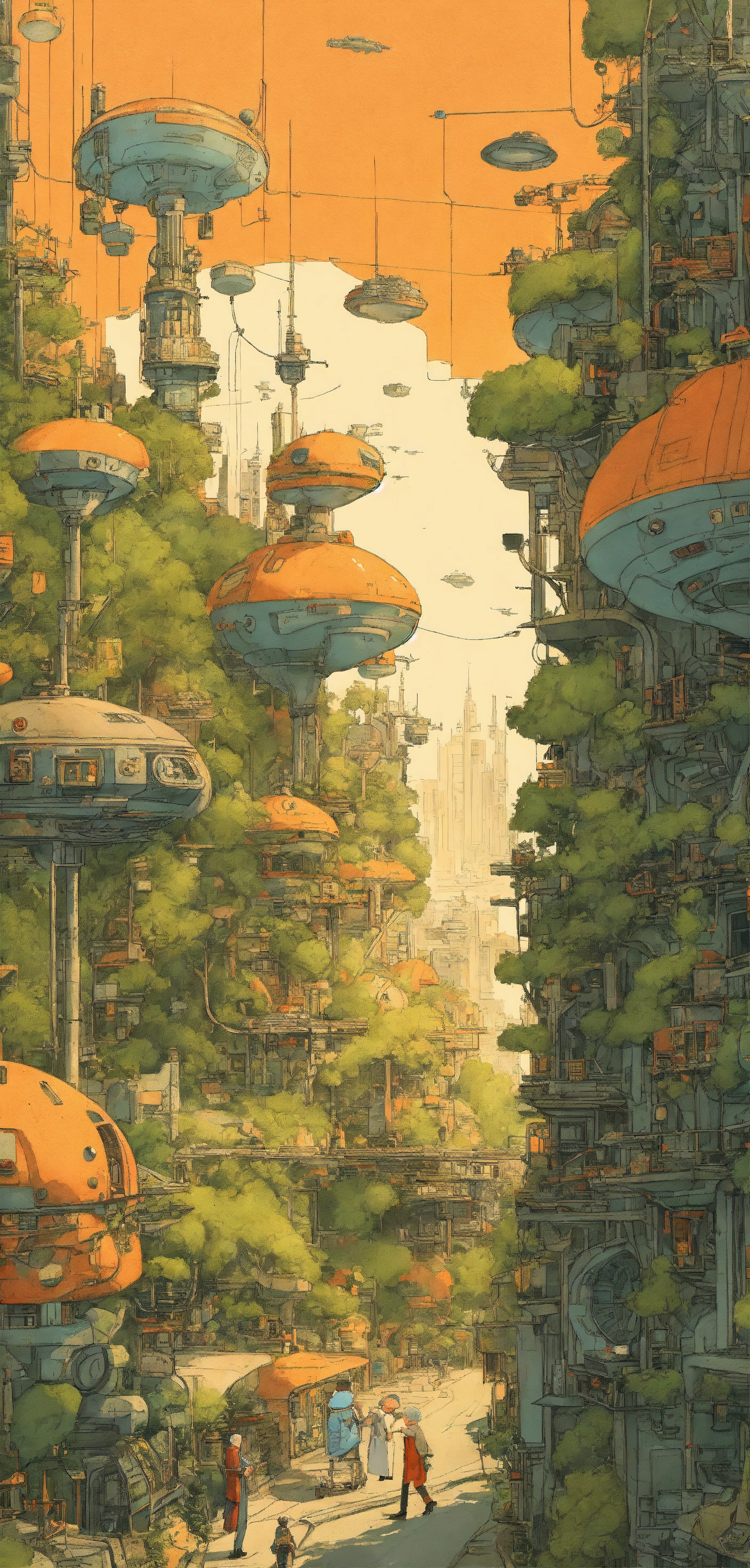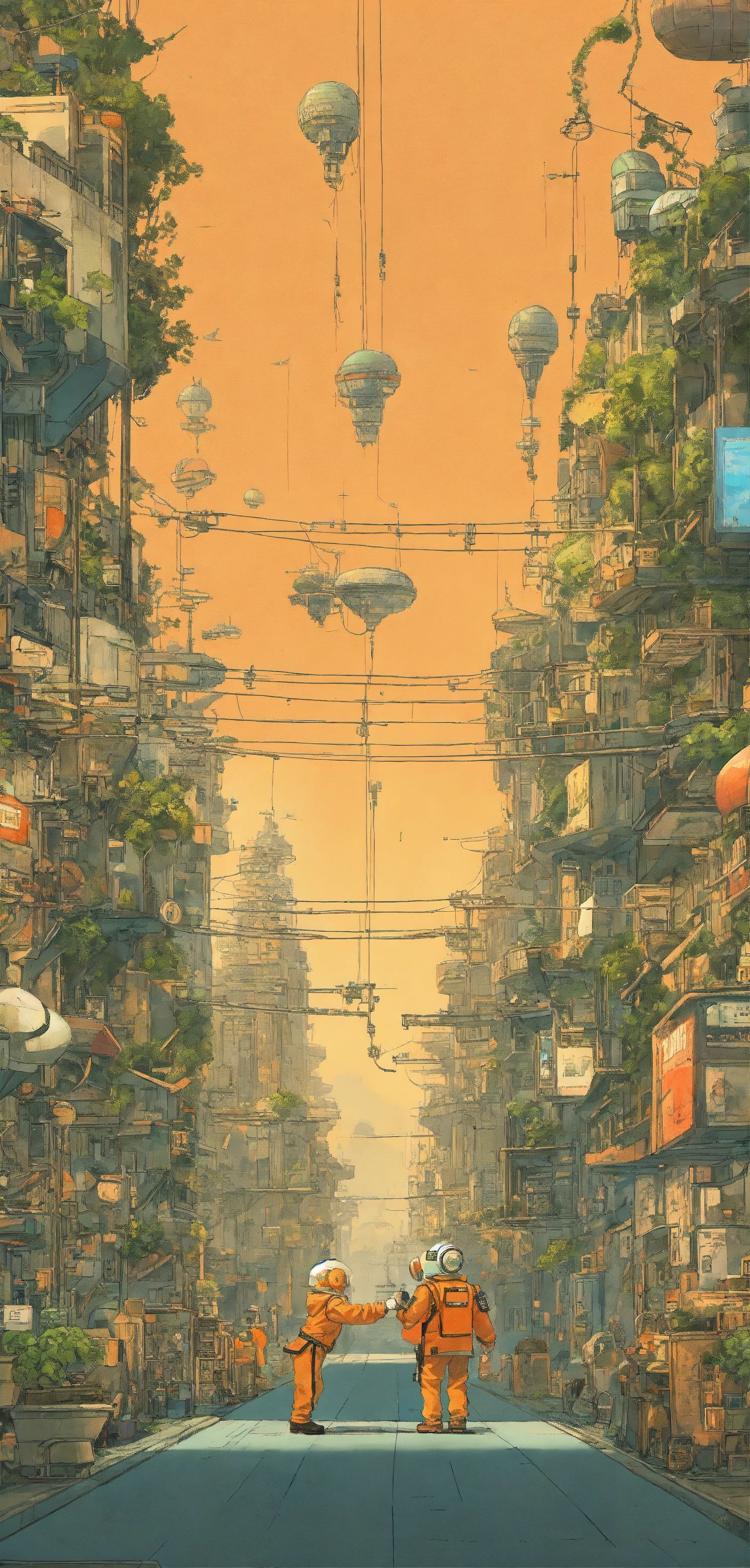 Create a futuristic, vibrant illustration inspired by mattias adolfsson's art style. the illustration should depict a senior citizen shaking hands with an orange robot in a futurepunk setting. the scene should take place in an advanced urban sprawl that is covered in greenery and overlooks another advanced urban sprawl. the colors used should be vibrant and create an otherworldly feeling. please ensure that the sci-fi ambiance is prominent in the artwork.