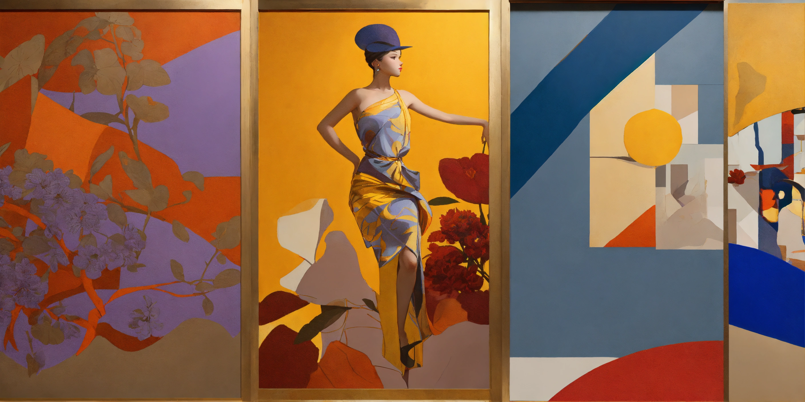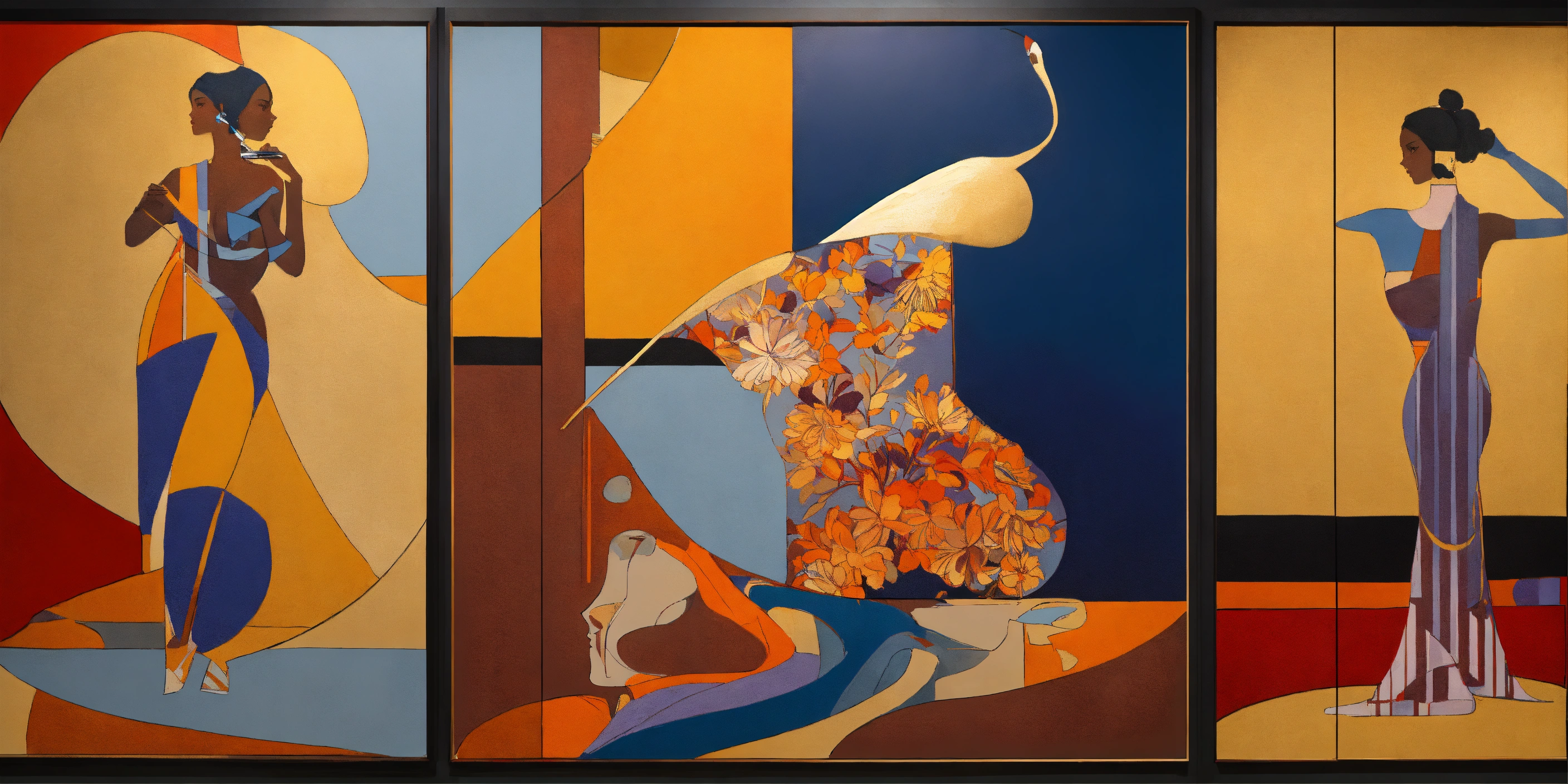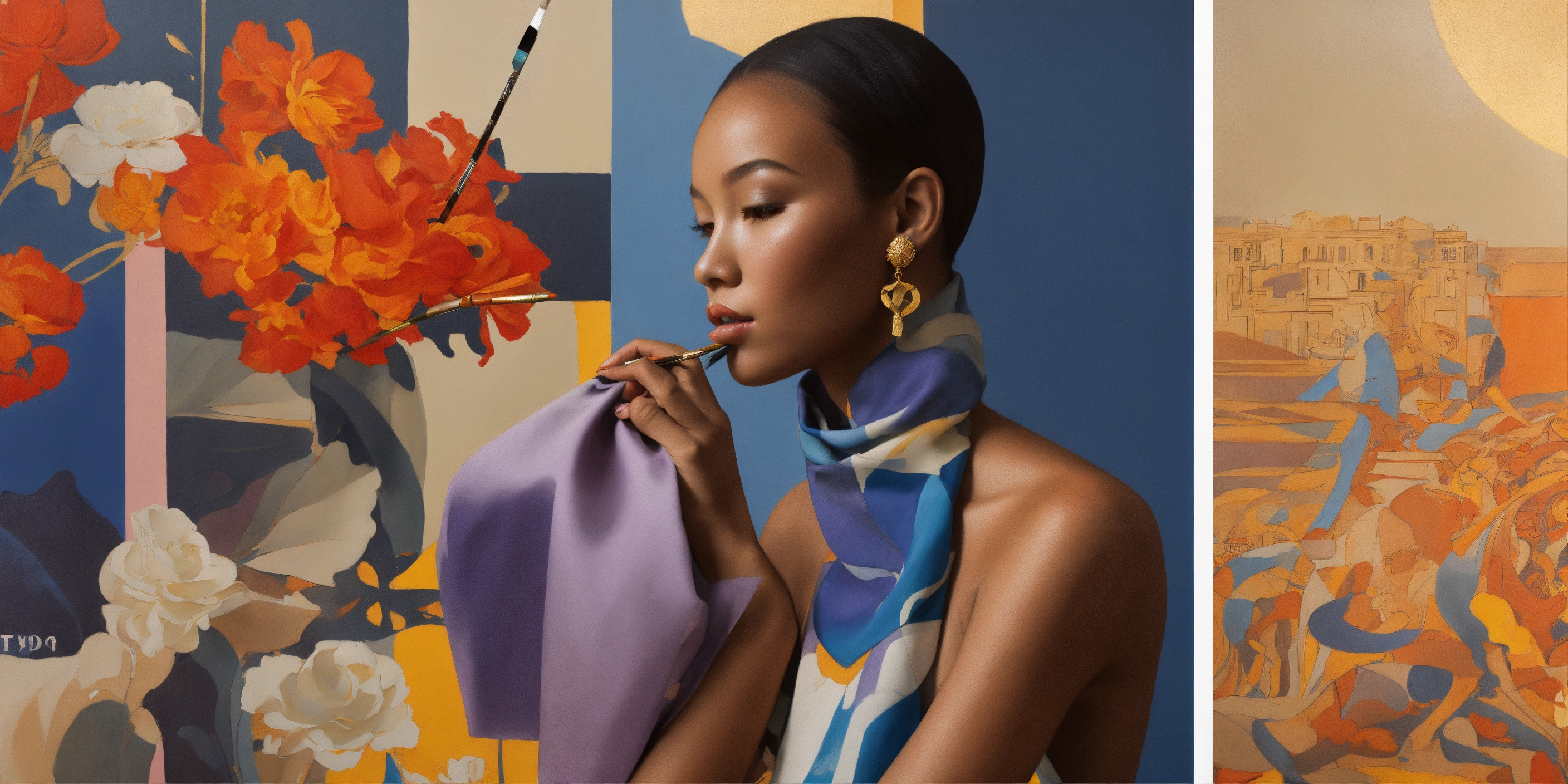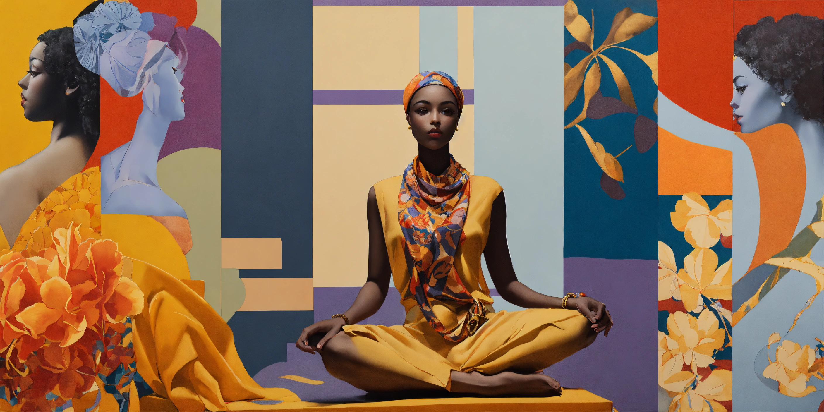 Focused collage of flowers and geometry, slate-blue red orange yellow, by james jean and edward hopper, mockup for hermes scarf, multiple looks and layout, typography, square silk scarves, lookbook for hermes branding, surreal angelic eritrean painted-female beings phi limbs, hollow anatomy, (brown american urban ethnicity), exploded bauhaus colorfield scene, fine pencil rendering of ladies body curves, [purple], graffiti influence modern deco lines and overlapping shadow reflection creole woven, painted moma exhibit, ((heavy paint brush strokes)), impressive large bust, gold jewelry adornments, beautiful large bird sunrise scene, on greek vase silhouette contrast, triptych