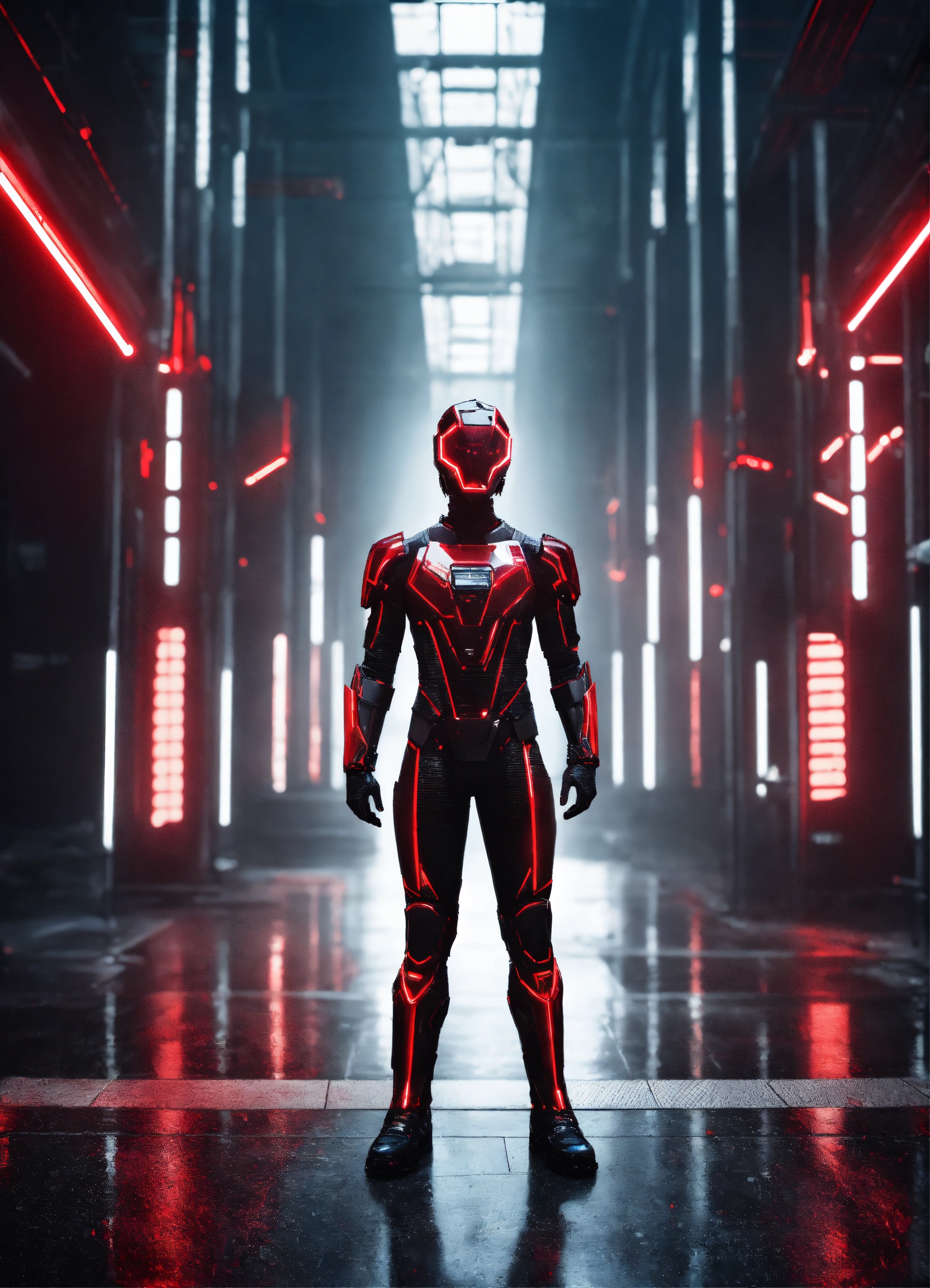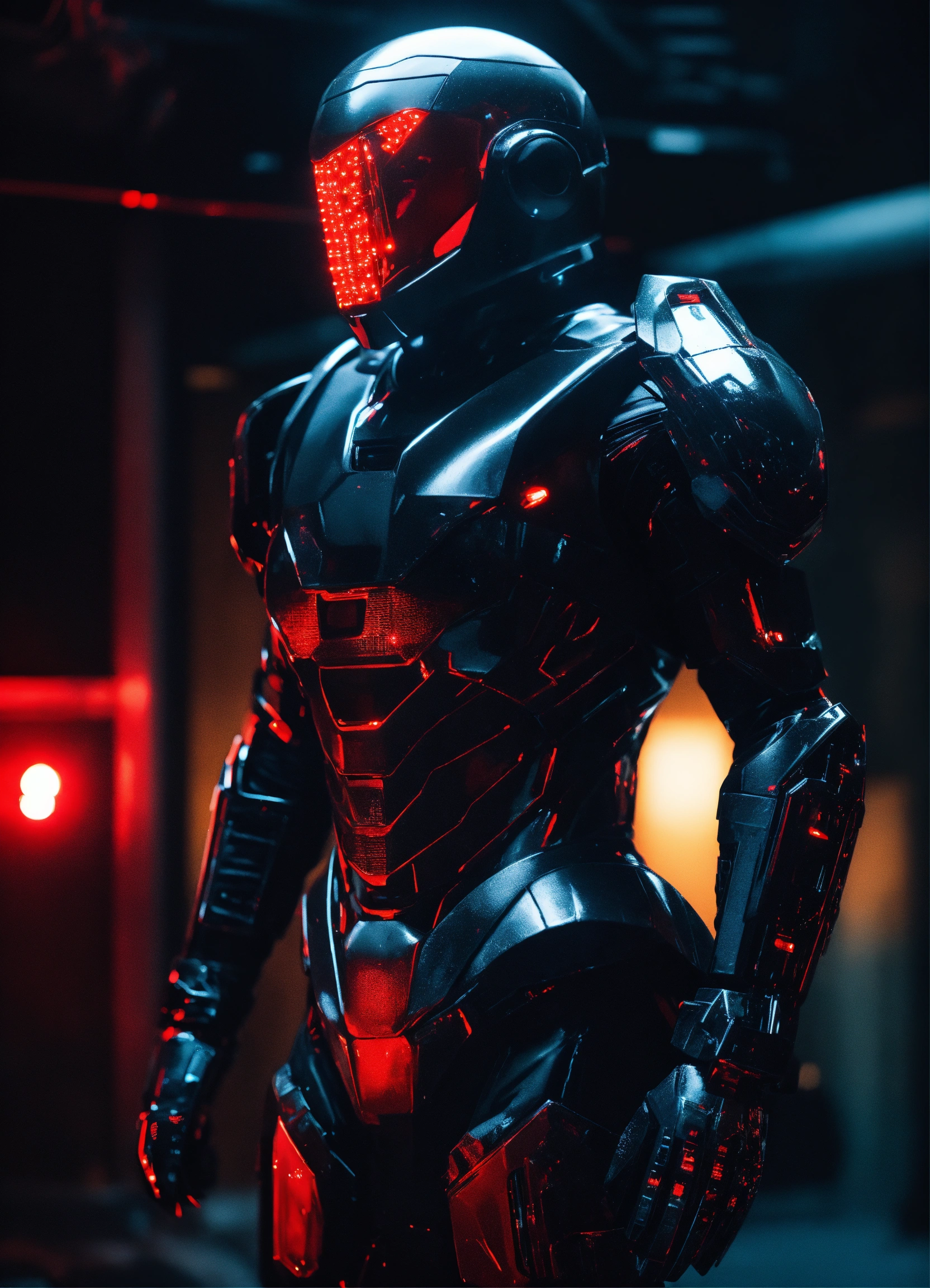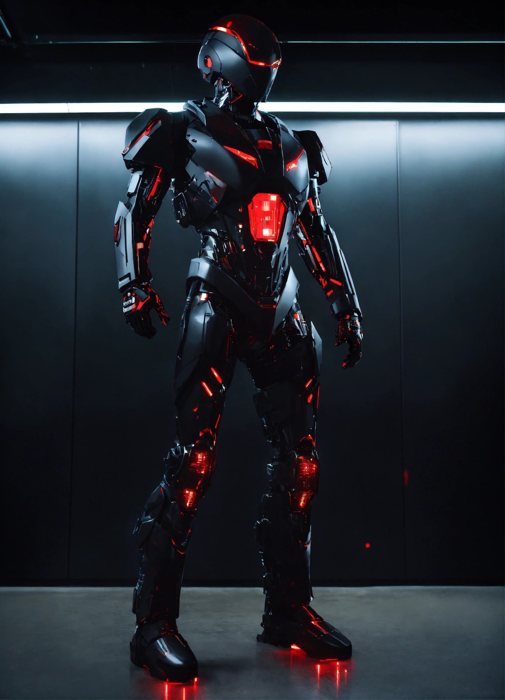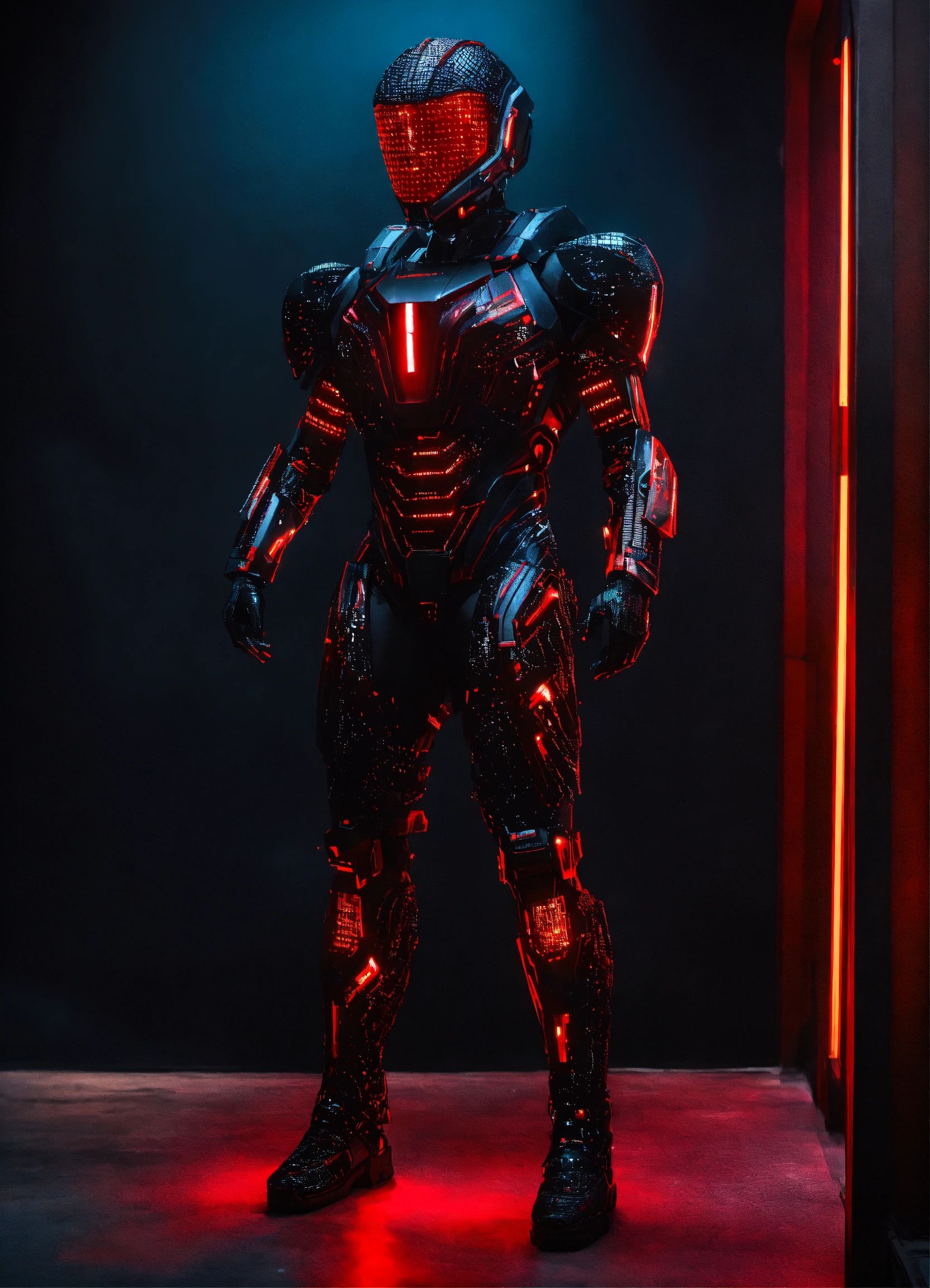 An ultrarealistic photograph of an enormous minimalist futuristic full body power suit, without lights, made of black mate metal and polymer, full crystal hull, for a young boy, imposing, modern minimalism, elegant, dystopia, mysterious, godlike, scary, with some red lights, with a dark background with red leds, very dramatic illumination, hyperdetailed, hyperrealistic, 8 k