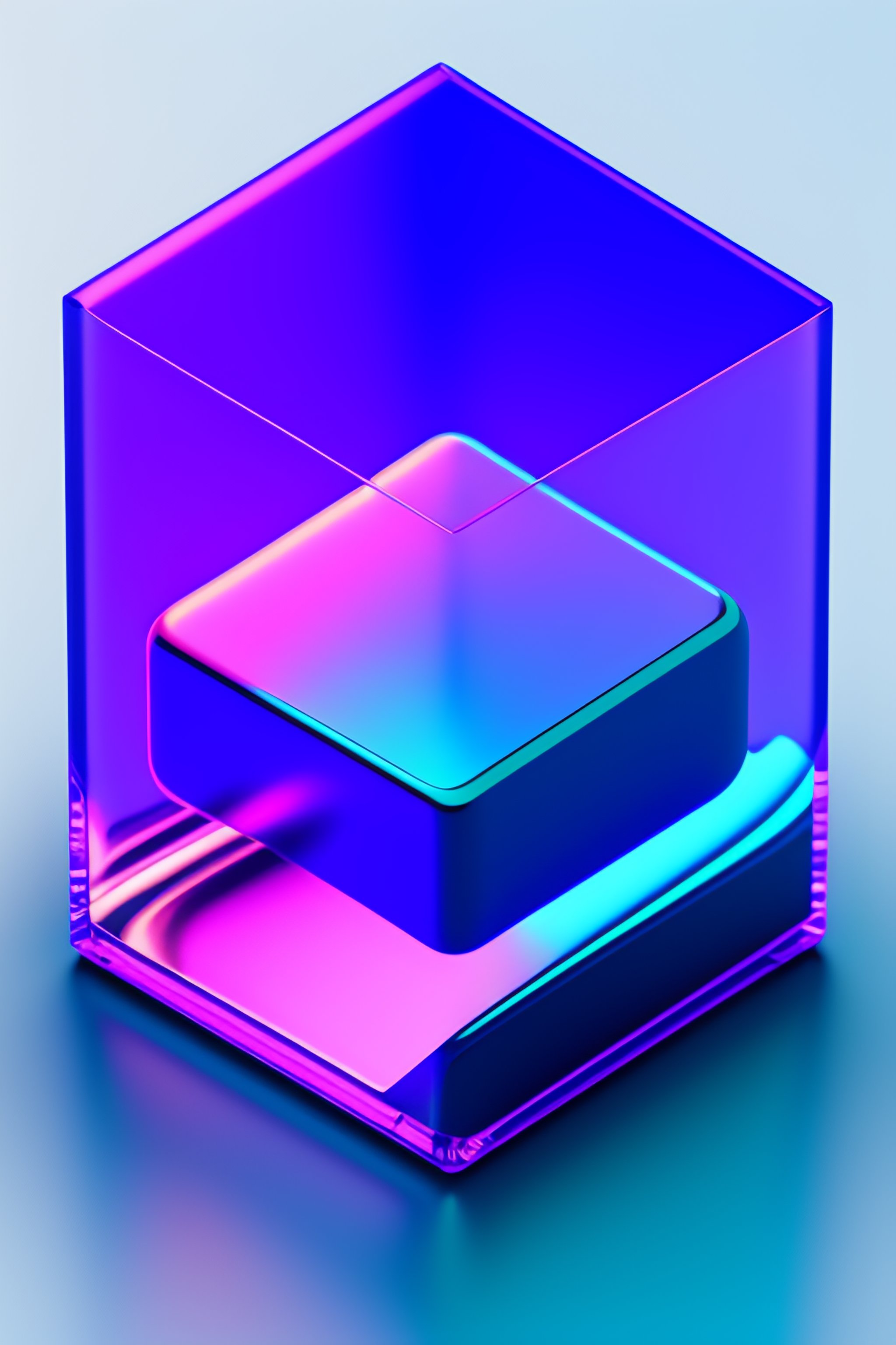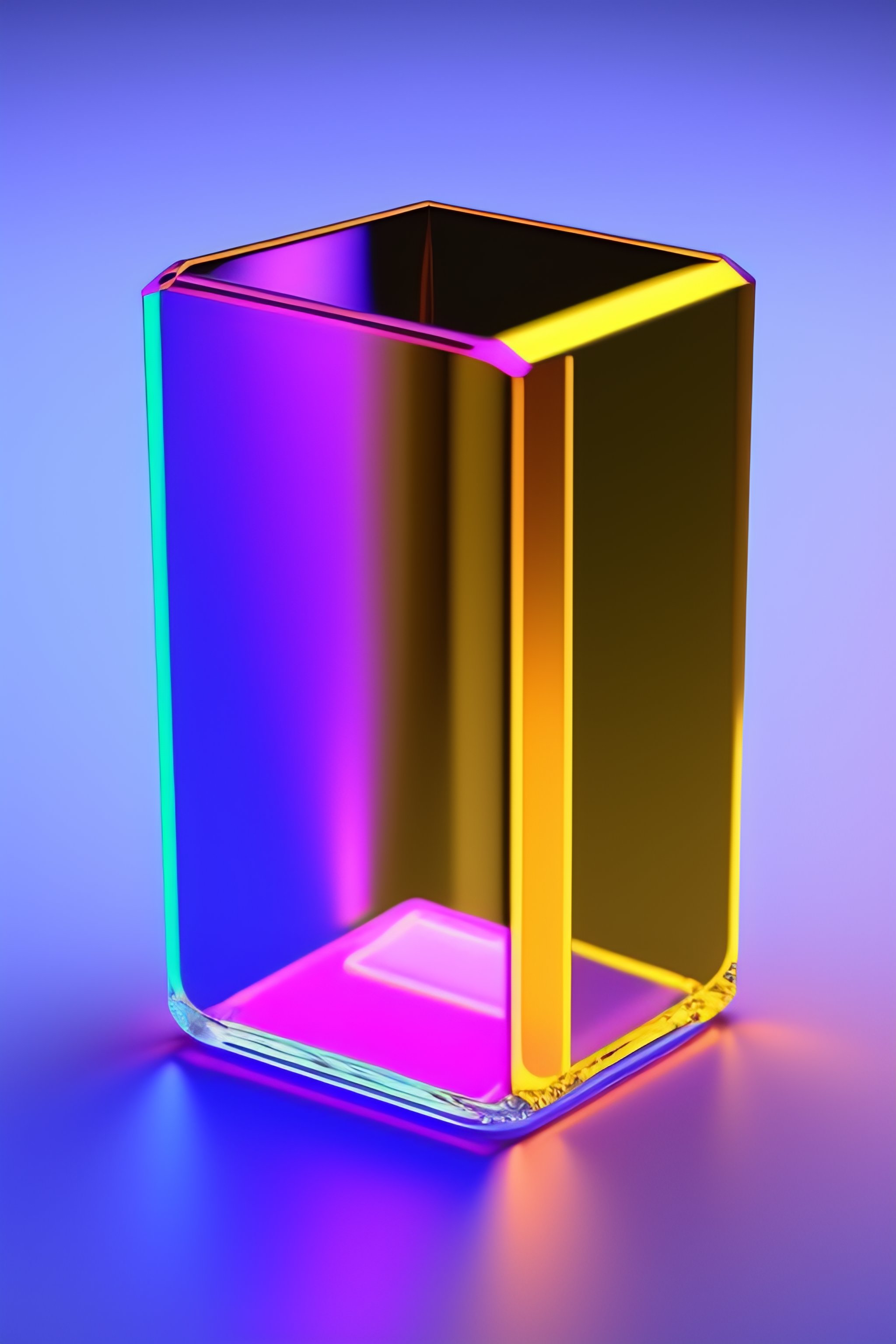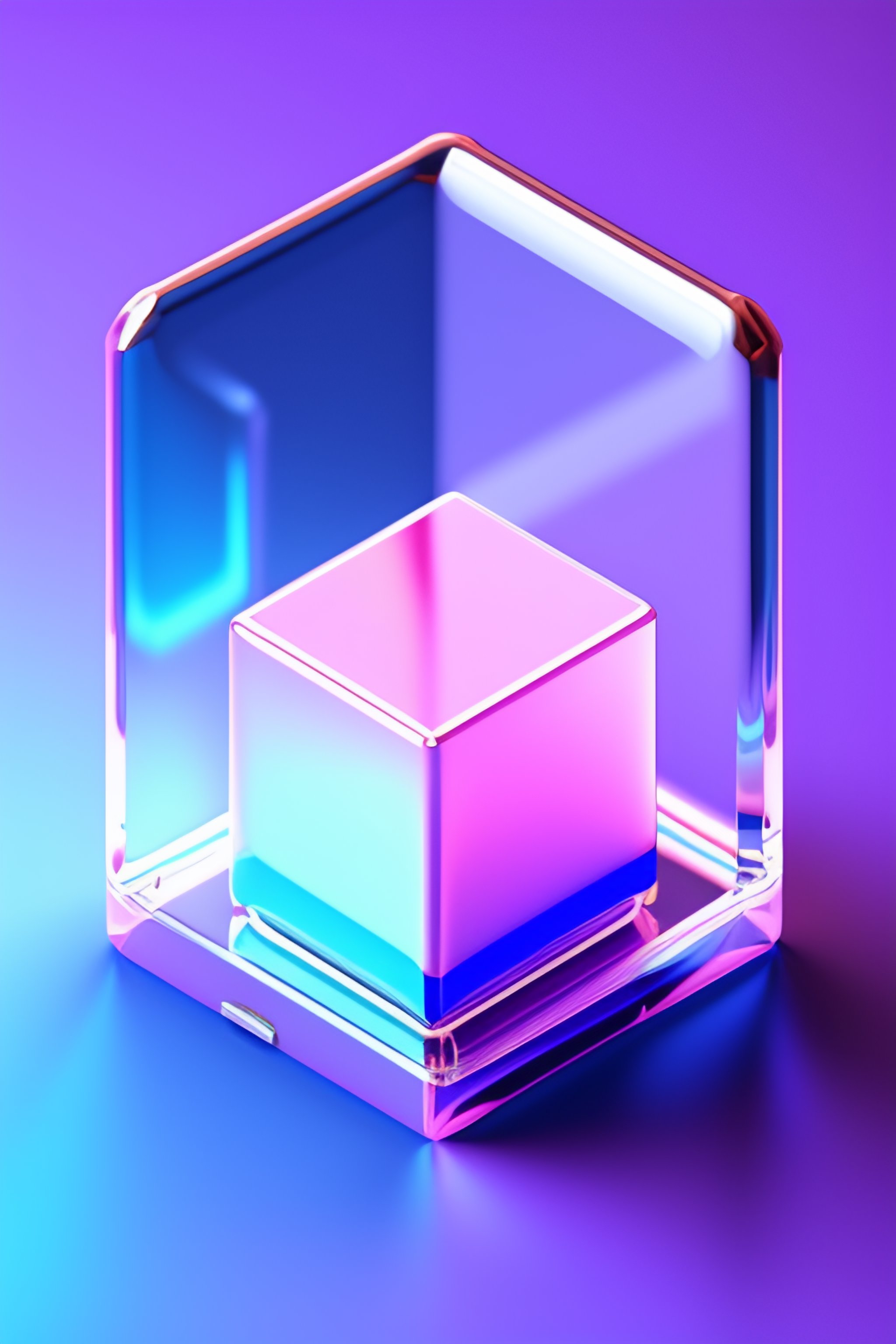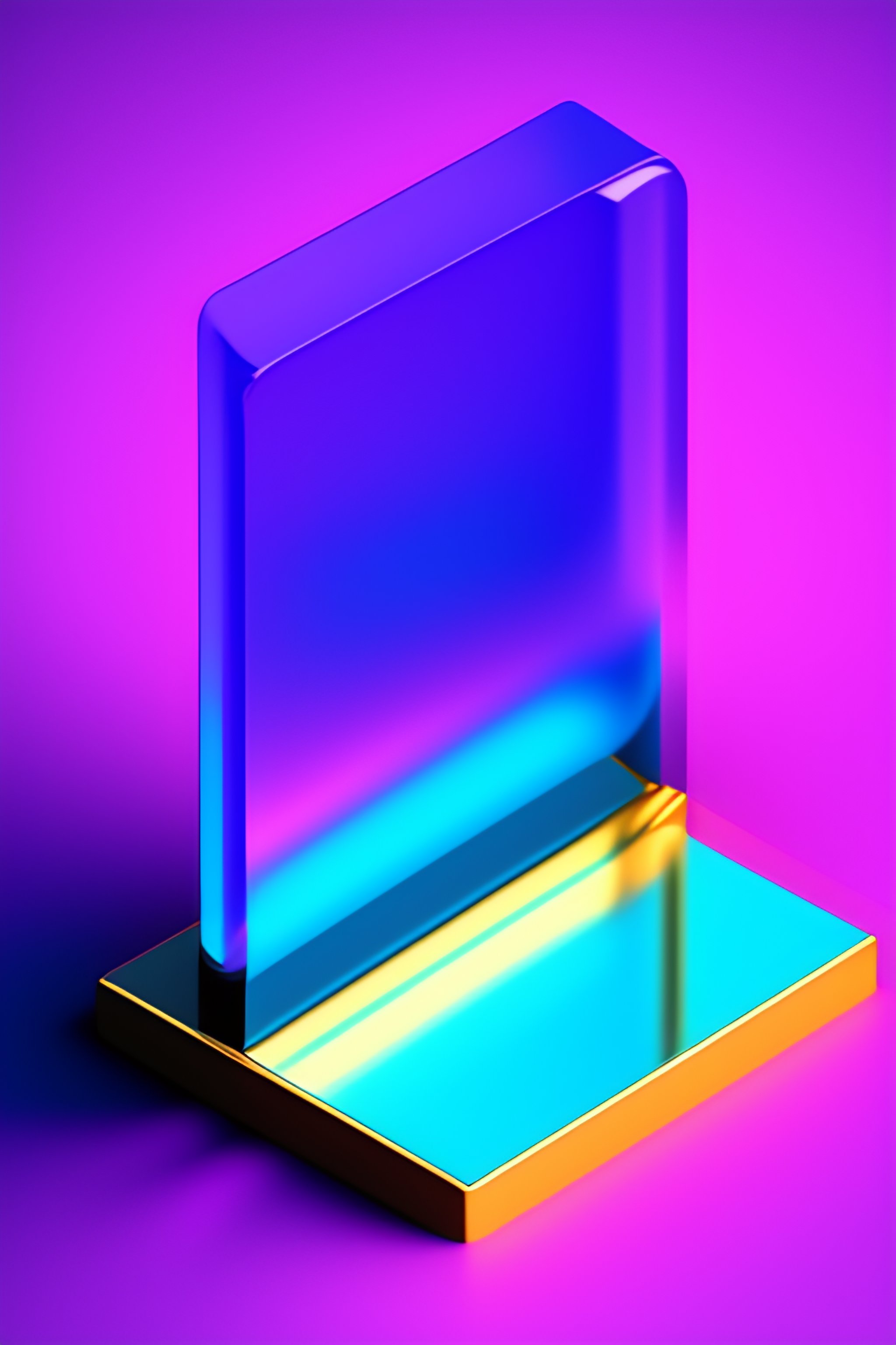 3d render of a transparent rectangular block, 3 inches high, 18 inches long, 6 inches deep, violet bluish gradient background, model isometric right side view