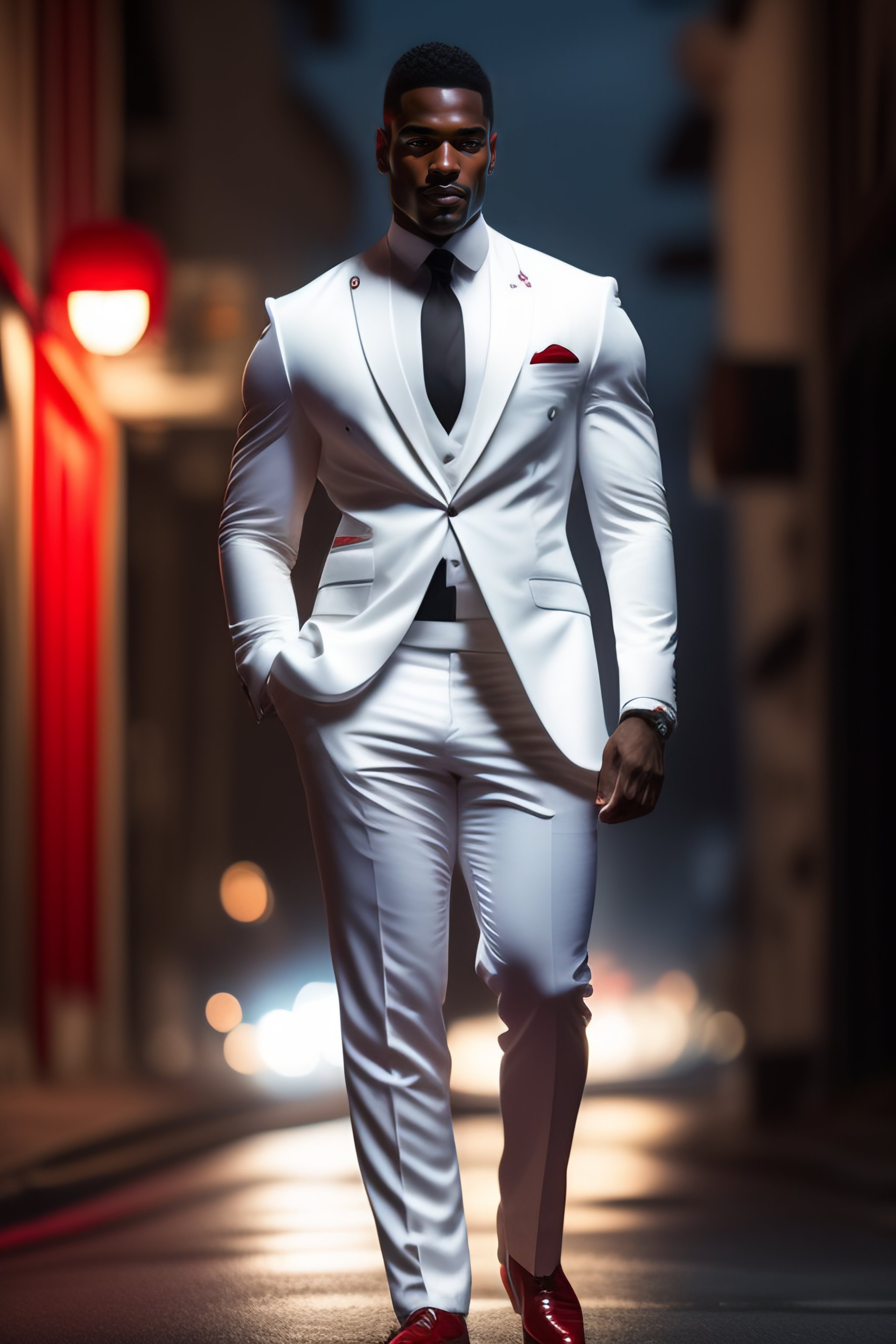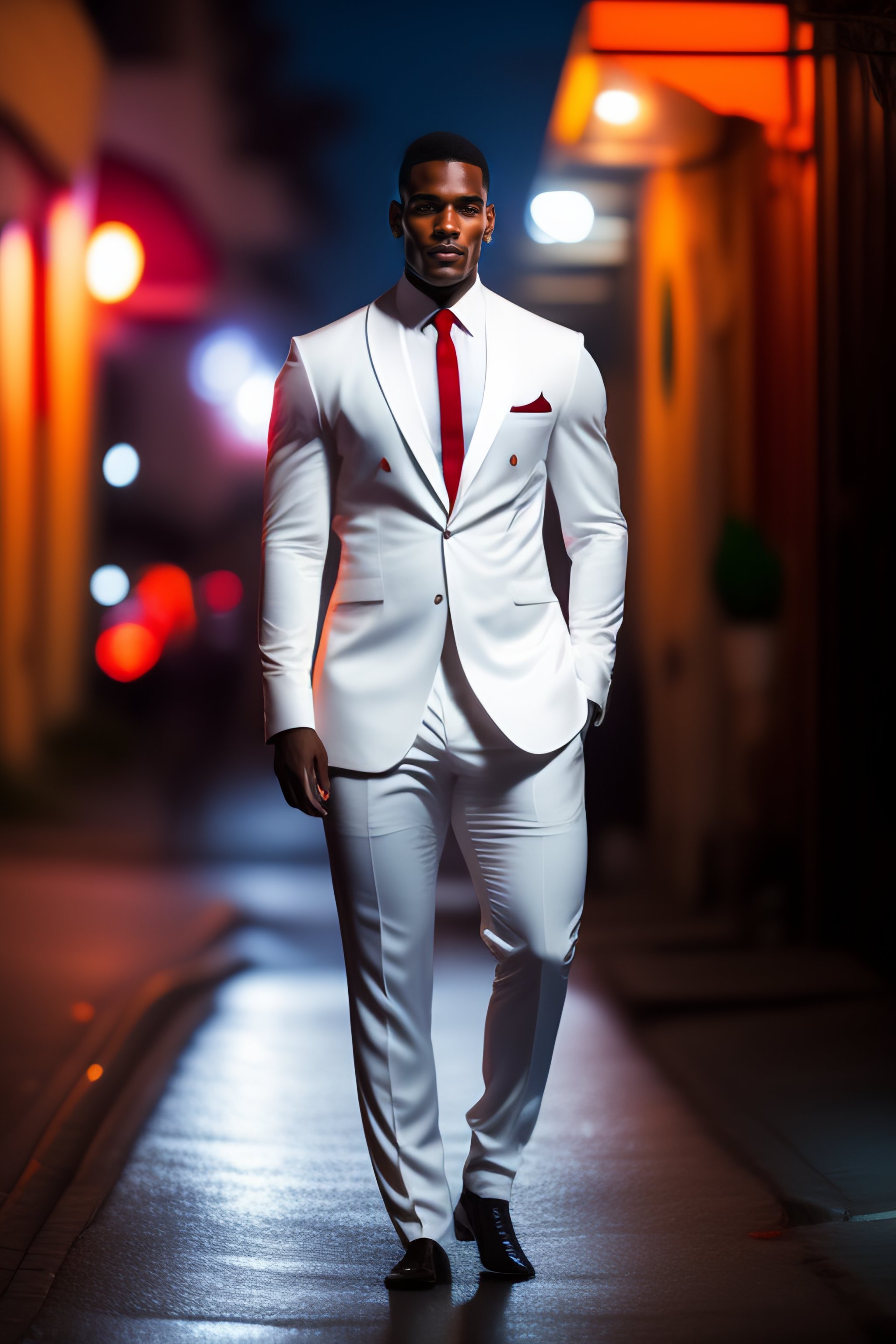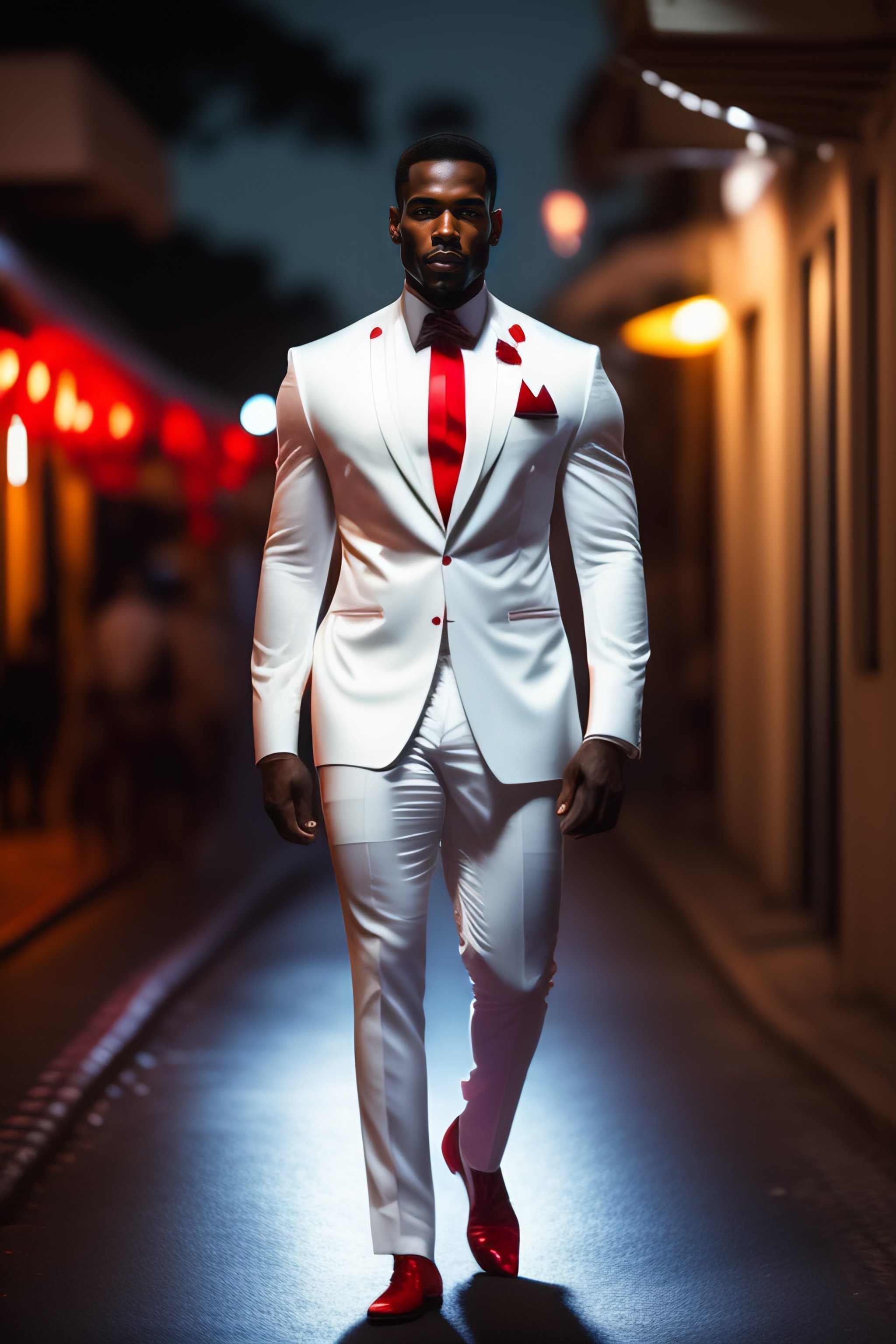 Handsome black brazilian man wearing white suit and red tie, wearing white hat, on street at night, in arcos da lapa rio de janeiro, full body view, greg rutkowski, ultra detailed, volumetric lighting