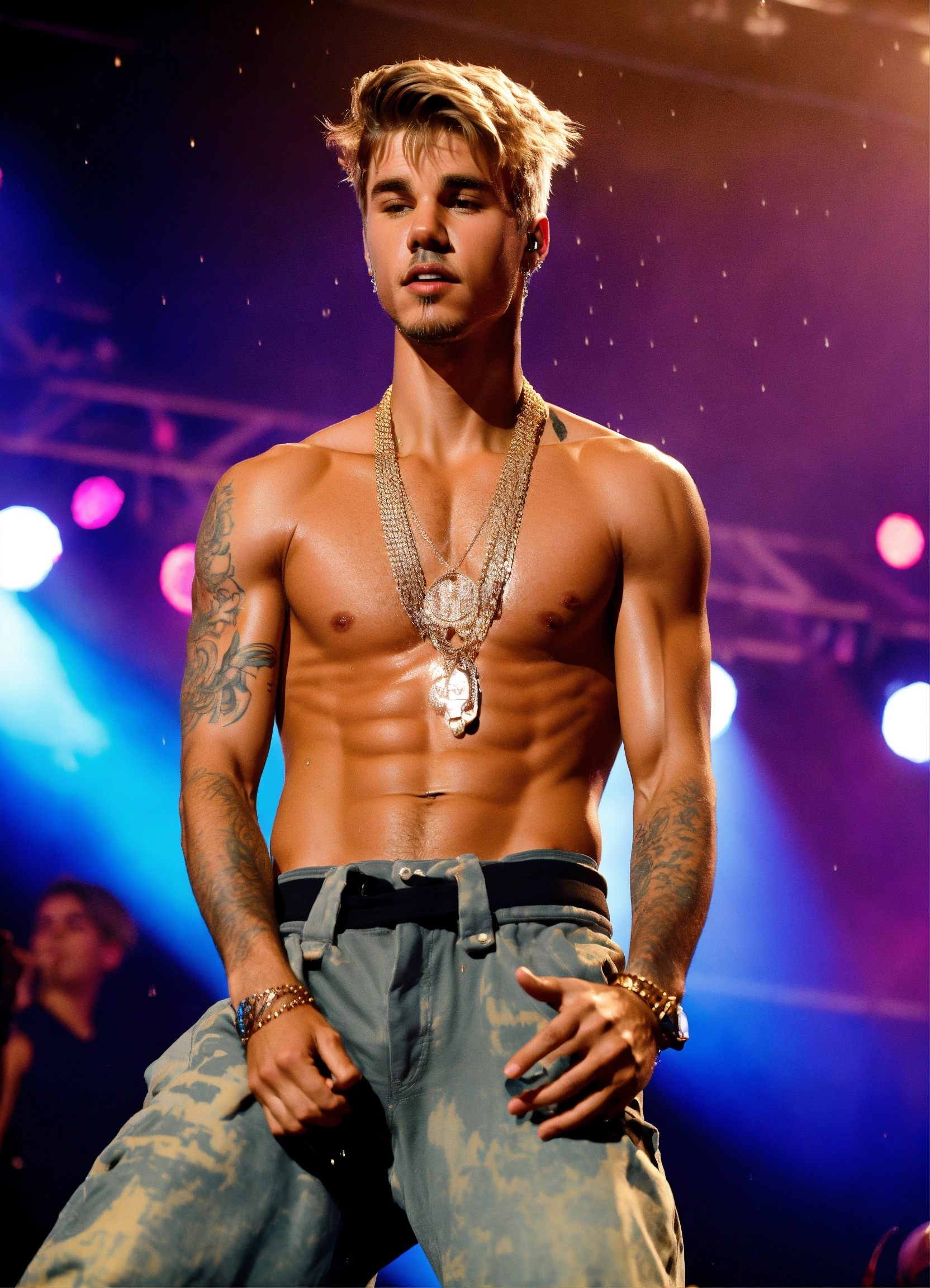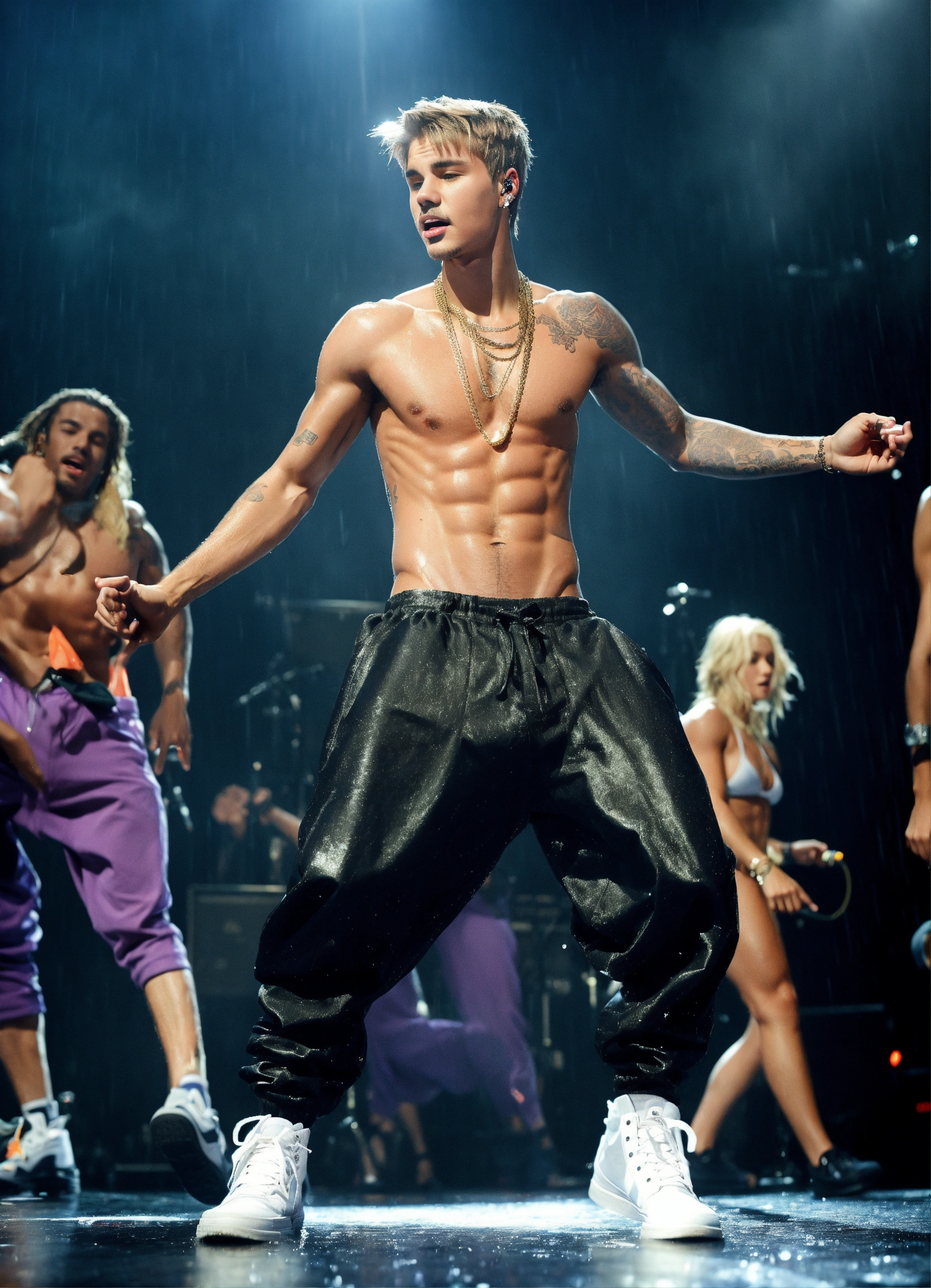 An impressive realistic photo of bieber performing on stage in baggy pants, toned physique, sweating, raining, warm day, photographed by bruce weber