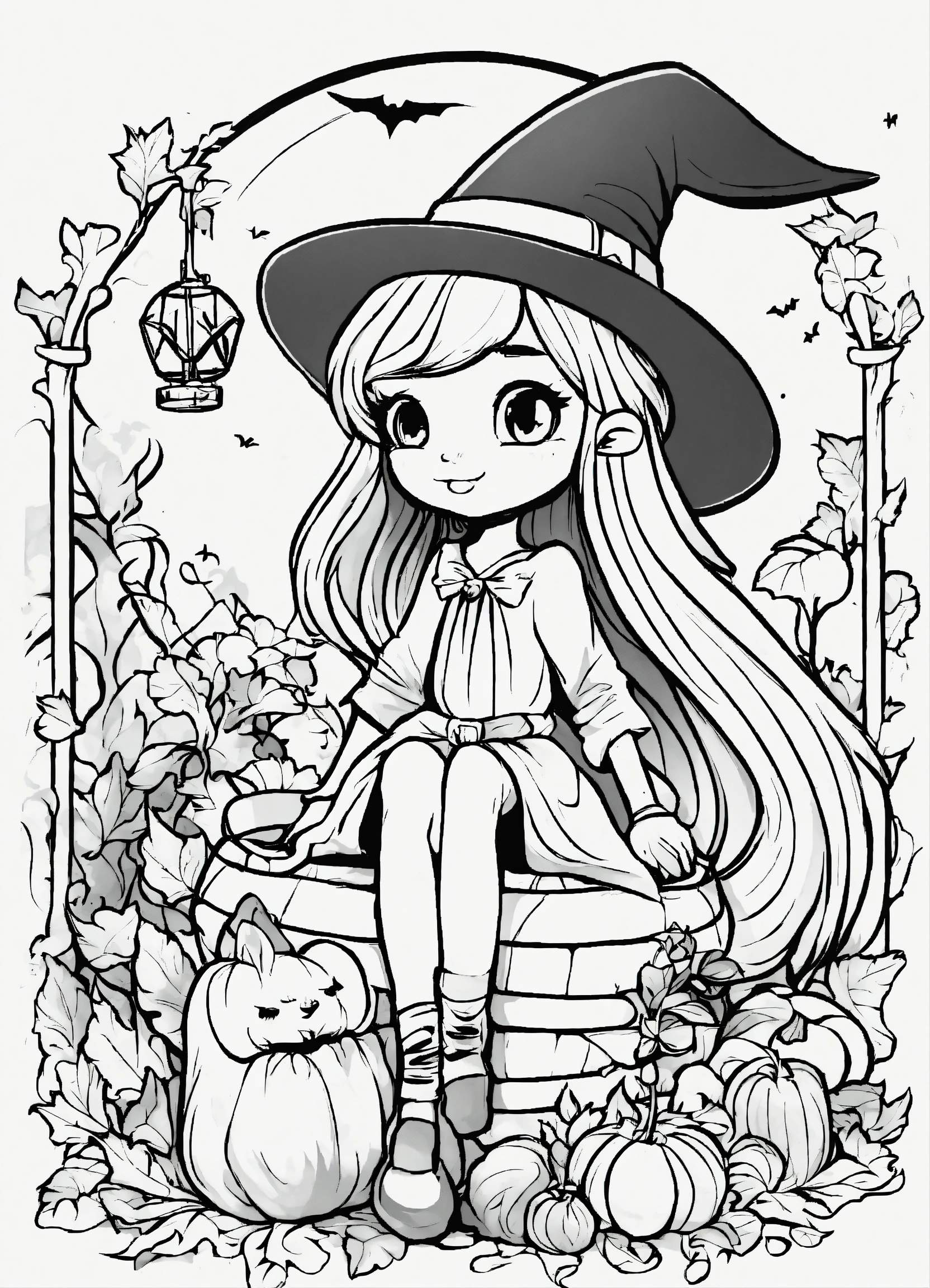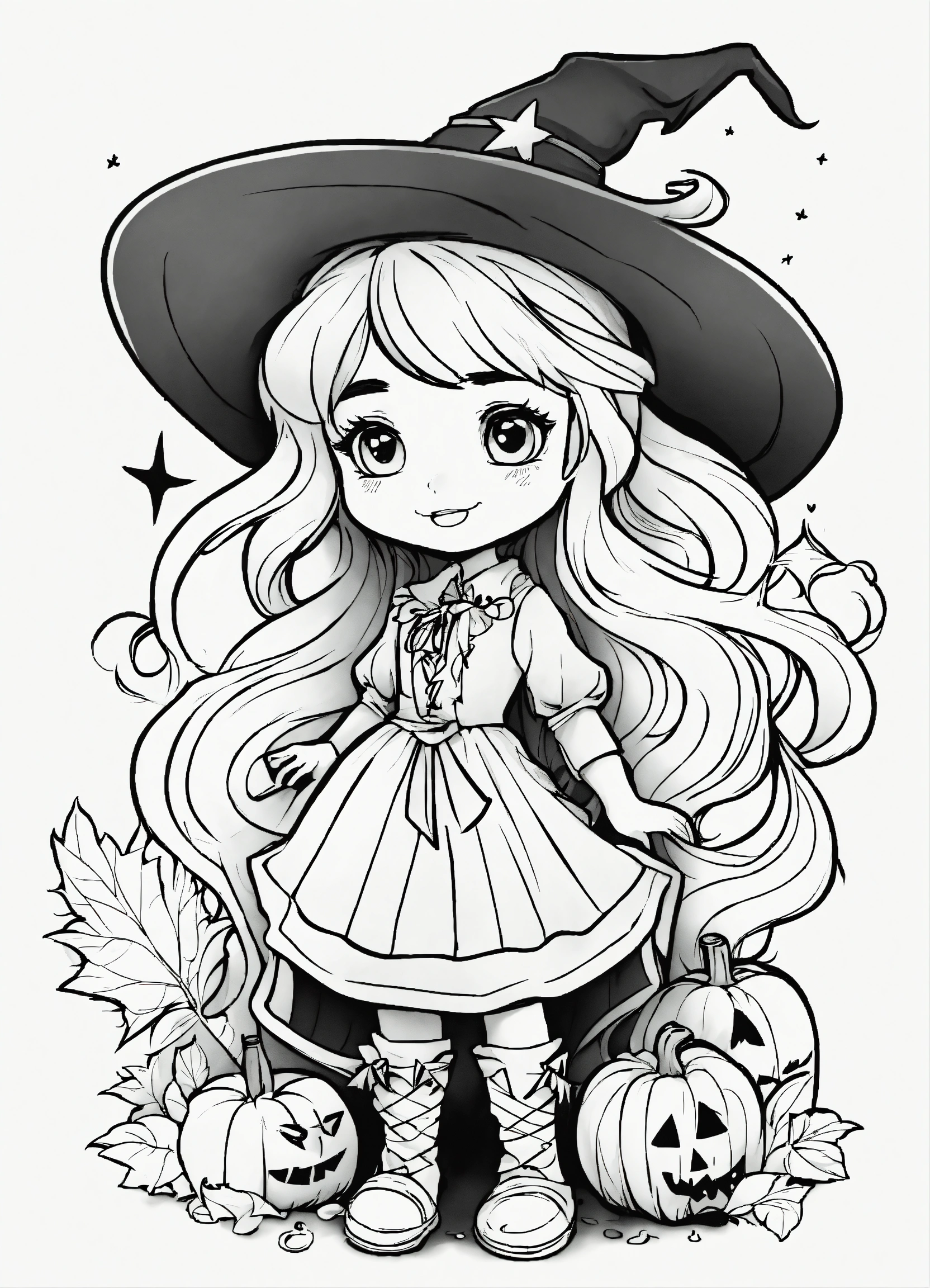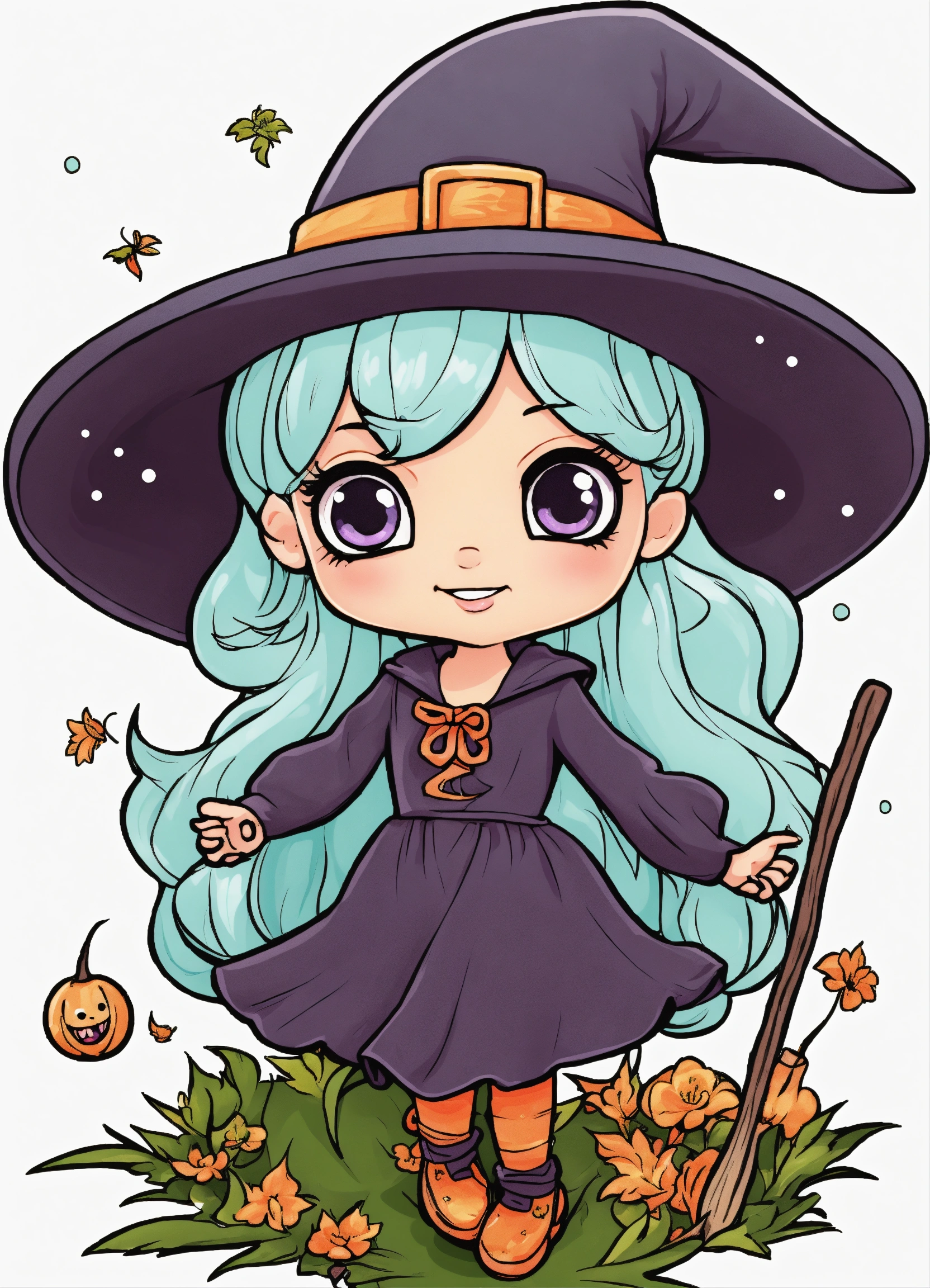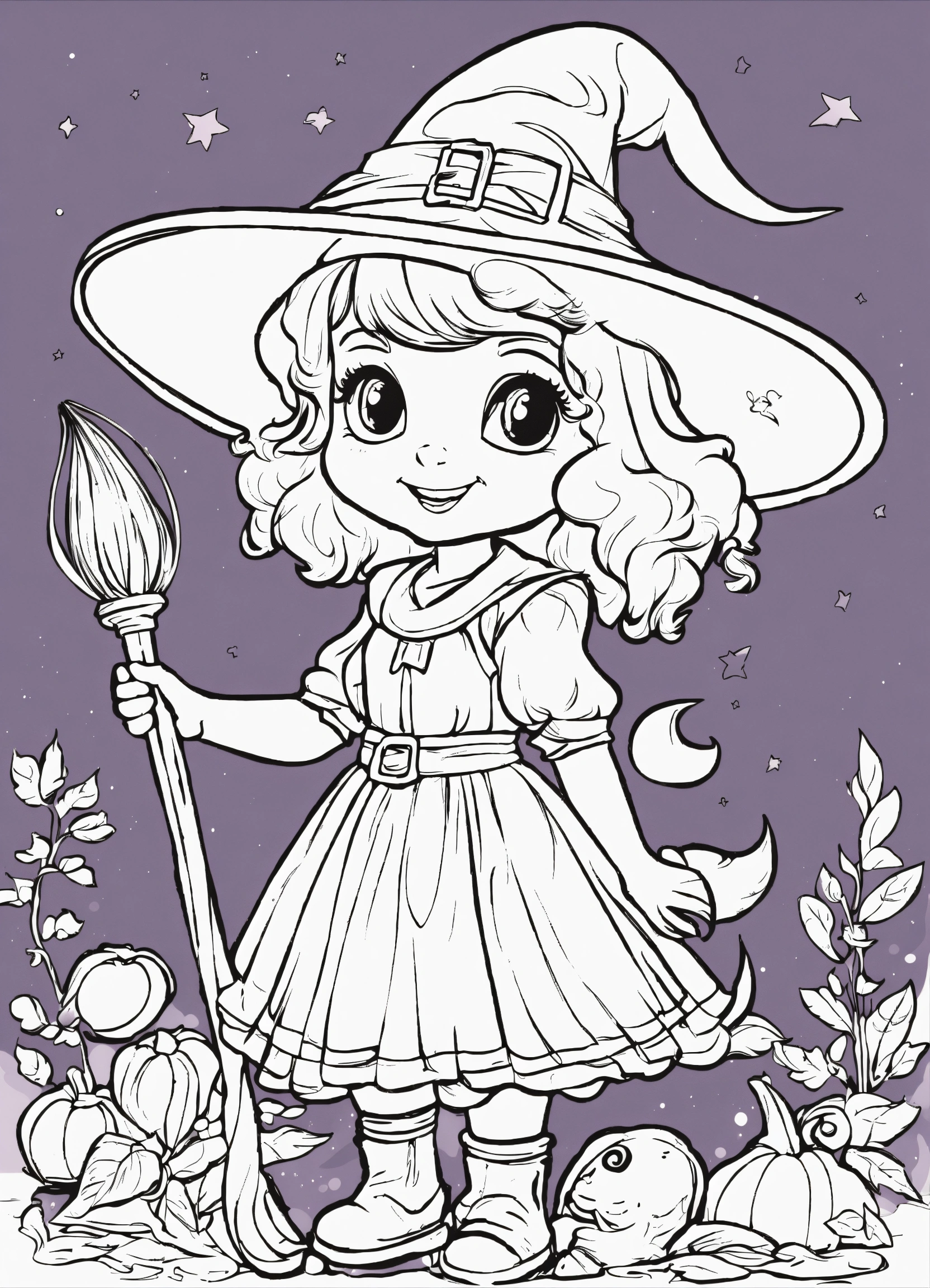 Generate a cute witch illustration, 4k resolution, cartoon-sticker style with clear lines on a pure white background suitable for a children's coloring book.