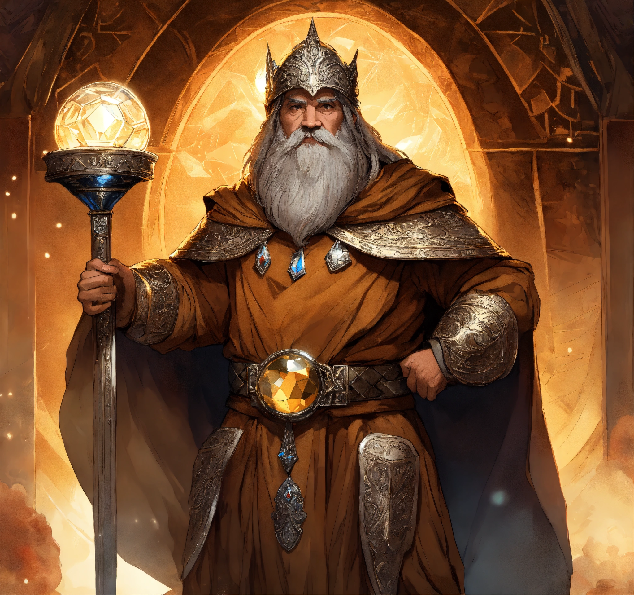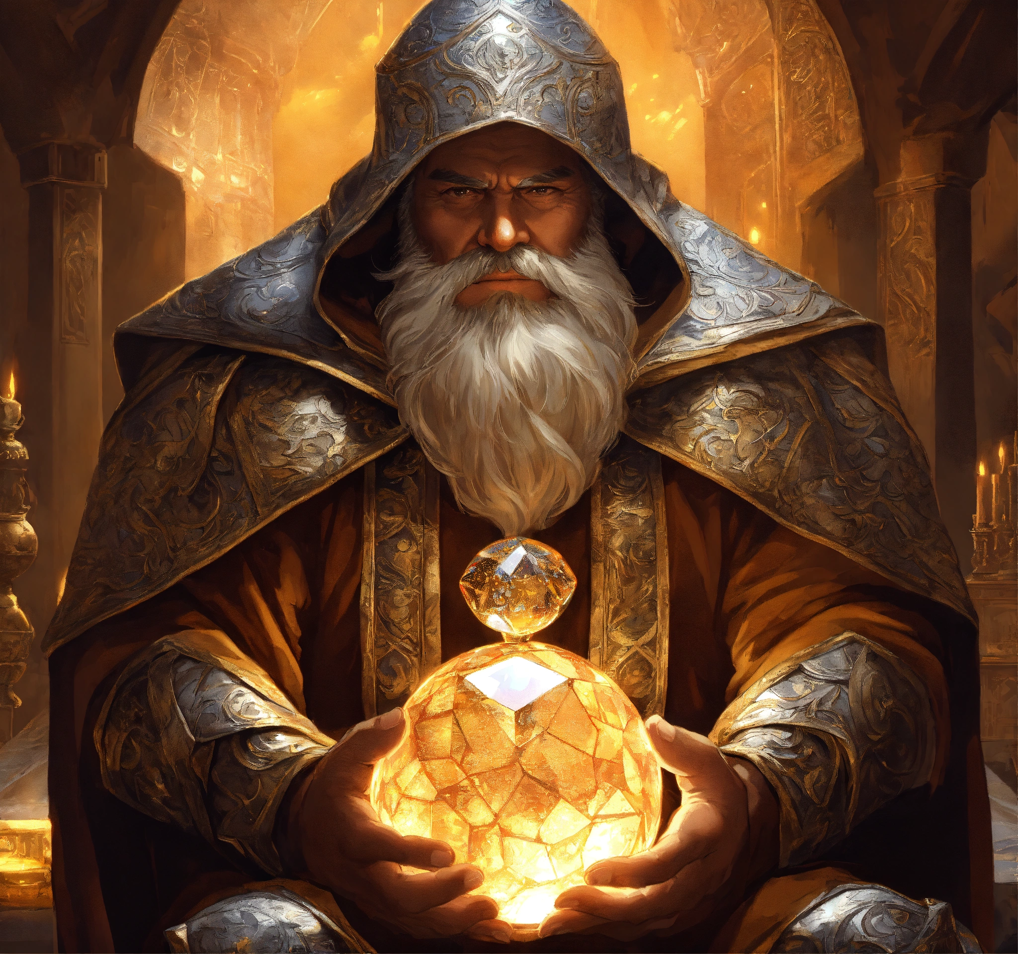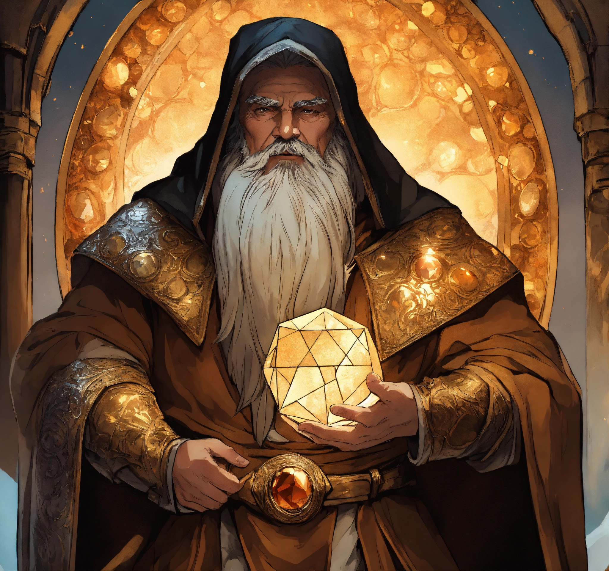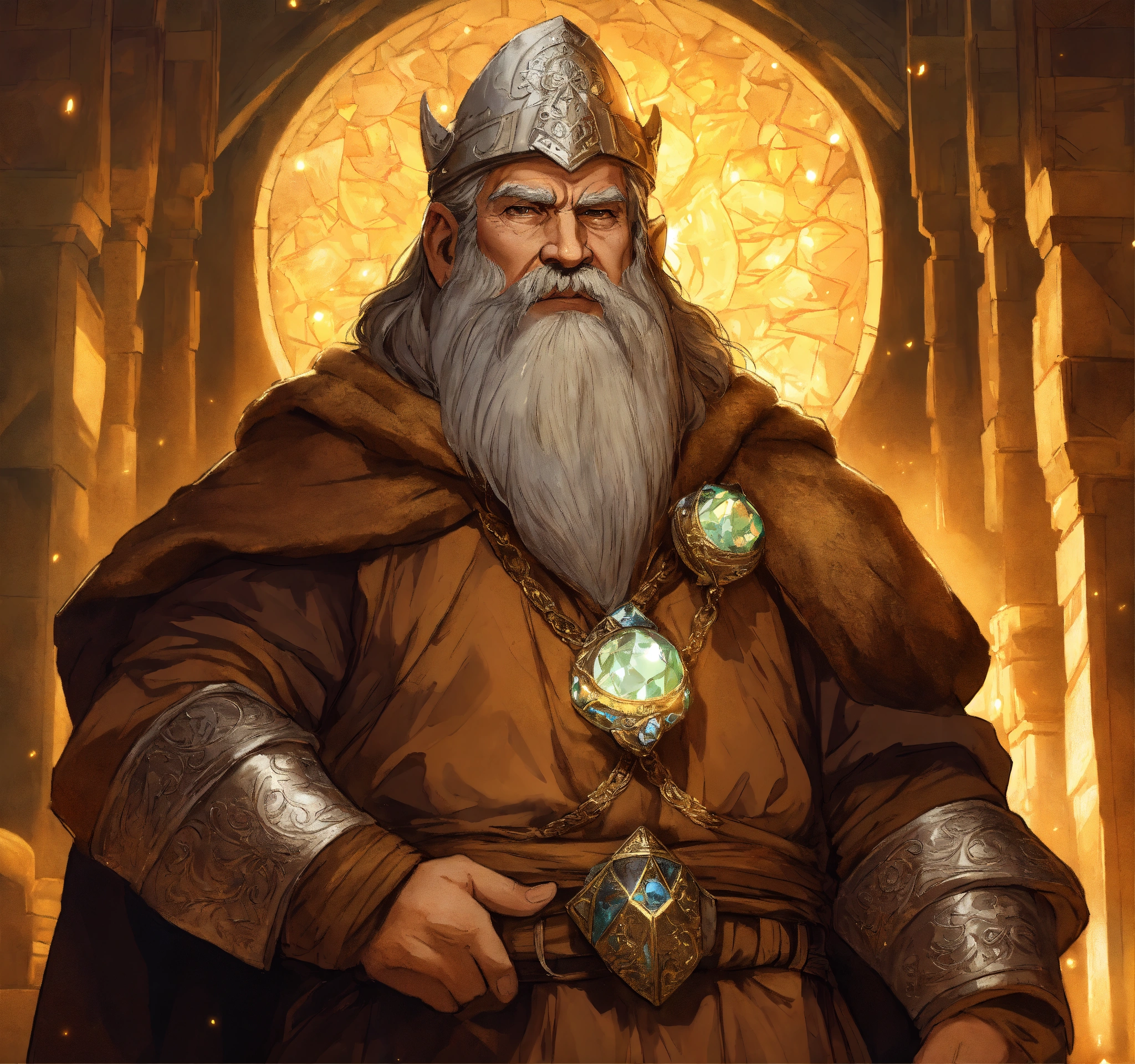 Fantasy setting, an enigmatic old dwarven king, wearing a brown and silver robe, head facing, shrouded in glory, holding and admiring a large gem, highly detailed, comic graphic novel art, top-rated, sharp, no blur, edited, corrected