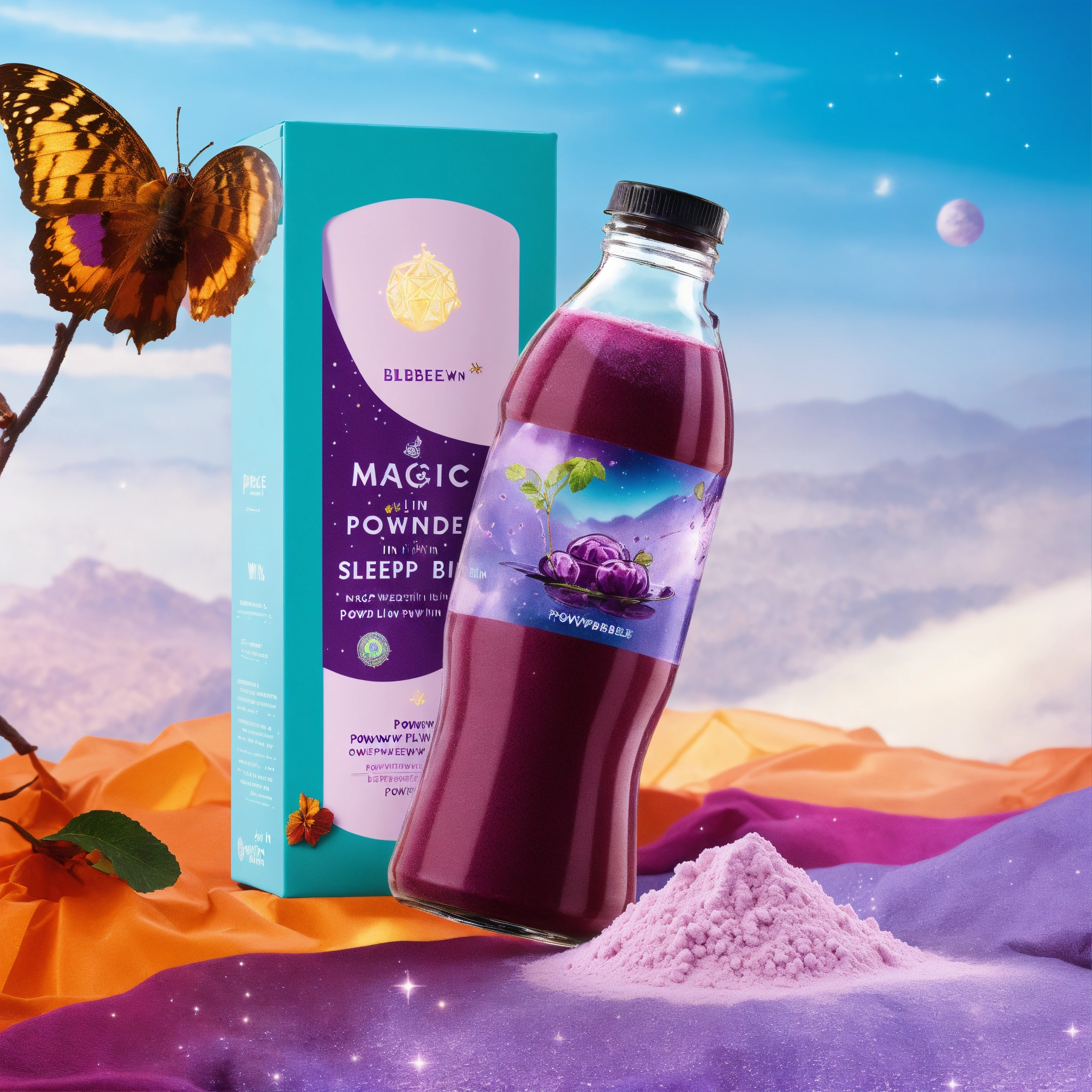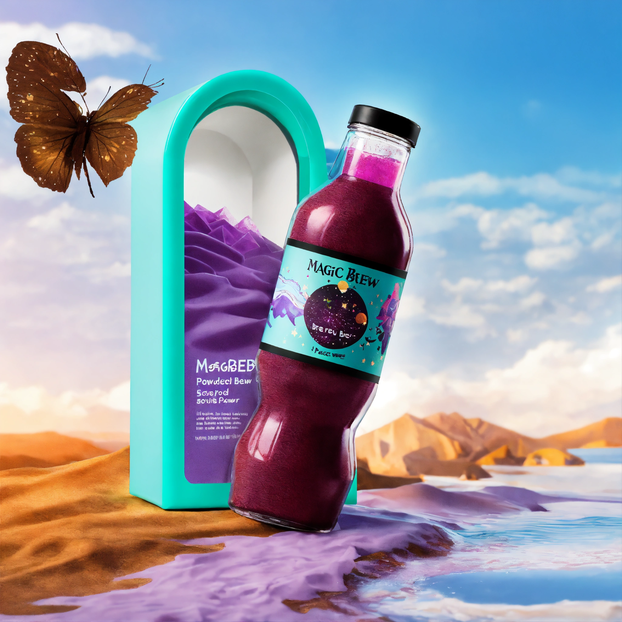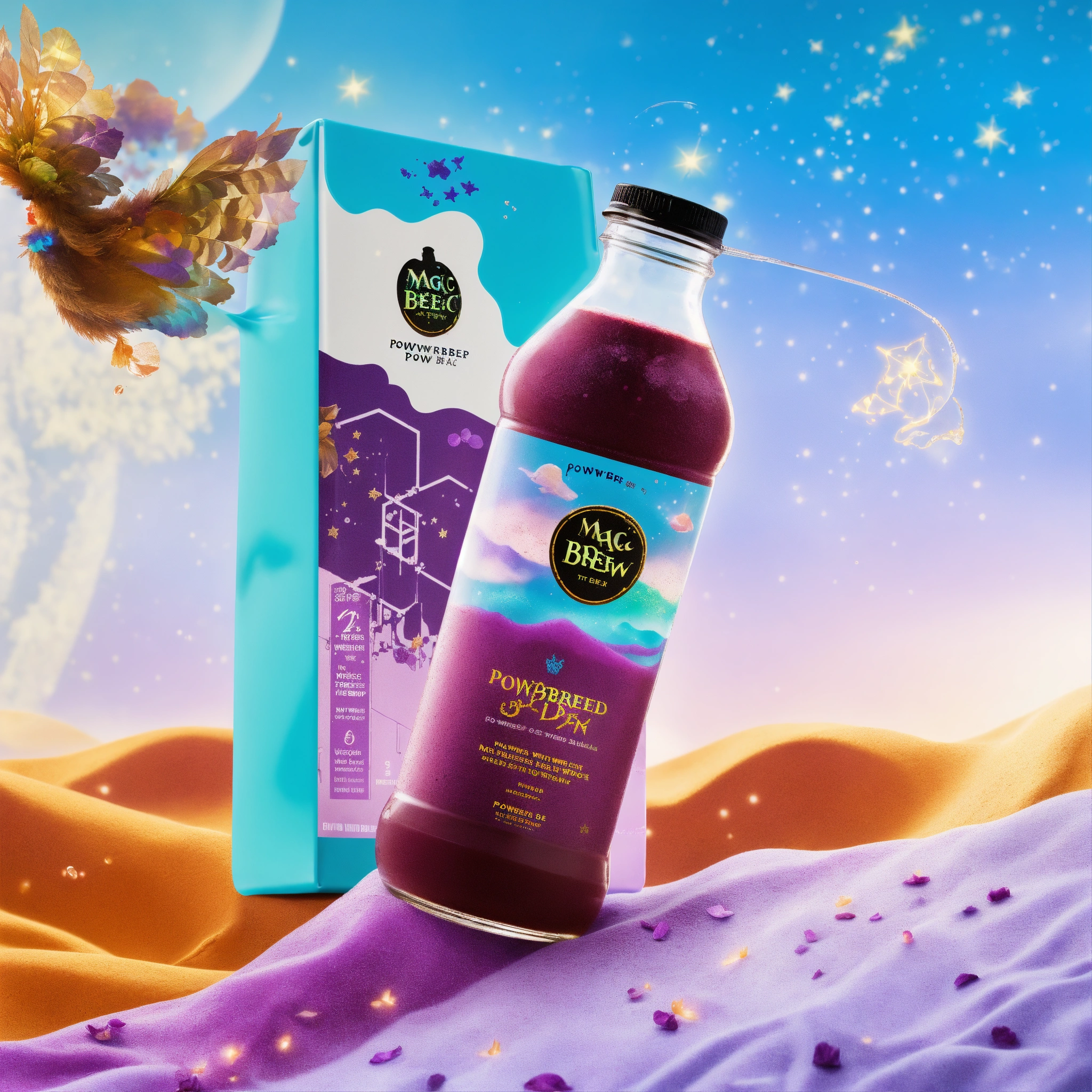Glow in the dark packaging design for magic brew powdered sleep drink with transparent window showcasing the purple drink, magical and mystical details