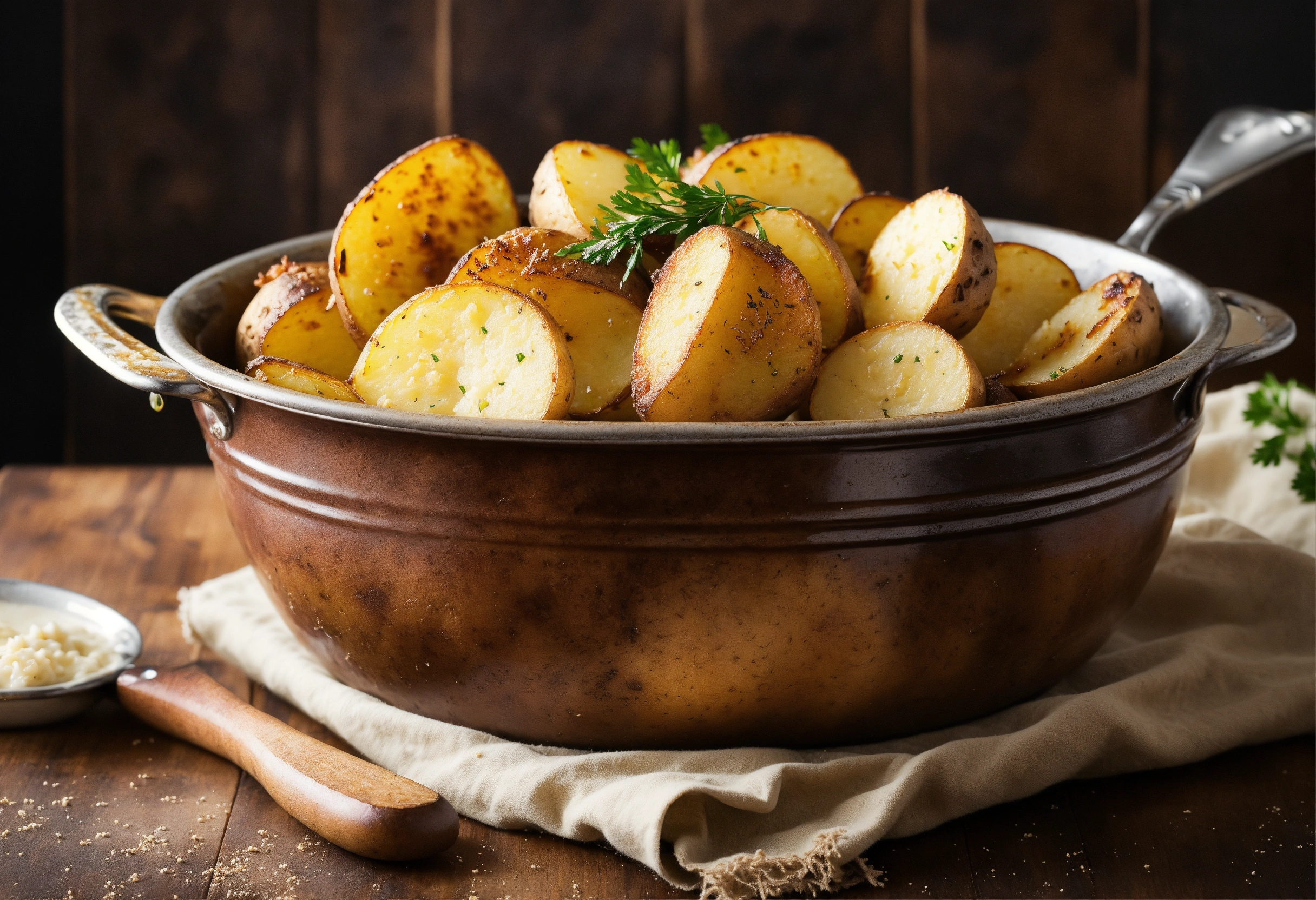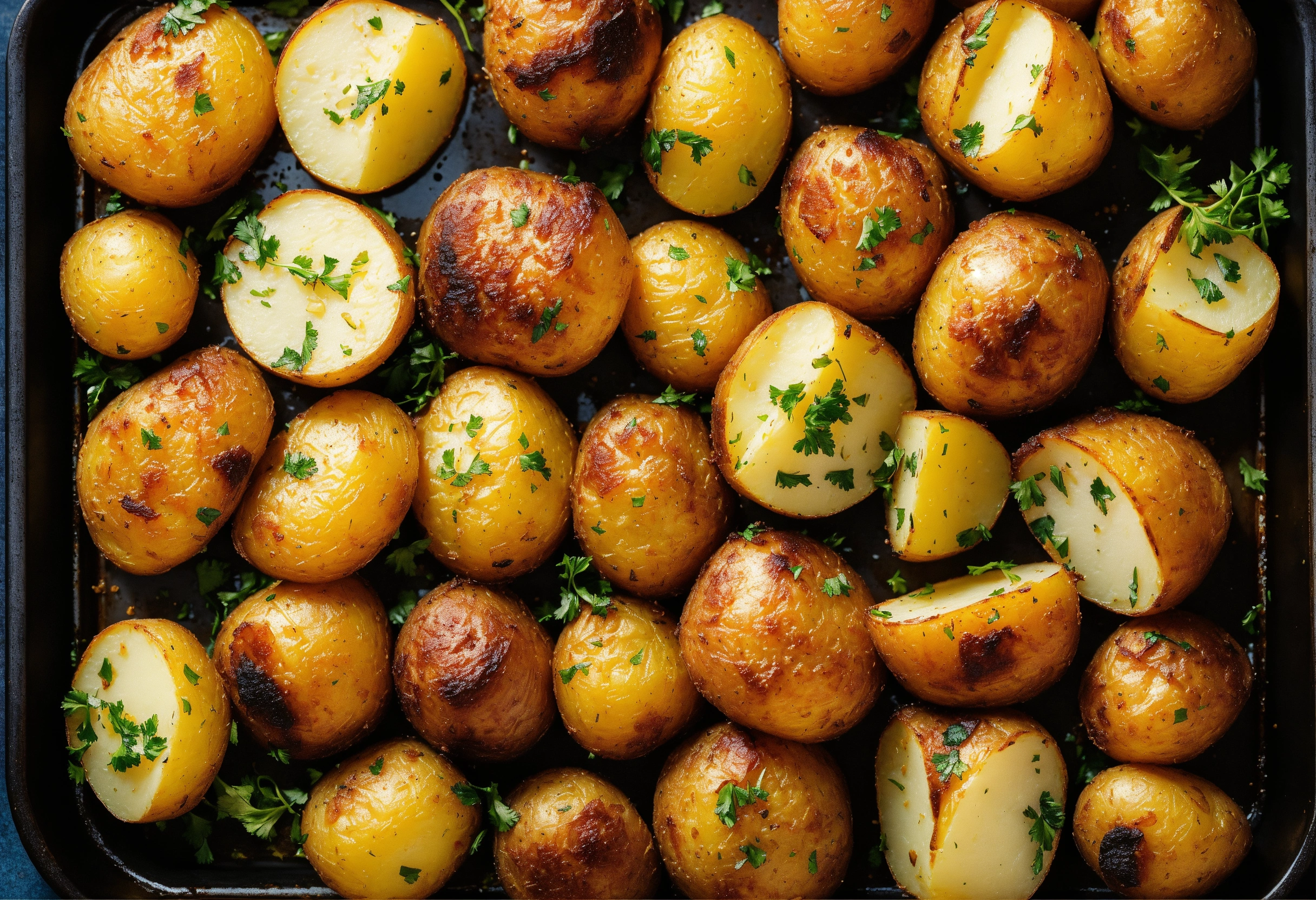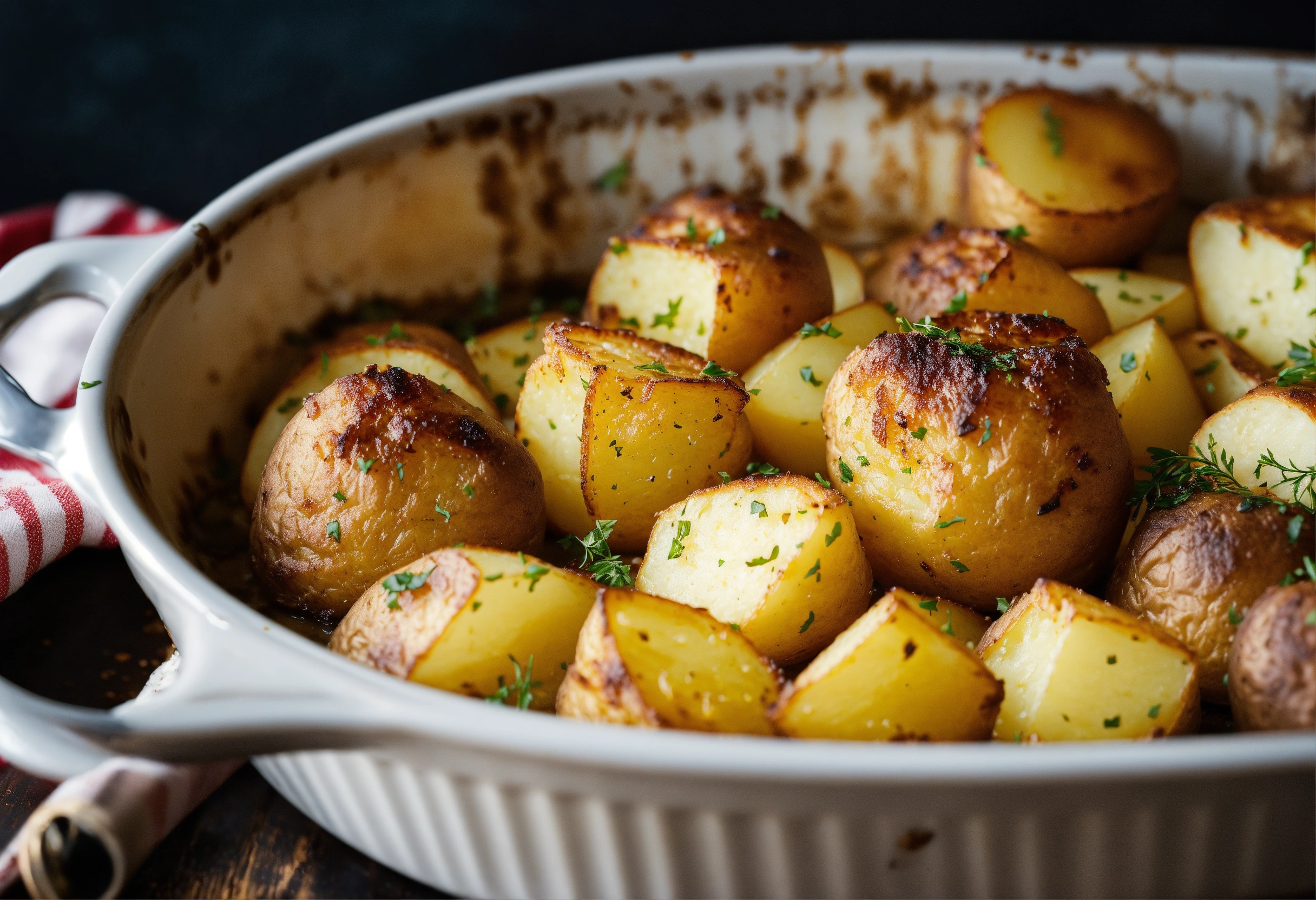 Capture the essence of large crispy, fluffy oven roasted potatoes served in an oven dish in a single image for our recipe website. show off its smooth texture and the perfect balance. make our readers crave a bite just by looking at your photo. we want to see it in all its mouthwatering glory, ready to inspire cooks and bakers alike. get creative with your composition, lighting, and styling.