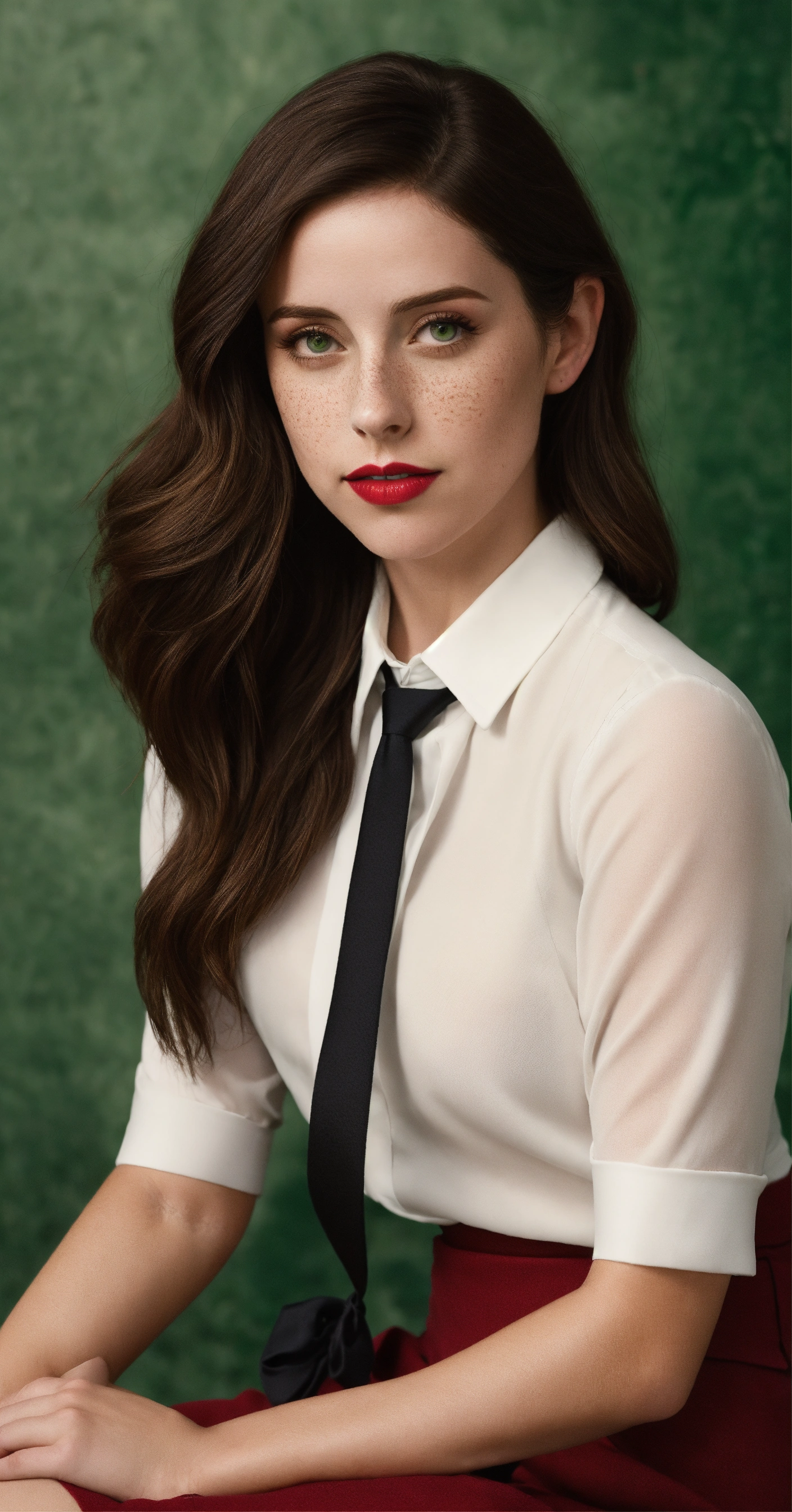 A photographic portrait of alison brie wearing a skirt, socks, stockings, school uniform skirt, with neck lengthened, untied, greater bust, tight shirt, wide bust, she has green eyes, freckles on her face and red lipstick, form-fitting, curve-hugging, snug, tailored, close-cut, sculpted, defined, pronounced curves, shapely, casual, relaxed, laid-back, undone, informal, nonchalant, easygoing, disheveled, carefree, unbuttoned, unstructured, effortless, she wears a black suit jacket with a white shirt and black tie. her head is triangle shaped, preppy, elite, well-dressed, polished, sophisticated, form-fitting shirt, stylish, prestigious, private school attire, layered, hosiery, affluent, knee-high socks, upscale, traditional
