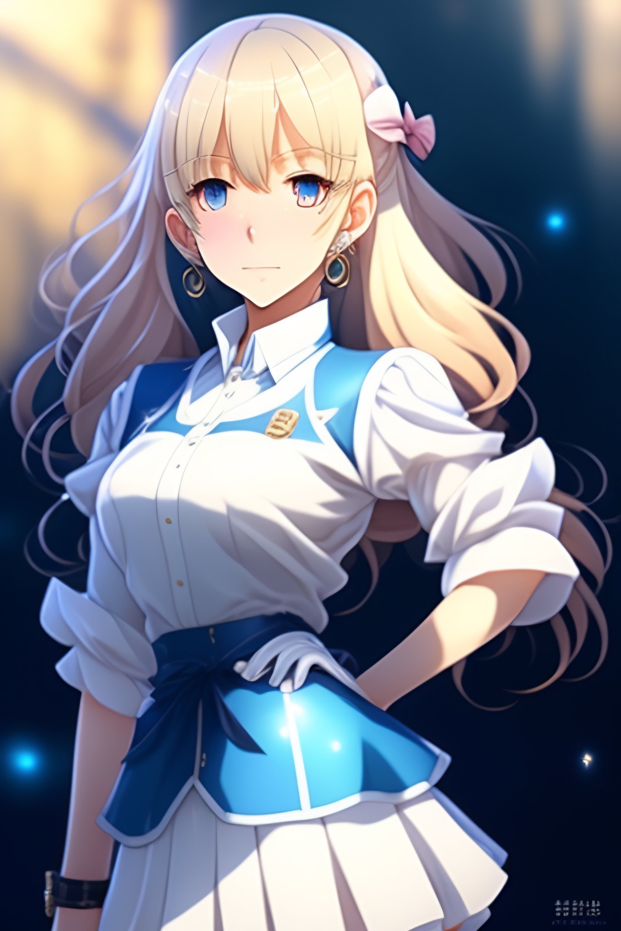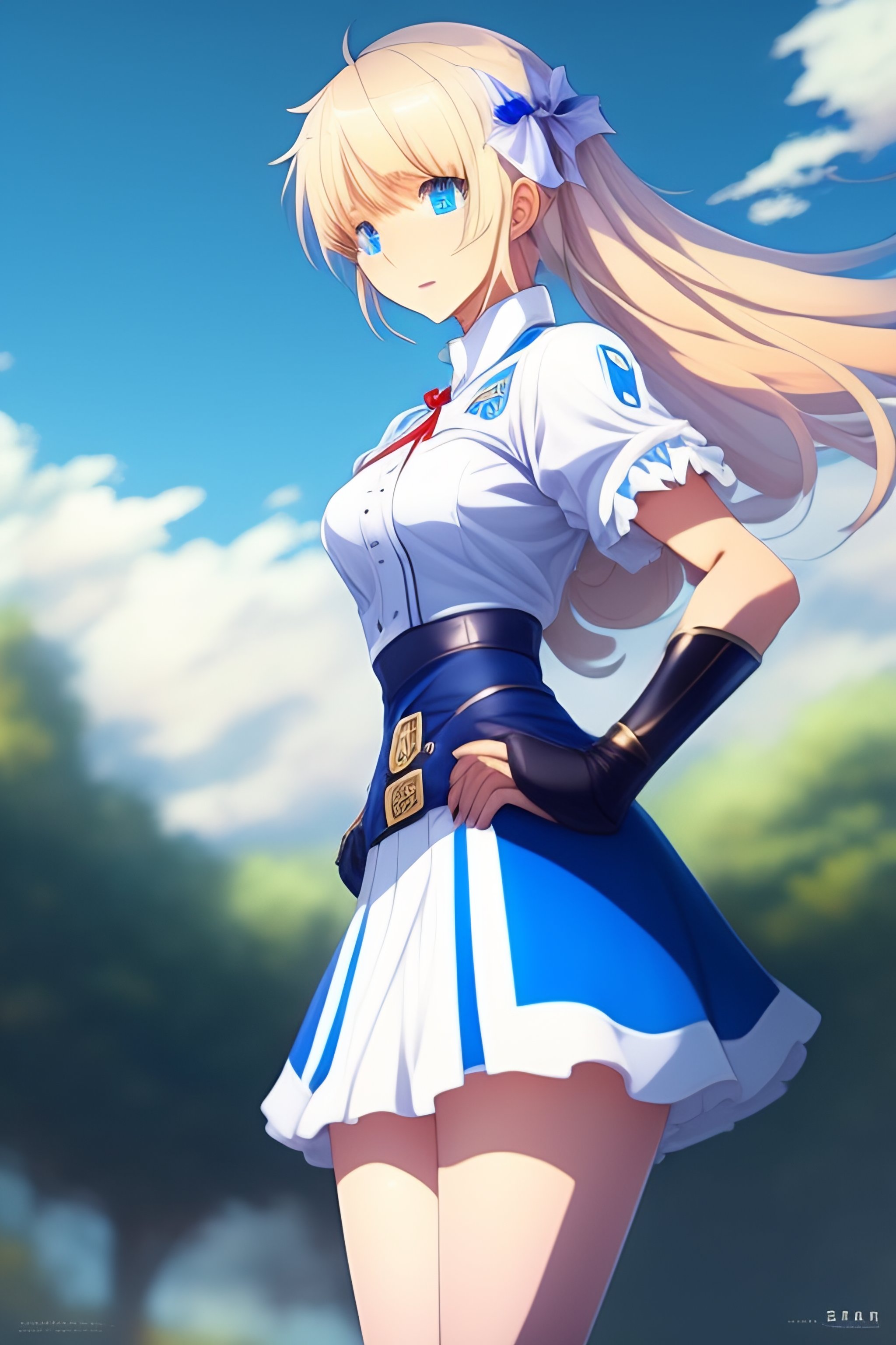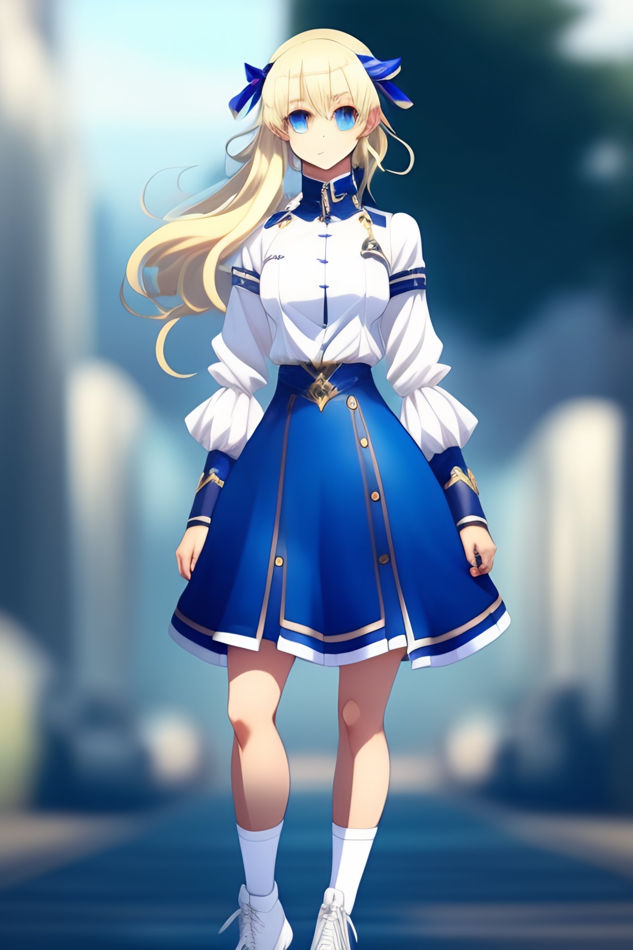 Fgo blond haired blue eyed anime girl in a short blue skirt and a white shirt, long white gloves and short white leggings