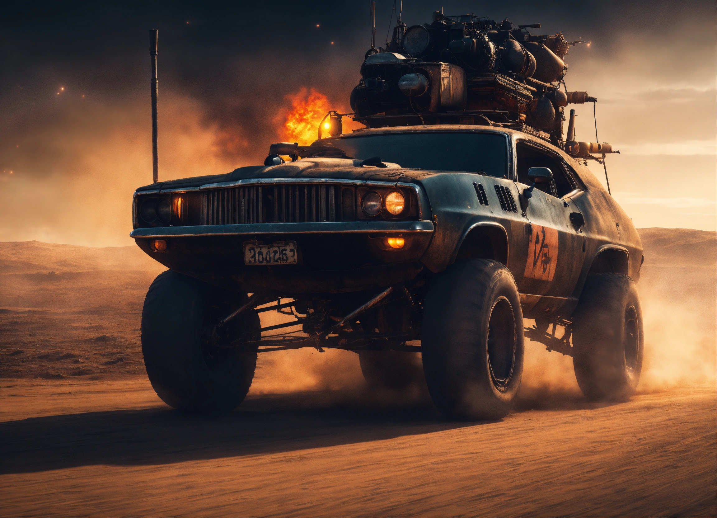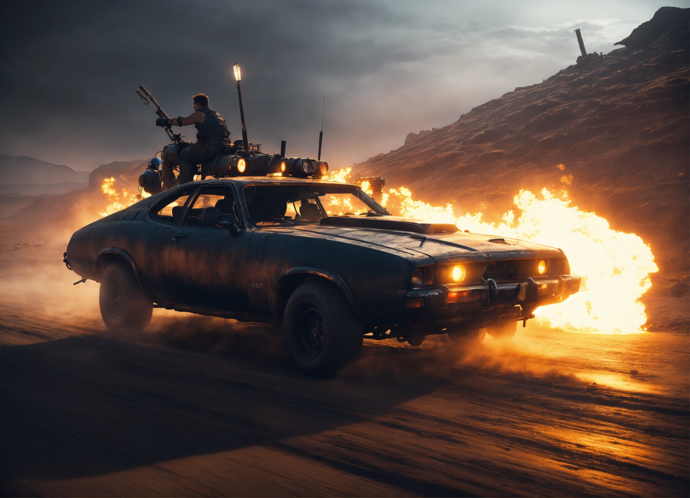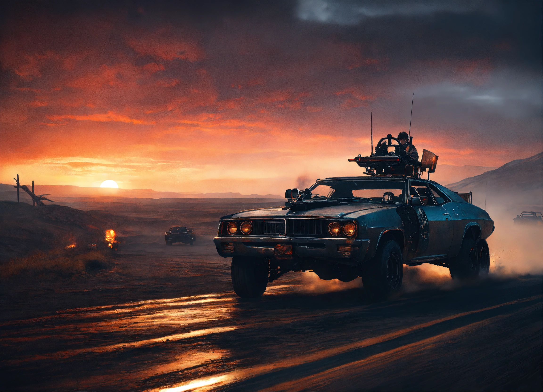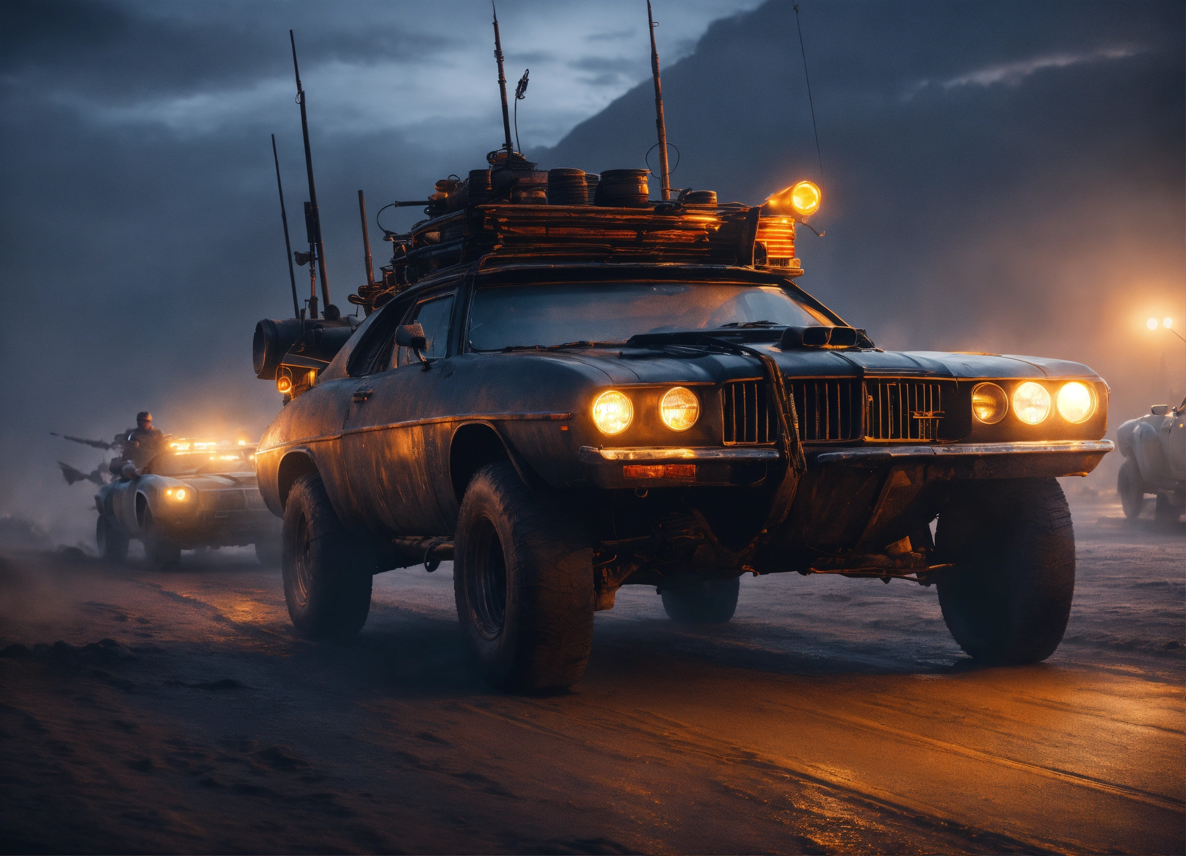 Mad max vehicles, road warrior, trending on artstation battle scene cinematic realism dark dusk moody glowing lights, rich black night, going home moonlight