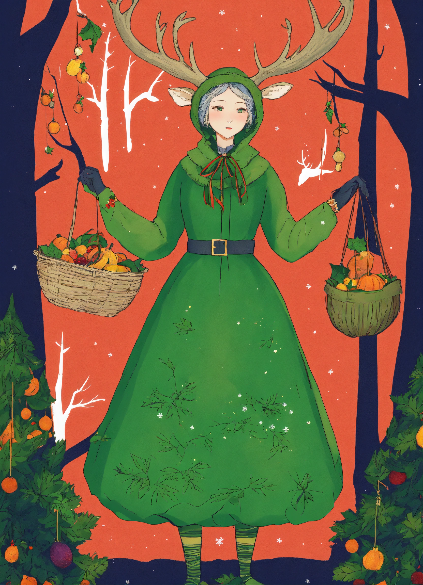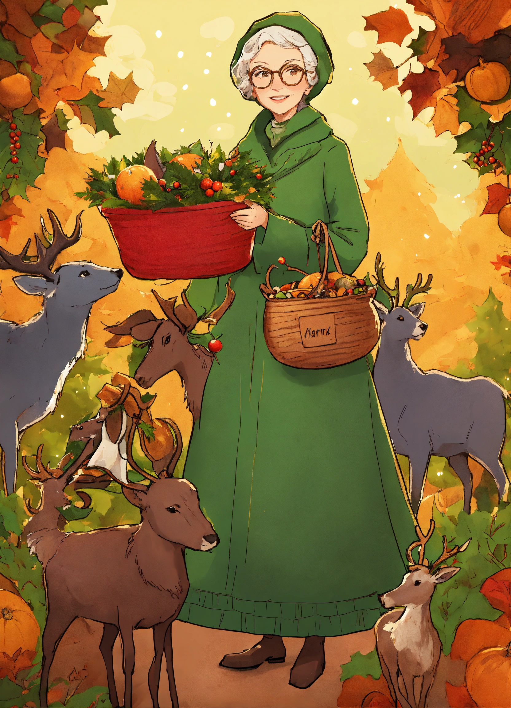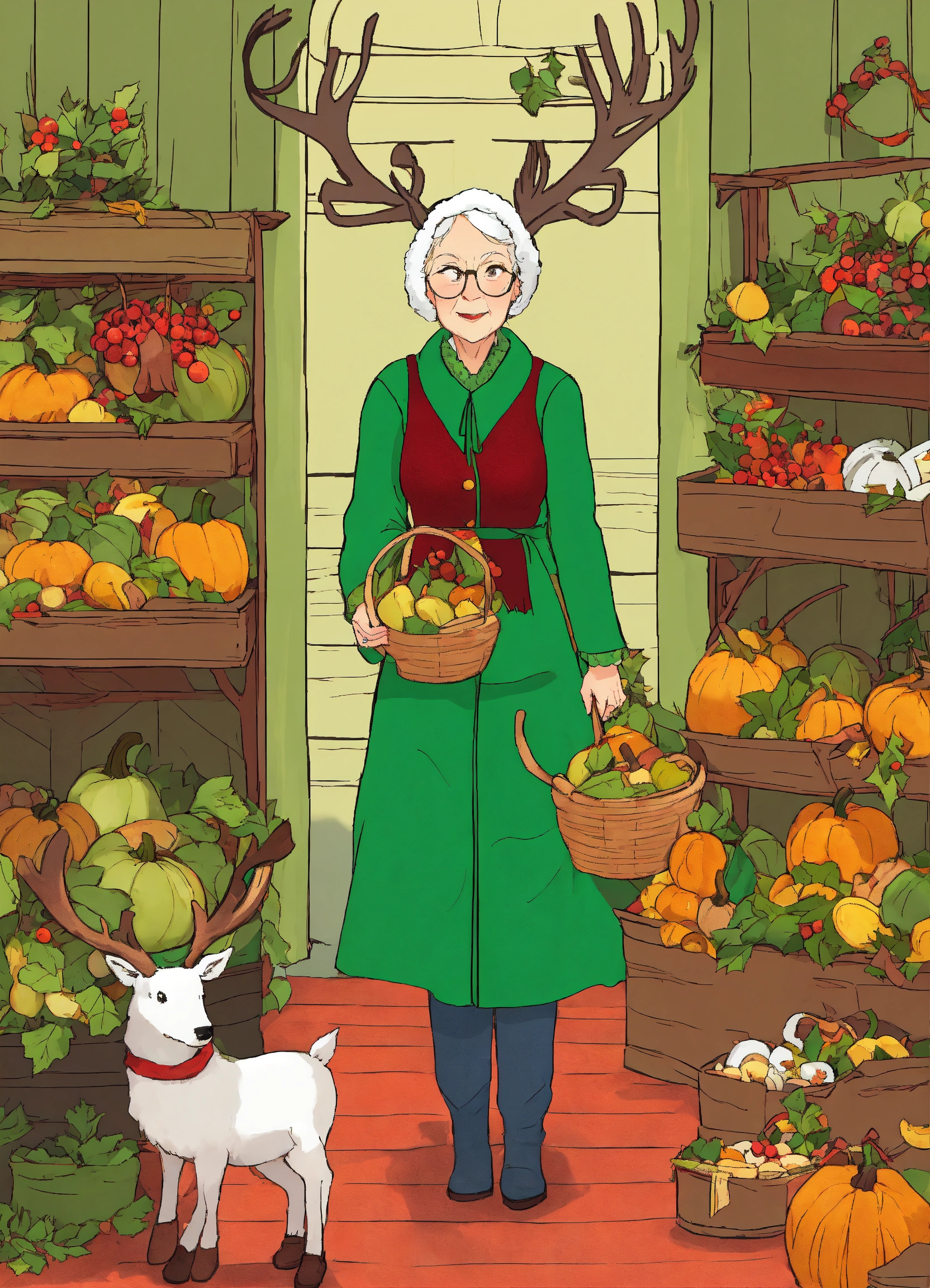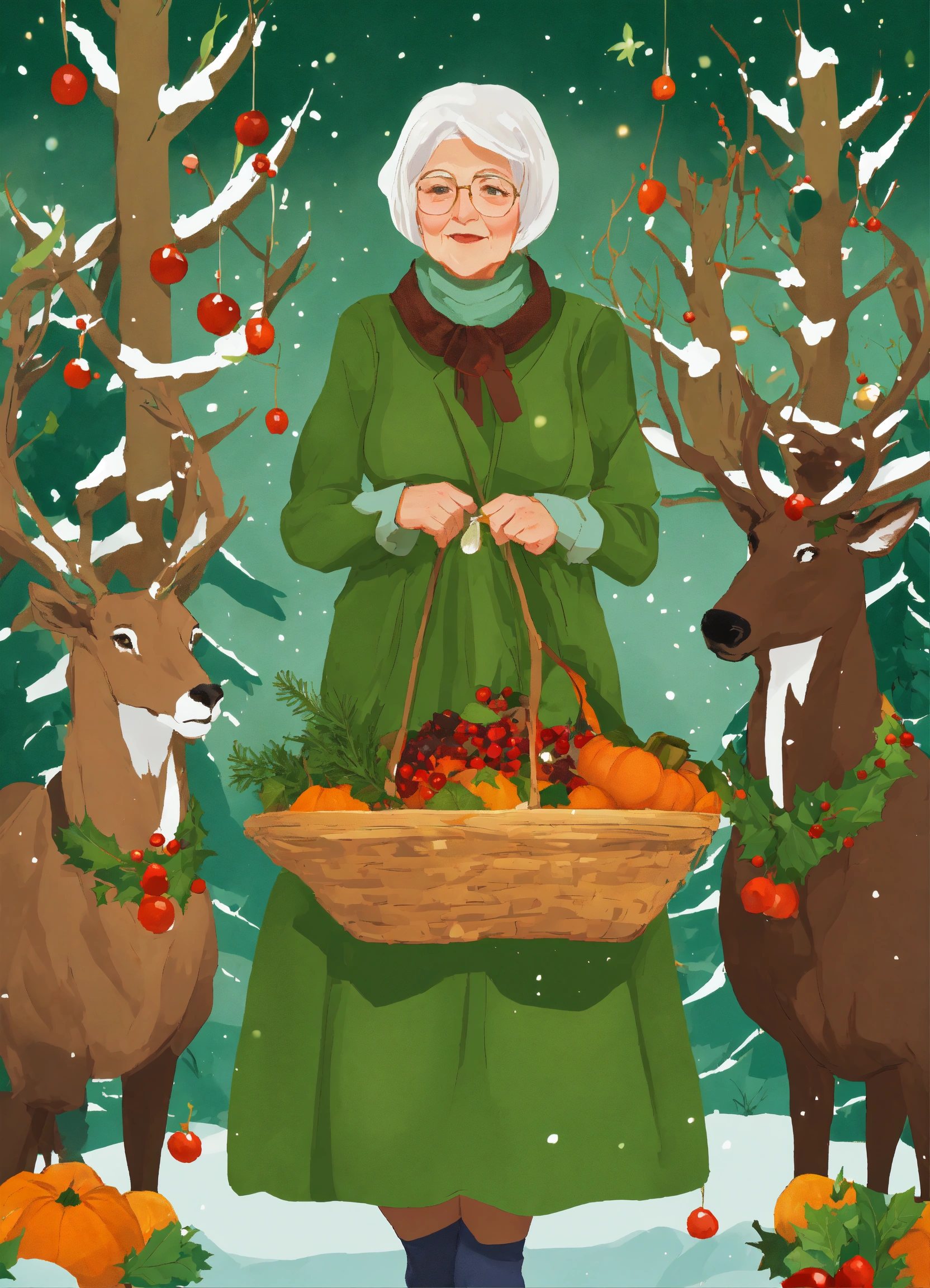 Need a series of christmas illustrations that look like twas the night before christmas but adatped based on my story line here's the first image with a little old slender lady dressed all in green with eight reindeer and her clothes were all garnished with berries and root; a bundle of squash she had flung on her back, and she looked like a peddler just opening her pack.