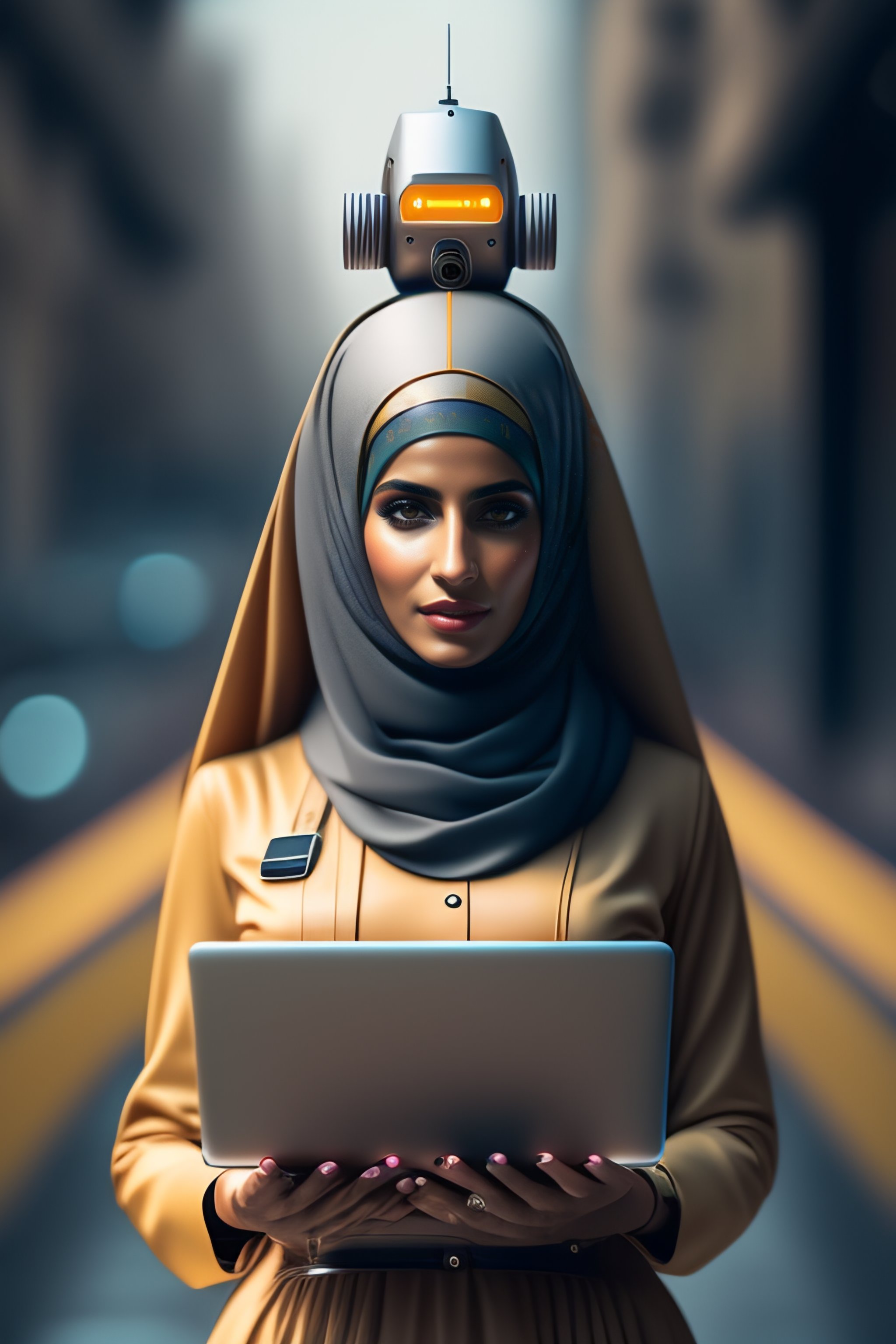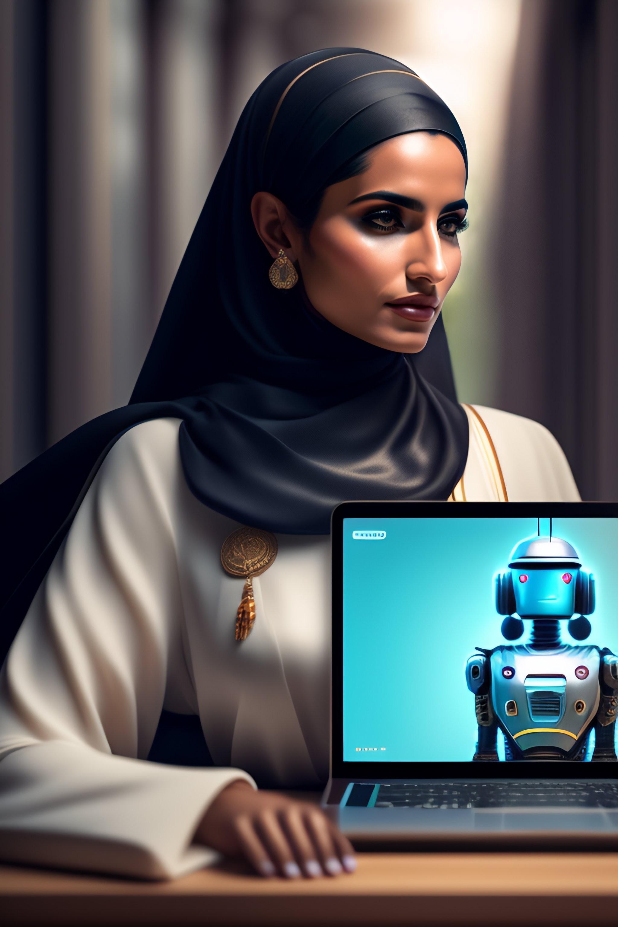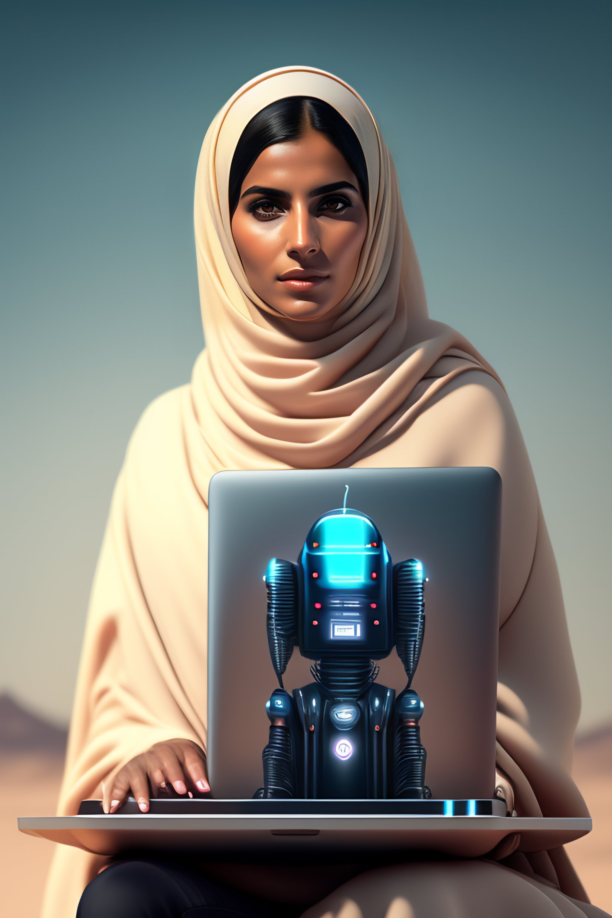 Portrait of saudi woman as a robot holding laptop