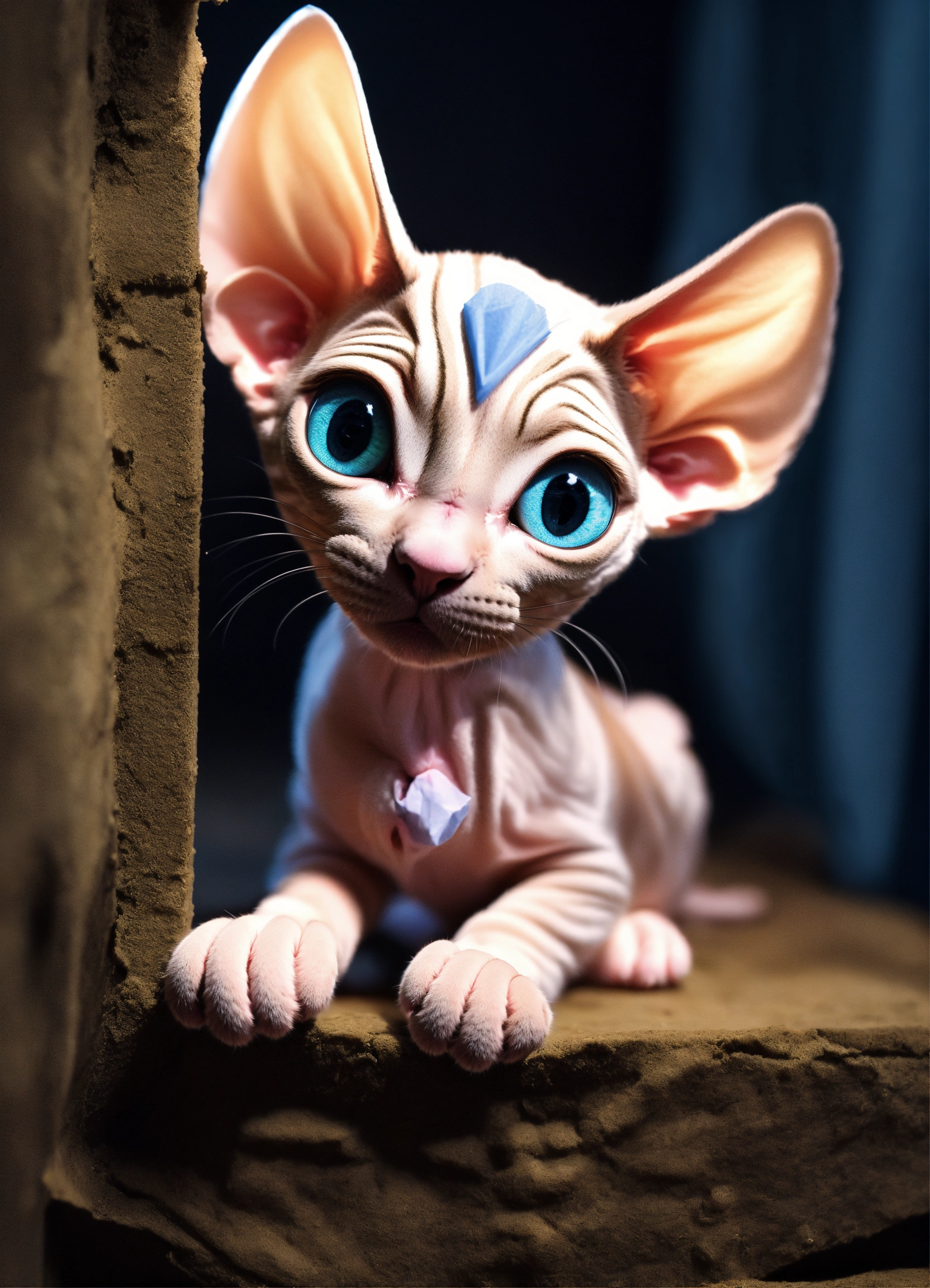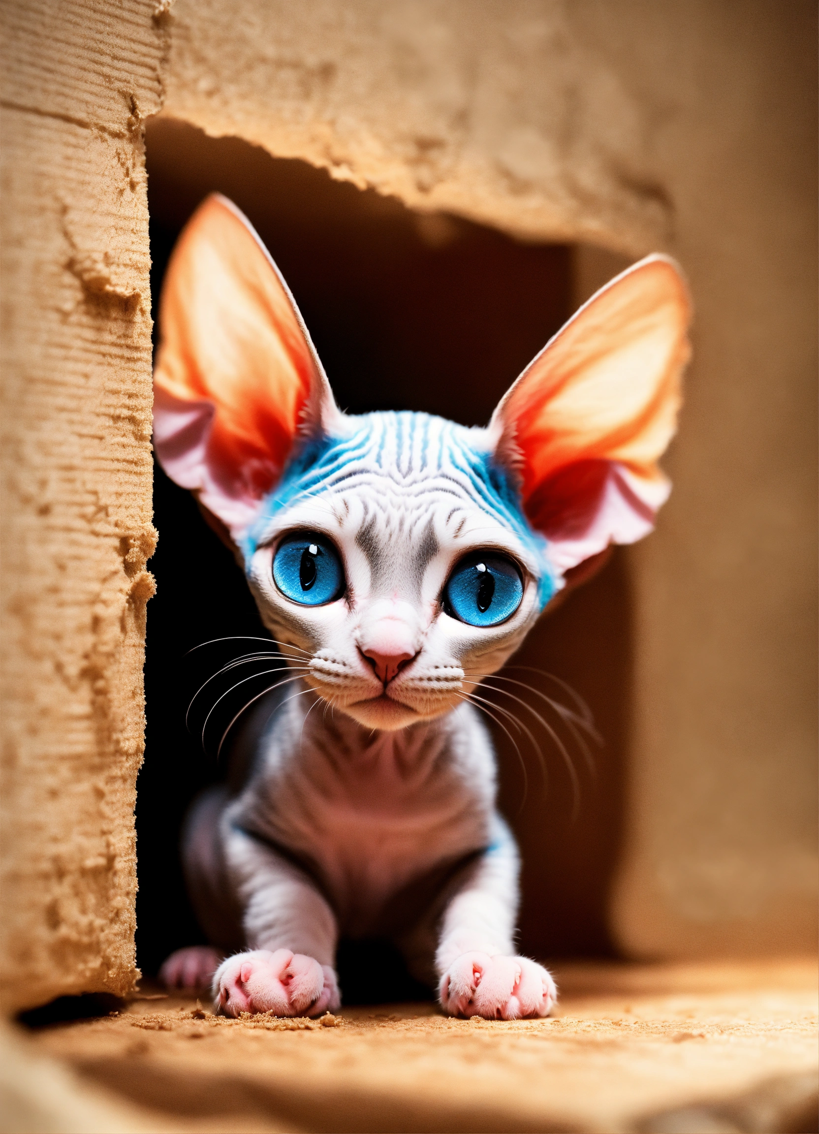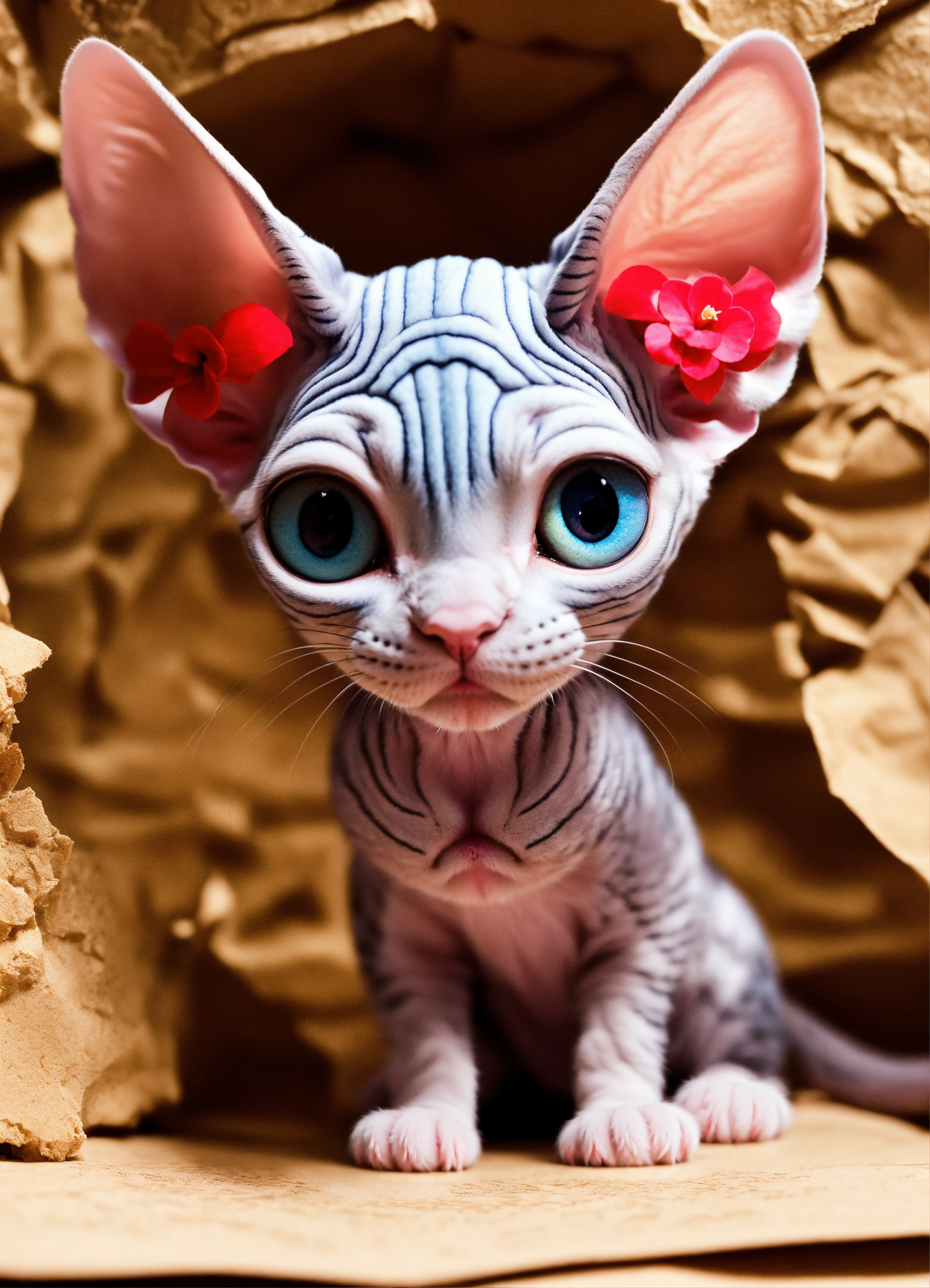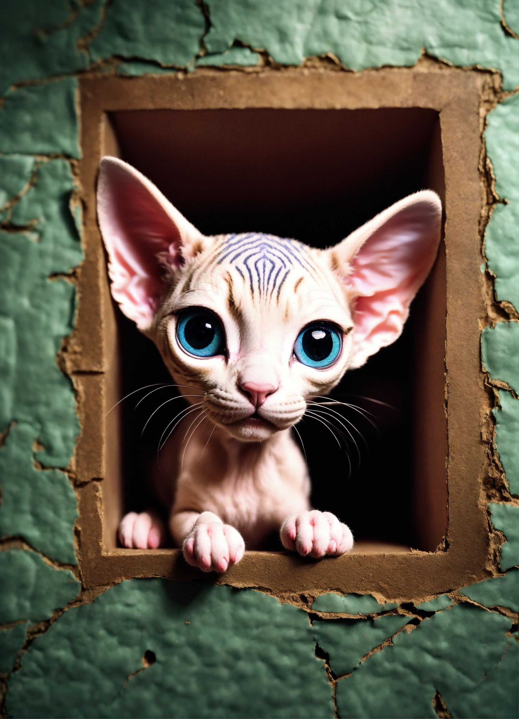 3d extremely cute, adorable sphynx kitten, disney aristocats, big bright cute eyes, breaking through a paper wall, photograph, hyper realistic, intricate detail