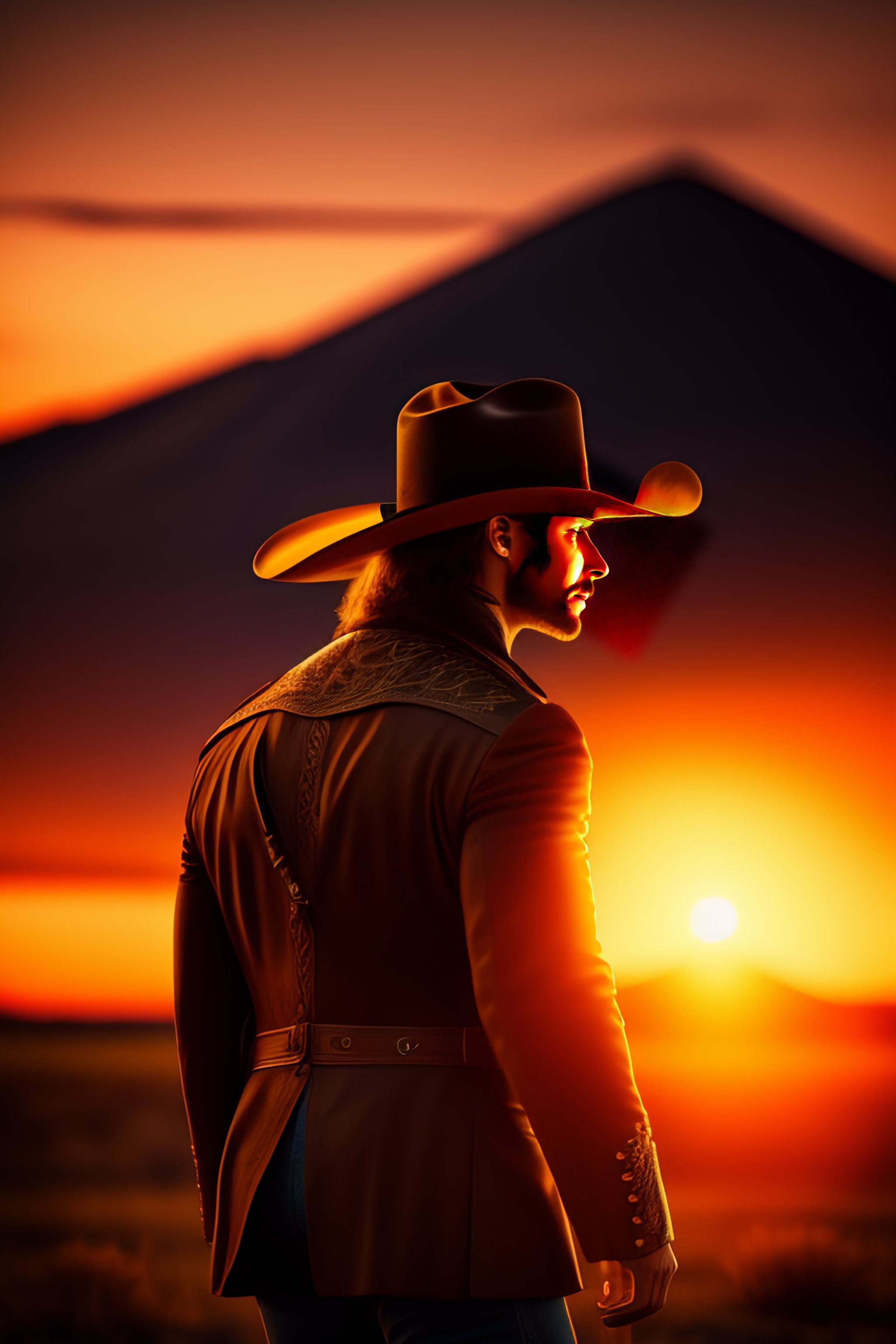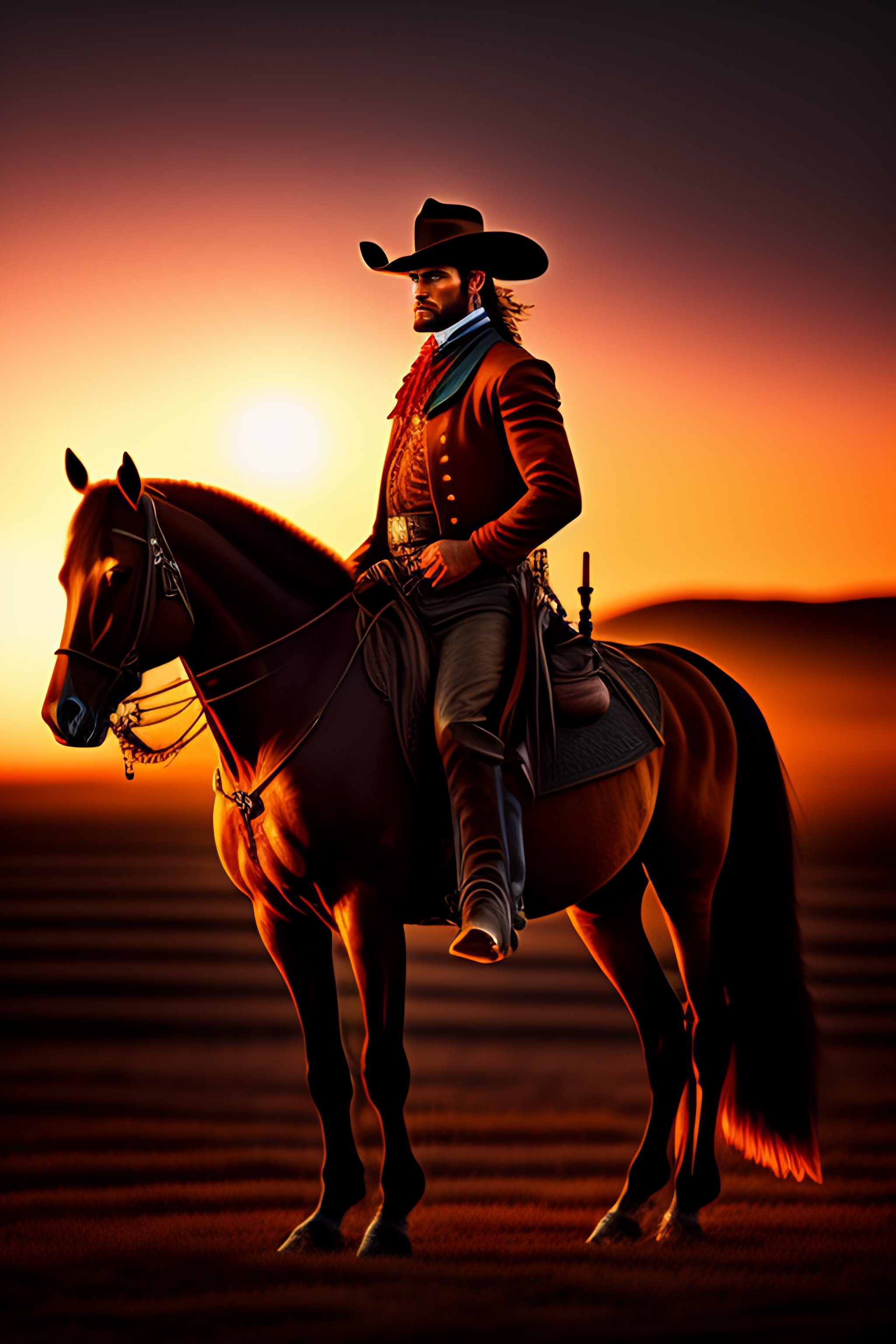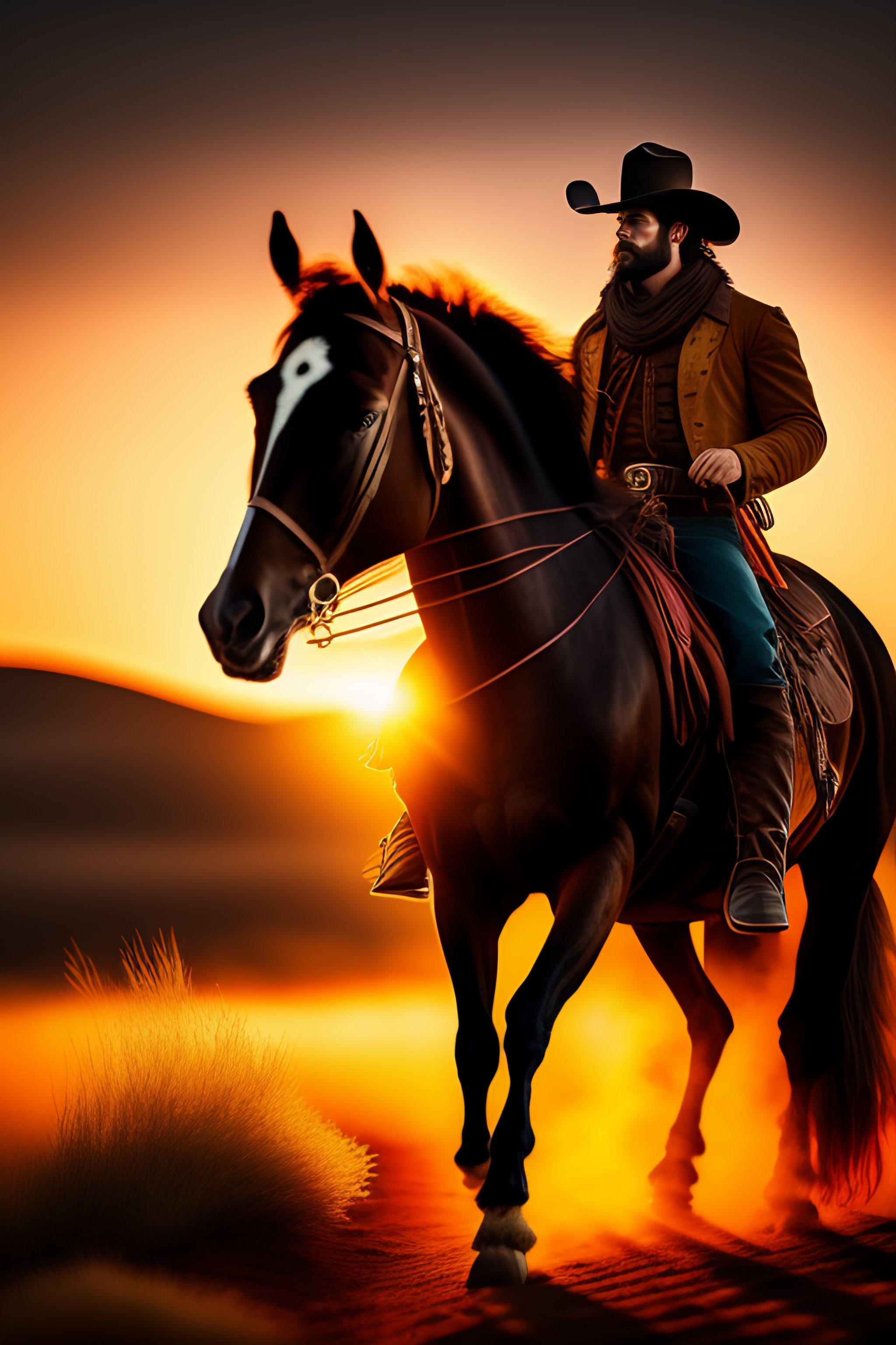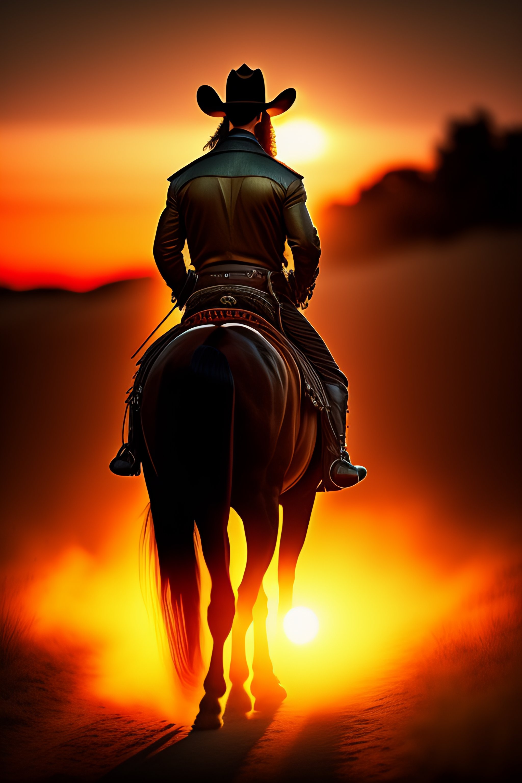 1800's cowboy leaving town, sunset in background, golden hour, hd, volumetric lighting, hyper-detailed, 4k