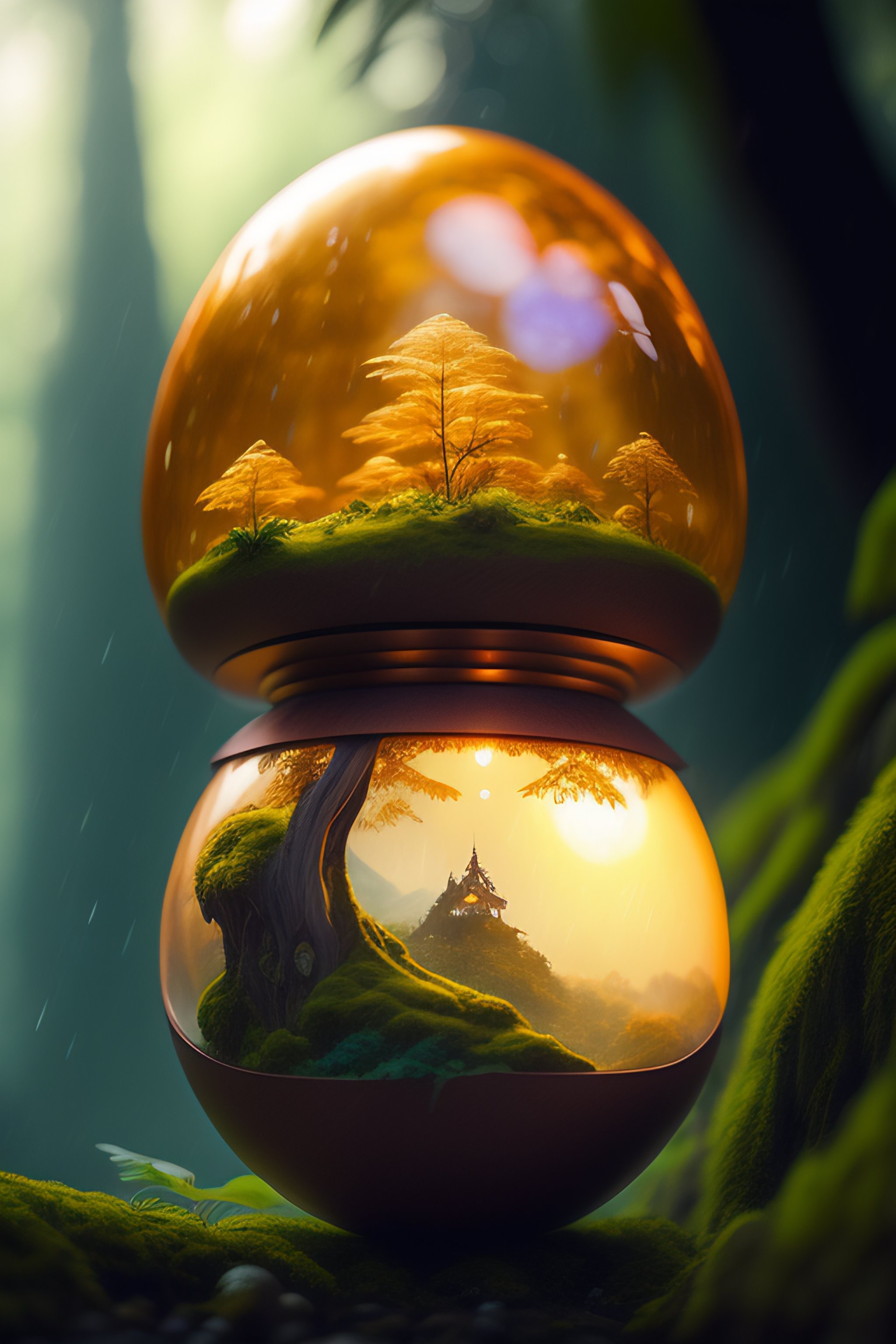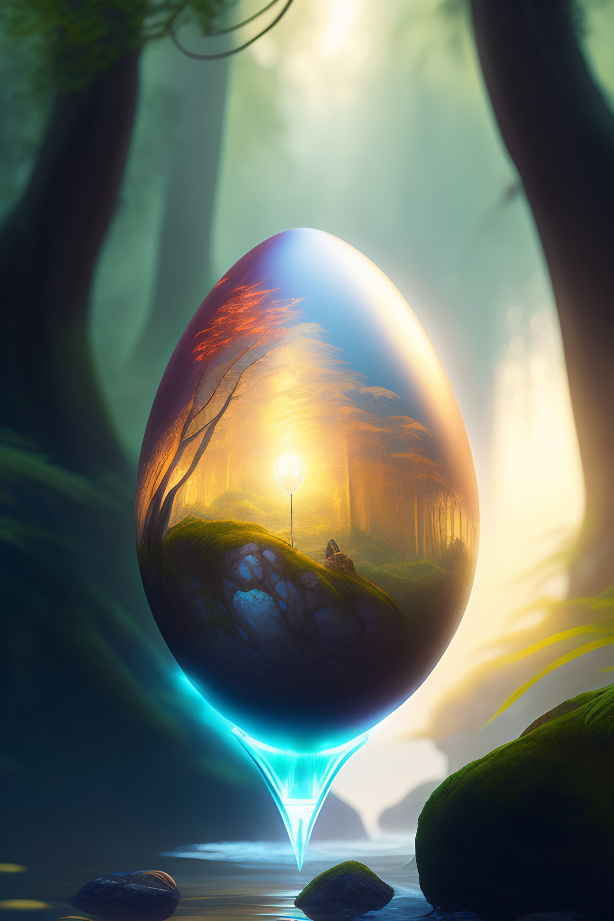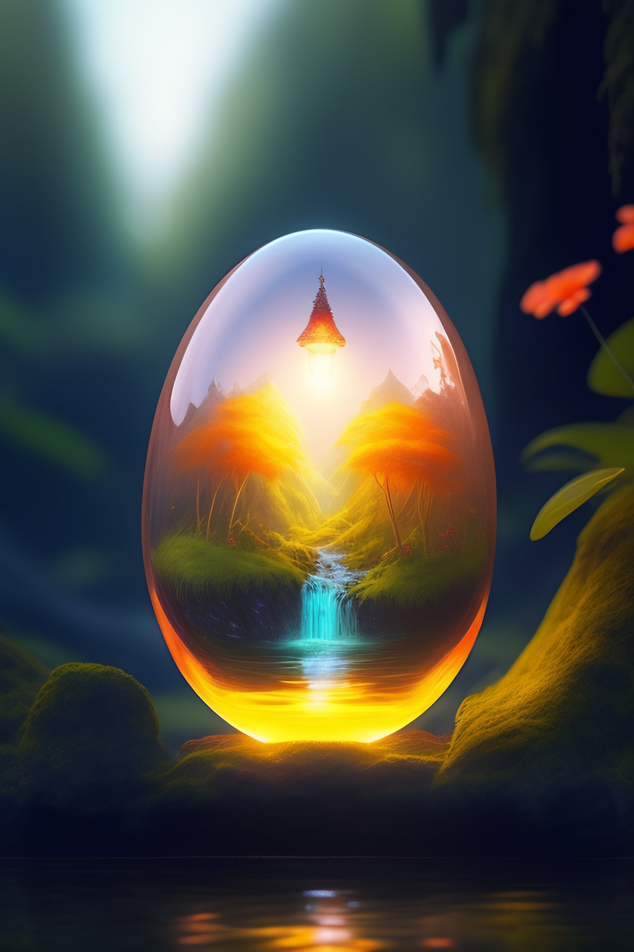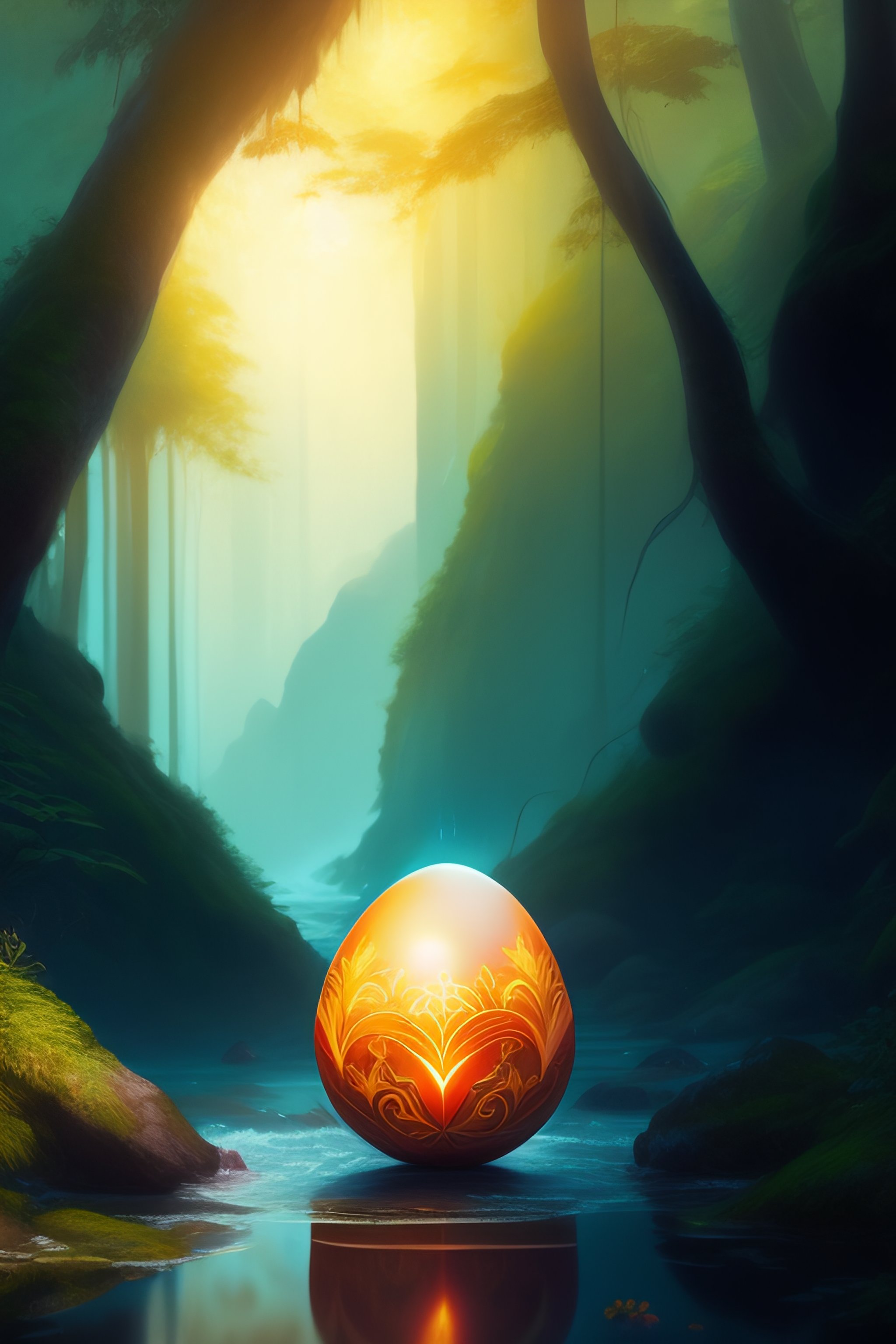 Fantasy magical fairy-tale small glowing egg in rain forest. the rain forest is near the ocean. the rainforest seems destroyed and on fire. fantastic landscape. sharp details, sharp focus, elegant, highly detailed, wearing a dress by a forest stream, medium shot, organic painting, sunny day, bold shapes, hard edges, street art, trending on artstation, by huang guangjian and gil elvgren and sachin teng and artgerm and greg rutkowski and alphonse mucha, unreal enginee