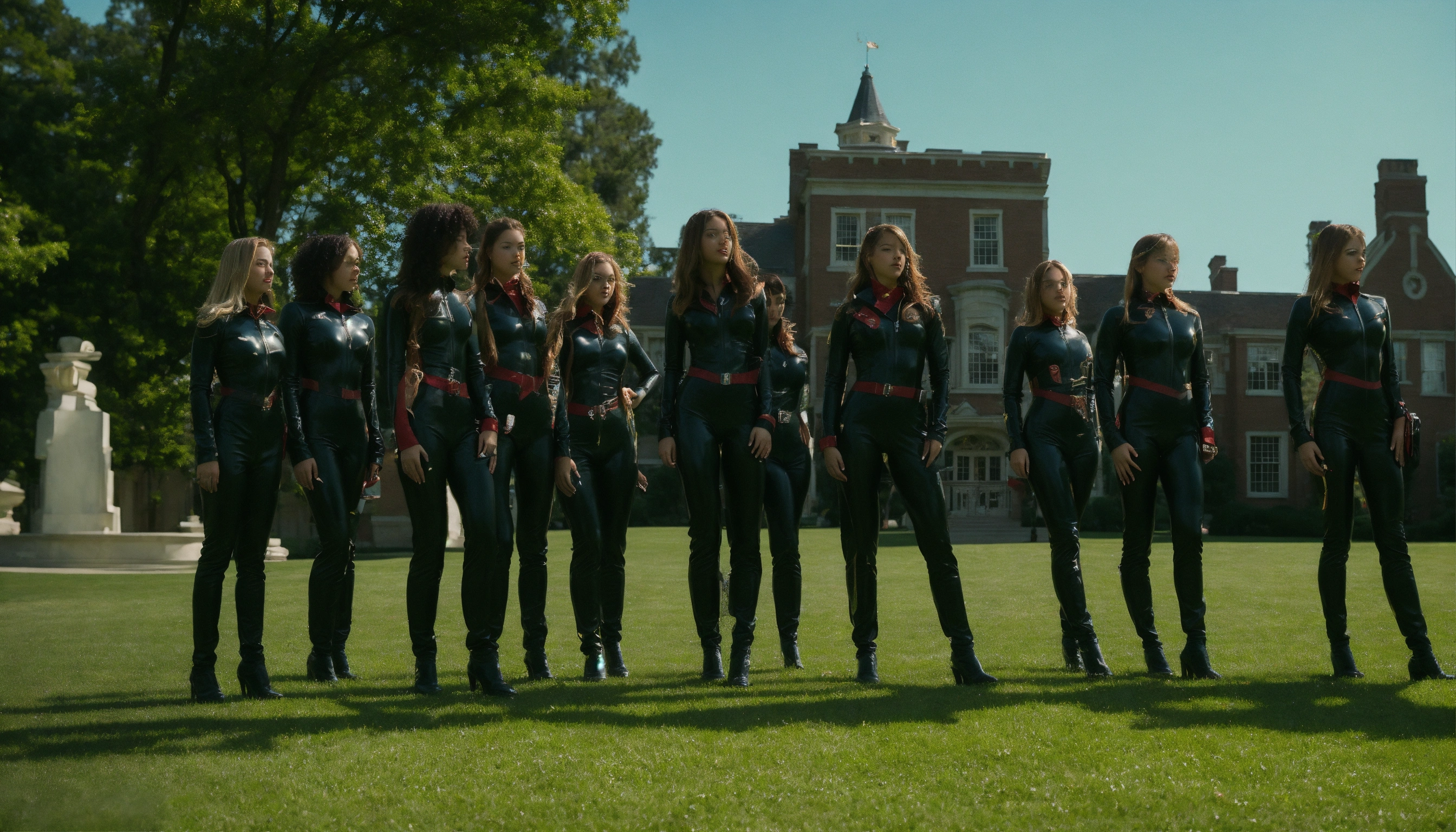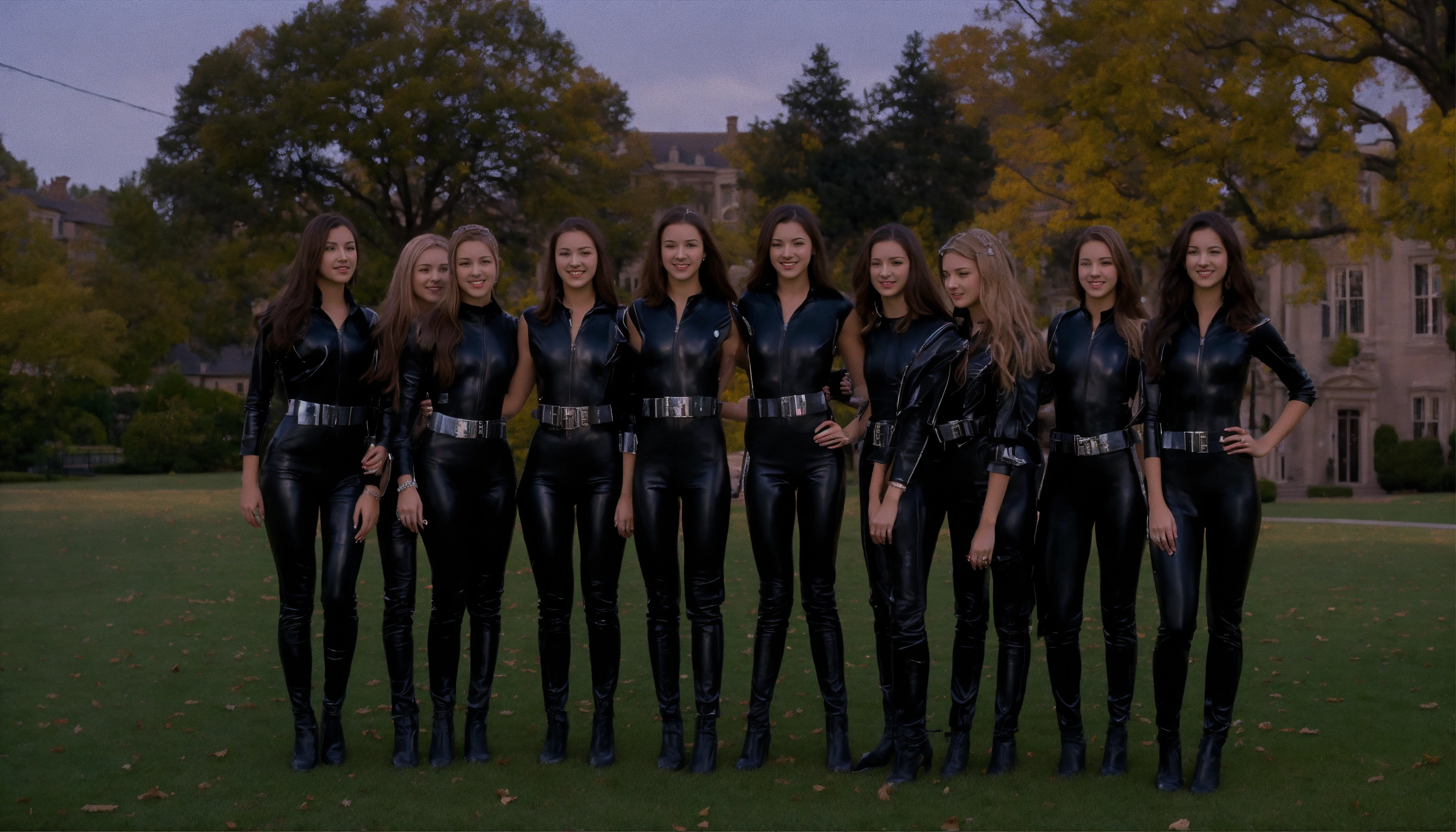 Mansion lawn, high fence, iron gate, group of college age women, wearing leather catsuit uniforms, stern