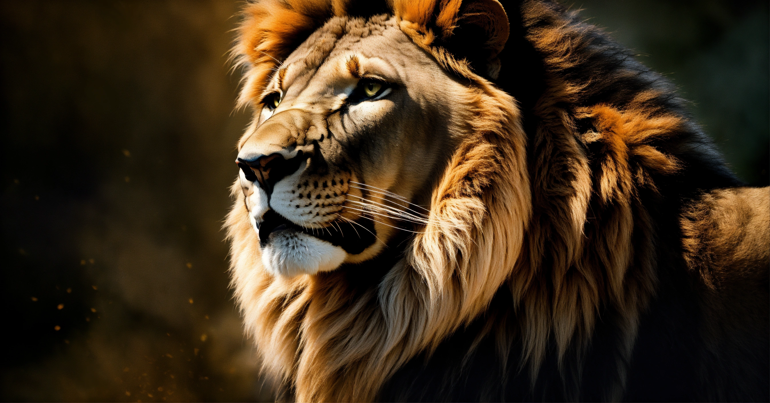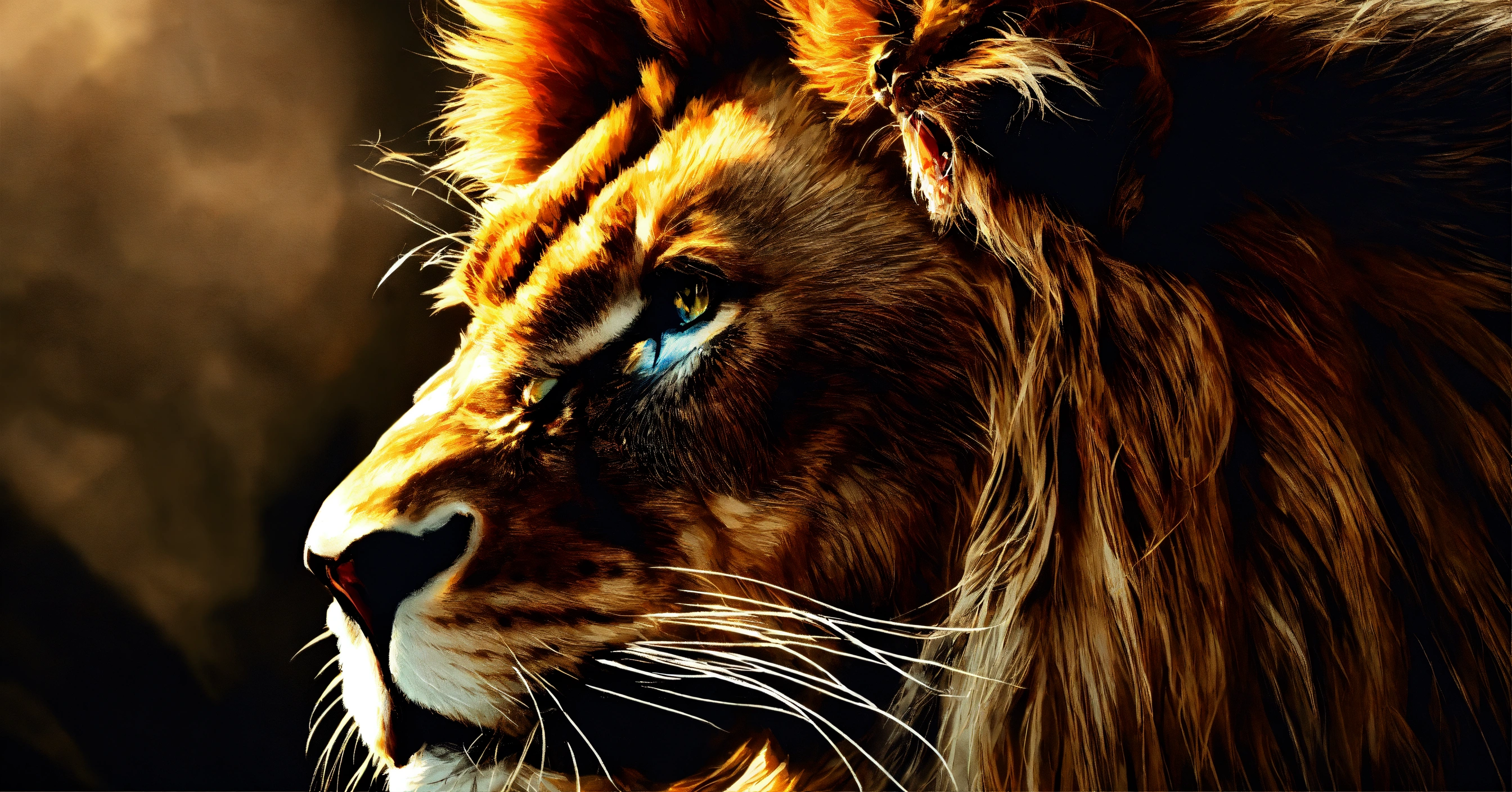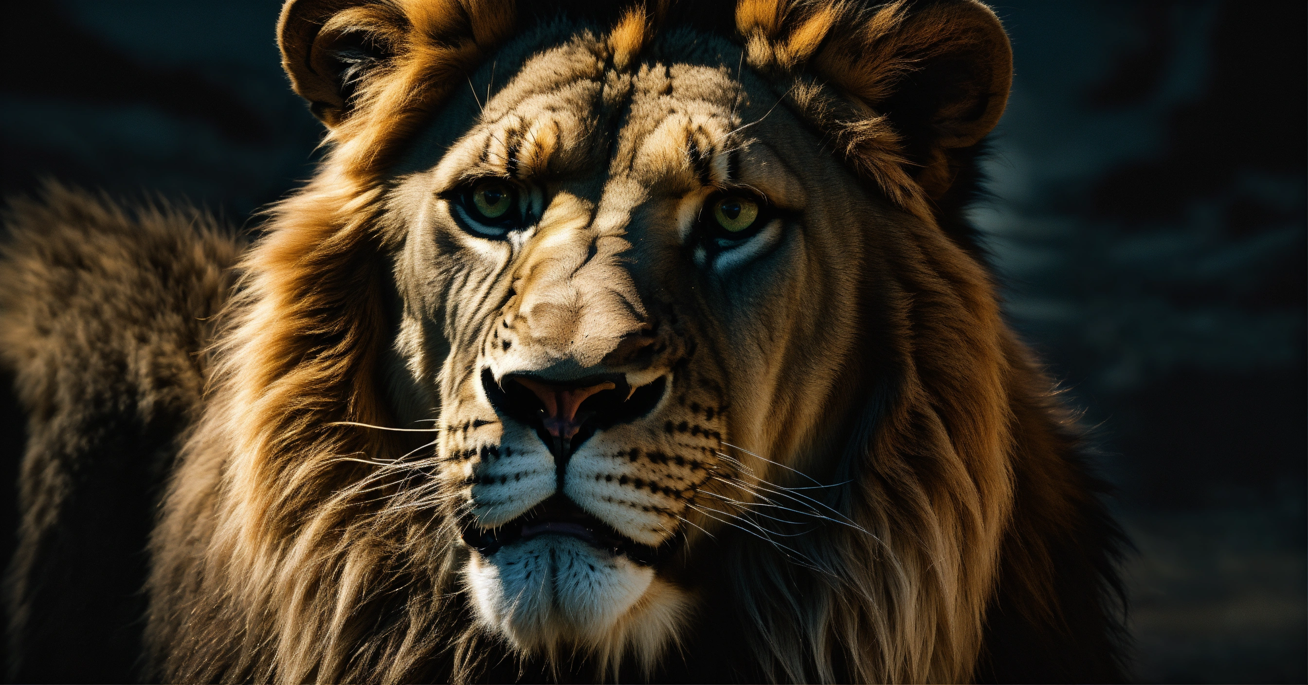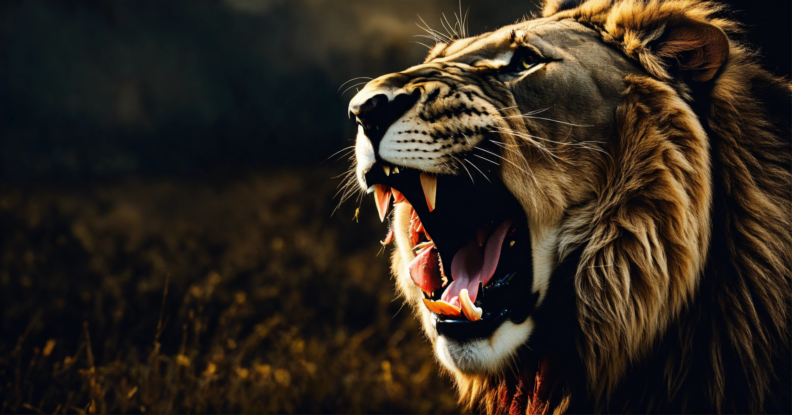 Hyperrealistic glamour shot of a roaring lion in chiaroscuro style, macro, extreme details, looking at viewer