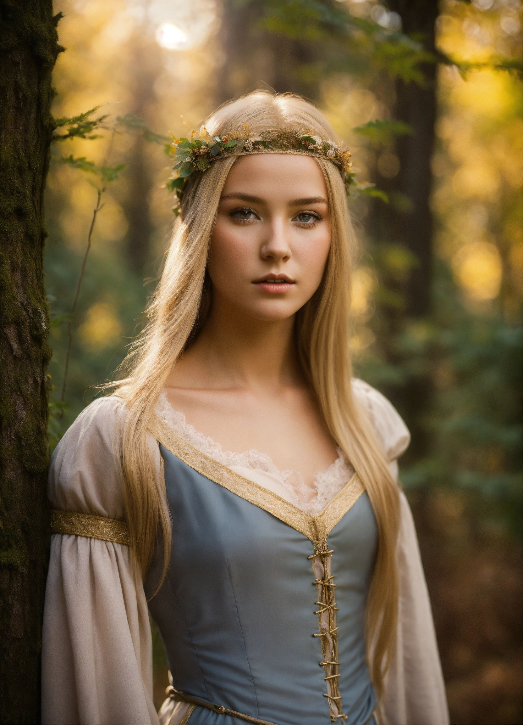 Young medieval maiden with hazel eyes and blonde straight hair in a forest fantasy