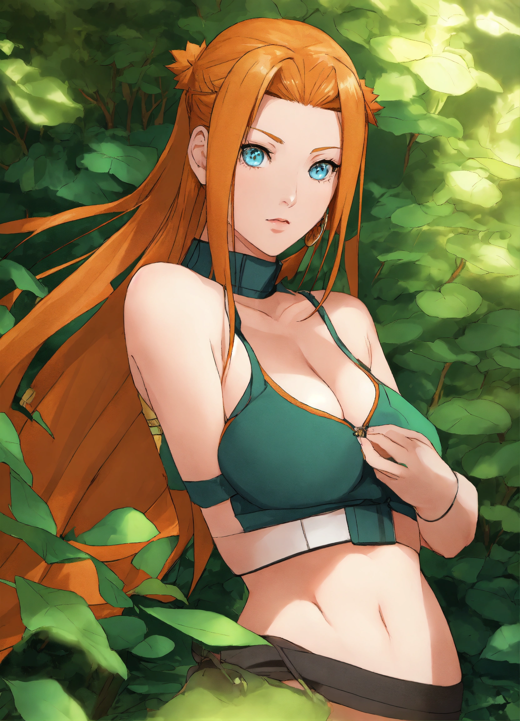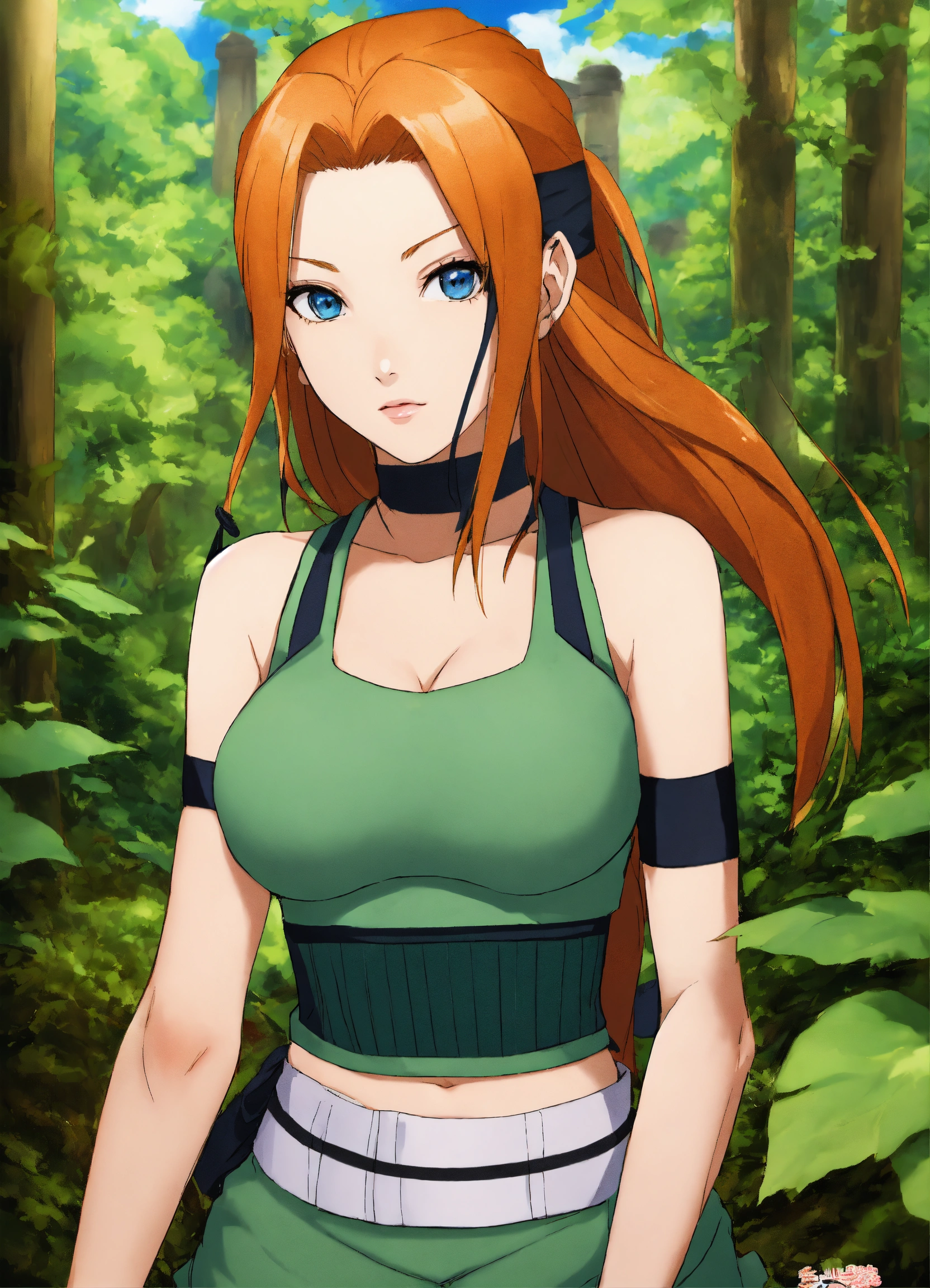 Naruto-style art, masashi kishimoto art, anime, naruto manga, naruto anime, original character, ginger hair, blue eyes, pretty woman, kunoichi, shinobi, konoha, ginger long hair, ginger hair, blue eyes, beautiful girl, beautiful young woman in naruto style art, feminine, fishnets, village hidden in the leaves headband, skirt, fishnets, cropped top, green kunoichi attire, feminine kunoichi attire, naruto headband, fishnets tights on legs, flattering kunoichi fishnets with green cropped top and skirt, long hair down and flowing, full body, fishnets on her legs, fishnet tights, wearing fishnet tights on her legs, fishnet tights on legs