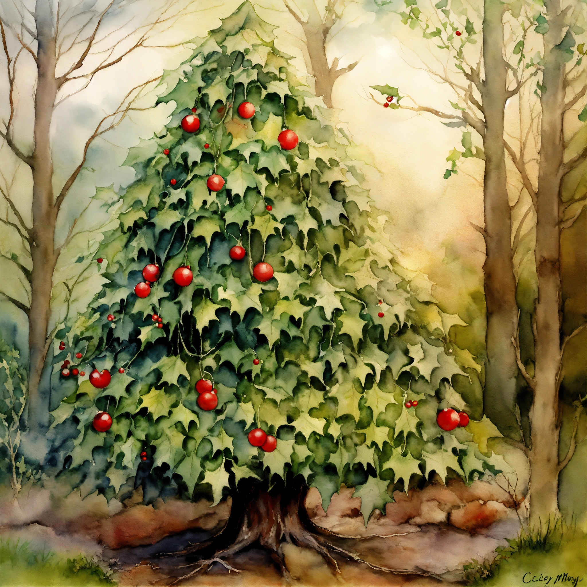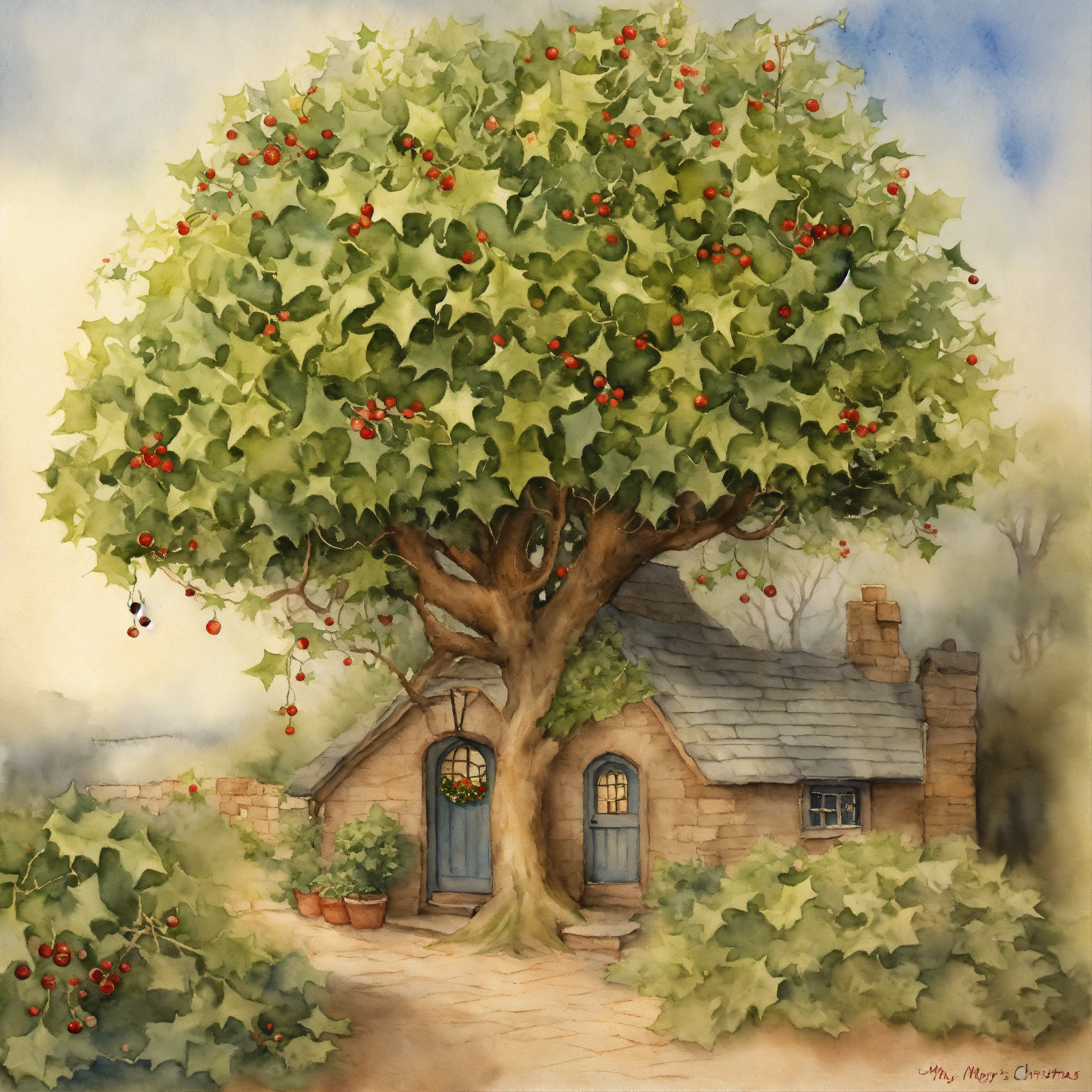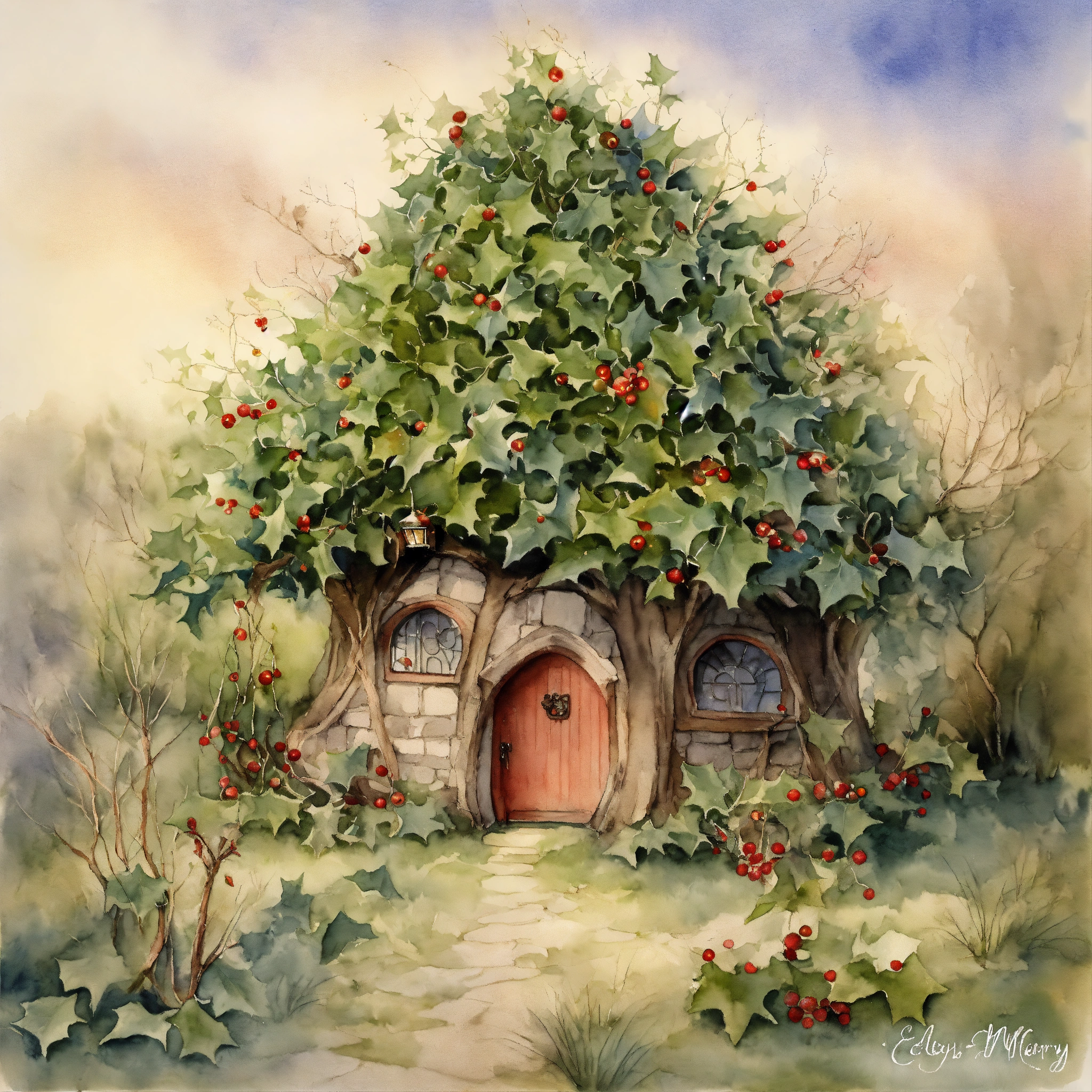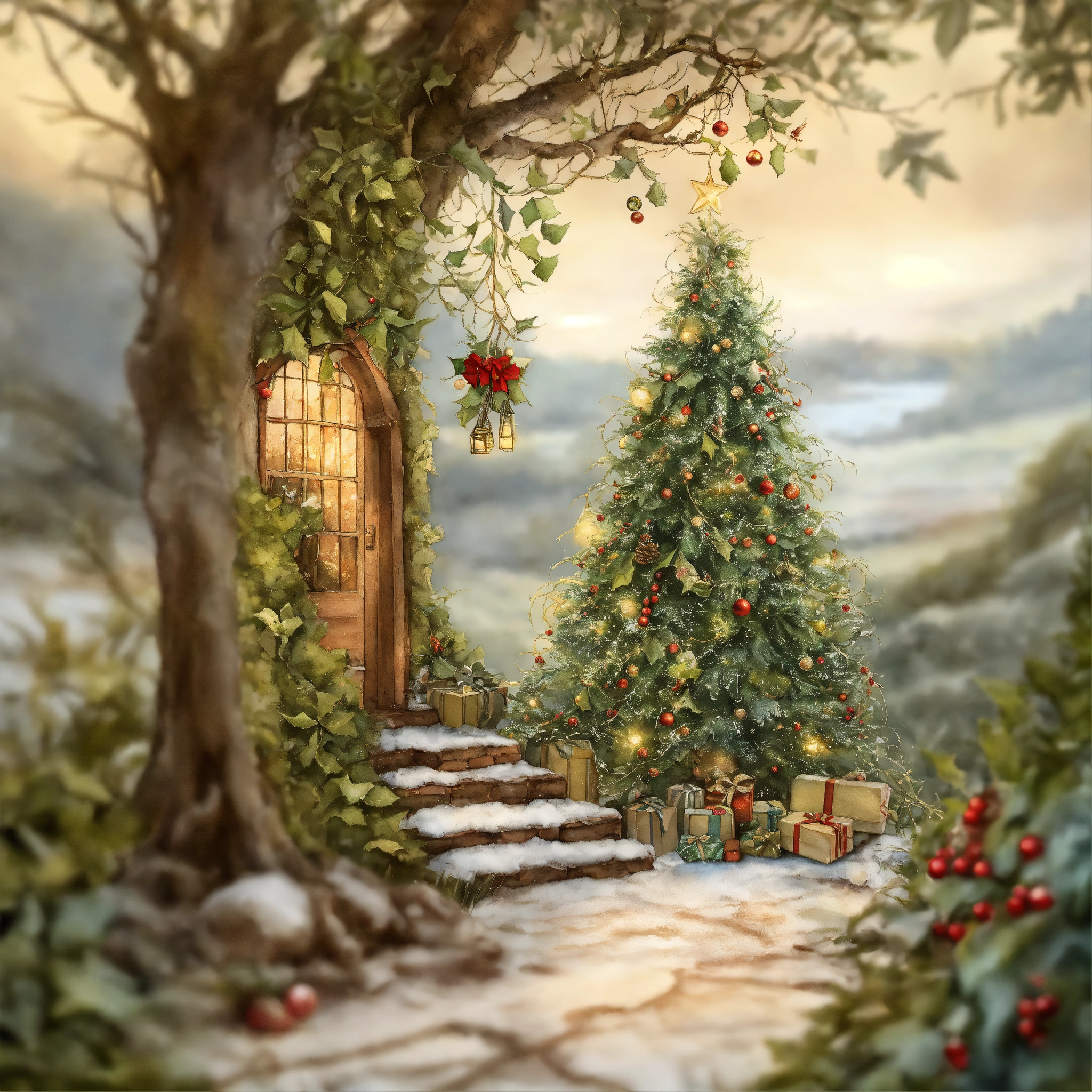 Elven quirky christmas tree land, very quirky with a tree as a elvish home, holly, ivy, mistletoe on a cold winters days, realistic muted soft and gentle tones, watercolour by cicely mary barker