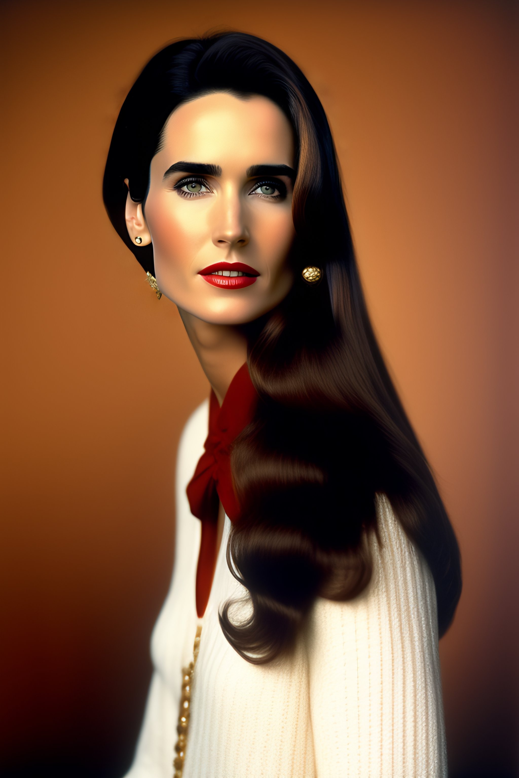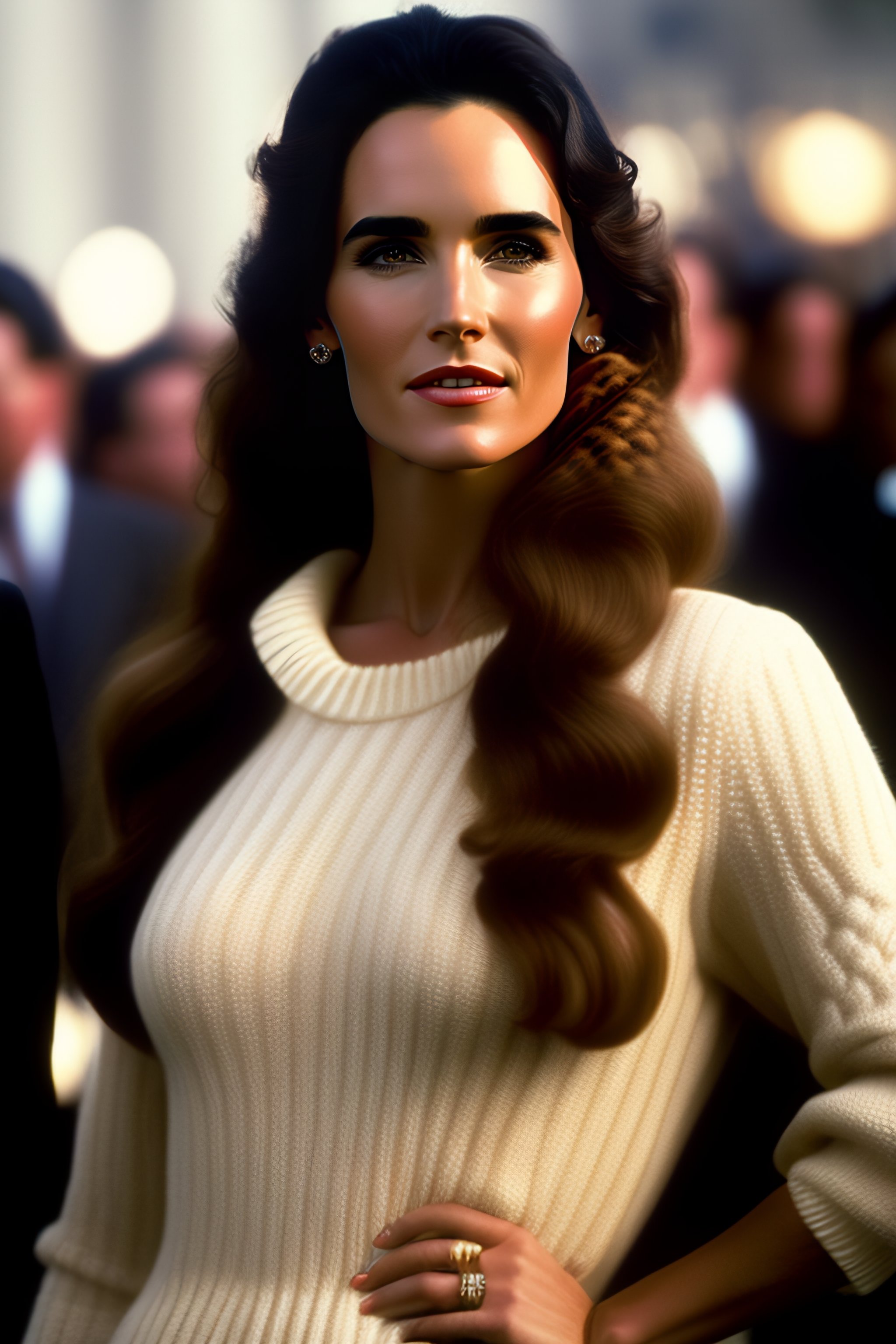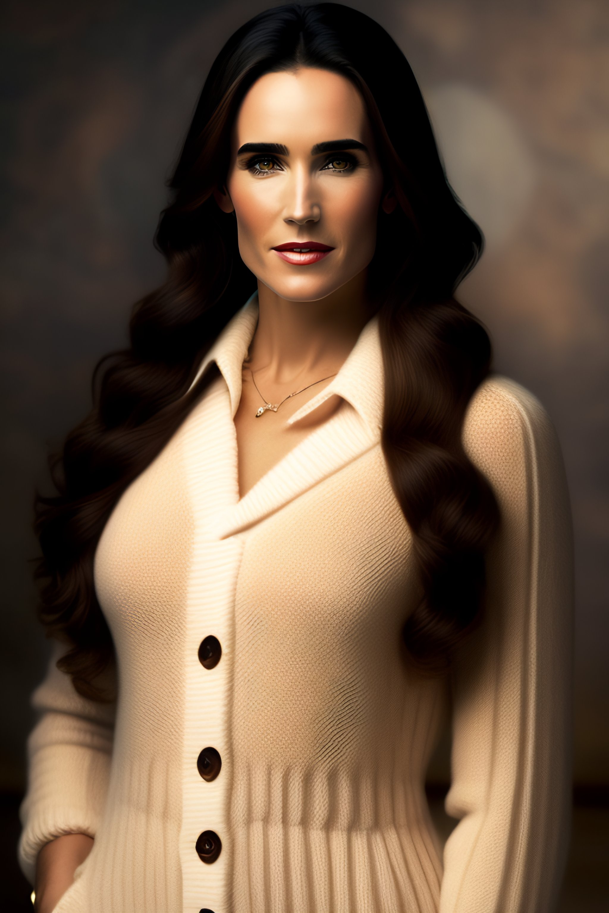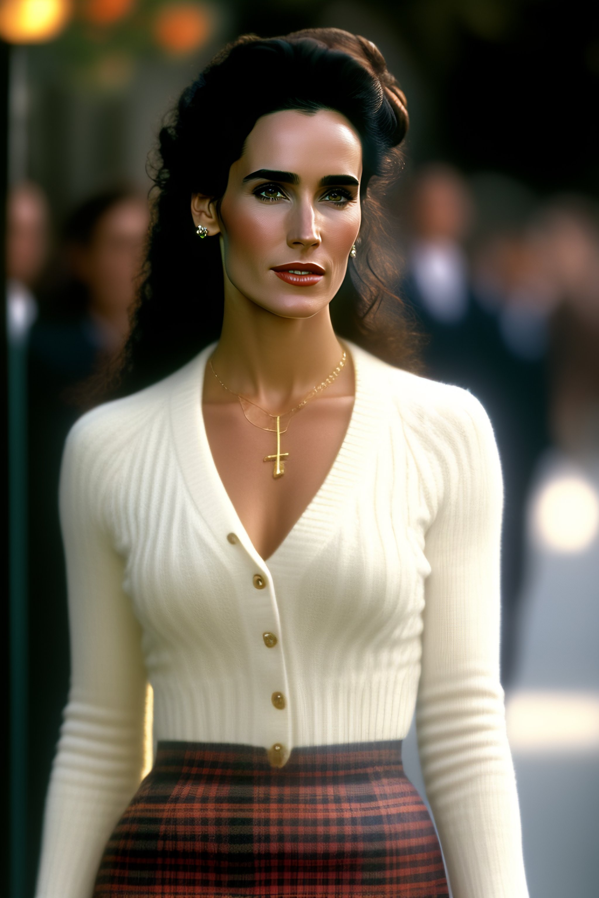 Full length photo of jennifer connelly, age 20, with short plaid dress and a white sweater in the style of stefan kostic, with a dark tan, full extremely slim body, not realistic, sharp focus, 8k high definition