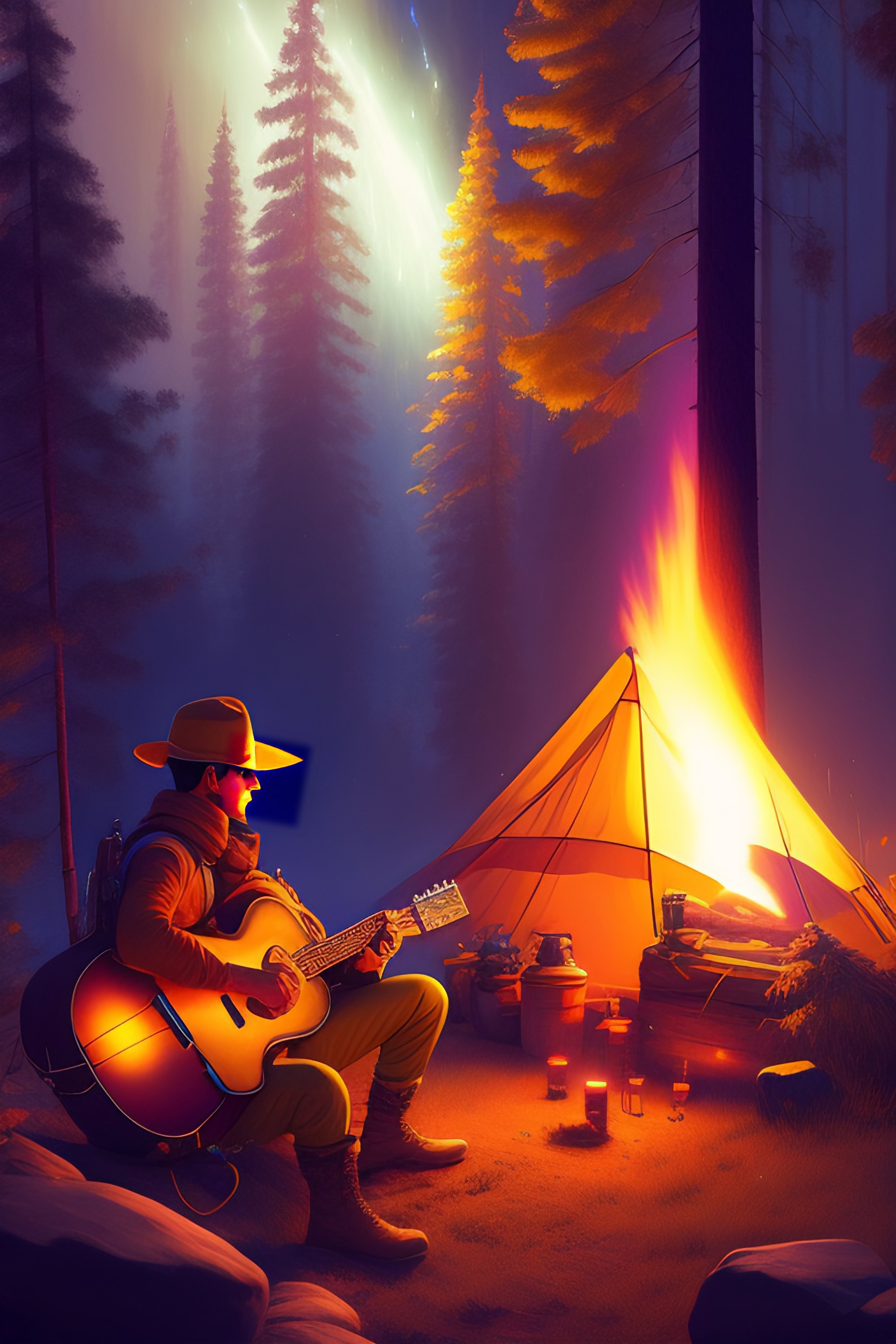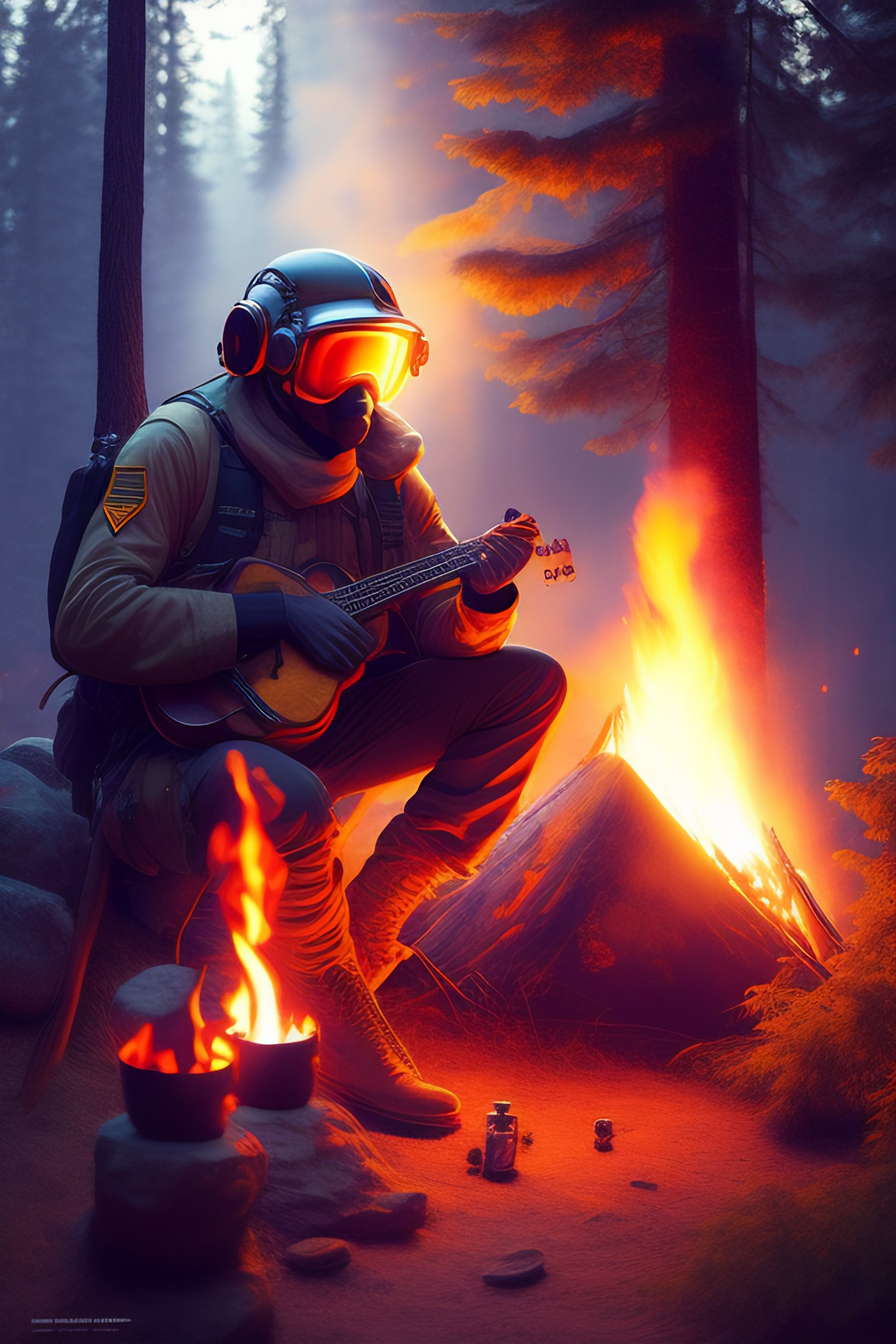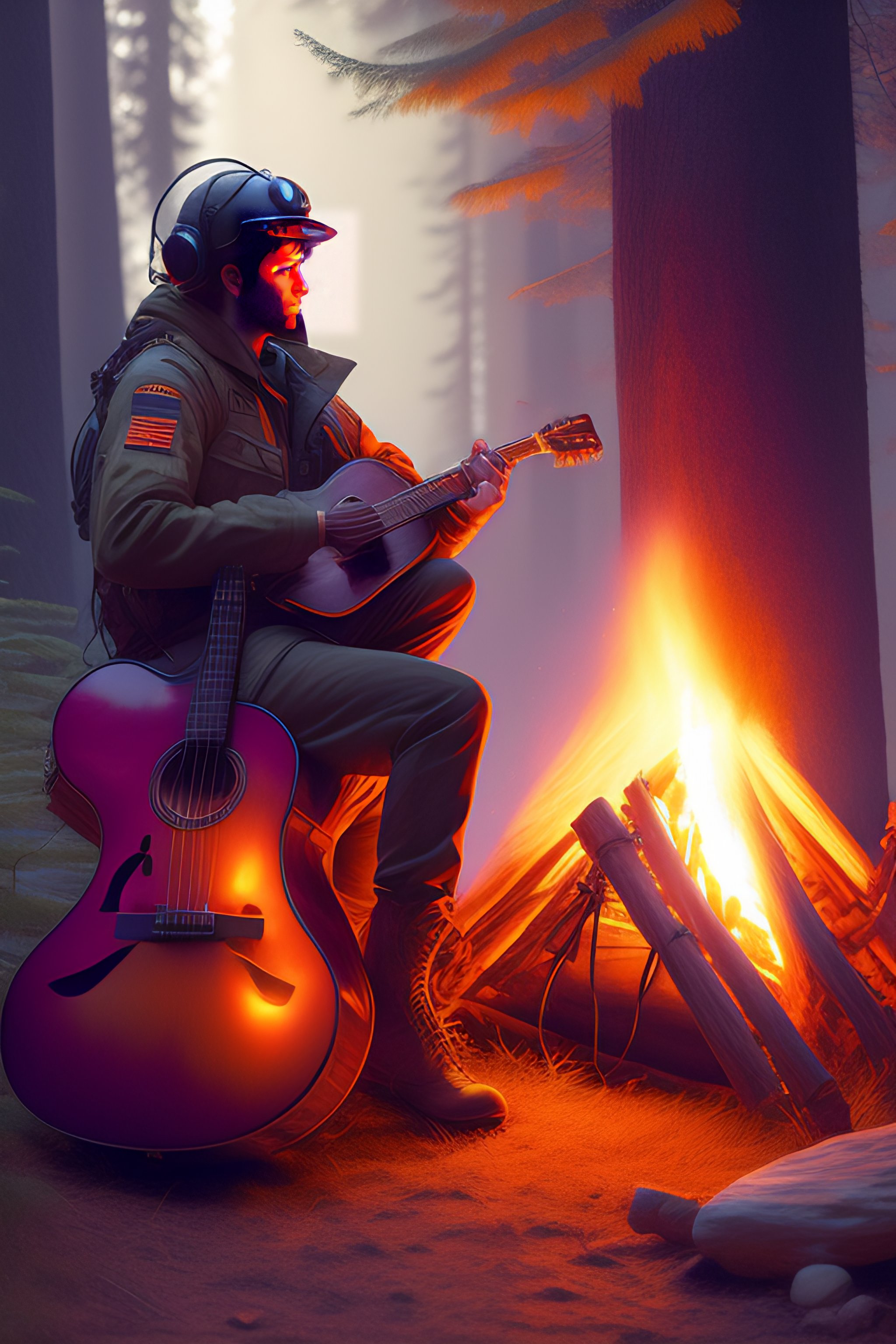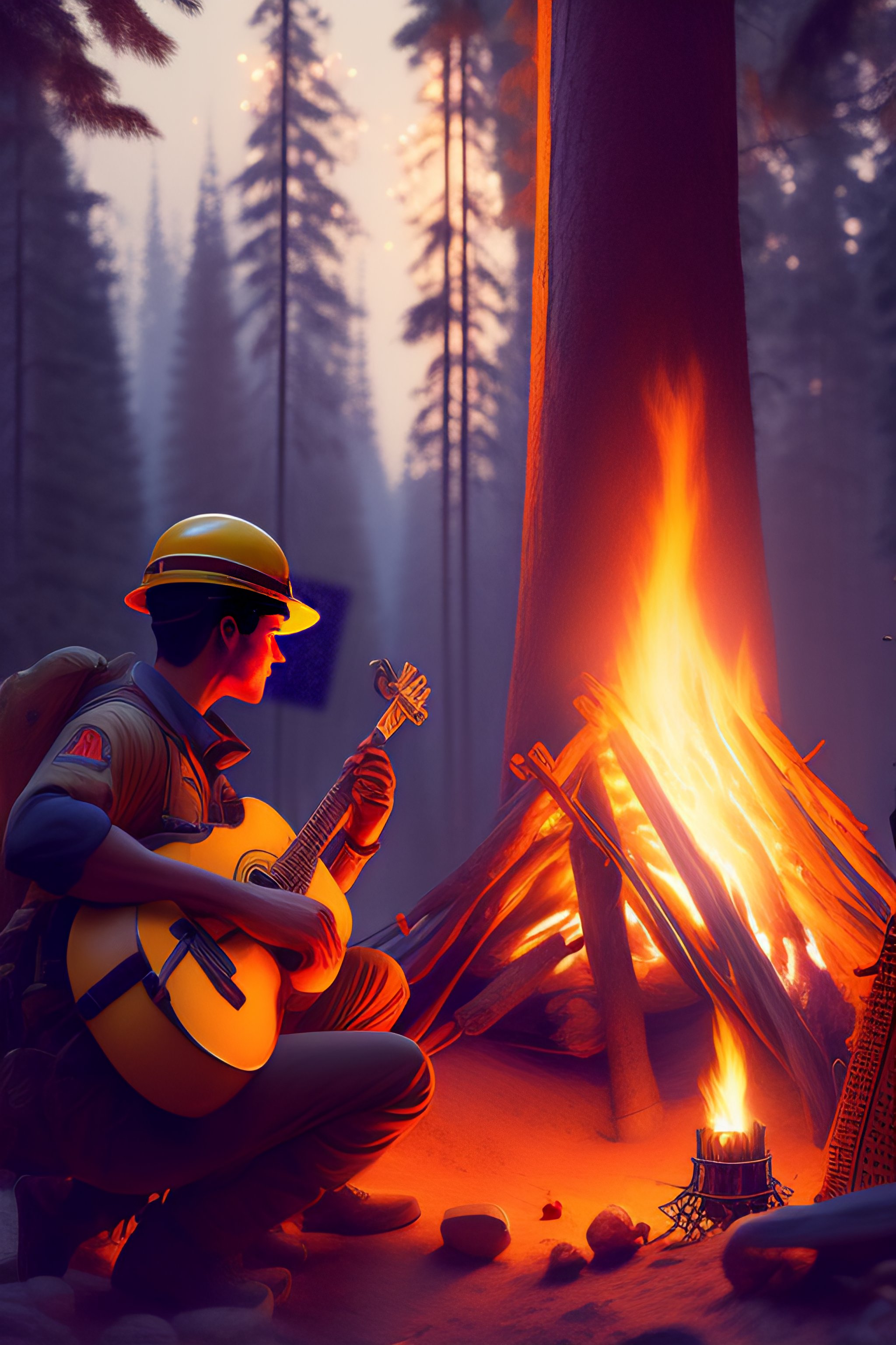Engineer tf2 with yellow helmet plays a guitar near campfire, night, atmospheric lighting, intricate, volumetric lighting, digital art, highly detailed by gaston bussiere, craig mullins, j. c. leyendecker 8 k