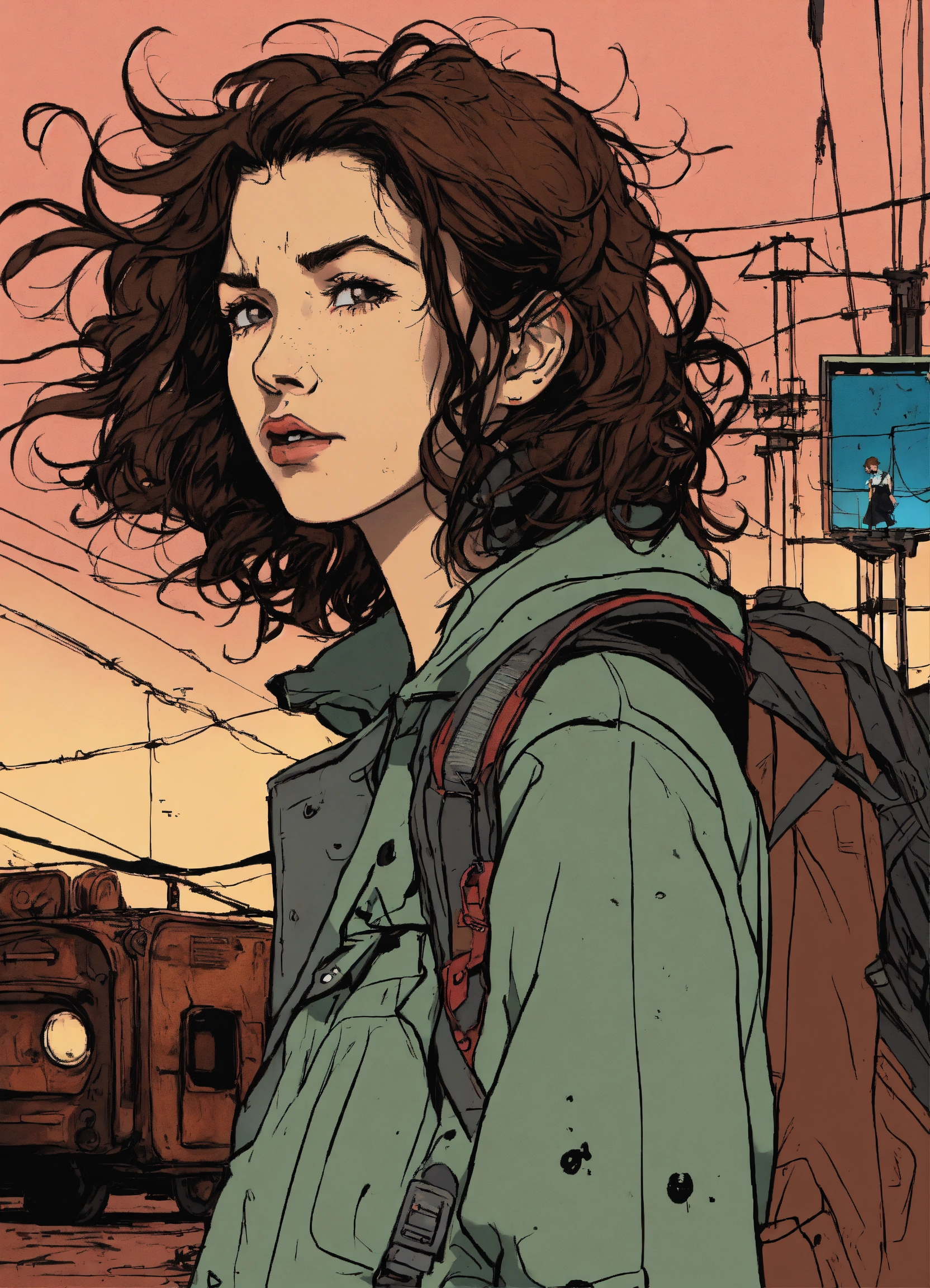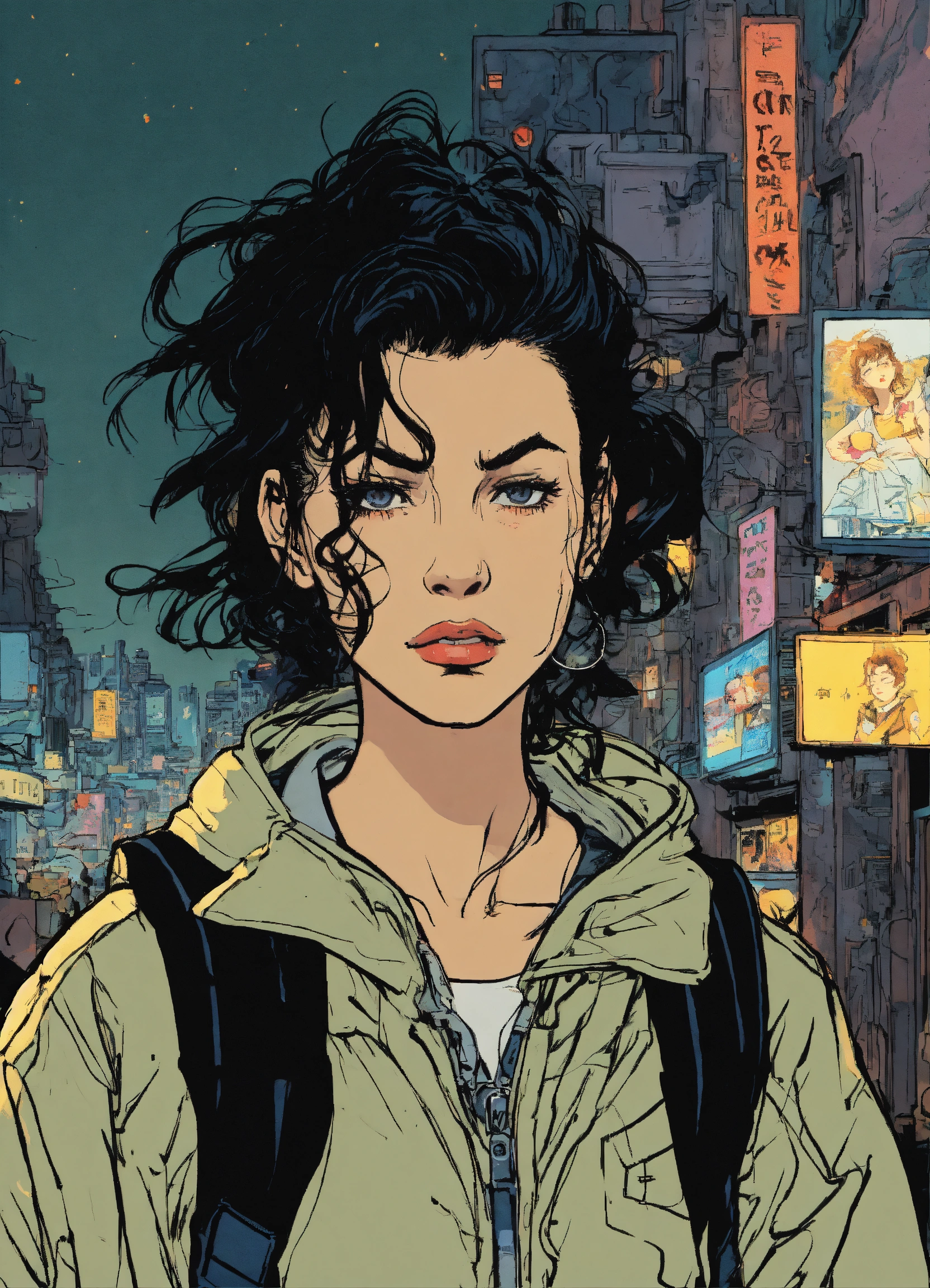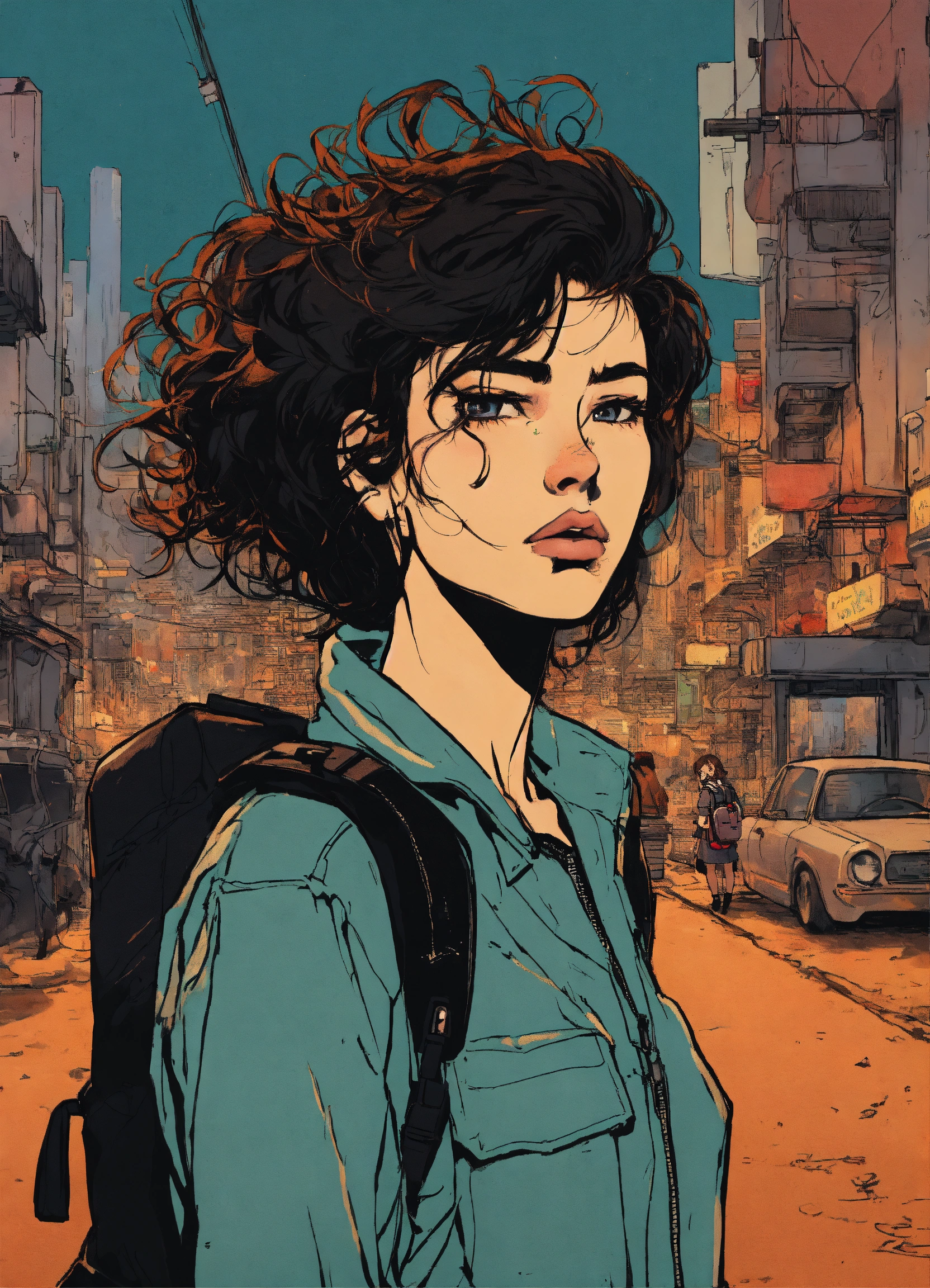 Illustration by hergé, brunette young woman with alt style, by herge, with messy hair and angry looking, cyberpunk background, dark backpack, a little black dot tatto under the eyes