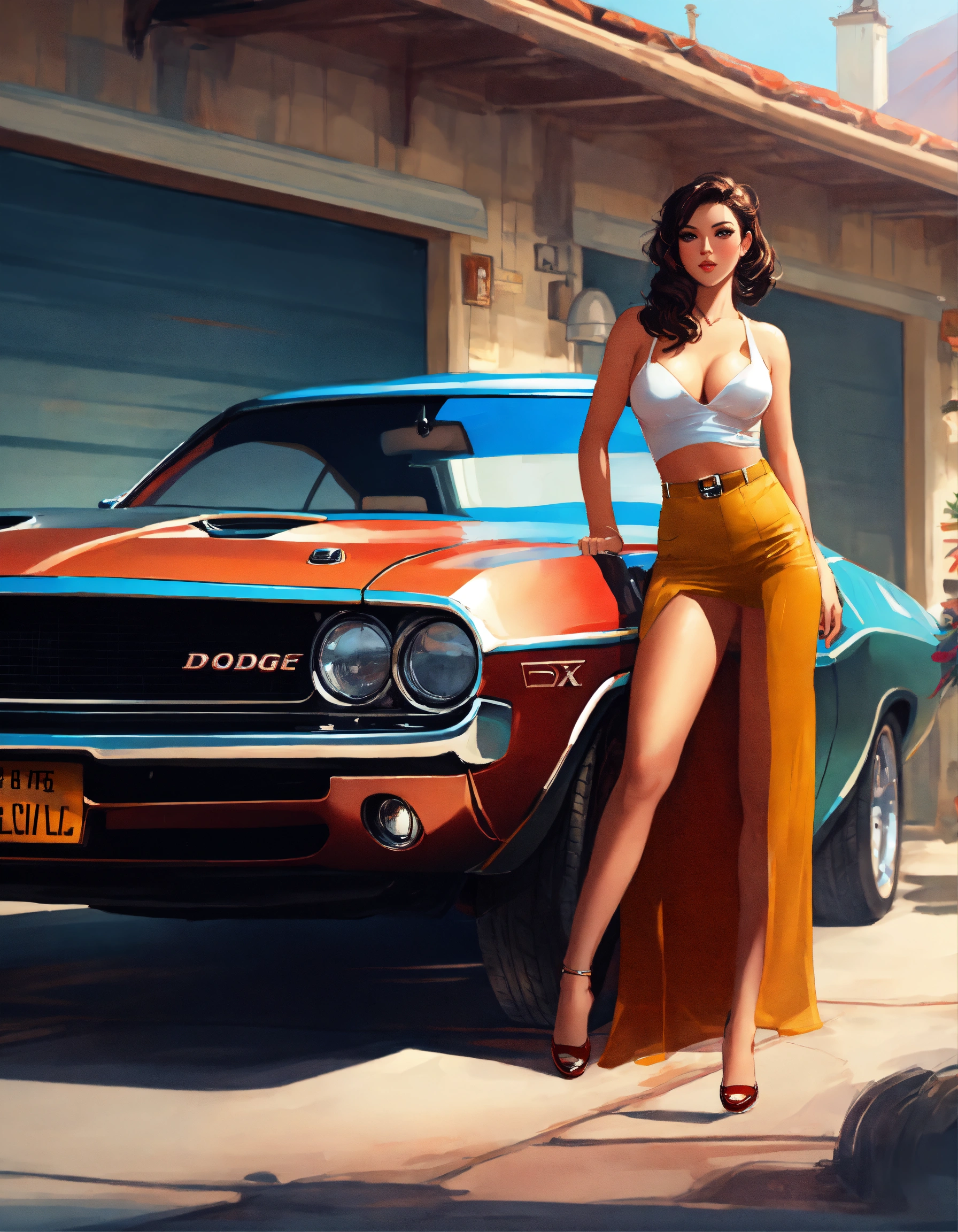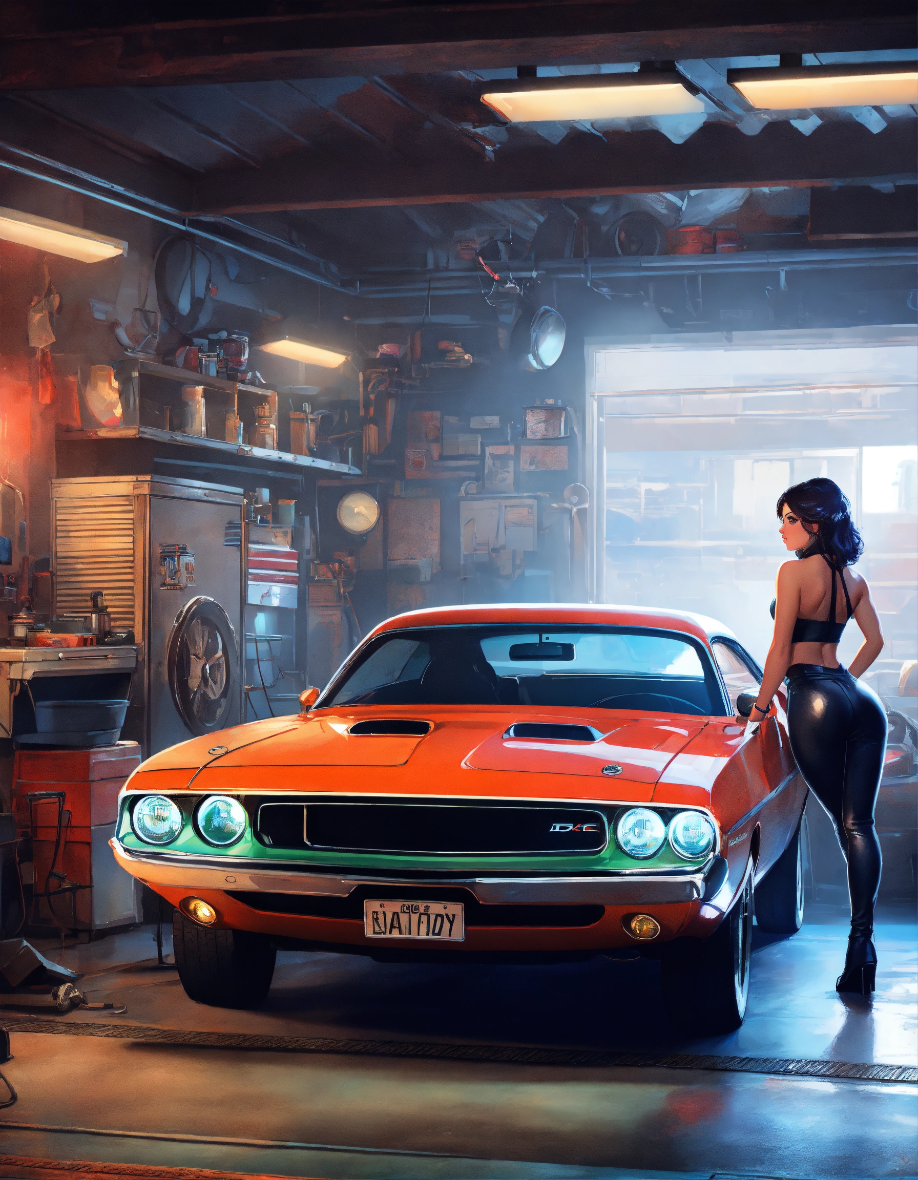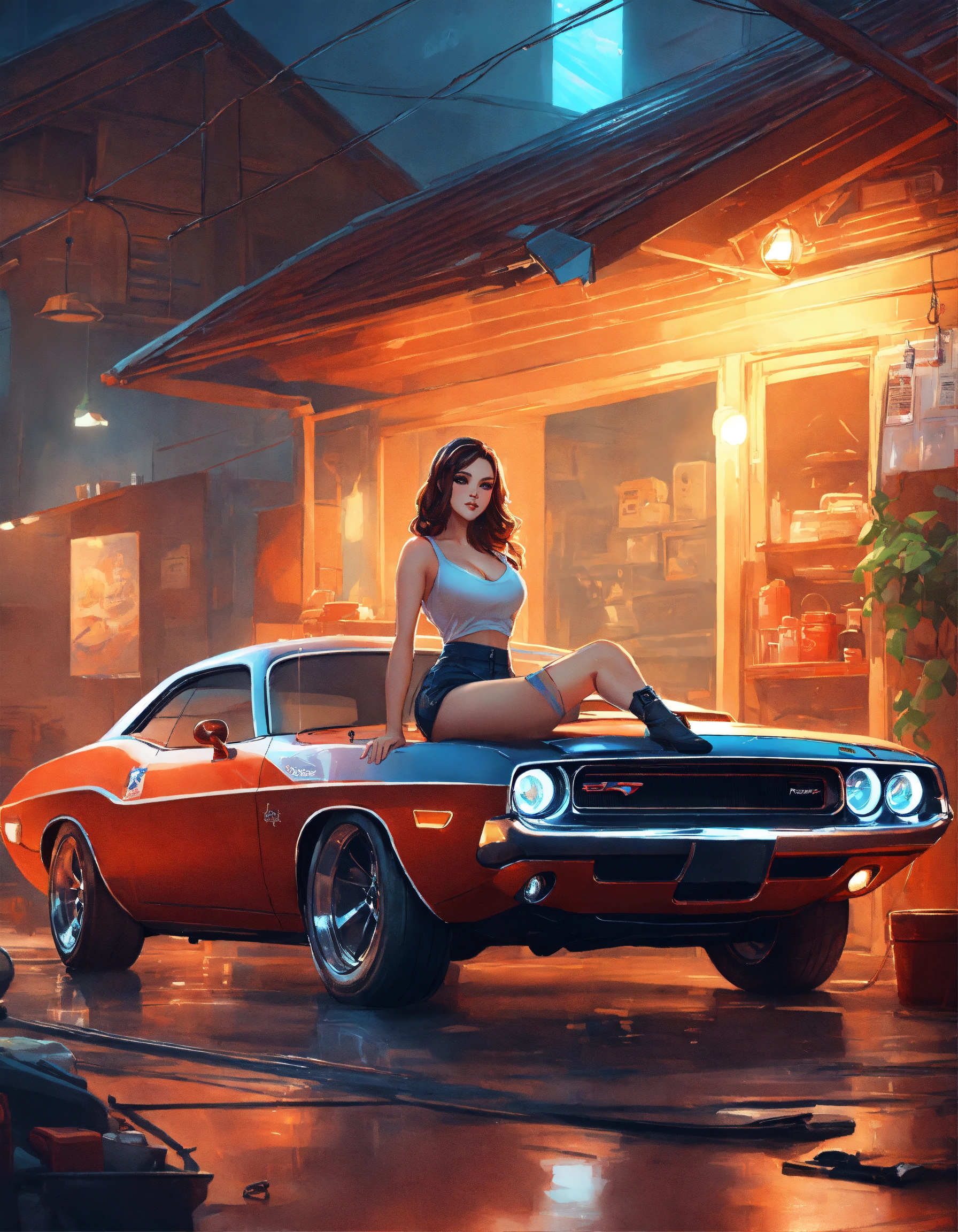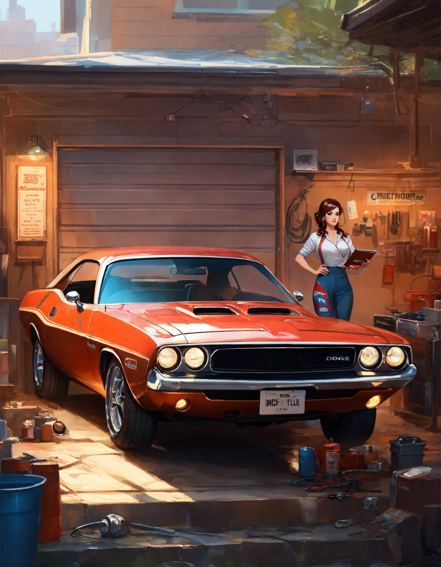 Garage scene, vintage atmosphere, with a dodge challenger, mechanic, and pinup, art by, highres highly detailed digital painting 4k uhd rtx, art by par rossdraws (alias ross tran)
