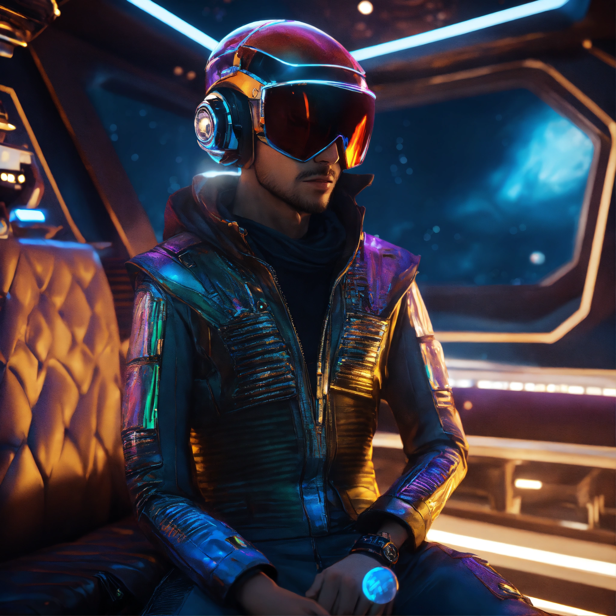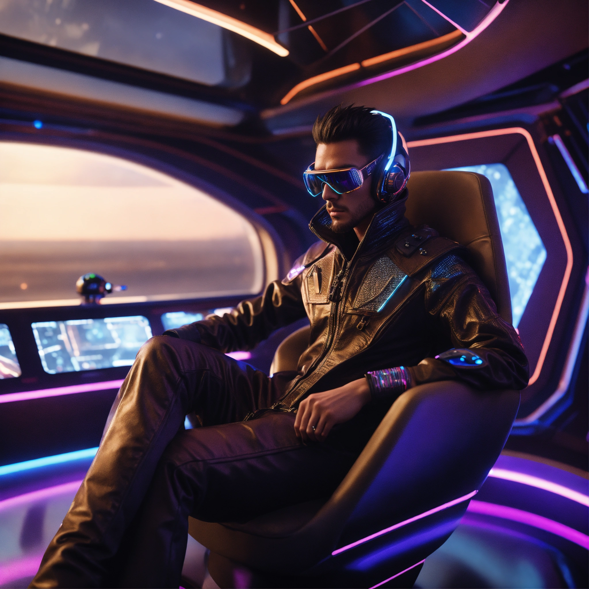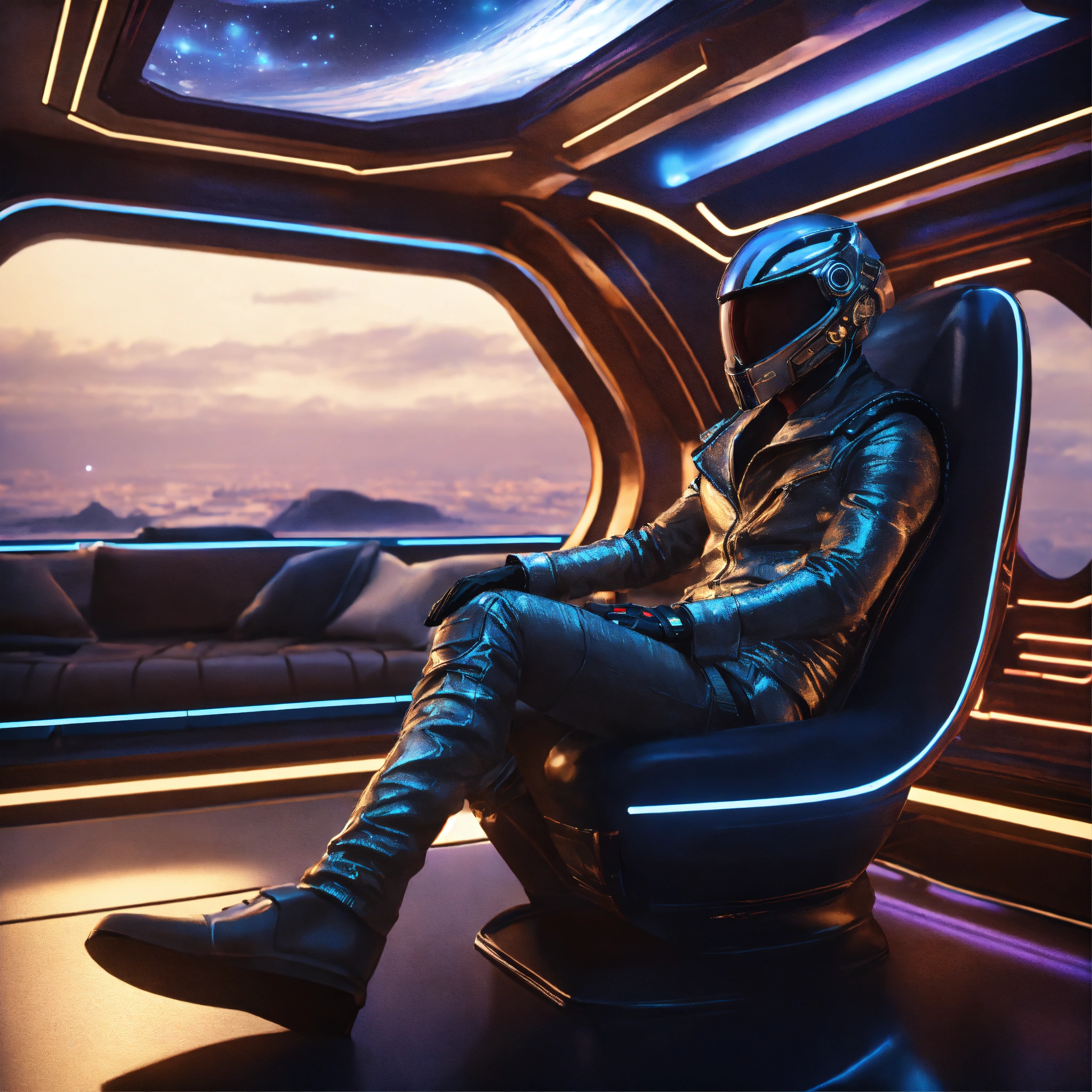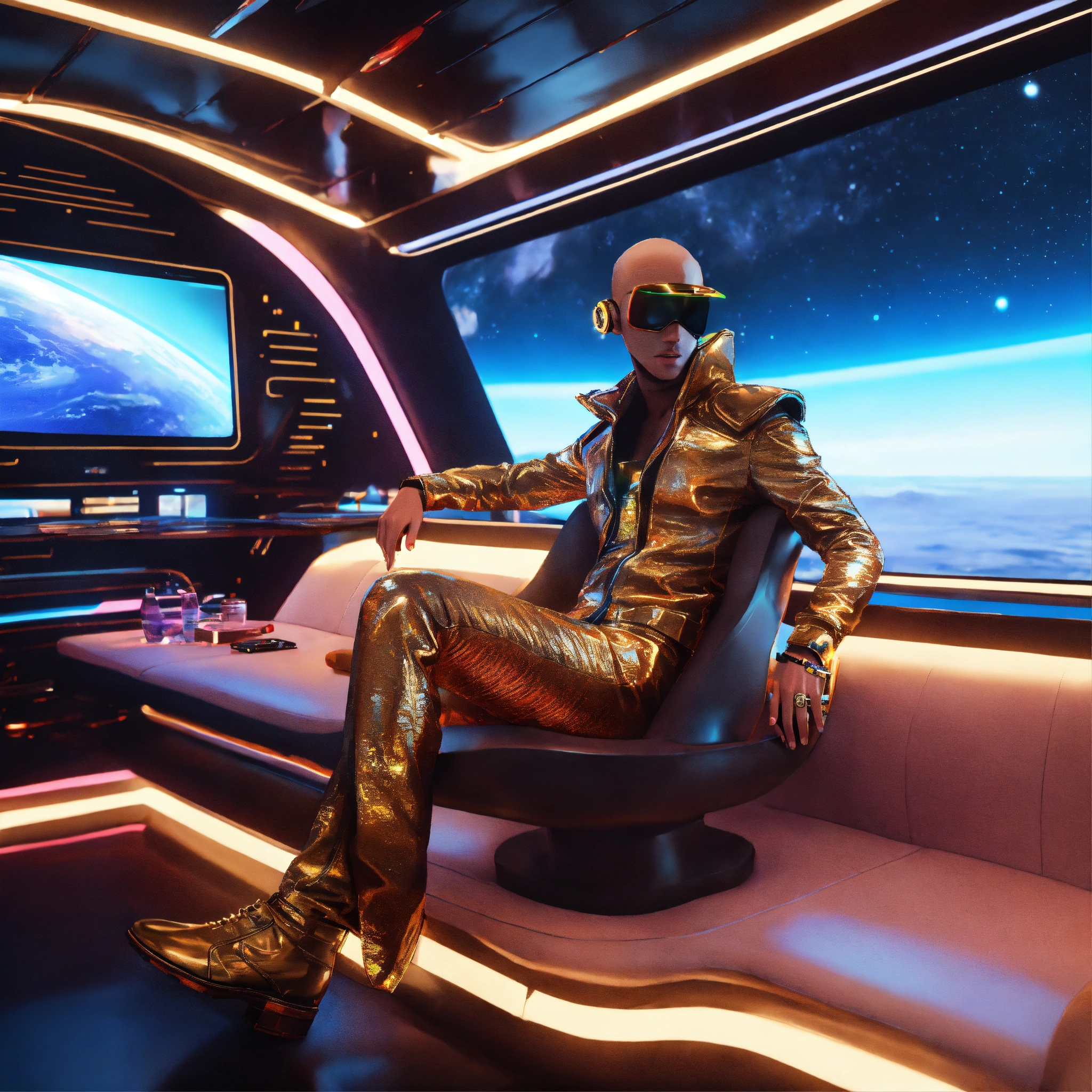Zoom out of a alien male rockstar wearing cool space fashion is lounging in a luxurious futuristic space yacht, realistic, futuristic, sci-fi, 8k, unreal engine
