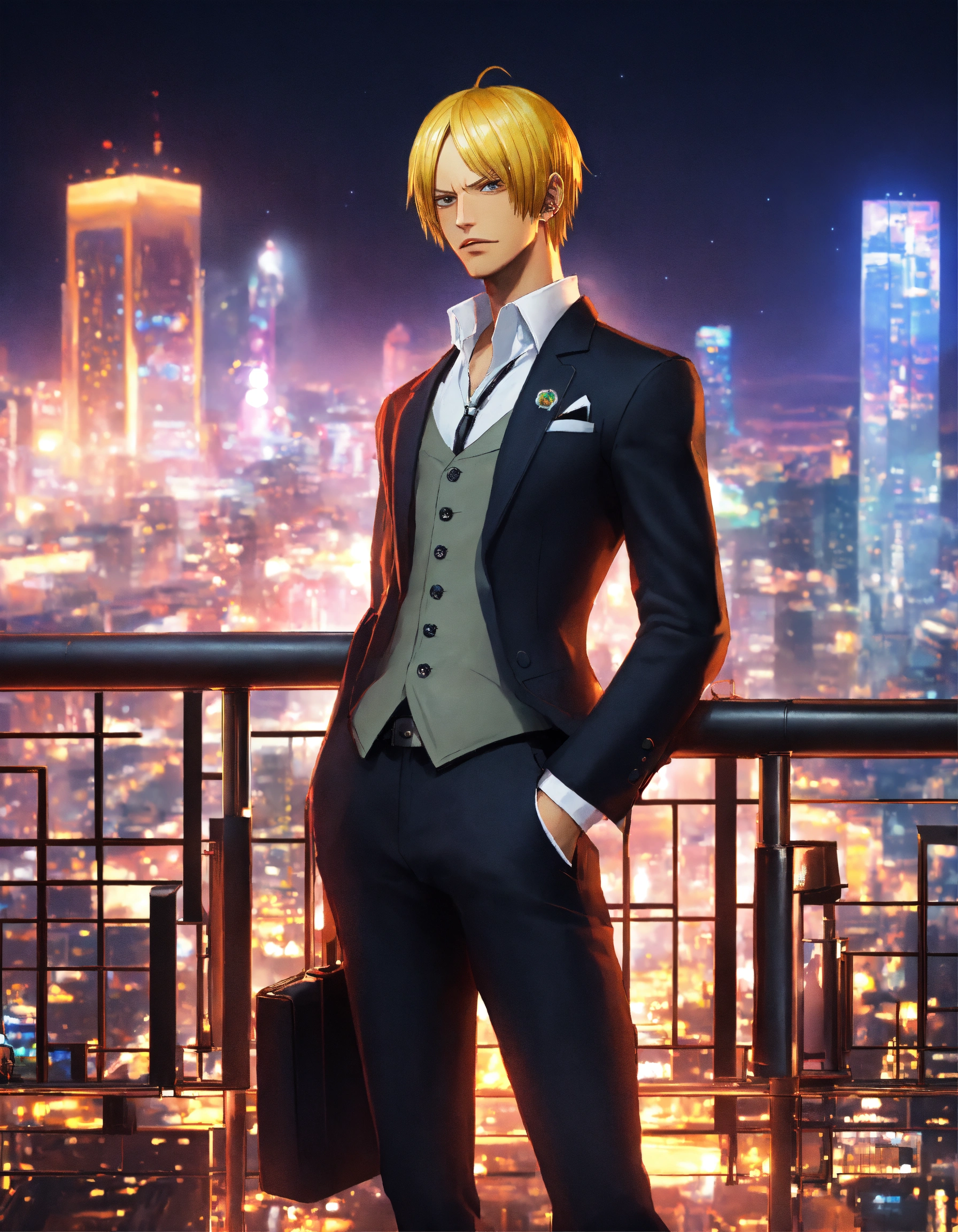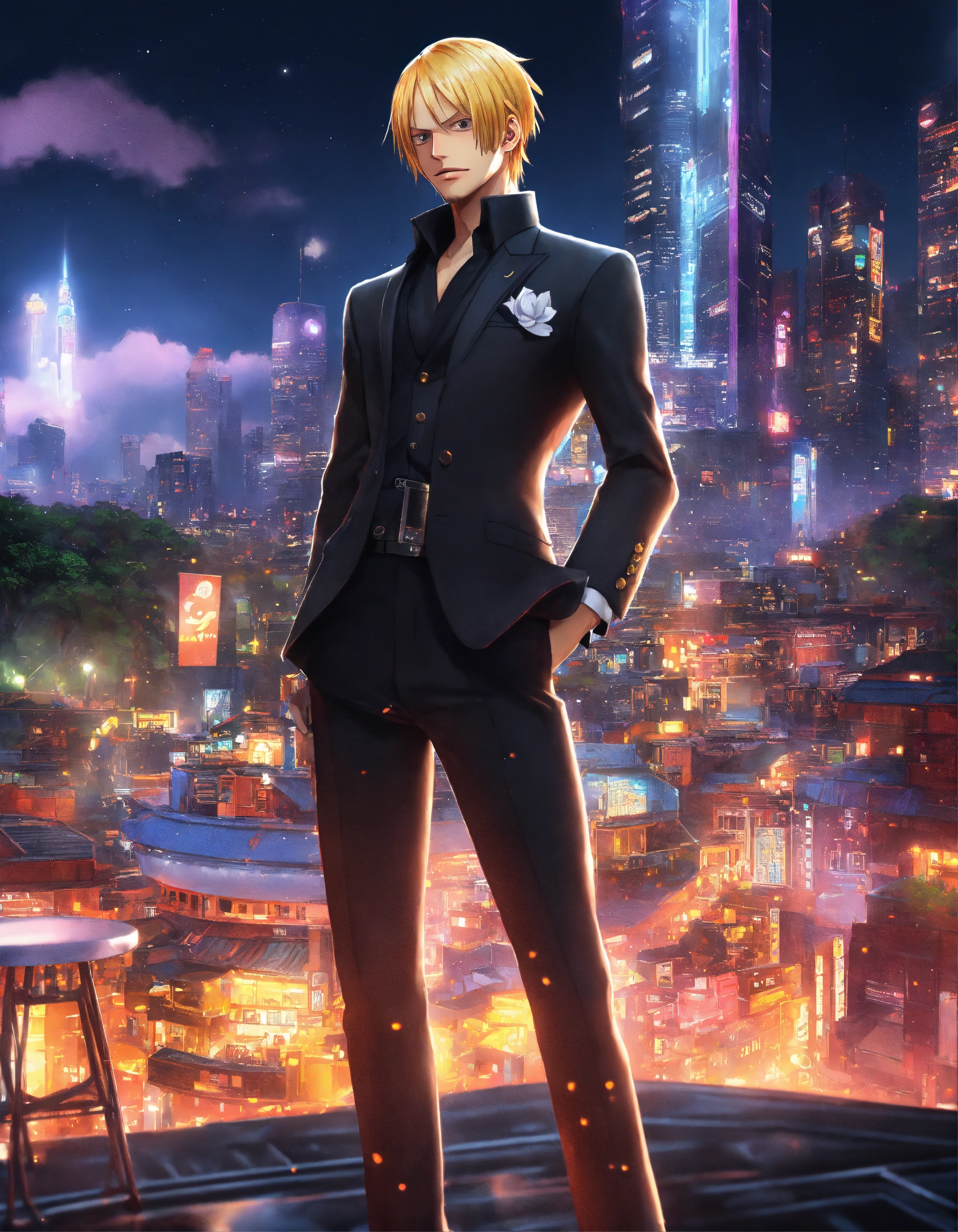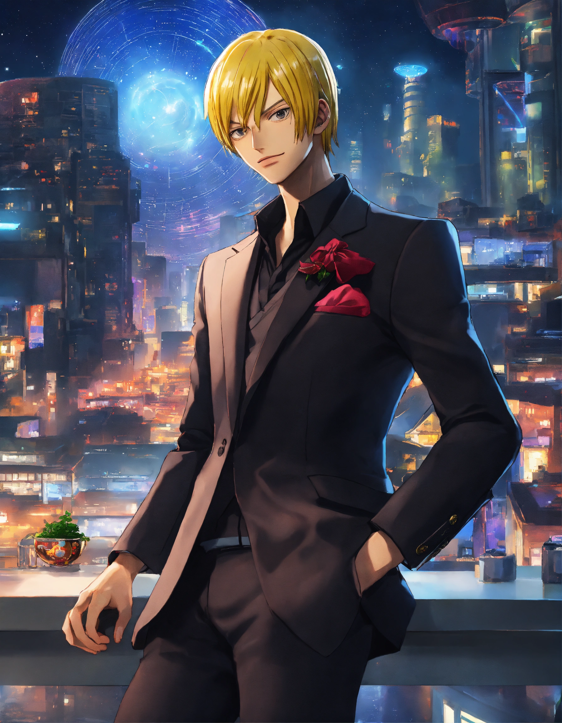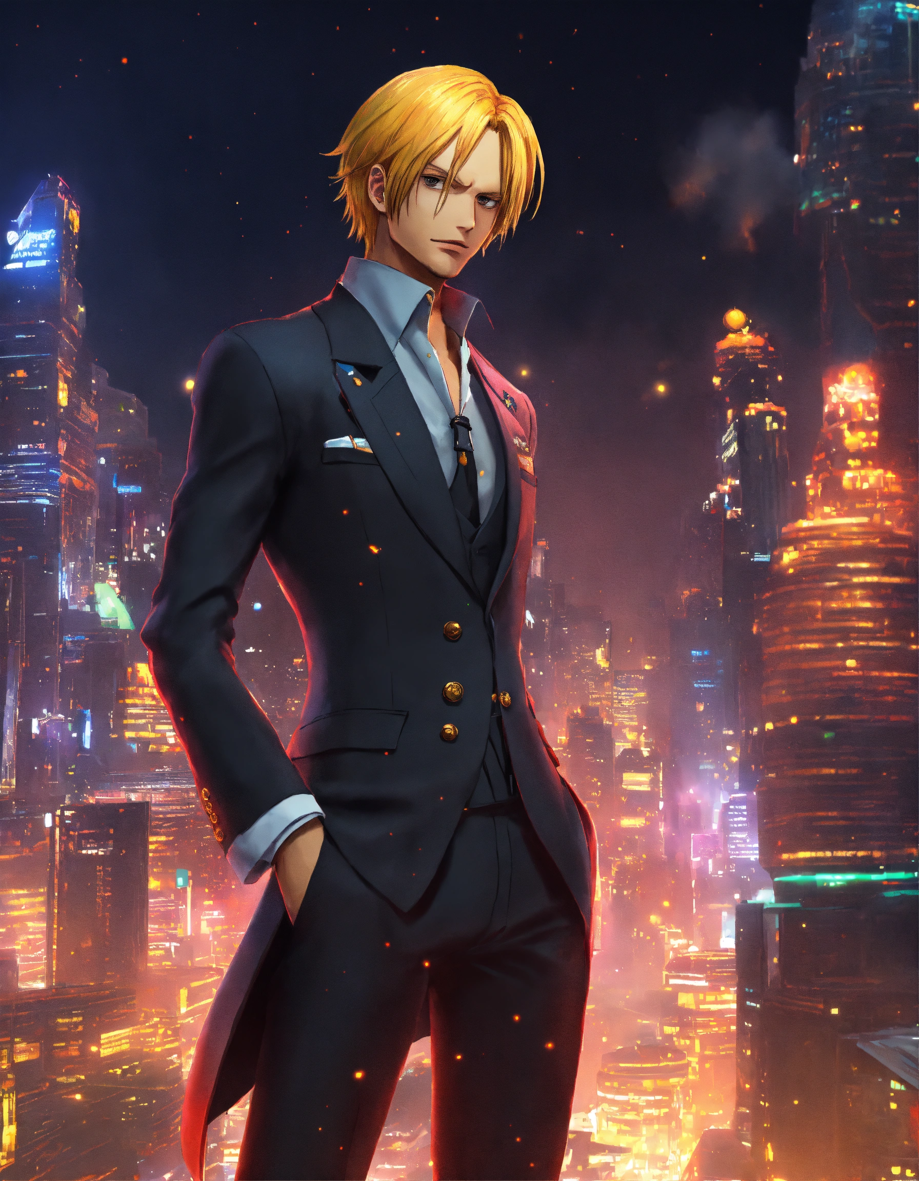 Design a modern-day cyberpunk version of sanji from one piece in the style of unreal 8d engine renders, keeping his original color palette from the anime. portray him as a modern-day chef in a sophisticated and dapper formal black suit, and show him smoking his lit cigarette. set him within a vibrant, futuristic cityscape characterized by gleaming skyscrapers and a cosmic, starlit background.