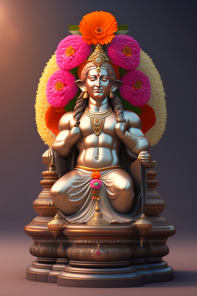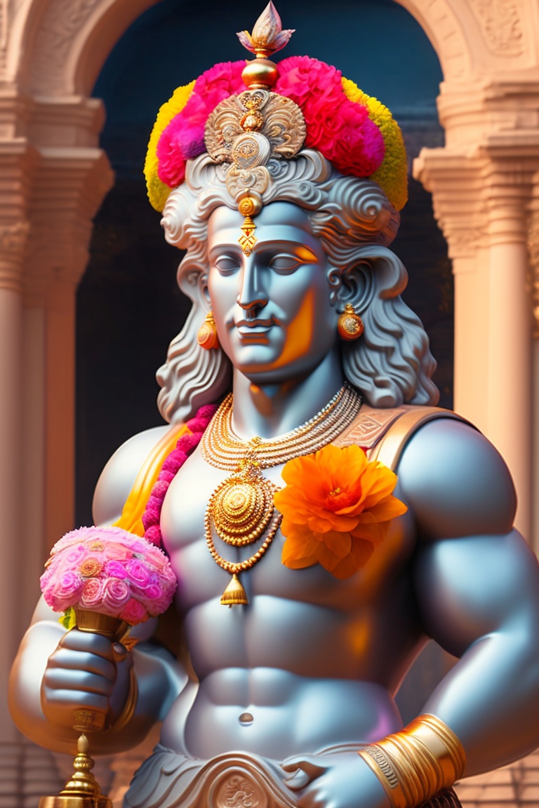 There is a statue of a man with flowers on his head, attractive male deity, hindu god, indian god, indian goddess of wealth, god shiva the destroyer, vishnu, lord shiva, an altar of a temple, shiva, attractive pagan male deity, an exhausted deity, ancient blacksmith god, cyborg hindu godbody, narasimha