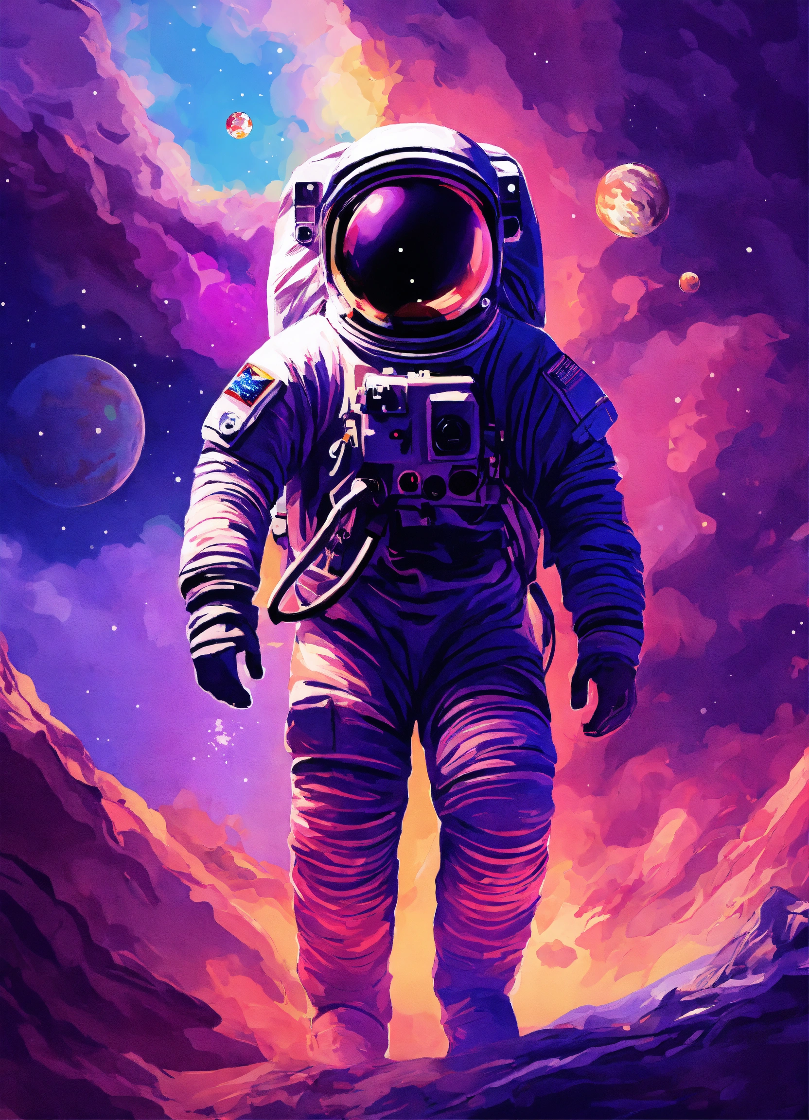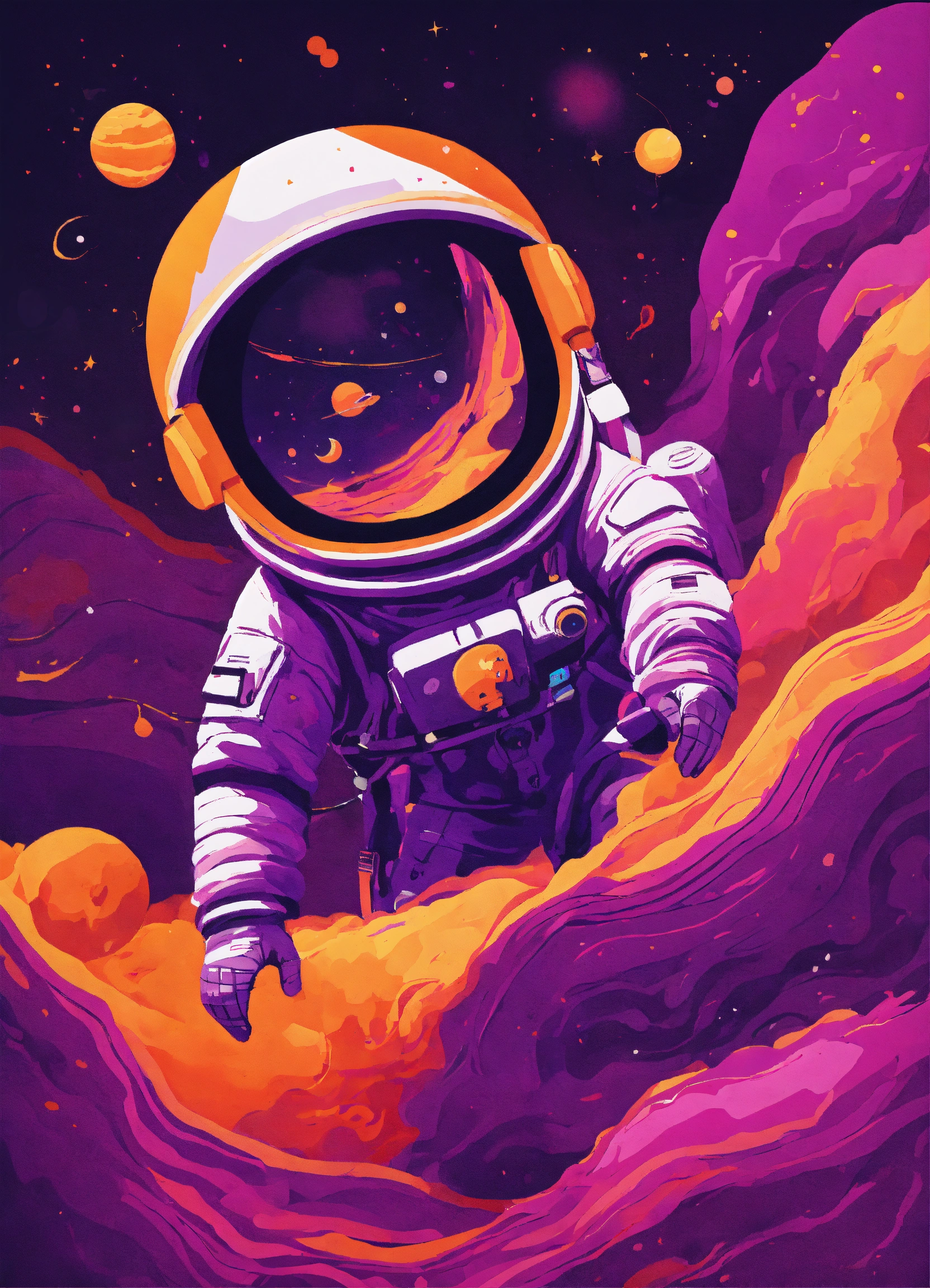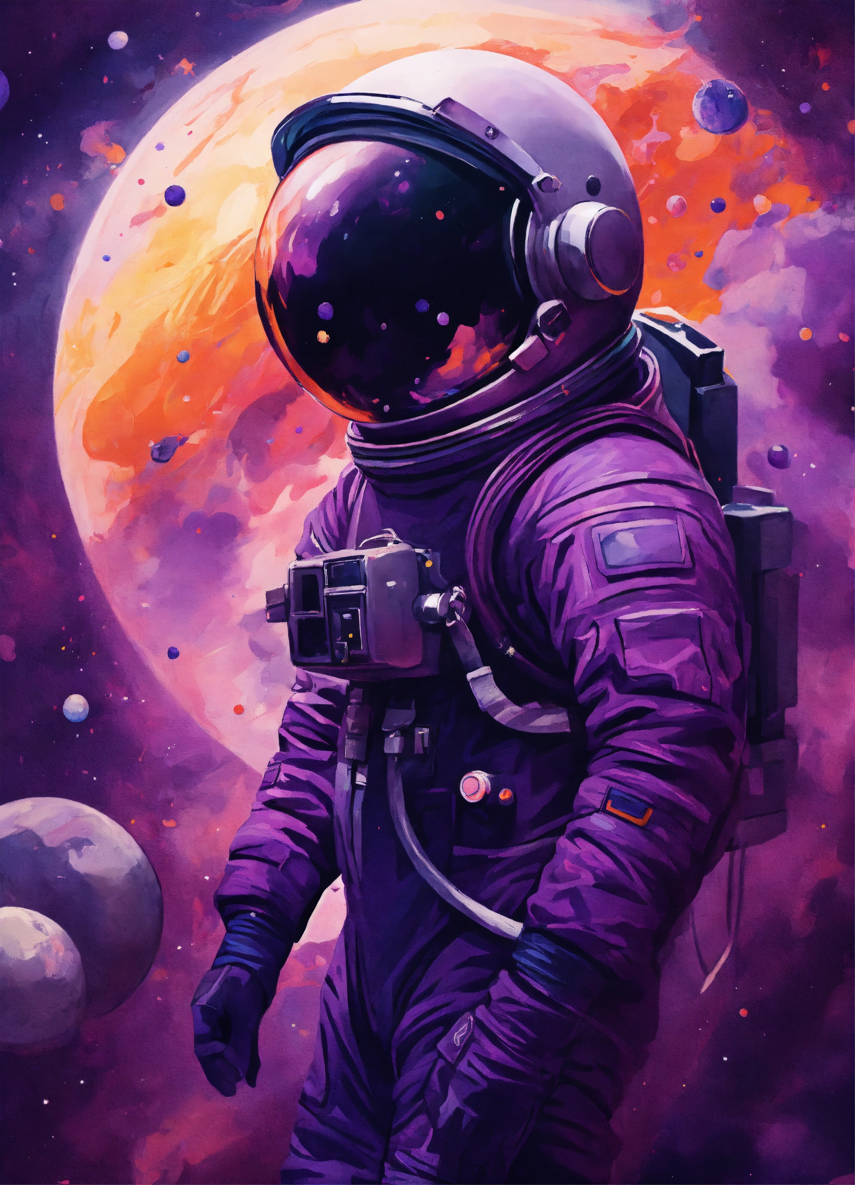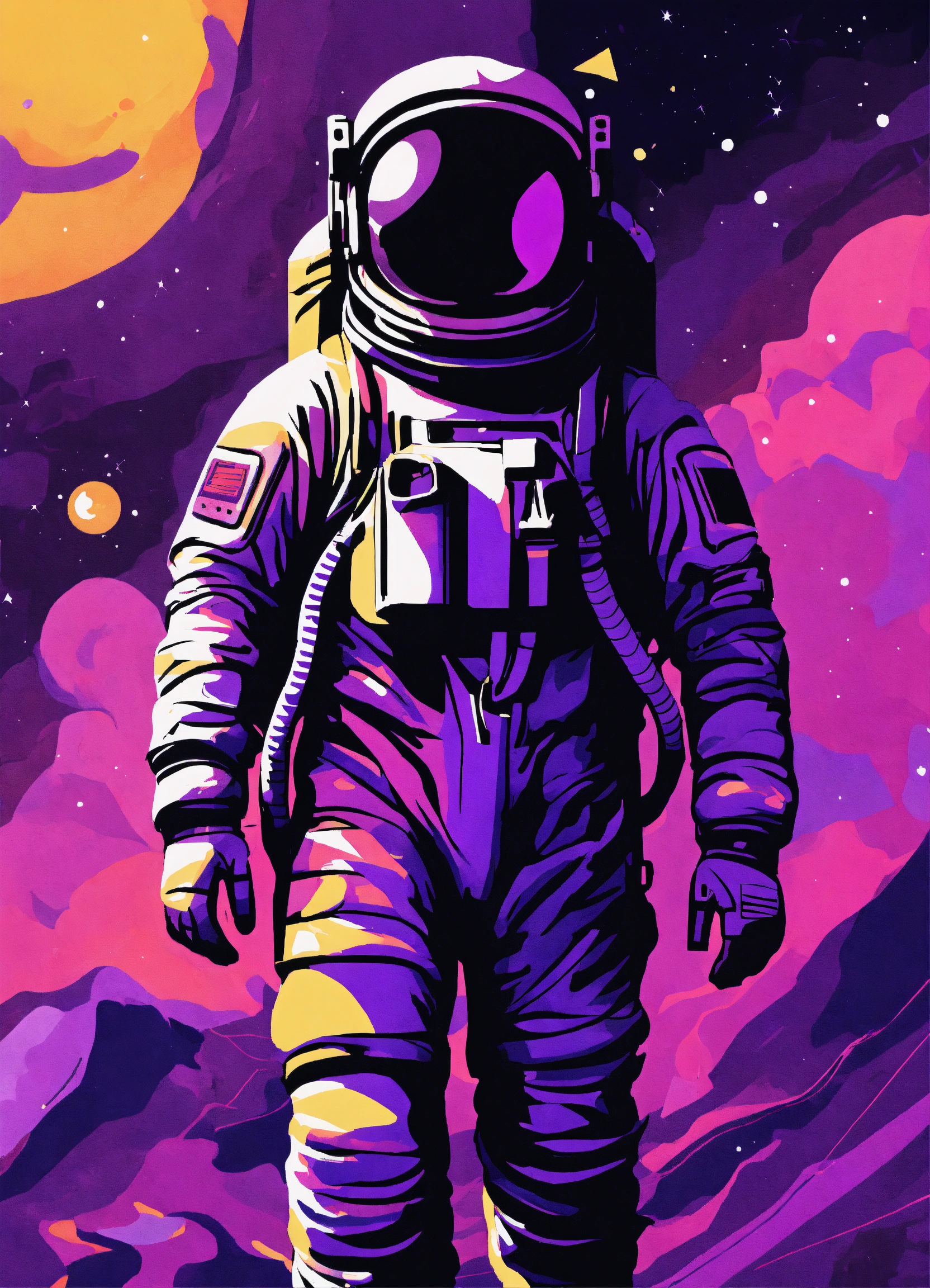 Abstract design of an adventurous astronaut with rich purple mural painting