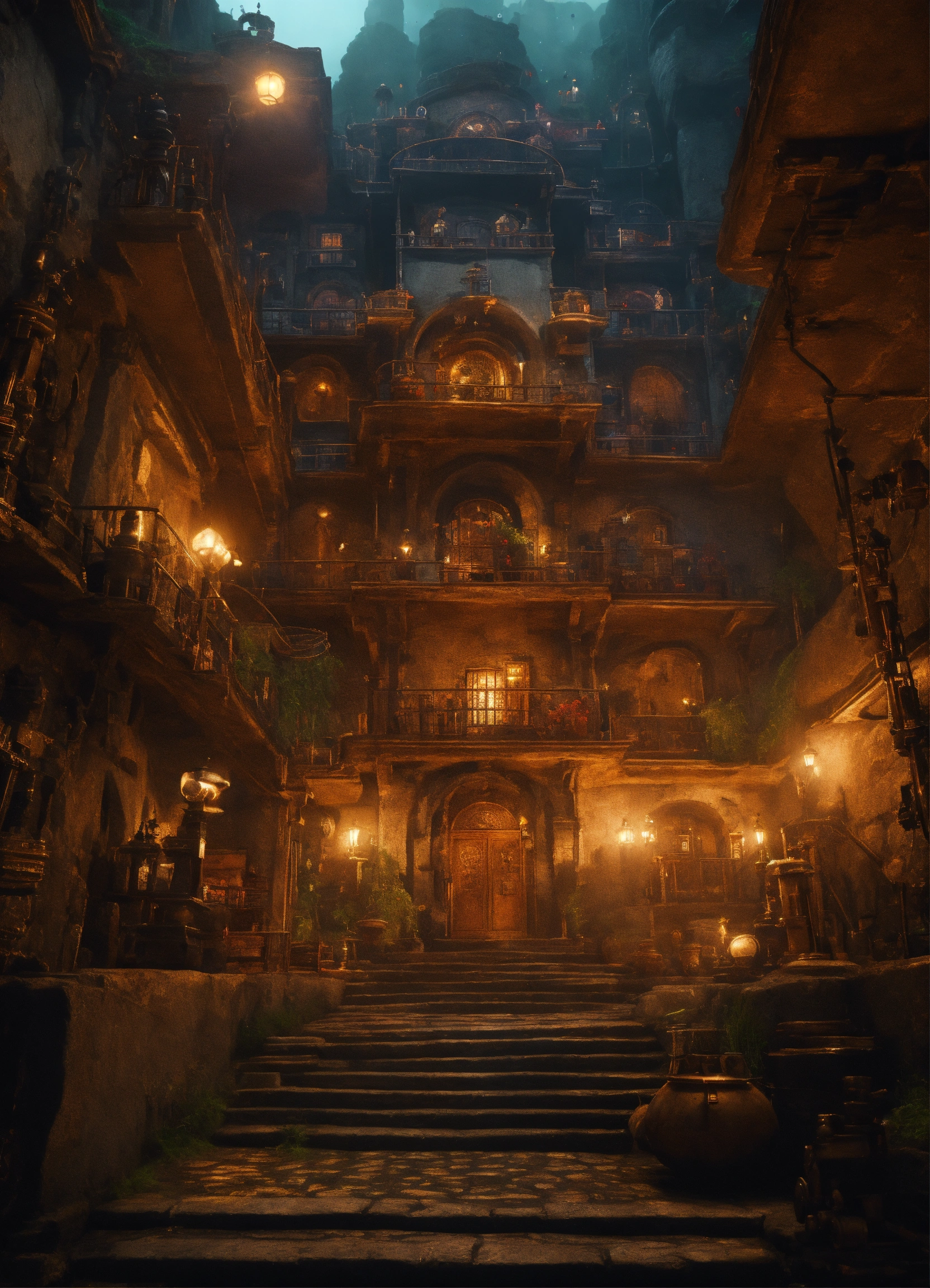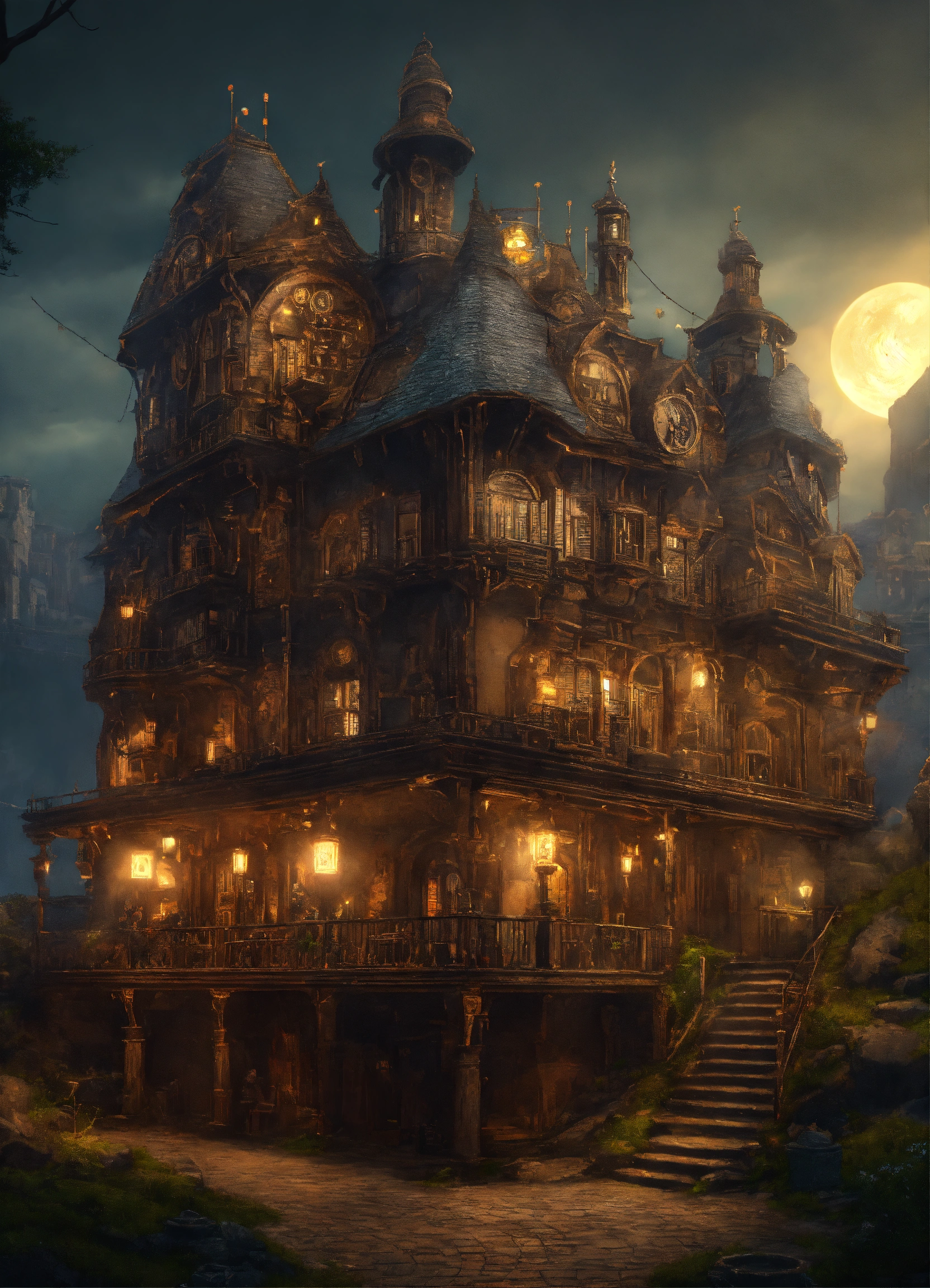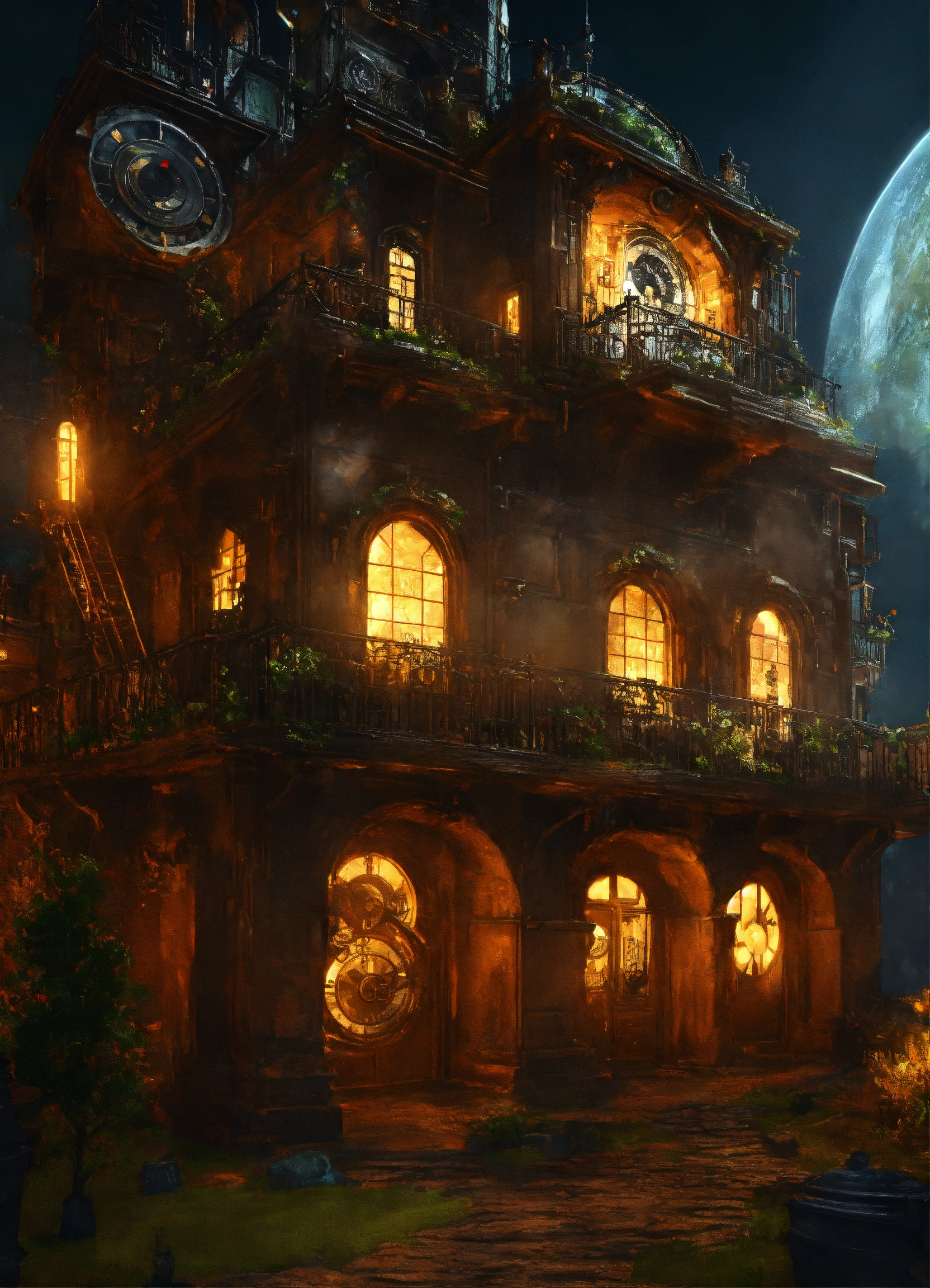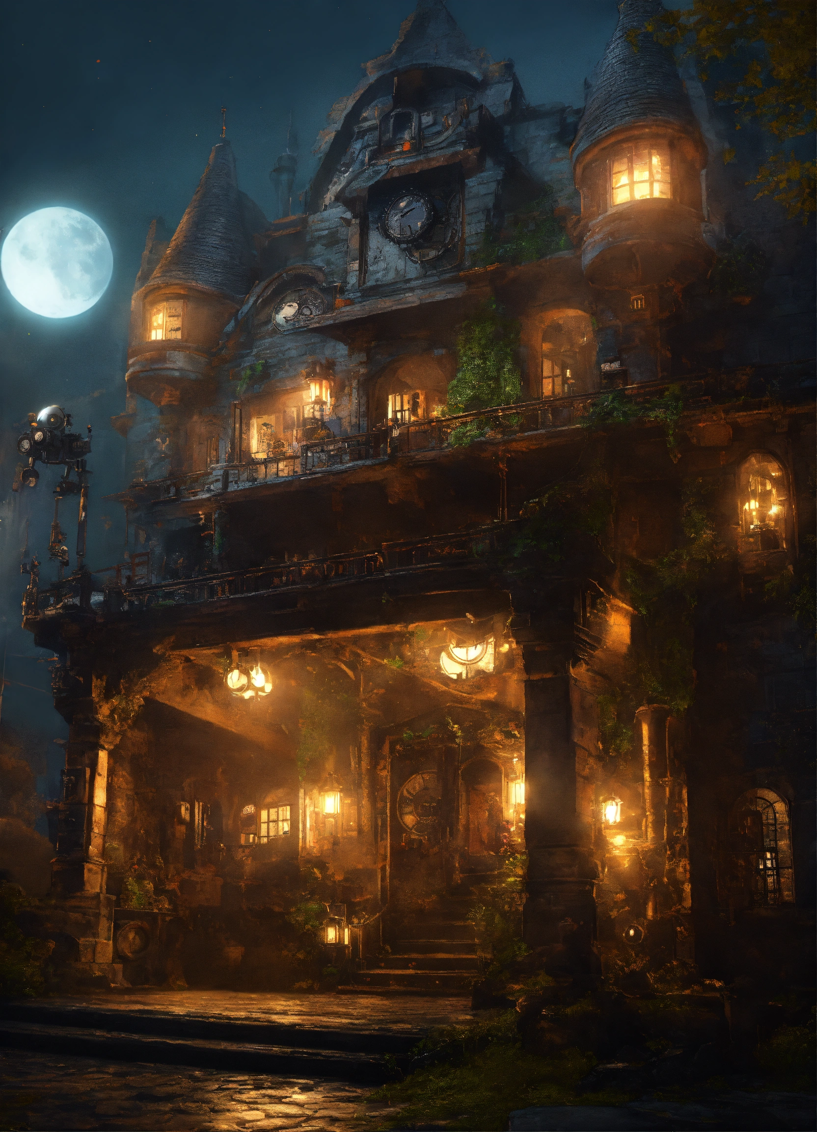 A clockwork mansion exterior. it is in an underground city. there are robots skulking outside. 4k, ultra-realistic. photo quality. fantasy.