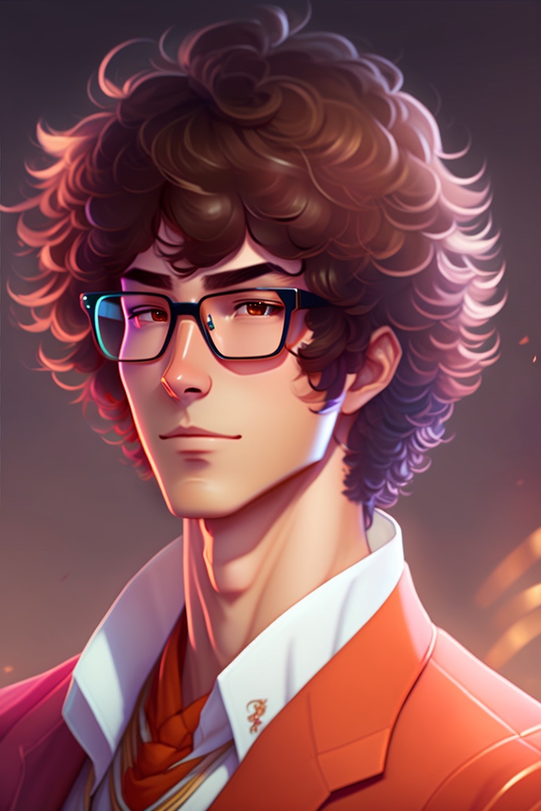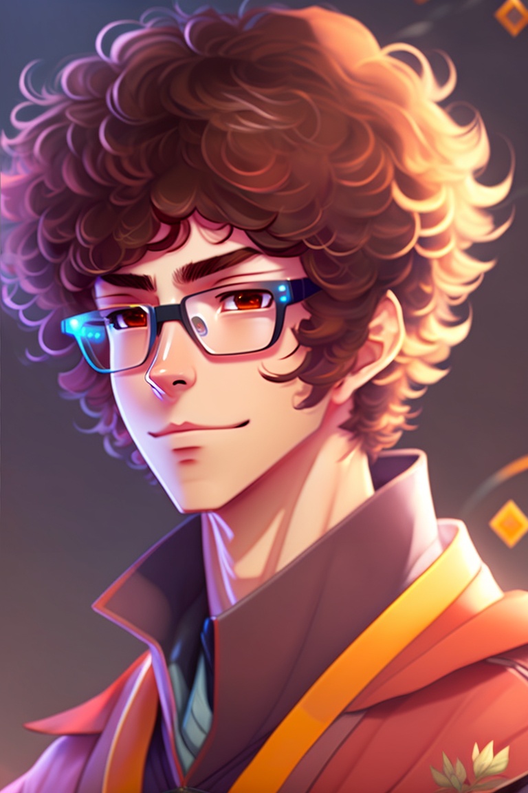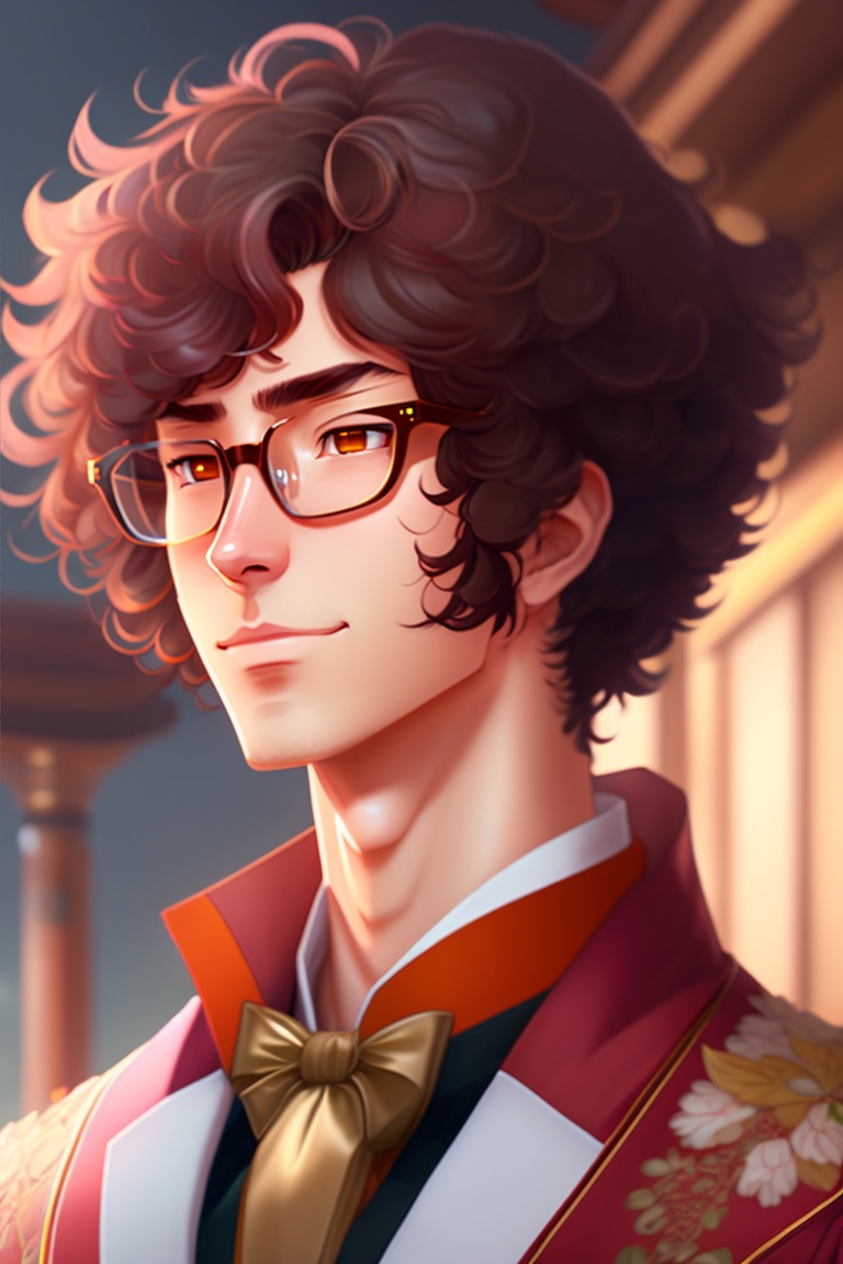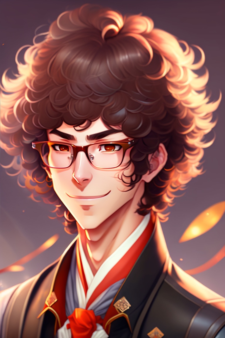 Anime guy with lush curly brown hair, brown eyes and glasses. he is wearing a traditional japanese kimono.