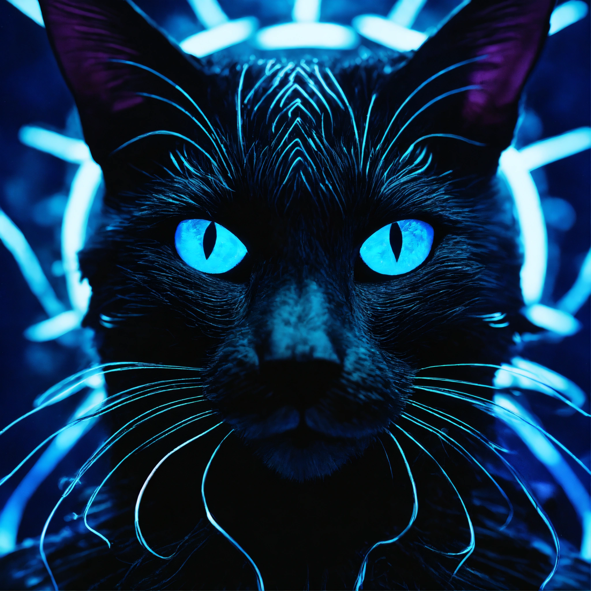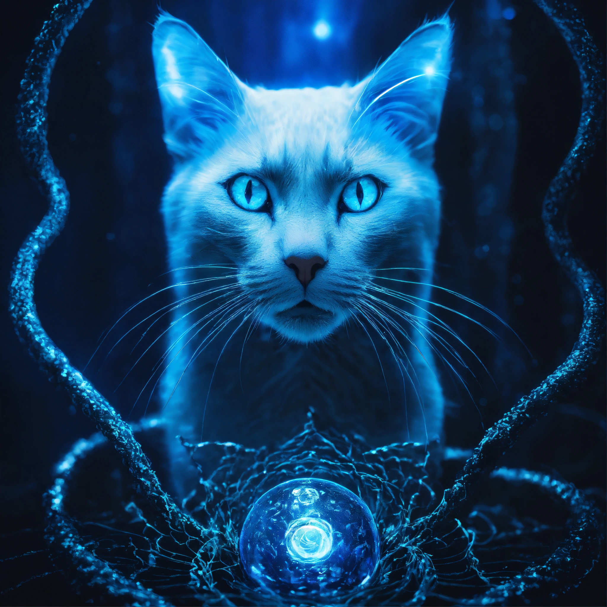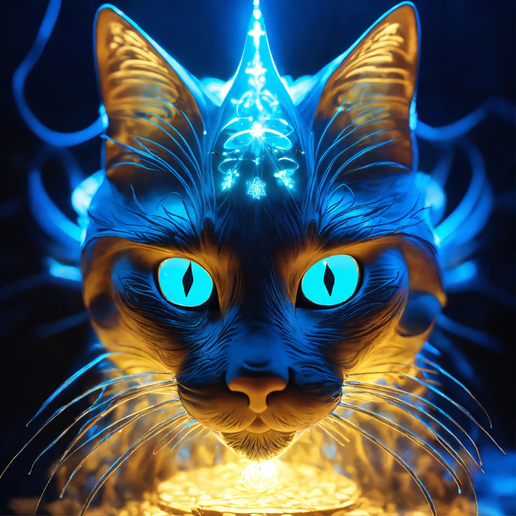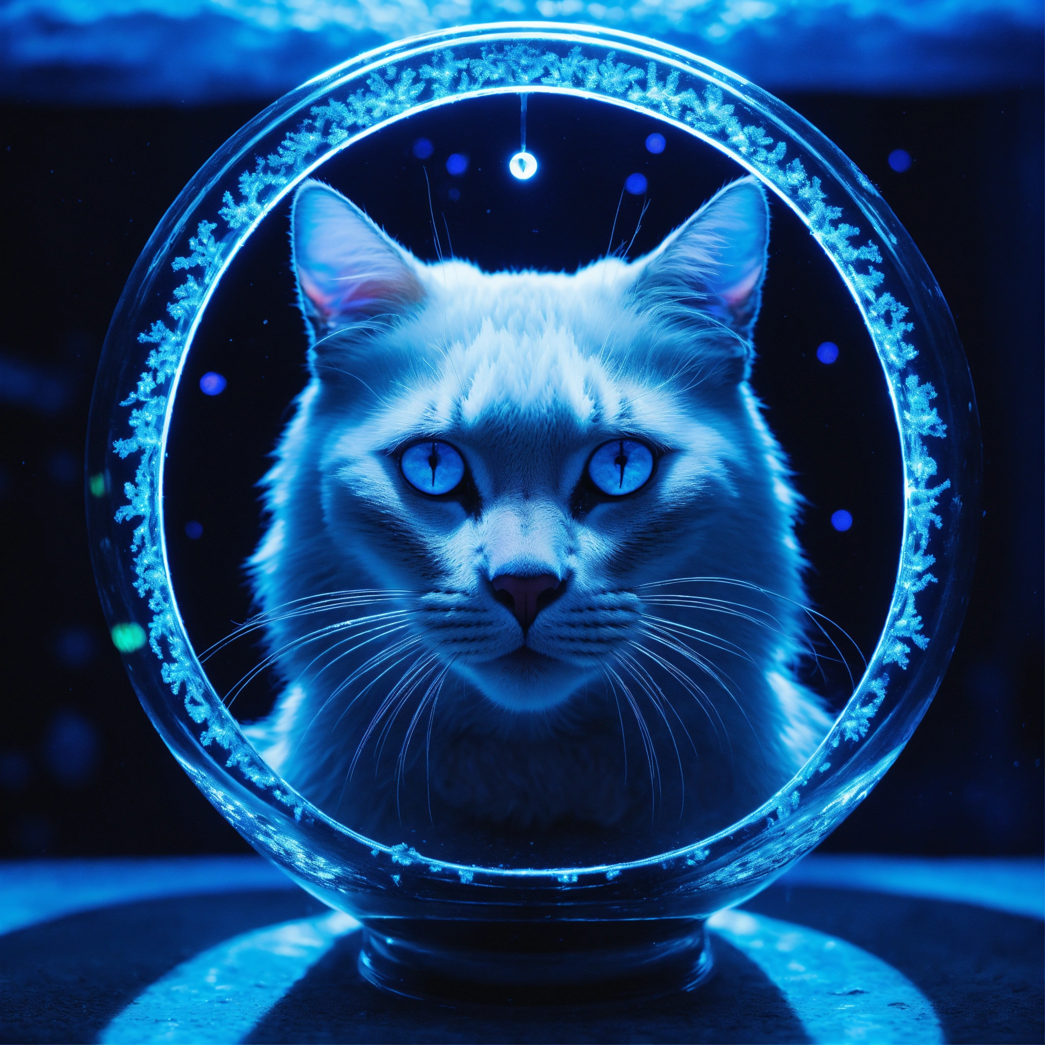 Underwater portrait photography, long exposure, powerful smiley mystic white and black cat face portrait facing front, blue eyes. front view. front portrait, no angle. backlit. blue neon glow. angelic face. sacred geometry patterns on the face, in the style of disney, pixar, tim burton, chronicles of narnia, beauty and the beast, and peter pan. enchanting glowing orb aura. fractal, volumetric lighting, backlit. the power of the god. god-like, spirit-like.