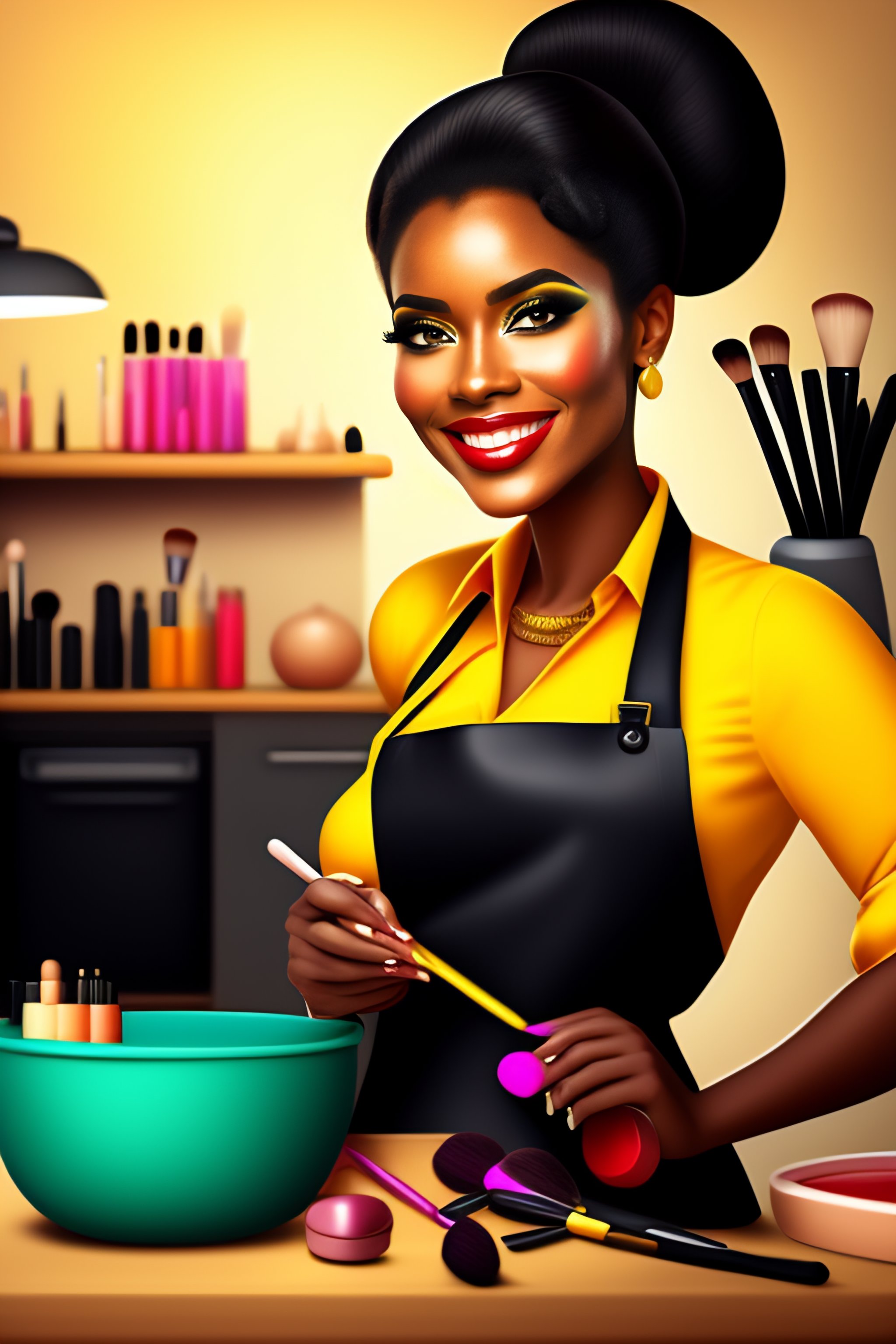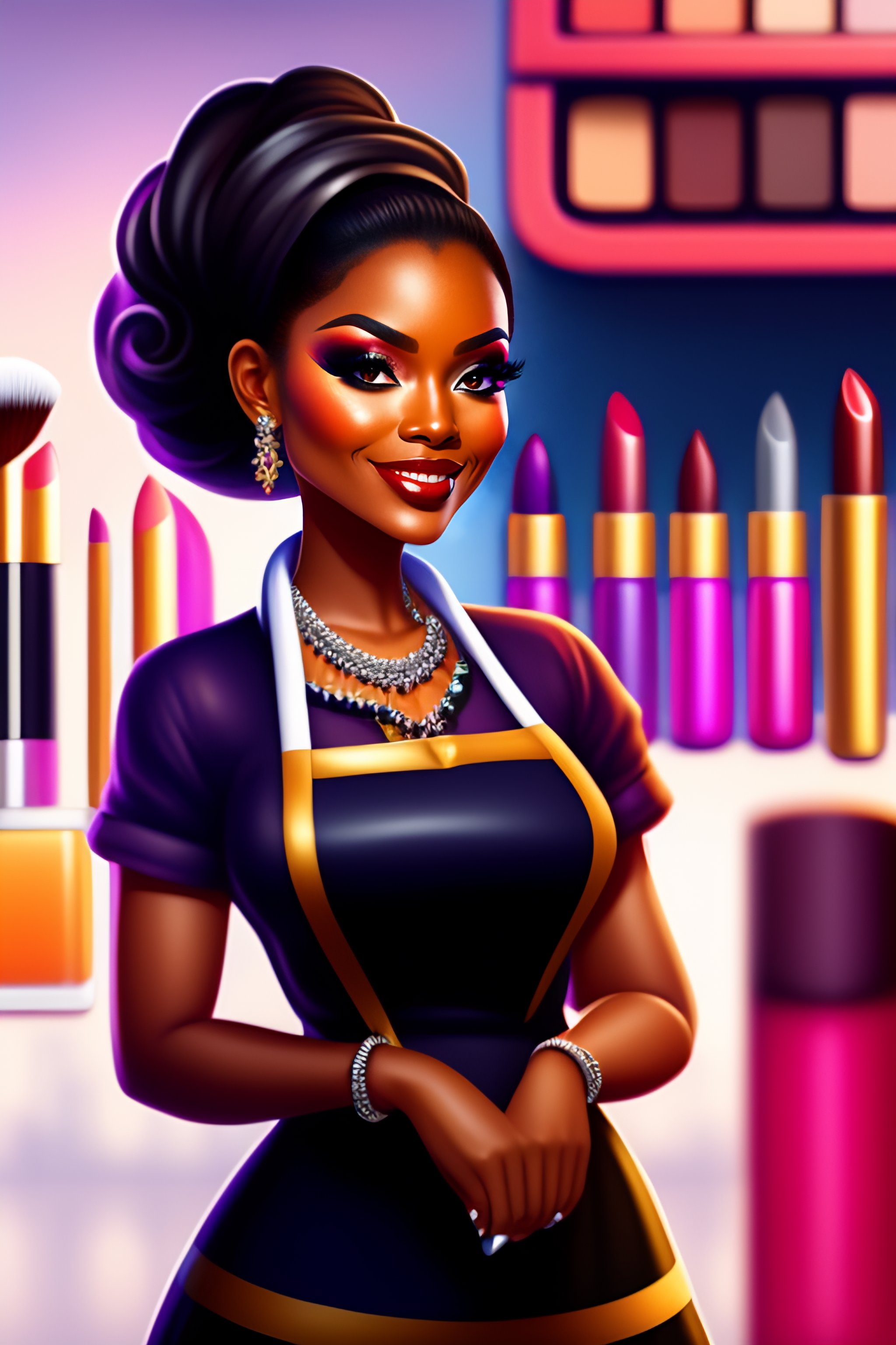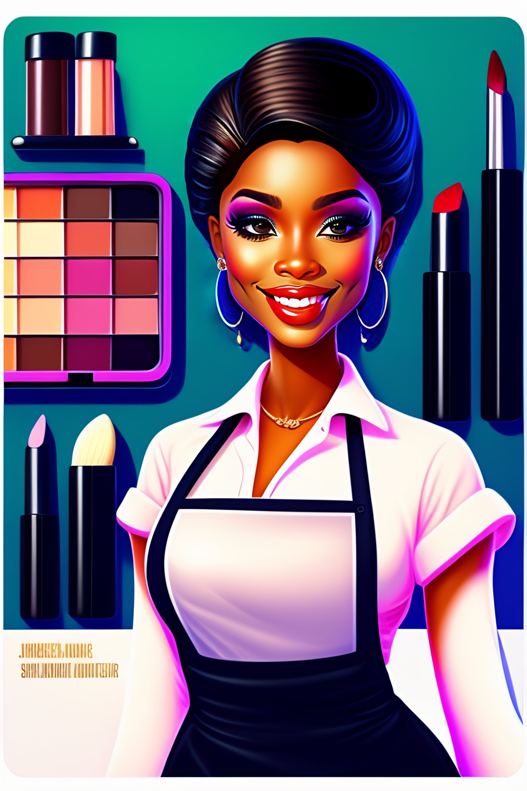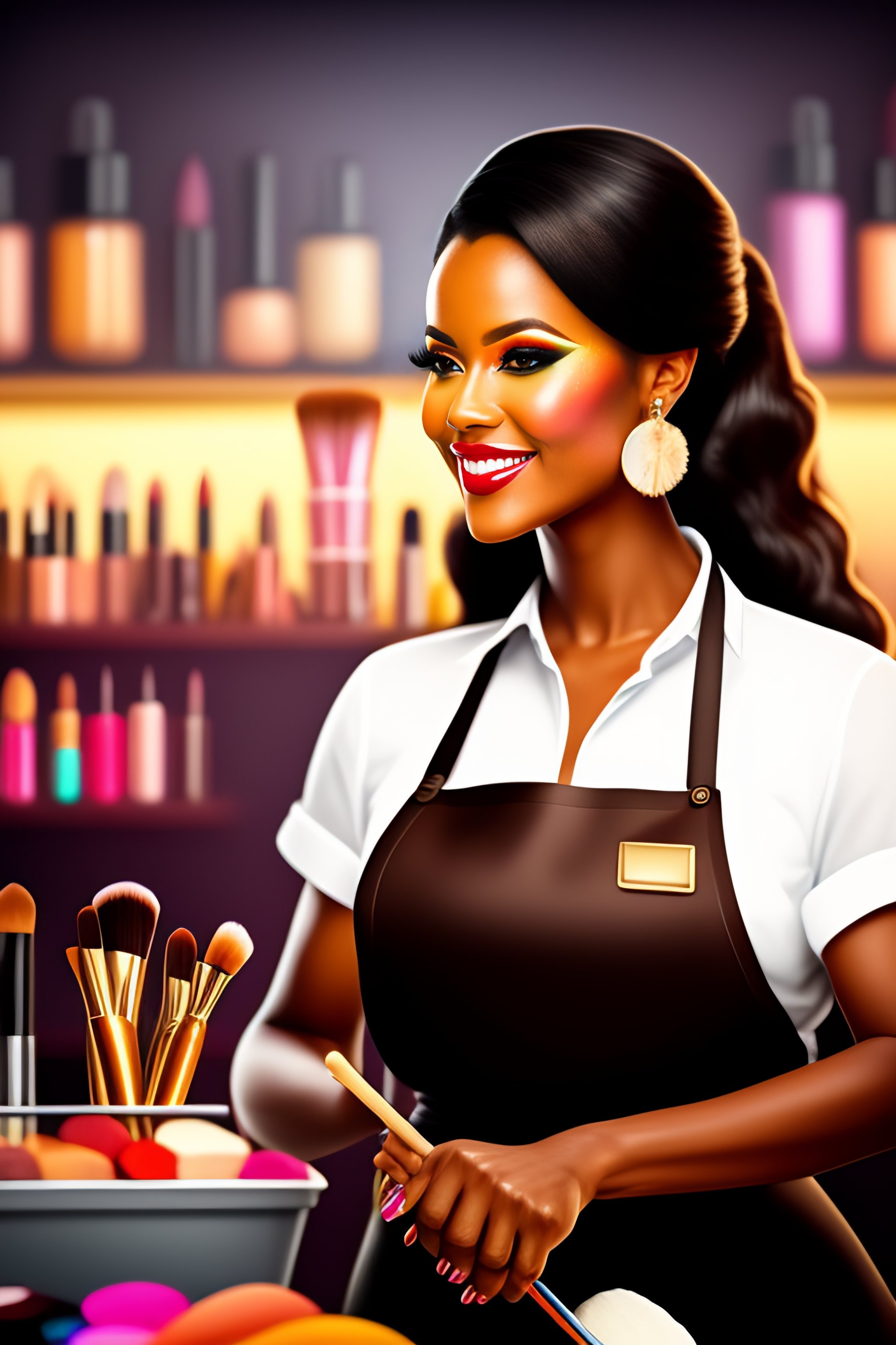 Makeup artist, makeup, lipstick, woman apron, brushes, standing, smiling brown skin, doing makeup cartoon extremely detailed 11k