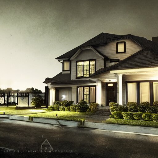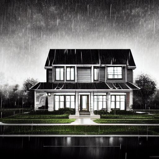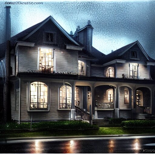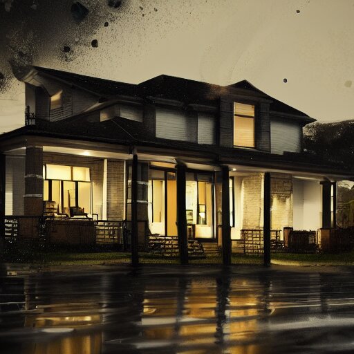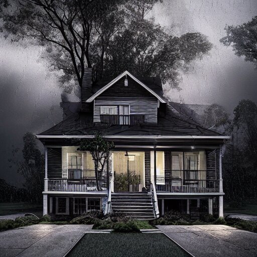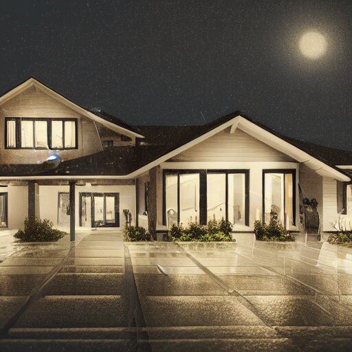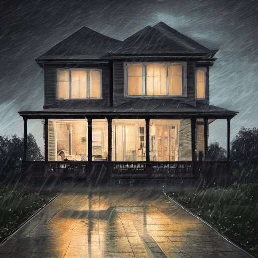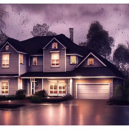 Double story suburban house, it is raining, night time, peaceful atmosphere, moody lighting, digital art, highly detailed, high contrast, beautiful lighting, award winning, trending on art station, photorealistic, 8k