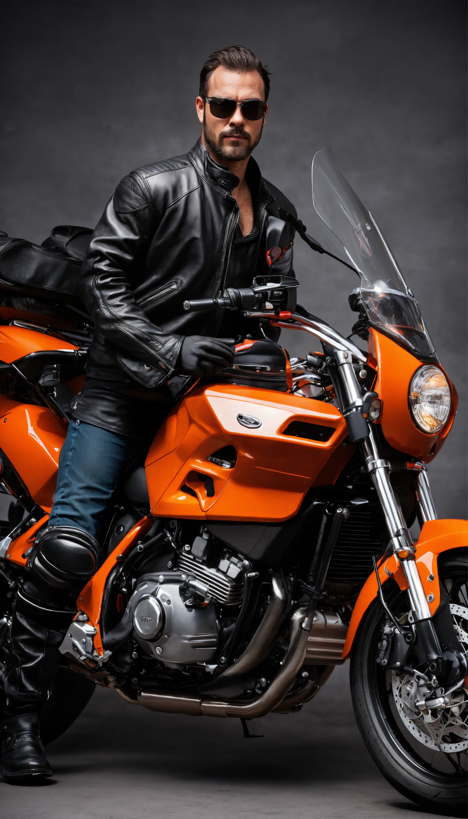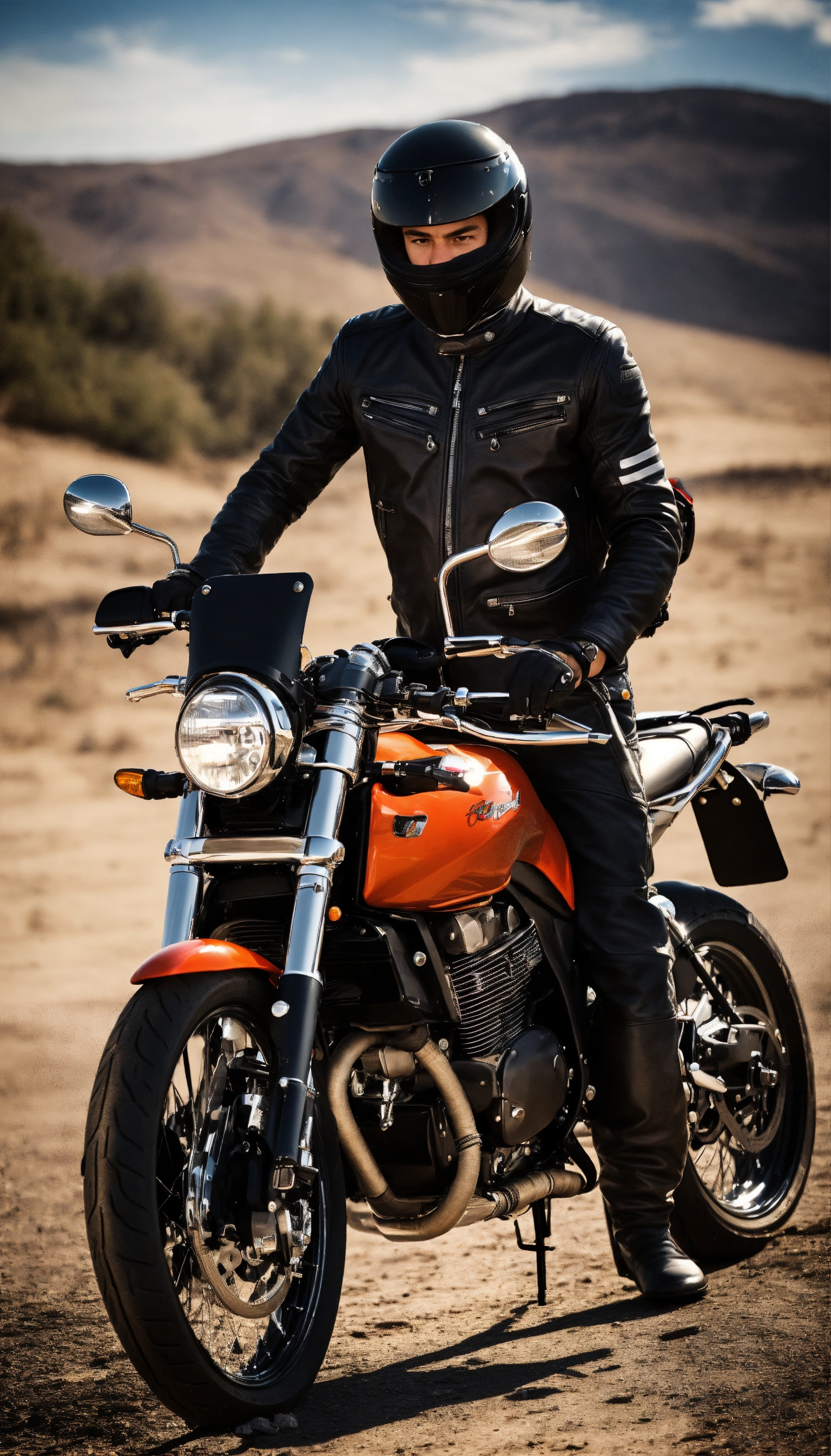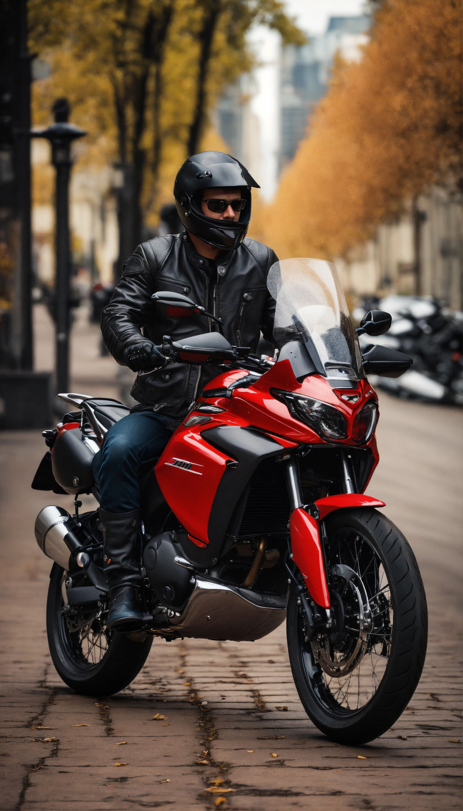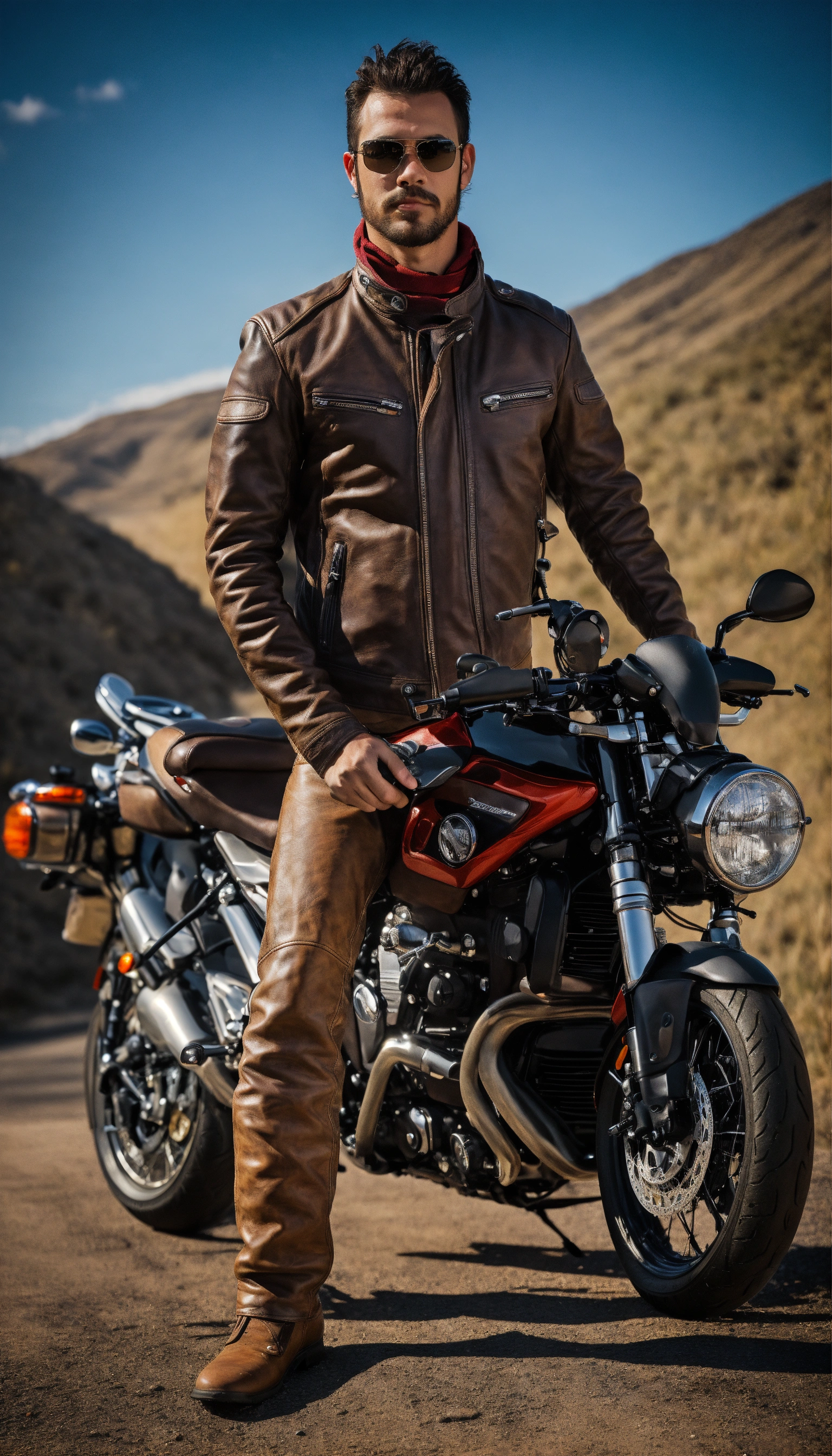 "generate images of a man dressed as a motorcyclist with a motor-touring style. the outfit should include a leather or cordura jacket, typical of motorcycle travelers or tourers. show variations of this style with different poses and backgrounds."