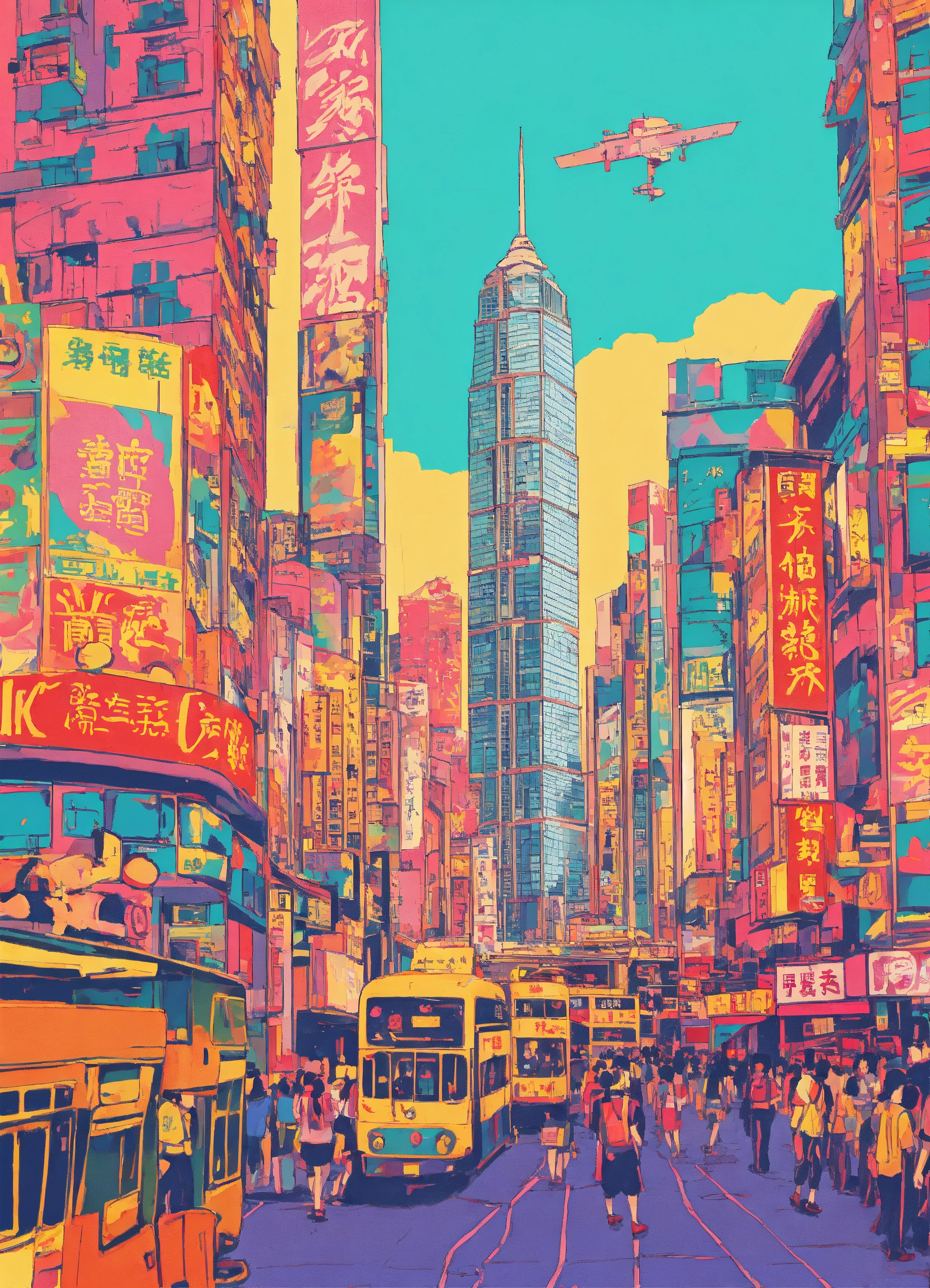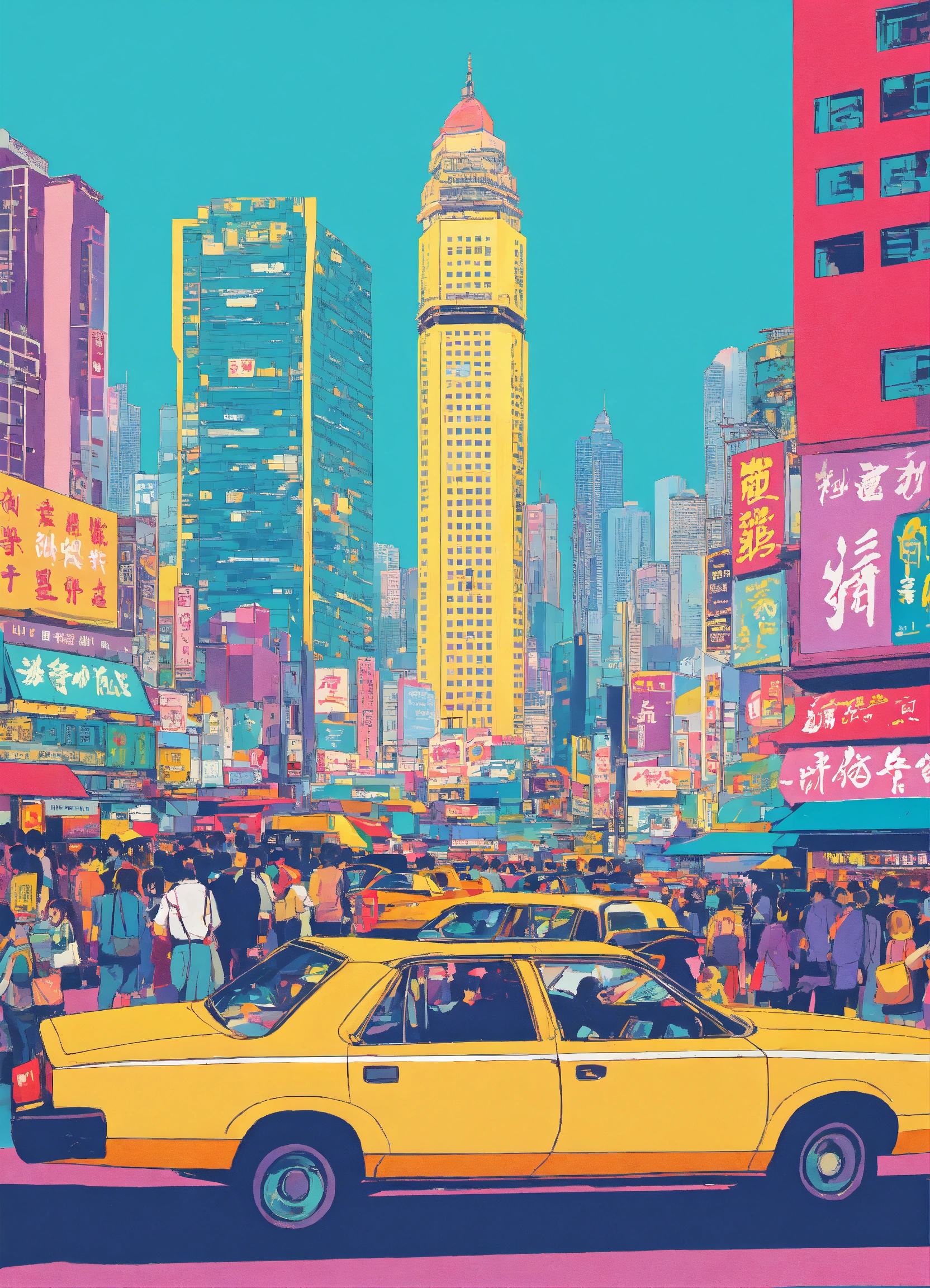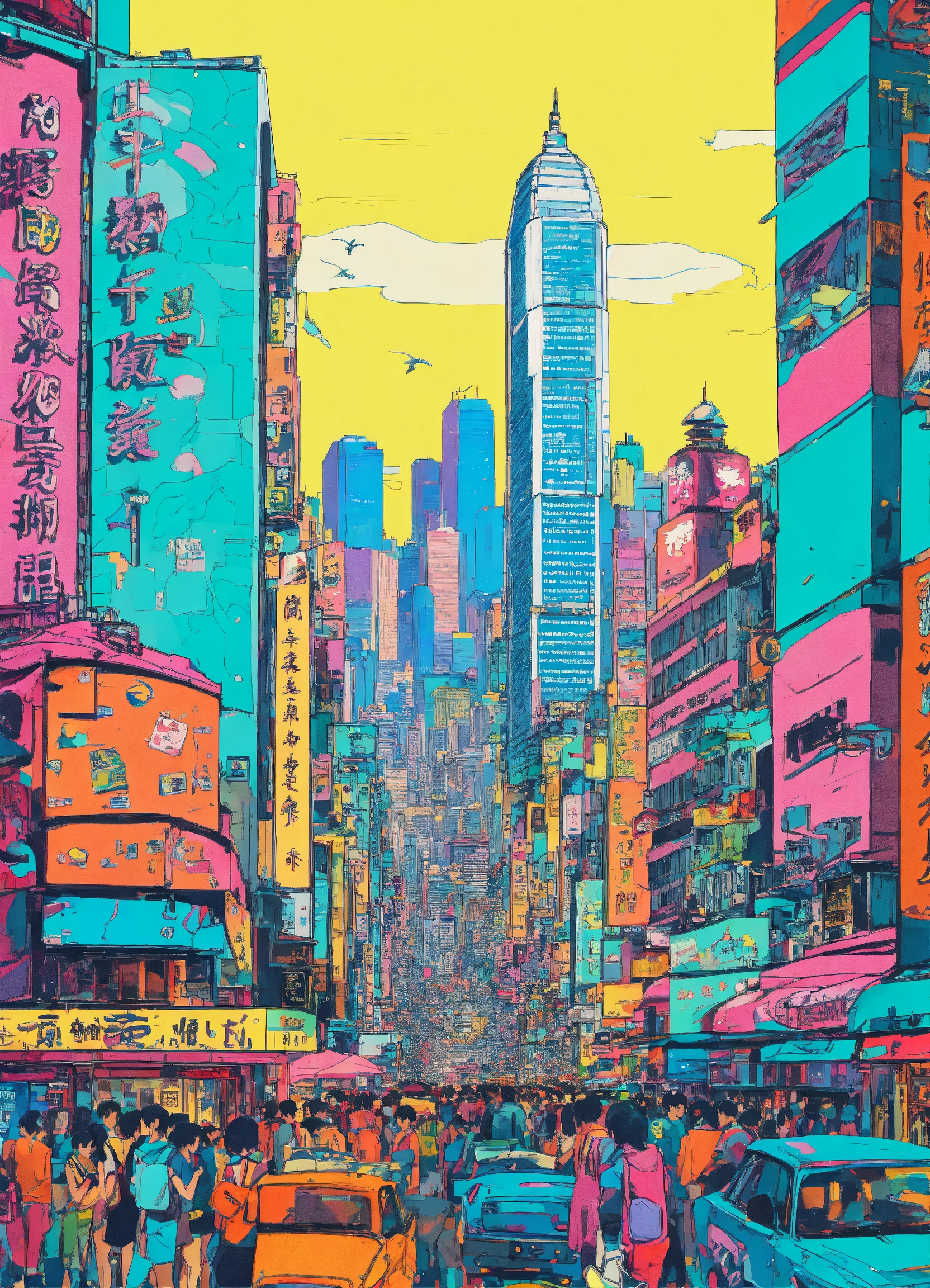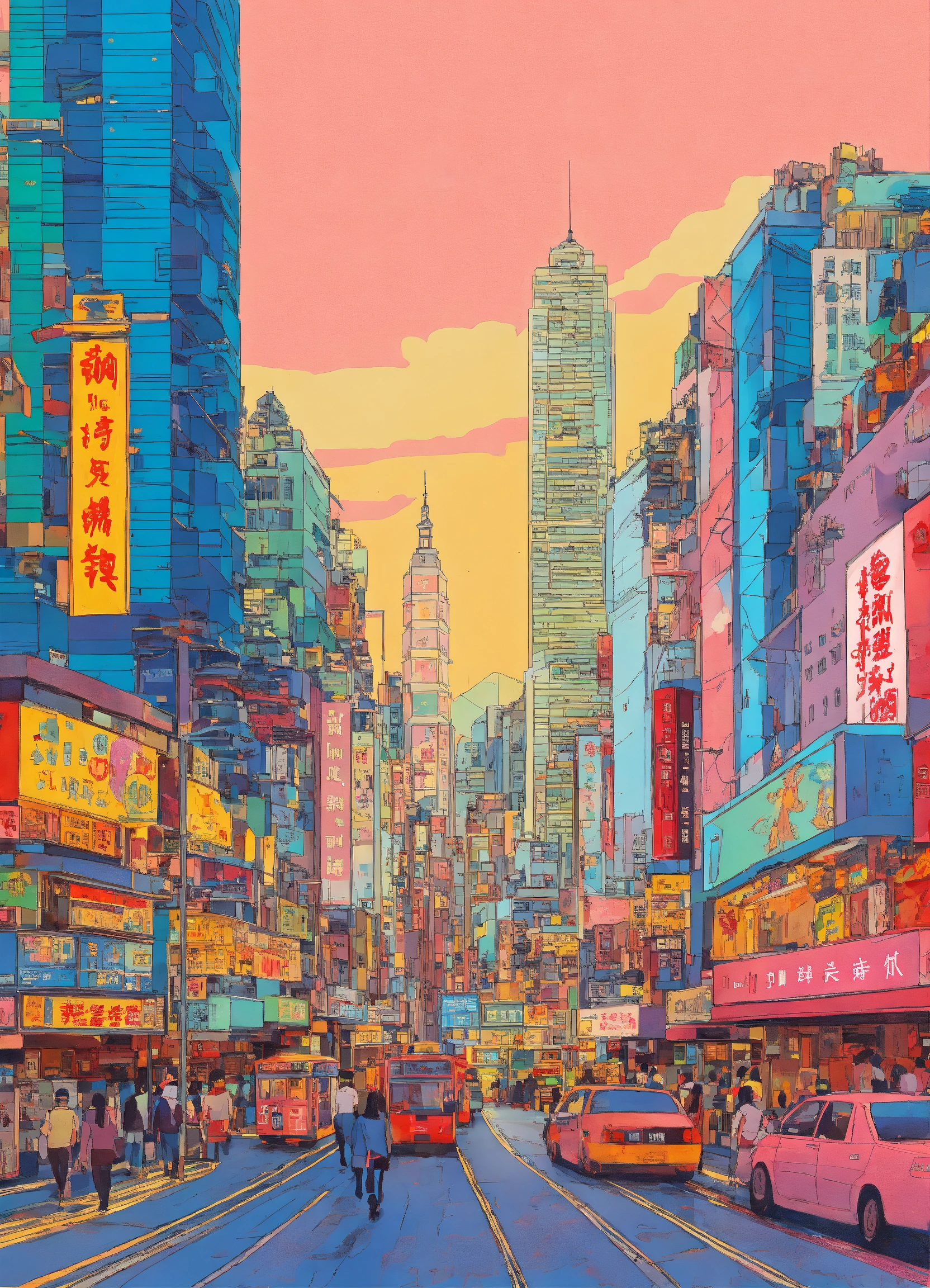 Hong kong, kowloon, tsim sha tsui, nathan road, cyber city, victoria harbour background, with kowloon clock tower aside, skyscrapers background, cityscape, vibrant, pastel colour, crowded, prosperous, pop art style