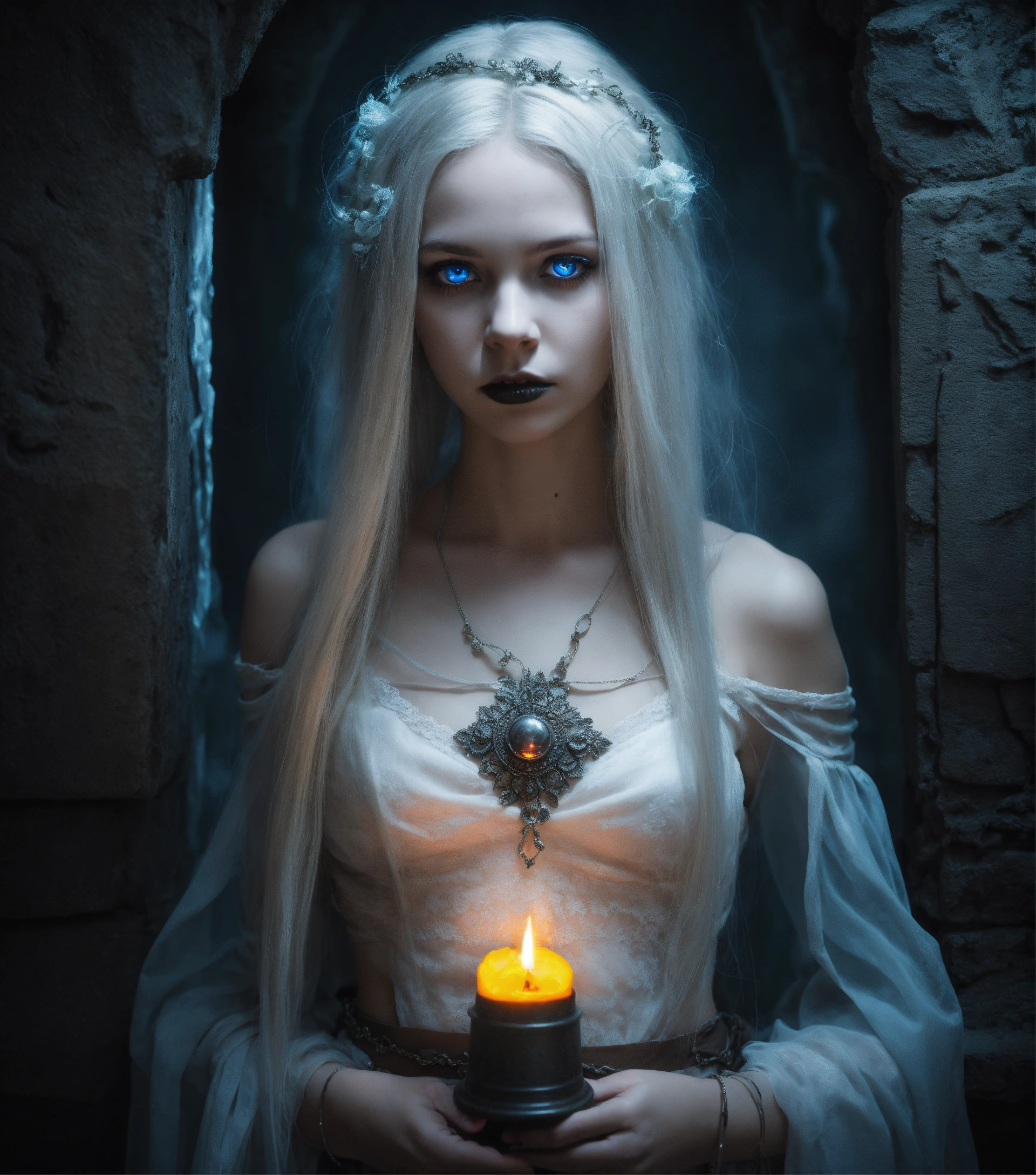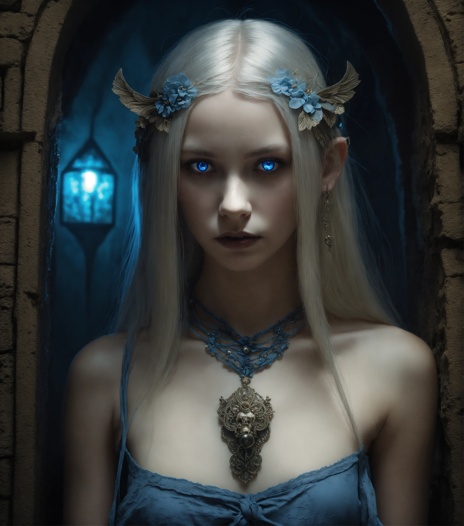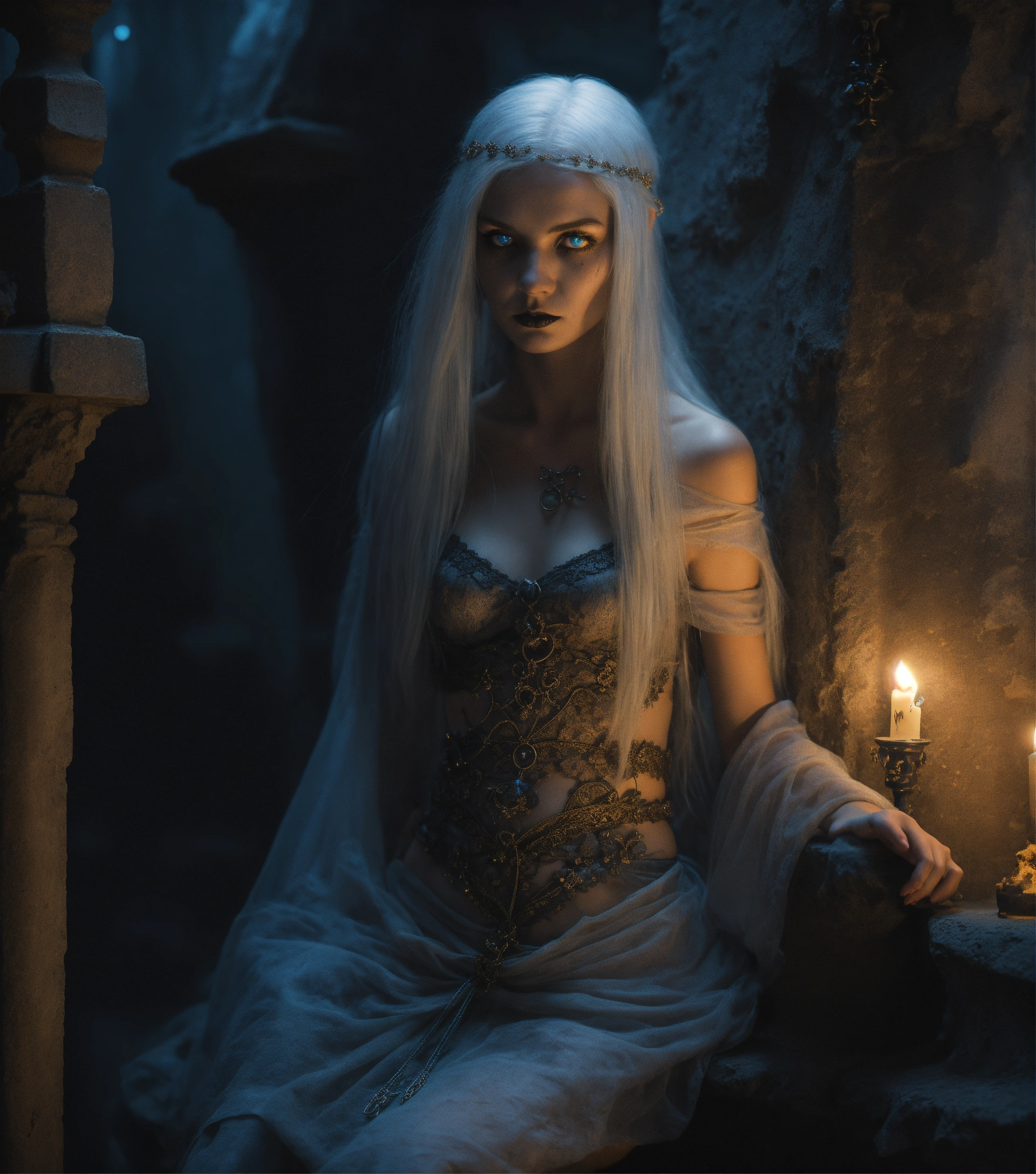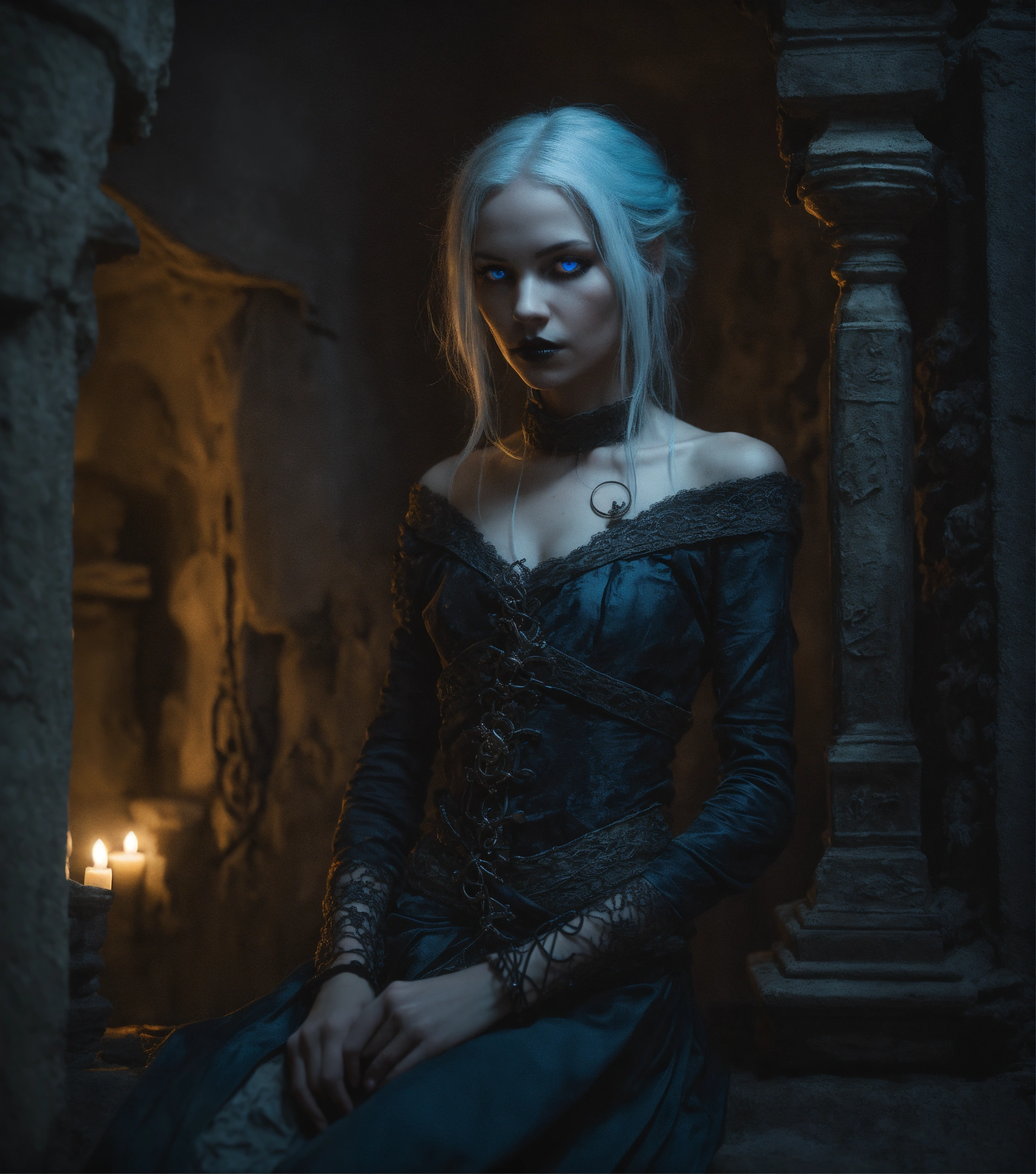 Body portrait, sehr kindhaft deadly pale twelve year old female child goth necromancer with waist long silverwhite hair and a aufreizendes off-the-shoulder lace silk cropped top mit tiefem ausschnitt and a low-waisted high slit skirt, extremely flat belly, belly button, extremely skinny, extremely slim and emaciated body, completely emaciated, very narrow face, alabaster skin, pale as a corpse, glowing blue eyes, slim face, innocent looking, leans against a sarcophagus in a gloomy crypt, kindlich, unschuldig, childlike, juvenile, graceful, wispy, glowing blue eyes, ghostly, dead, evil, demonic, undead, darkness, grotesque, mysterious, dark, dark, cold ambient lighting, extremely detailed, fantasy, medieval setting